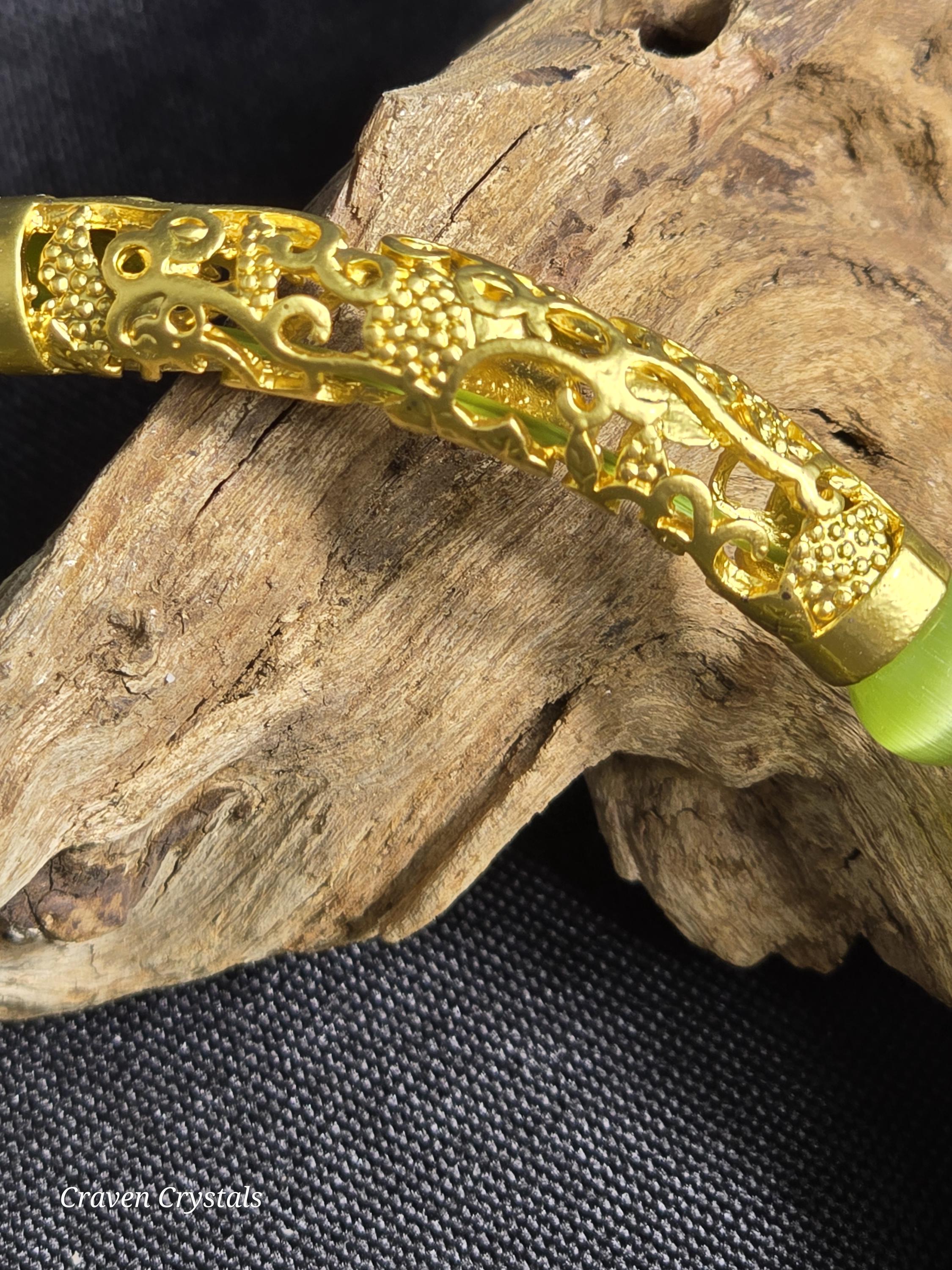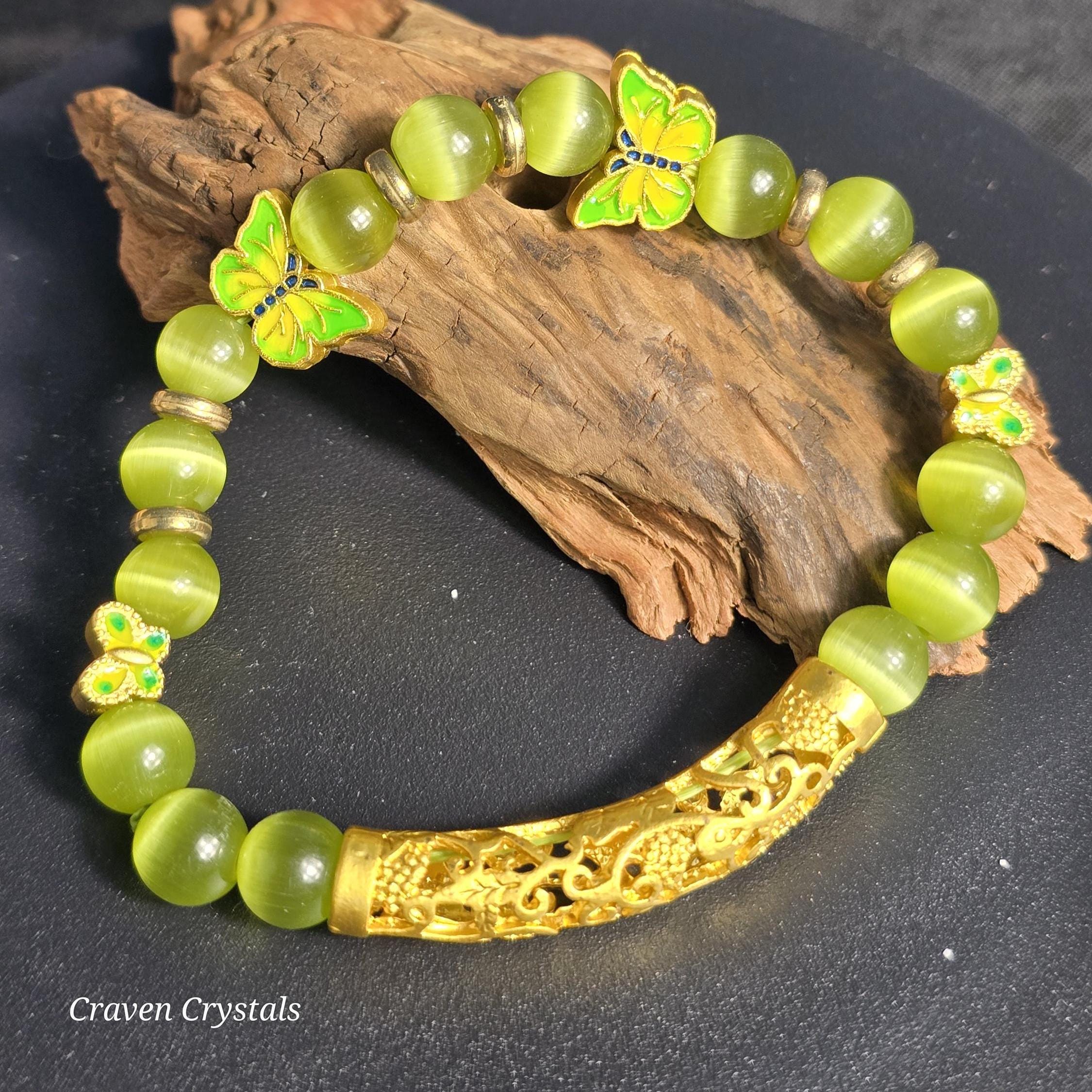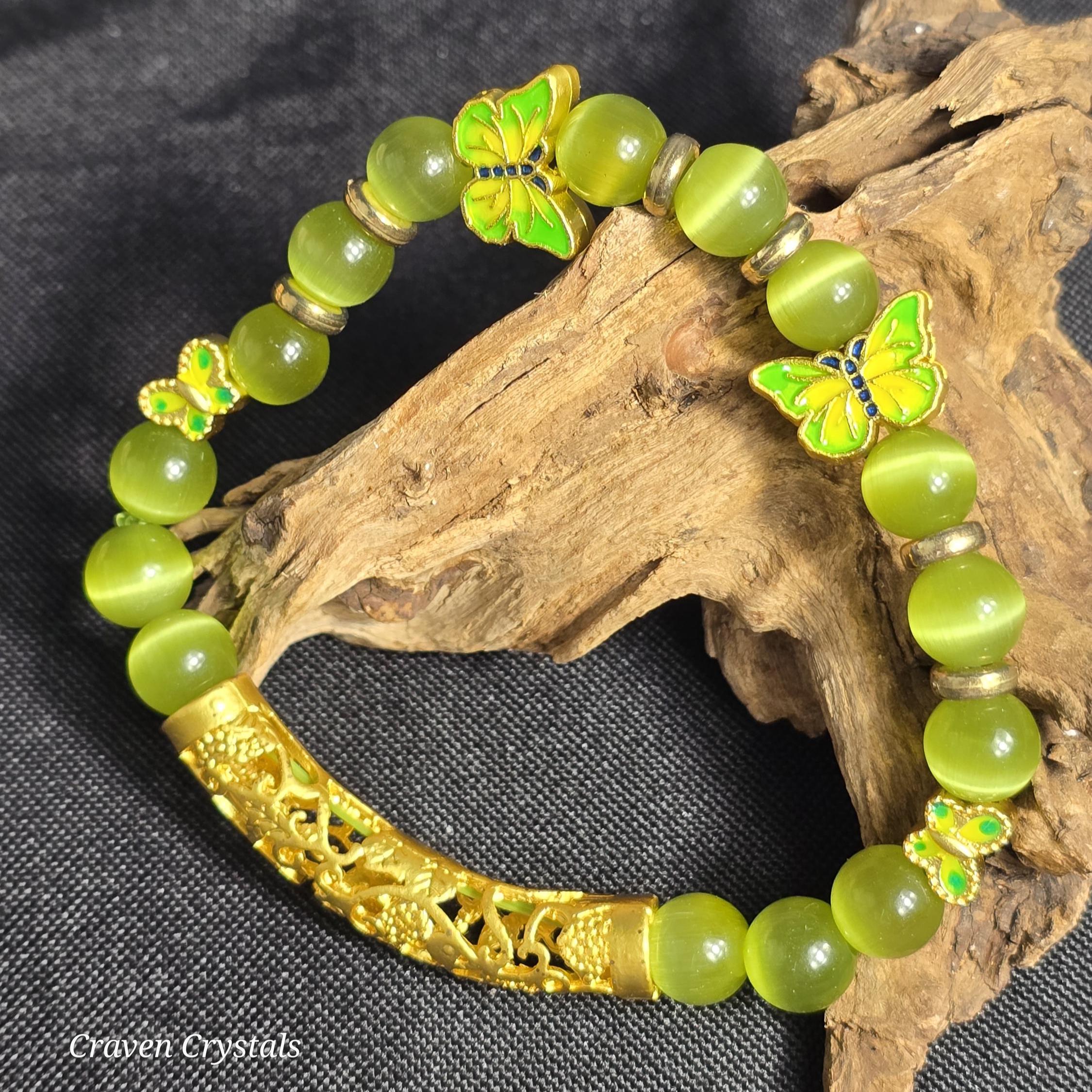 Soft, luminous, and full of promise, “Spring Awakening” is a bracelet inspired by the first warm breeze and the quiet magic of new beginnings. Crafted with enhanced color spring green cat eye selenite, each bead glows with a silky, light-catching shimmer that evokes fresh leaves, open fields, and gentle renewal. Delicate gold and green butterfly beads flutter throughout the design, symbolizing transformation, hope, and rebirth, while polished golden accents add warmth and elegance. The result is a bracelet that feels uplifting, cleansing, and beautifully alive — a wearable reminder that growth is always unfolding.