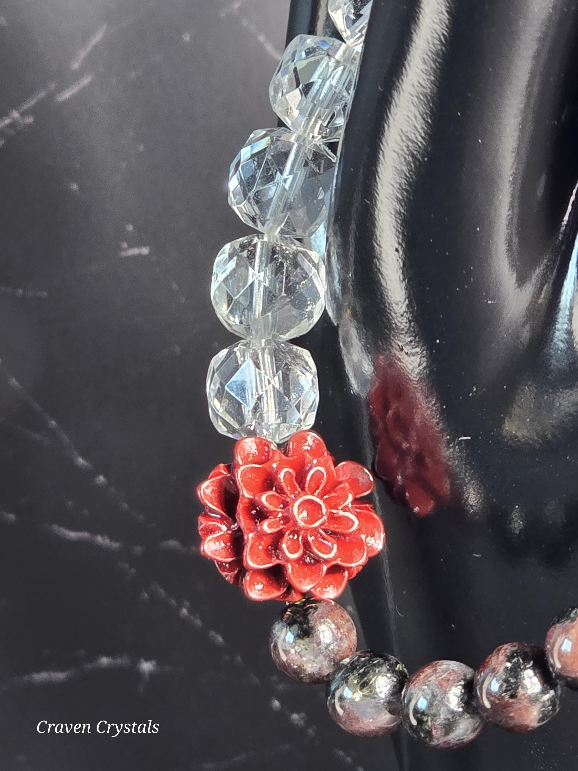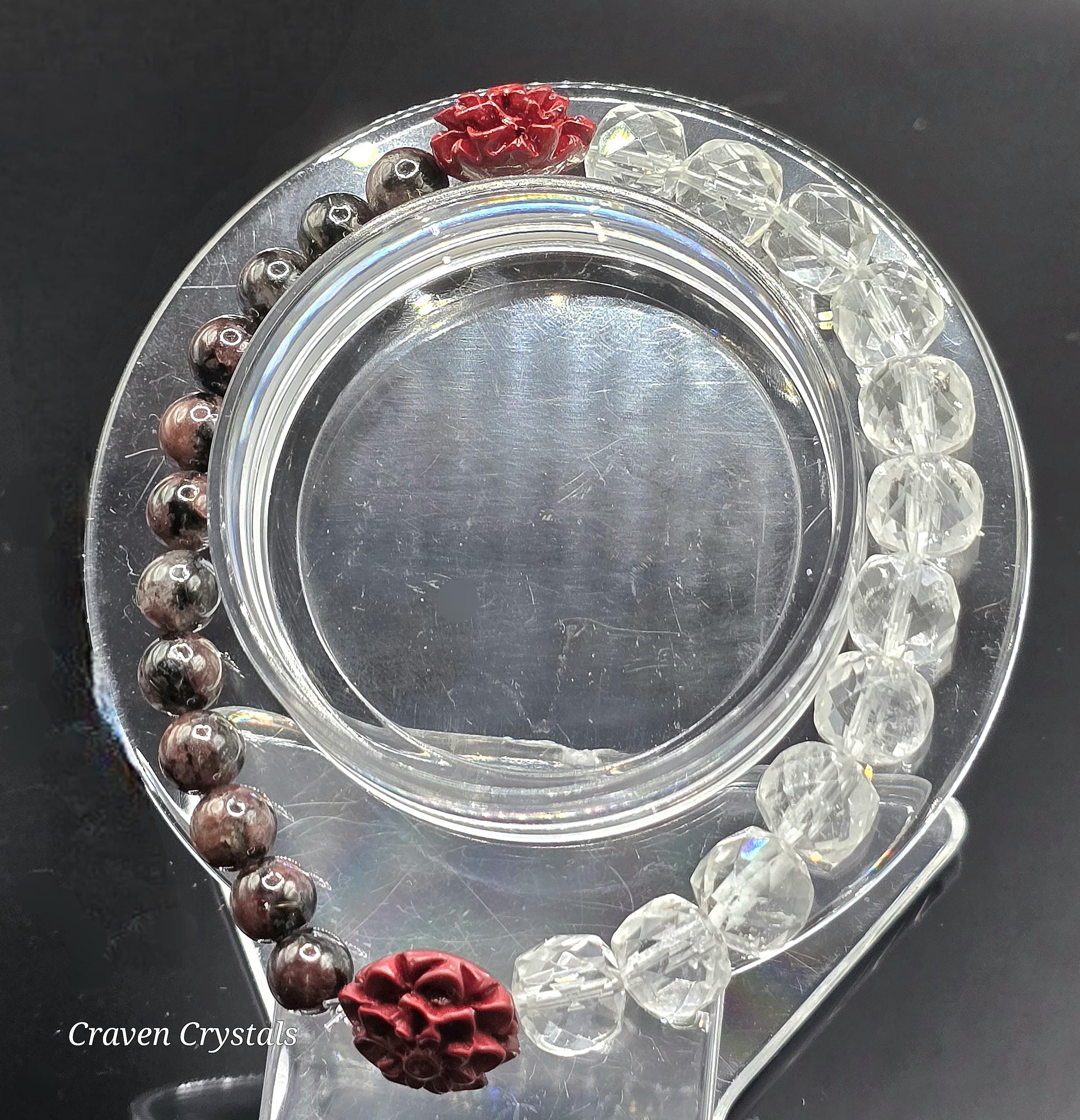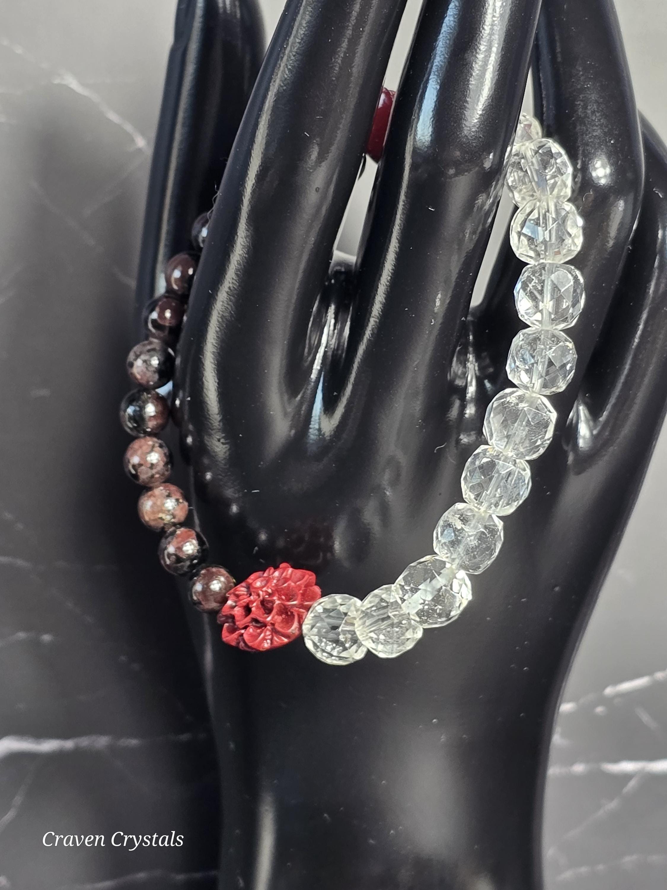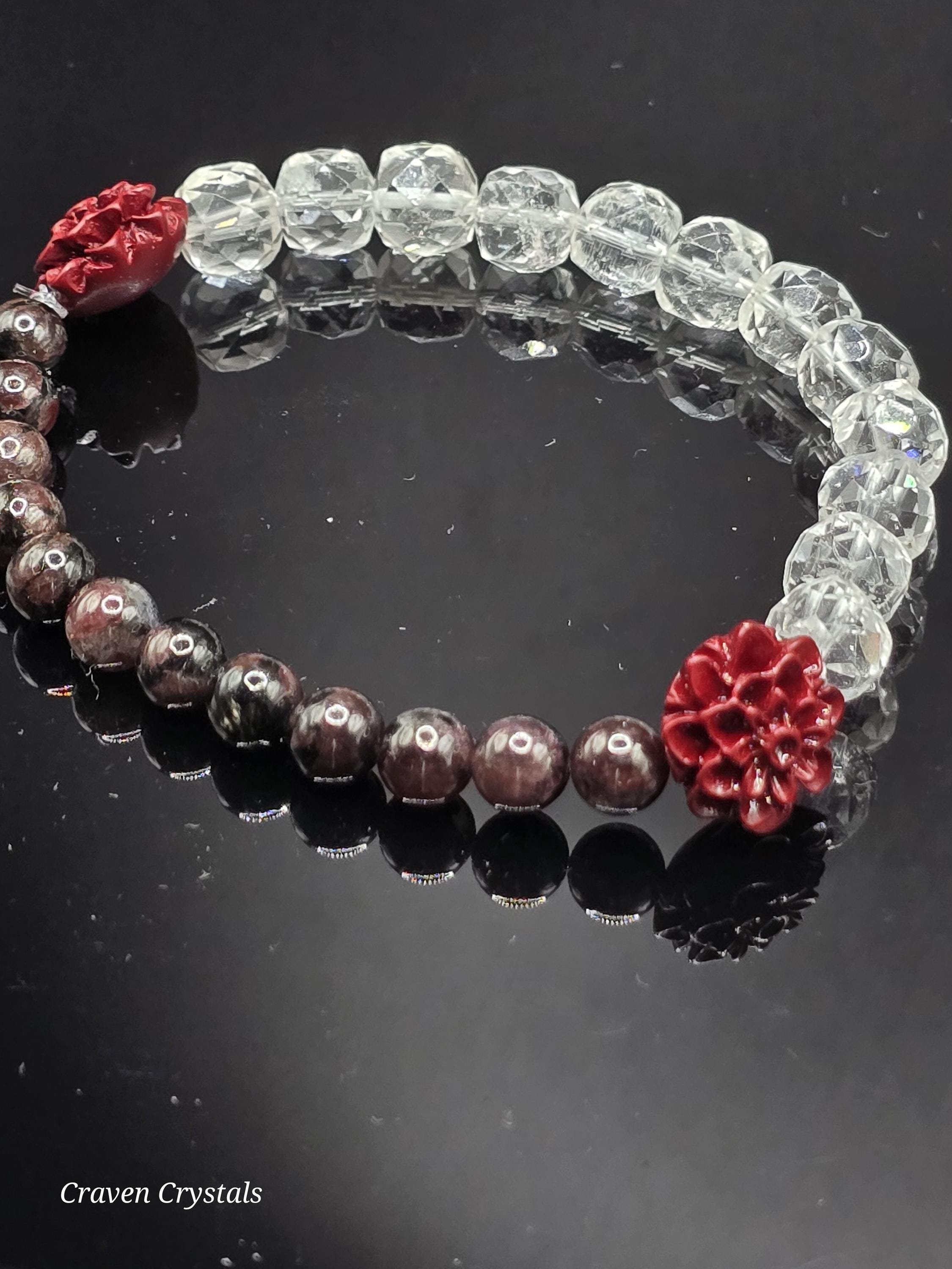 Bold contrast meets intentional design in “Crimson Harmony,” a bracelet that celebrates the meeting point of light and depth. One half features half-faceted clear quartz, sparkling with clarity and brilliance, amplifying energy and illuminating every movement. The other half is composed of striking Garnet Astrophyllite, a stone prized for its deep crimson tones threaded with subtle metallic flashes, symbolizing transformation, inner strength, and grounded passion.