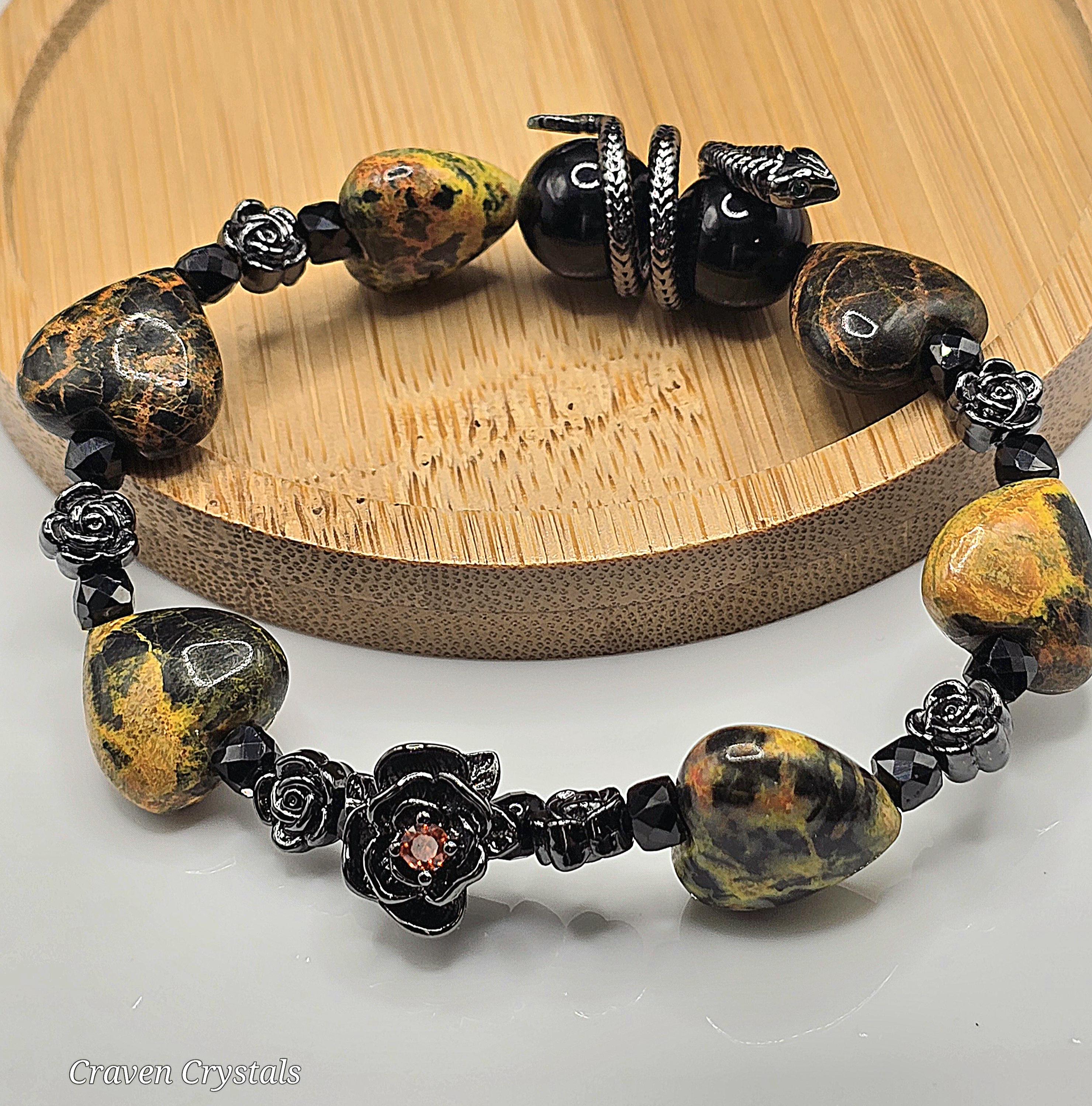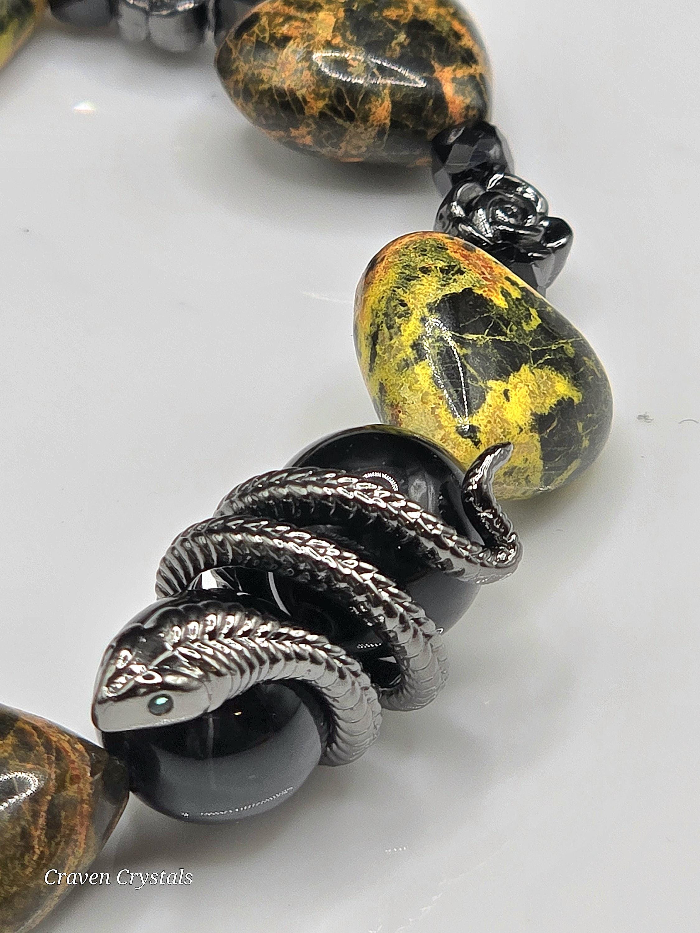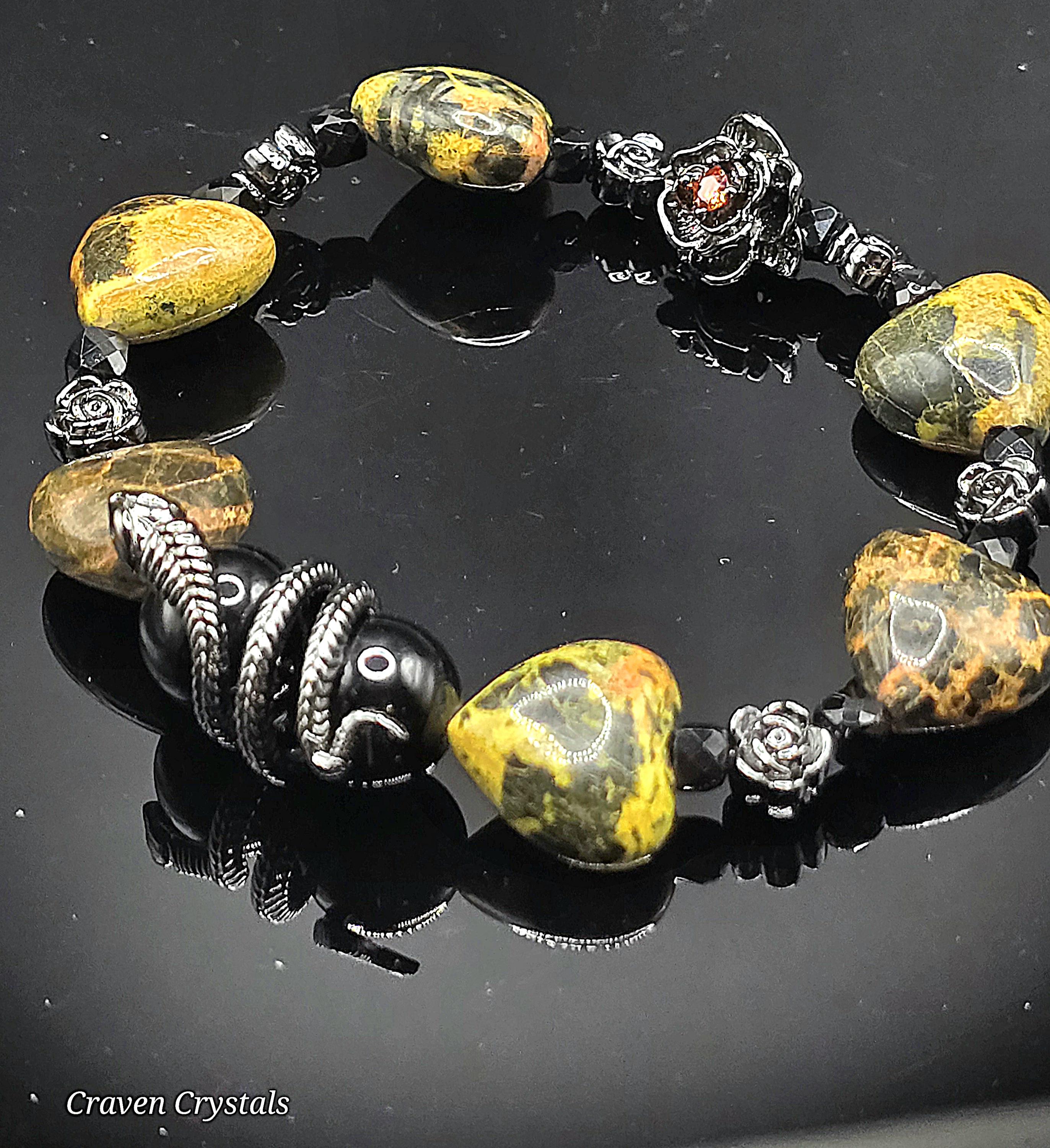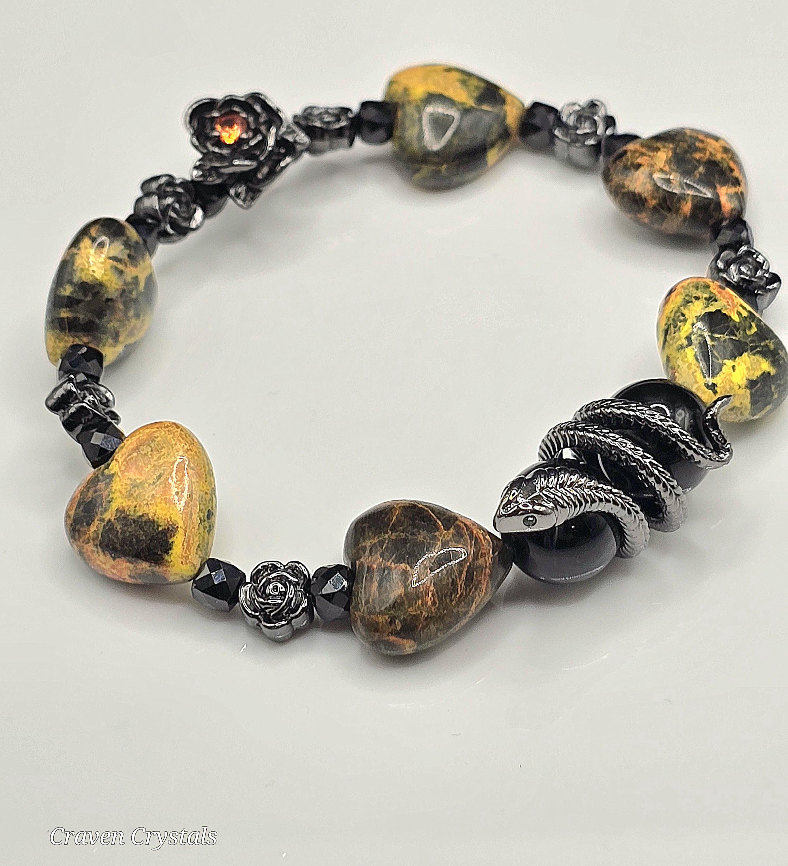 Mysterious and magnetic, “Serpent’s Embrace” is a bracelet that coils strength and beauty into one unforgettable design. Crafted with yellow jasper heart beads, grounding obsidian, and sleek black spinel, this piece radiates confidence, resilience, and quiet authority. A dramatic pewter snake wrap winds through the bracelet, symbolizing rebirth, wisdom, and primal energy. Pewter roses soften the darkness with a reminder that growth often rises from shadow, while a stunning pewter flower centerpiece crowned with a glowing golden zircon captures the balance between danger and devotion — power and grace intertwined.