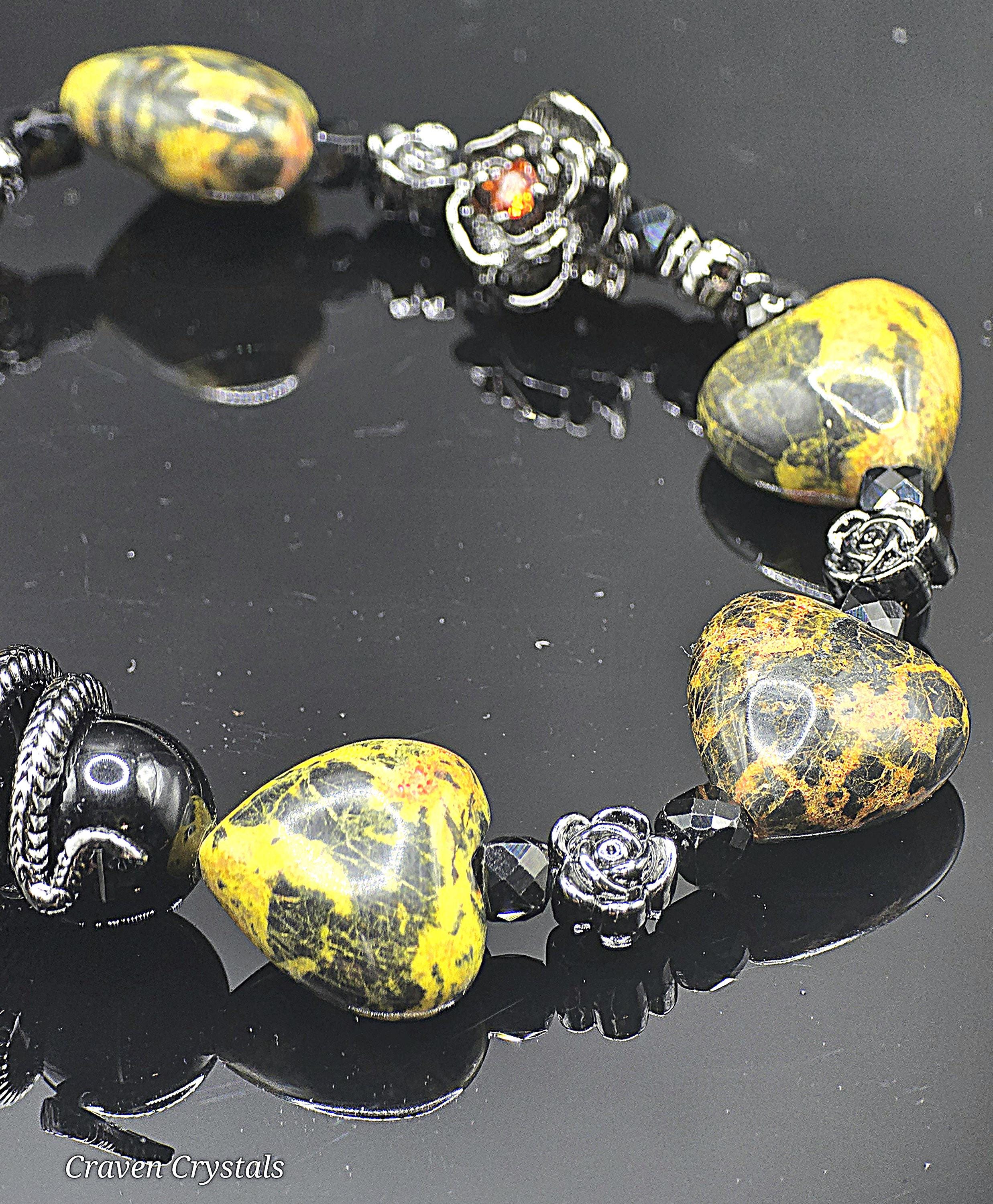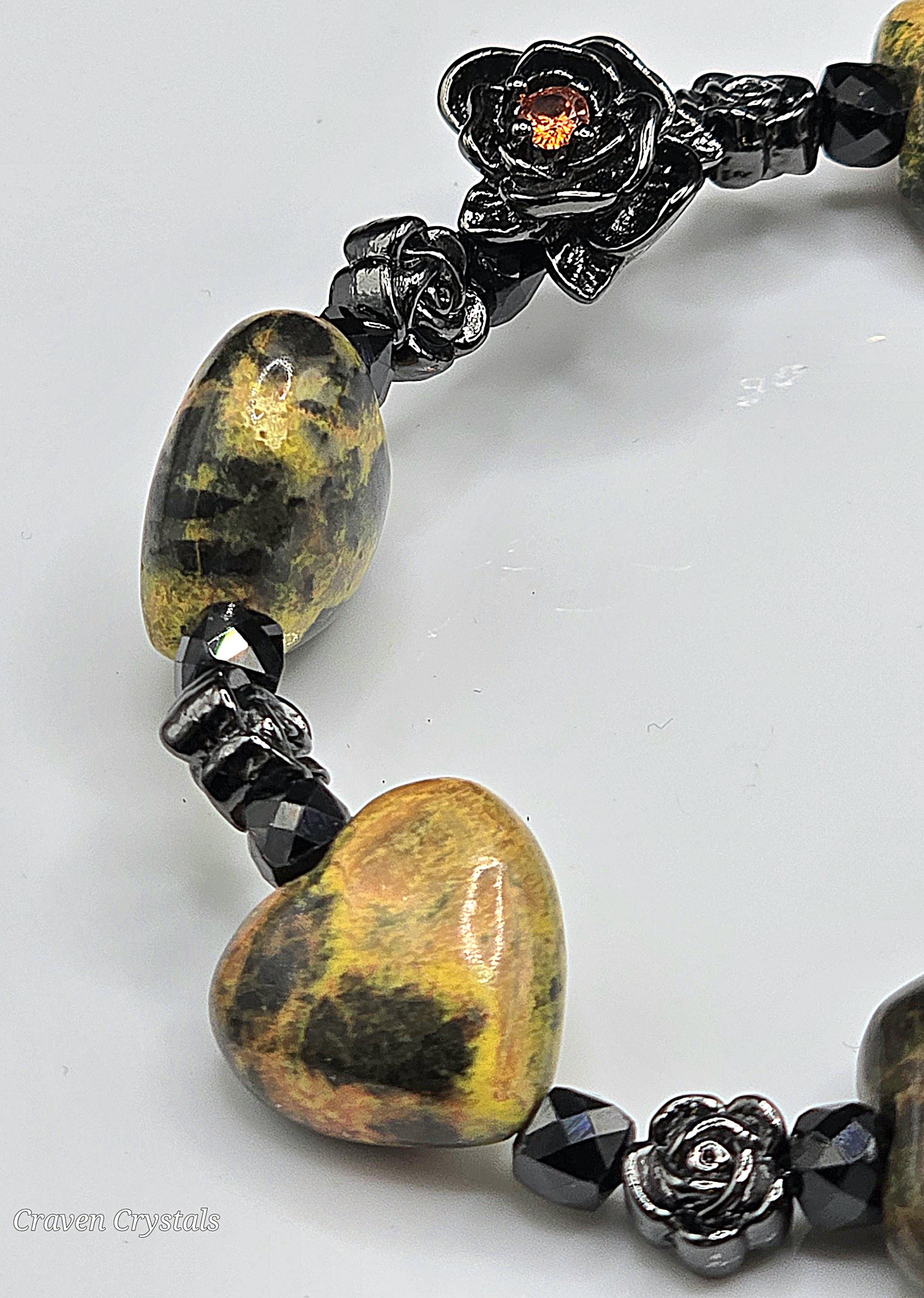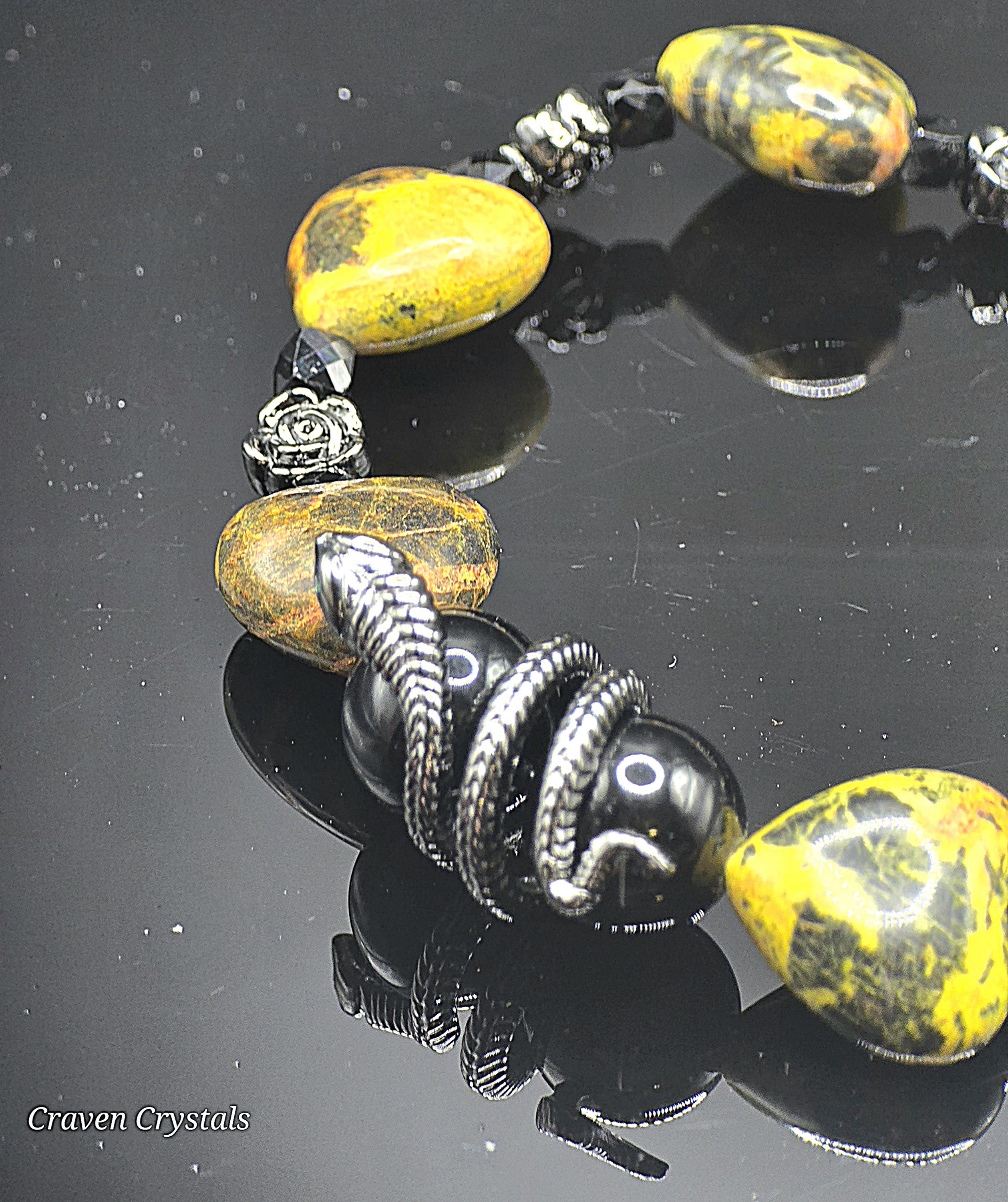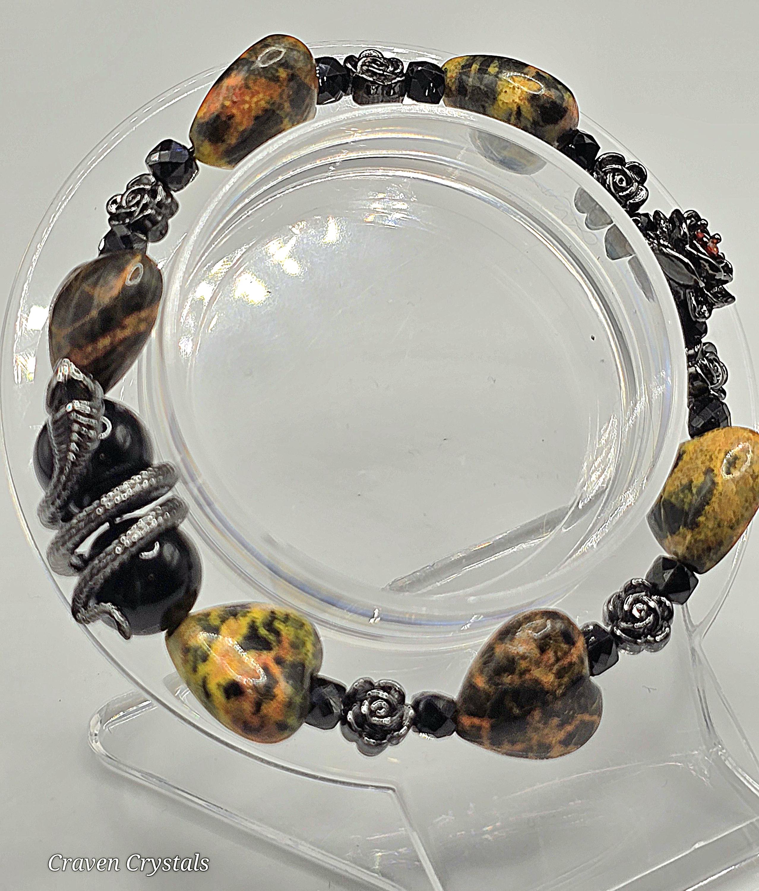 Mysterious and magnetic, “Serpent’s Embrace” is a bracelet that coils strength and beauty into one unforgettable design. Crafted with yellow jasper heart beads, grounding obsidian, and sleek black spinel, this piece radiates confidence, resilience, and quiet authority. A dramatic pewter snake wrap winds through the bracelet, symbolizing rebirth, wisdom, and primal energy. Pewter roses soften the darkness with a reminder that growth often rises from shadow, while a stunning pewter flower centerpiece crowned with a glowing golden zircon captures the balance between danger and devotion — power and grace intertwined.