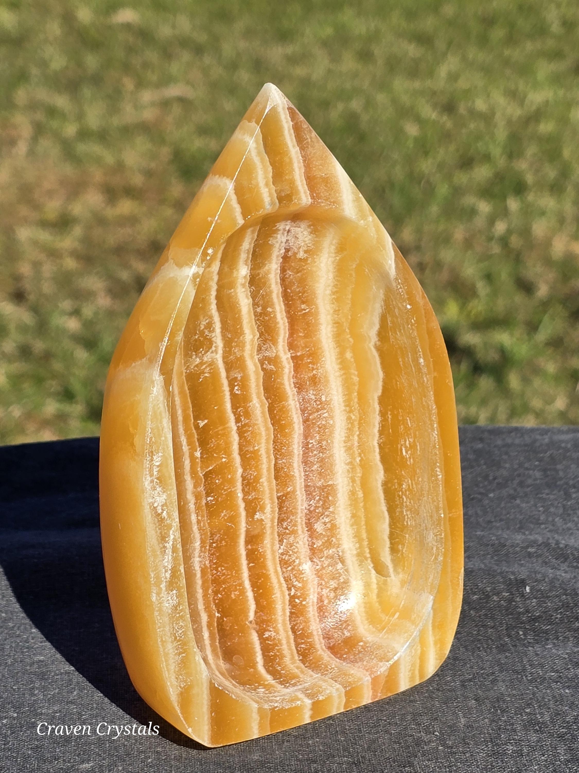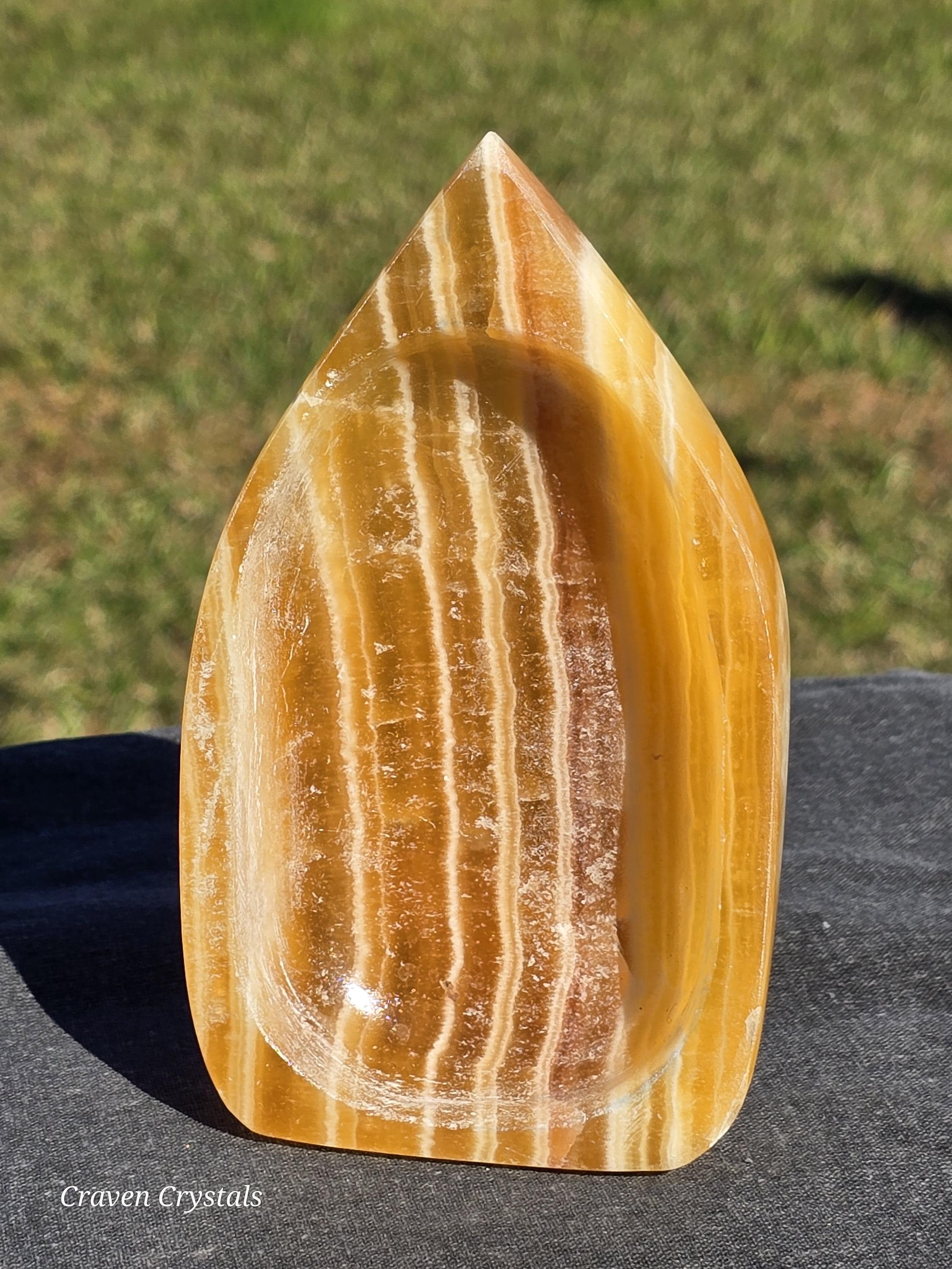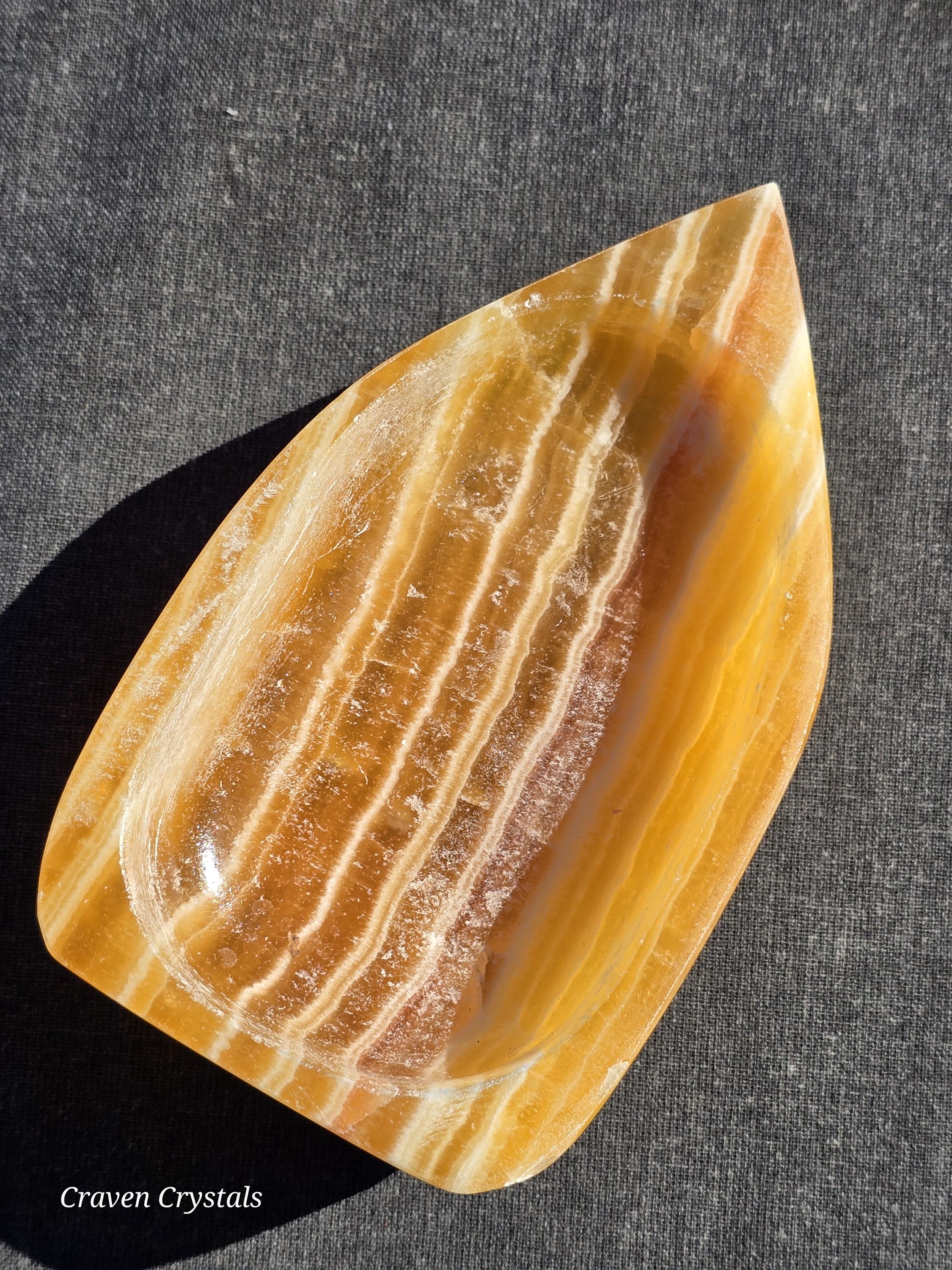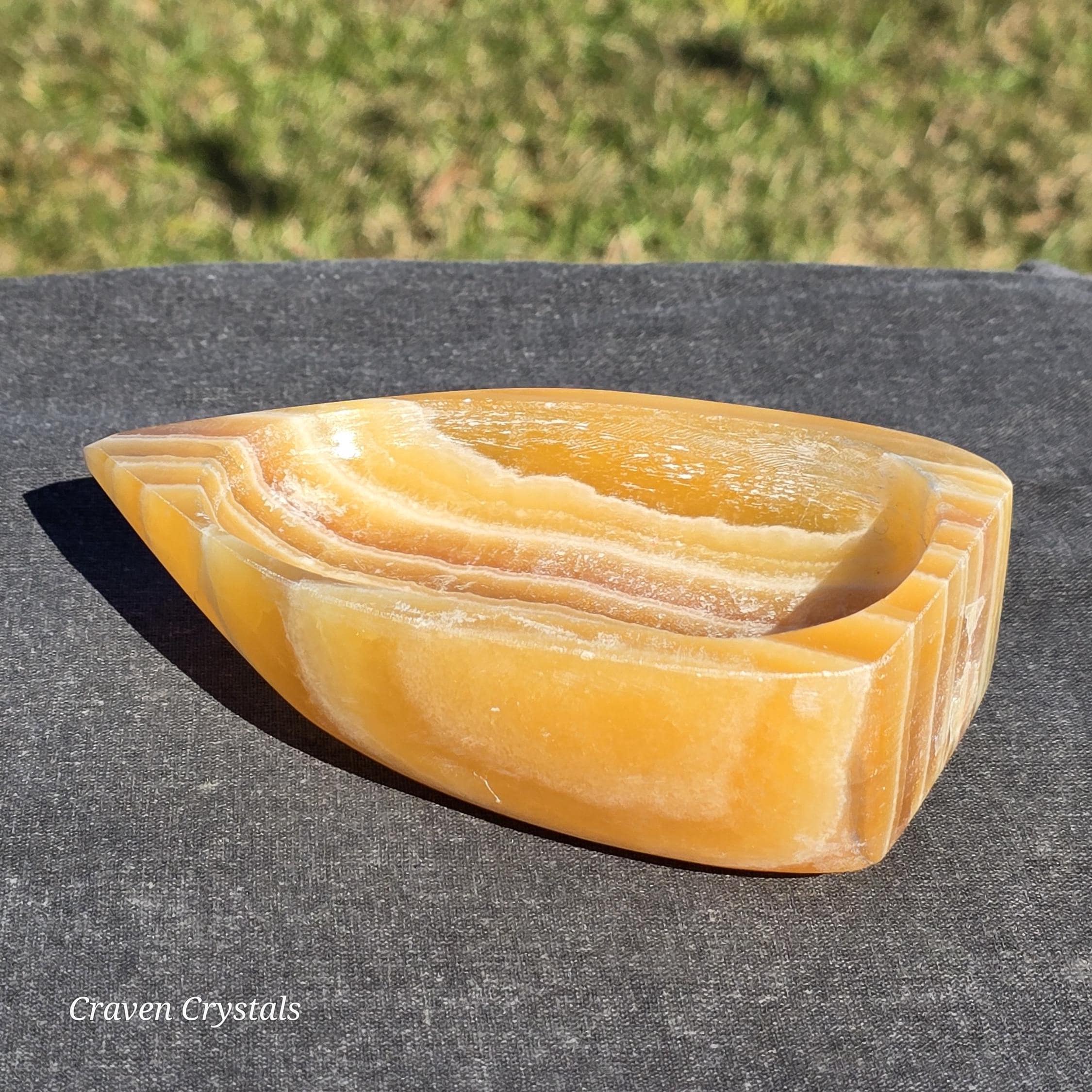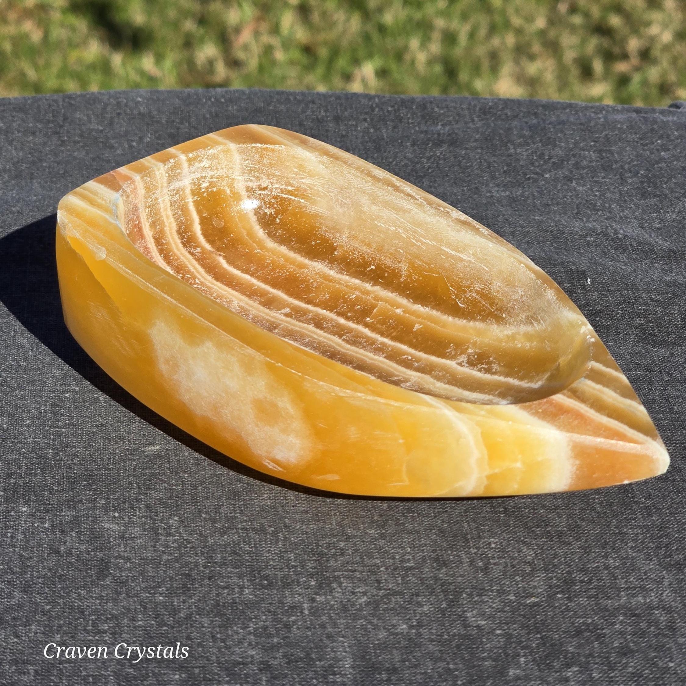 Yellow Banded Calcite Crystal Boat shaped Bowl perfect as an accent piece, a holder for keys, a place to put jewelry, or even as a unique dish for small indulgences like chocolates.