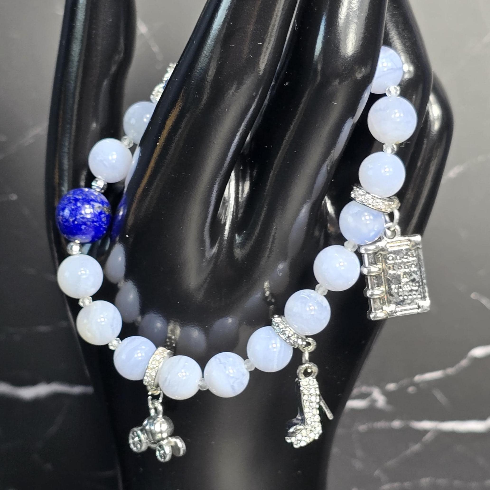 Just like the moment the clock strikes and hearts awaken, “So This Is Love” captures the magic of believing in dreams. Inspired by Cinderella’s timeless story, this bracelet blends soft romance with regal beauty using calming Blue Lace Agate, royal Lapis Lazuli, Clear Quartz and a sparkling blue zircon and silver-toned centerpiece that glimmers like a glass slipper under moonlight. A charming book, carriage and high-heel charm adds a playful nod to Cinderella’s iconic story— a reminder that grace, courage, and kindness always lead to transformation. Every element of this bracelet reflects serenity, confidence, and the quiet power of staying true to yourself.