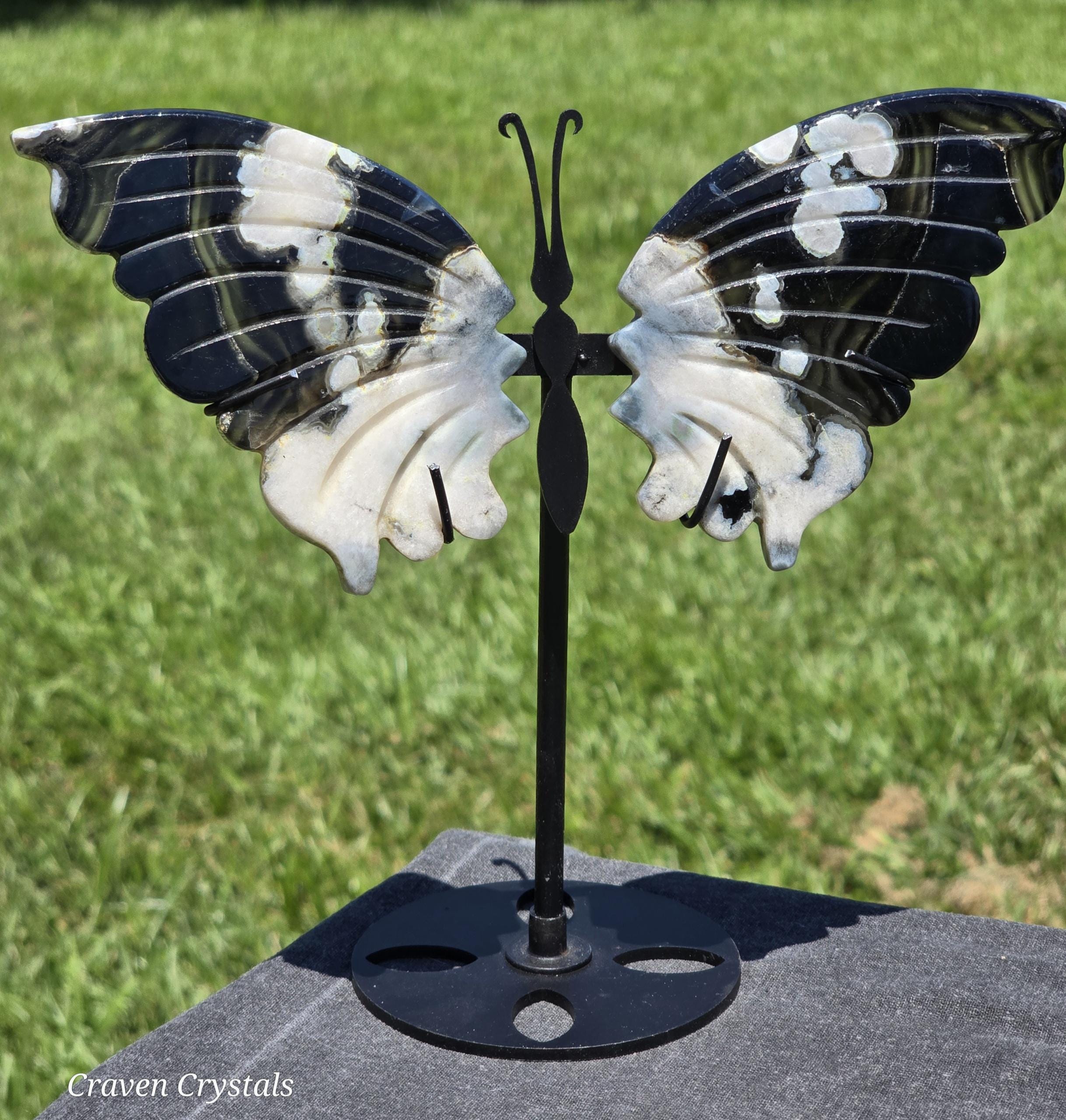 Gorgeous Black Flower Agate Crystal Butterfly Wings with delicate white flowers