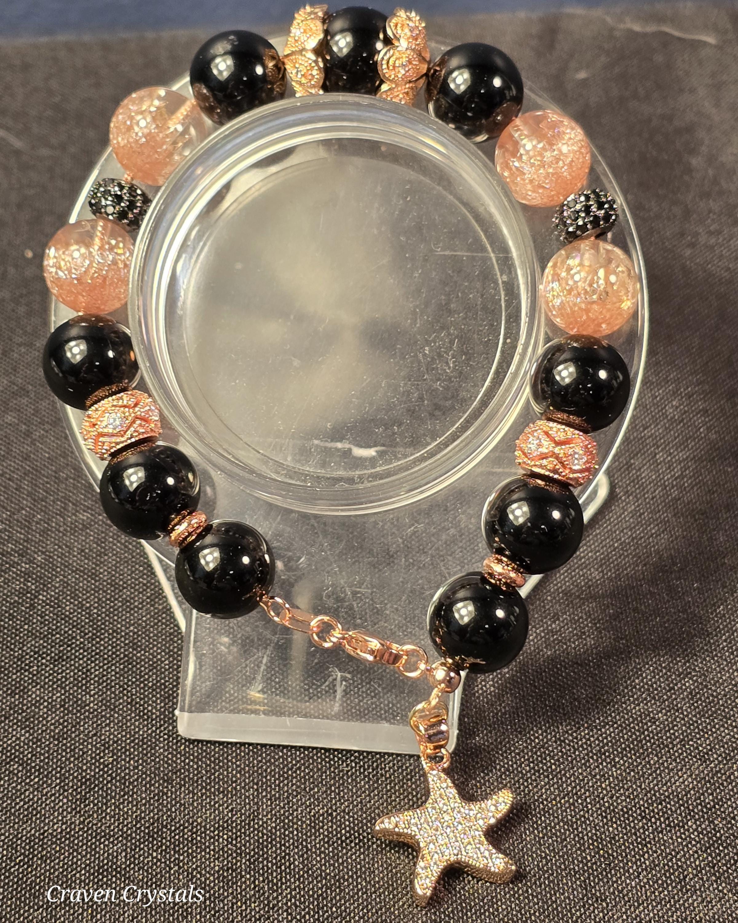 Mysterious, romantic, and effortlessly powerful, “Midnight Rose” is a bracelet that blooms after dark. Crafted with sleek Obsidian and luminous enhanced Rose Gold Quench Quartz Crystal, this piece balances grounding protection with a warm, starlit shimmer that feels both bold and feminine. Black and rose-gold accents create a striking contrast, while a delicate rose-gold starfish charm adds a touch of symbolism — resilience, regeneration, and beauty shaped by the tides. Finished with a secure lobster clasp, Midnight Rose is designed for confidence, comfort, and lasting wear.