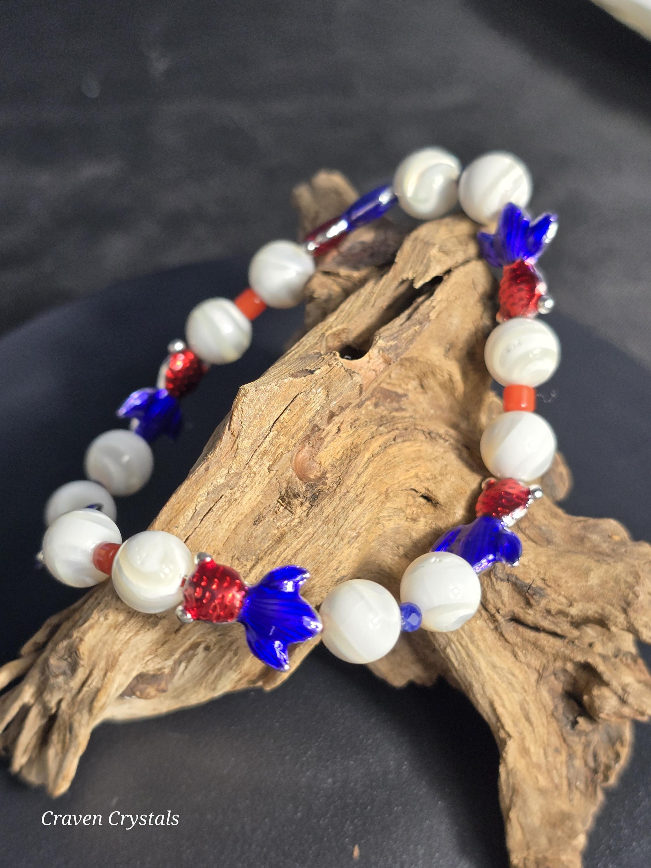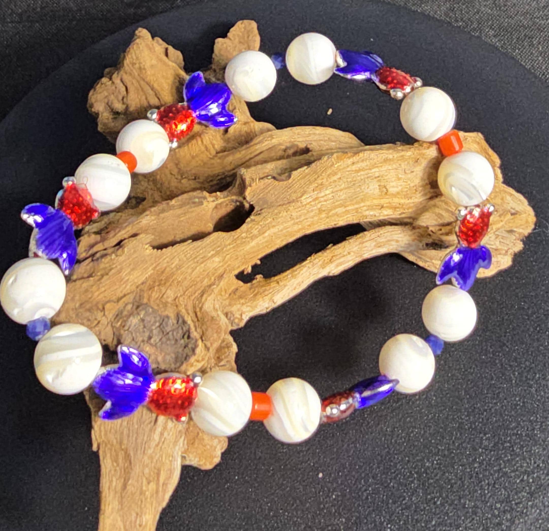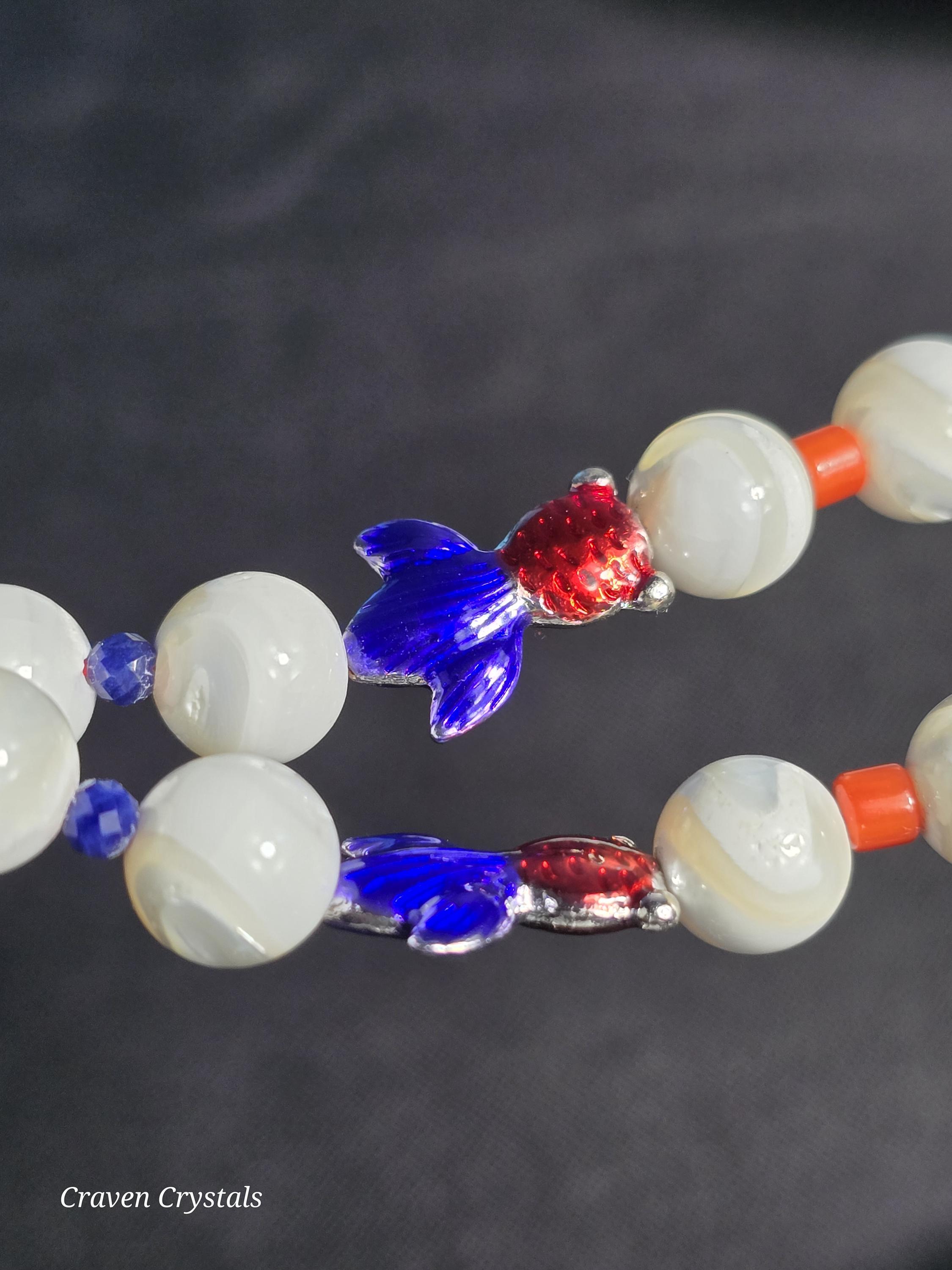 Bright, cheerful, and rich with symbolism, “One Fish Two Fish” is a bracelet that celebrates balance, abundance, and the simple magic of movement. Lustrous mother of pearl shell beads create an iridescent foundation, reflecting light with a soft ocean glow, while vibrant red coral adds a pop of warmth, vitality, and life force. Cool, grounding sodalite brings depth and calm, balancing the palette with serene blue tones. Swimming through the design are charming enamel red and blue goldfish, finished in gold tones. In many cultures, goldfish symbolize luck, prosperity, harmony, and good fortune, making this bracelet as meaningful as it is joyful. Together, the colors and textures feel playful yet thoughtfully composed — a wearable reminder that balance can be fun.