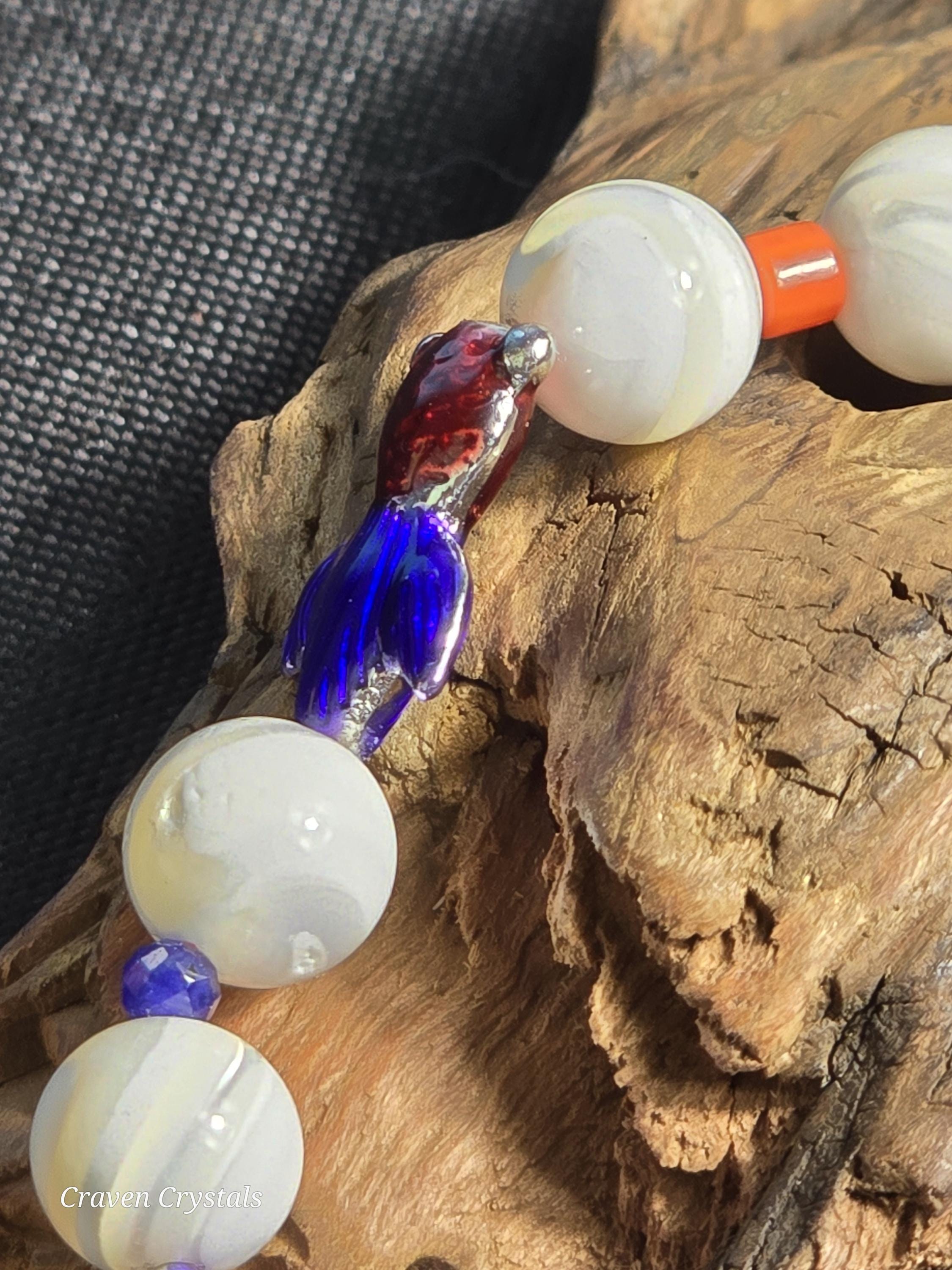 Each Craven Crystals bracelet is thoughtfully handcrafted using natural stones, elastic cord, and carefully selected metals. To preserve the beauty and integrity of your piece, handle it with care and avoid excessive stretching. Bracelets should be rolled on and off the wrist rather than pulled, especially those made with elastic. It is recommended to remove your bracelet before sleeping, bathing, swimming, exercising, or performing household tasks, as moisture, chemicals, and impact can weaken elastic, dull metals, and damage stones. Sterling silver and mixed metal components may naturally develop a soft patina or tarnish over time. This is a normal process and can be minimized by keeping your jewelry dry and storing it in a soft pouch or jewelry box when not in use. A gentle wipe with a soft, dry cloth after wearing helps remove natural oils and maintain shine. Avoid submerging bracelets in water or using chemical or ultrasonic cleaners. For sterling silver accents only, a silver polishing cloth may be used. Delicate beads, glass, shell, charms, and detailed focal pieces should be protected from hard knocks or pressure, as natural and specialty materials can chip or crack if dropped. Crystals, stones, and shells are natural materials and may display unique variations in color, texture, or pattern. These characteristics are part of what makes each Craven Crystals piece one of a kind. With mindful care, your bracelet will continue to bring beauty, meaning, and enjoyment for years to come.