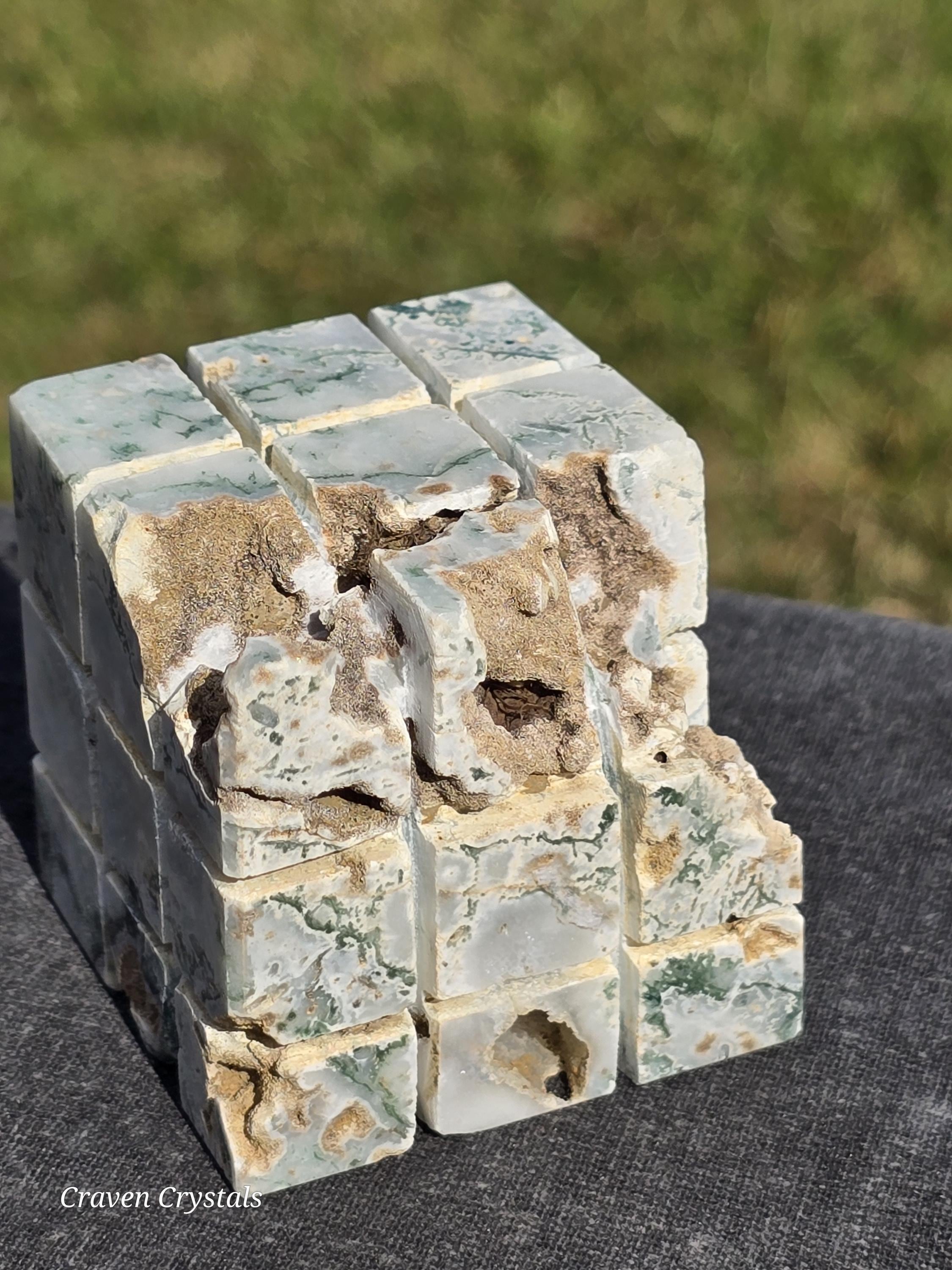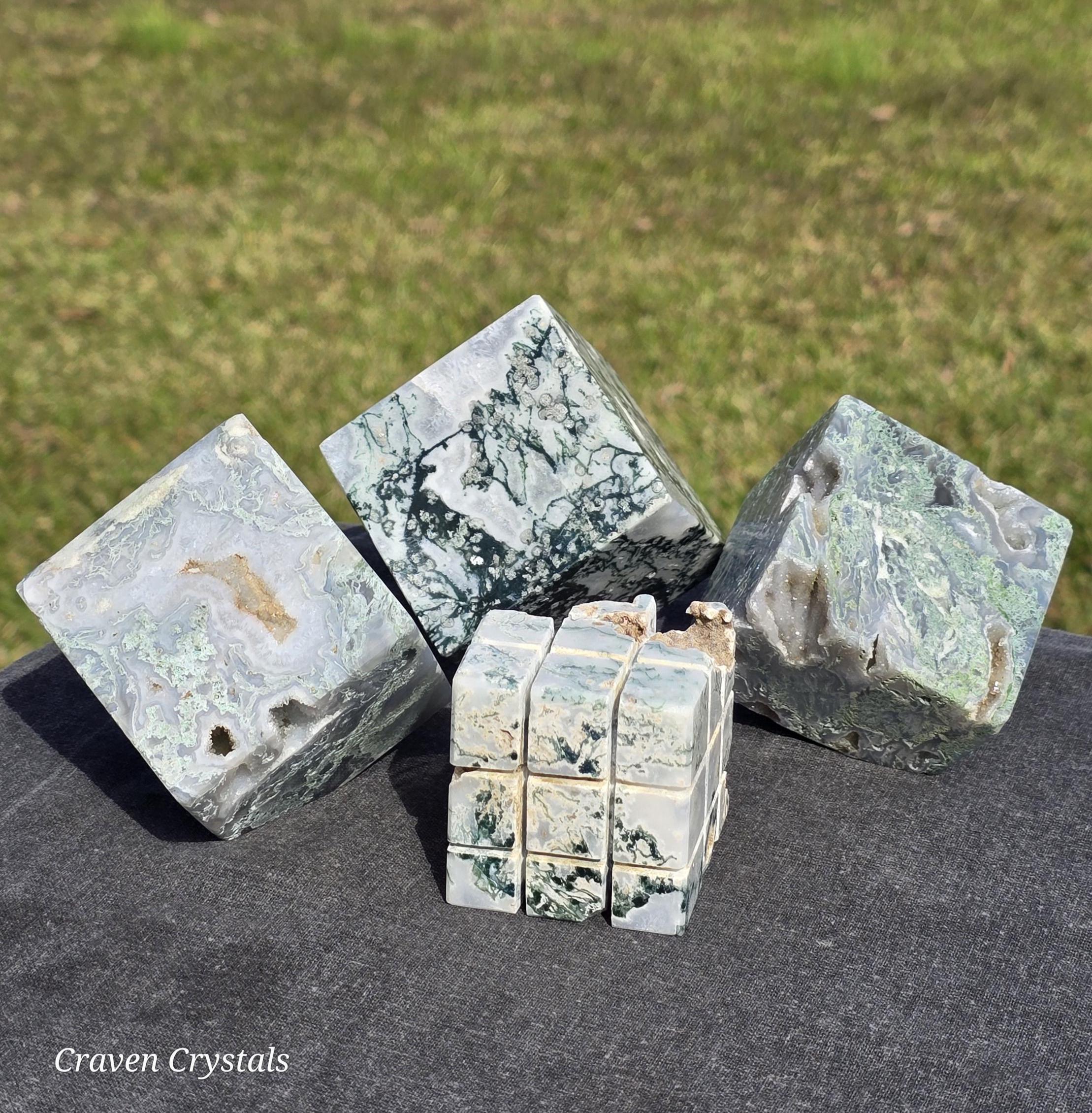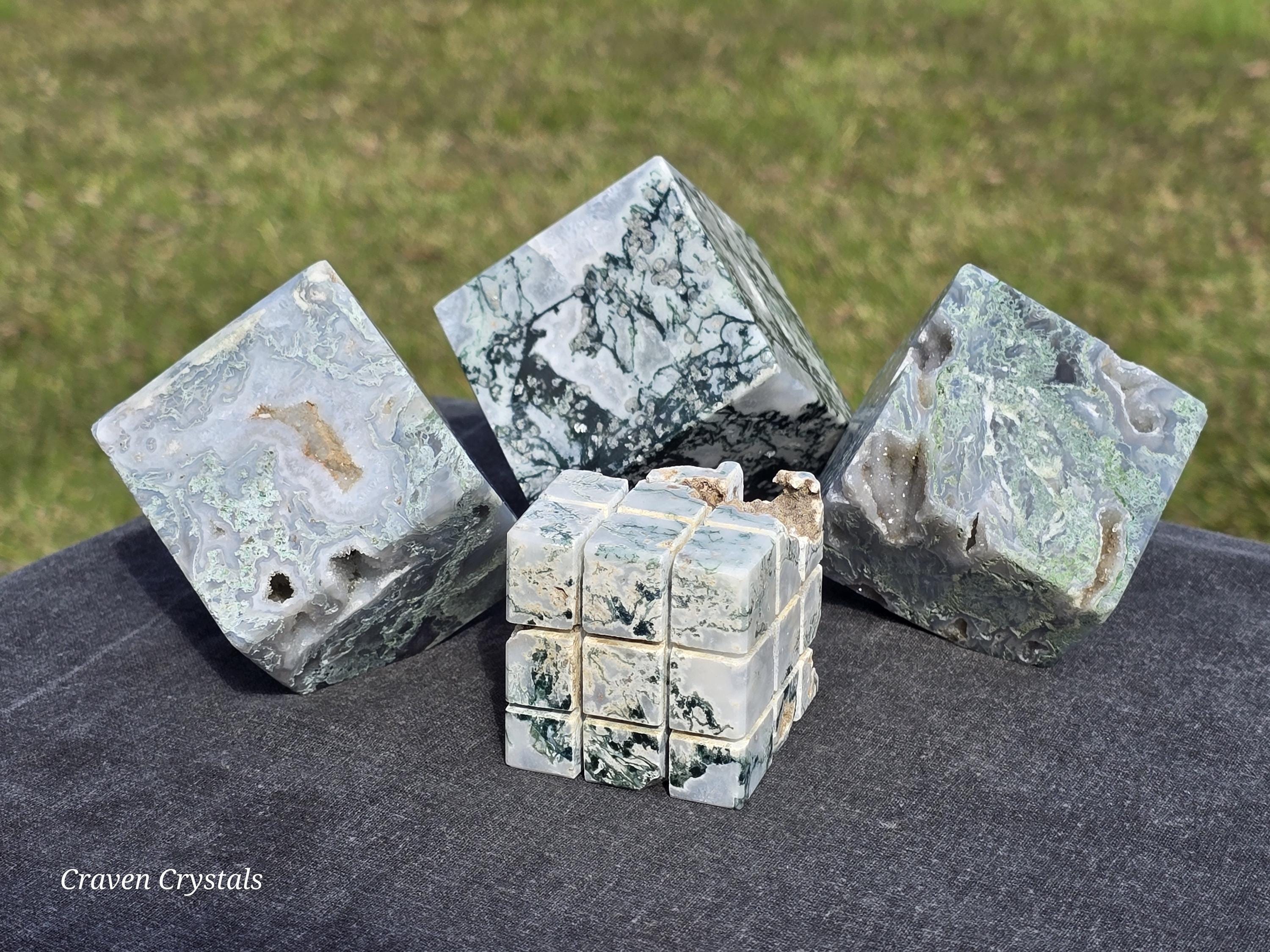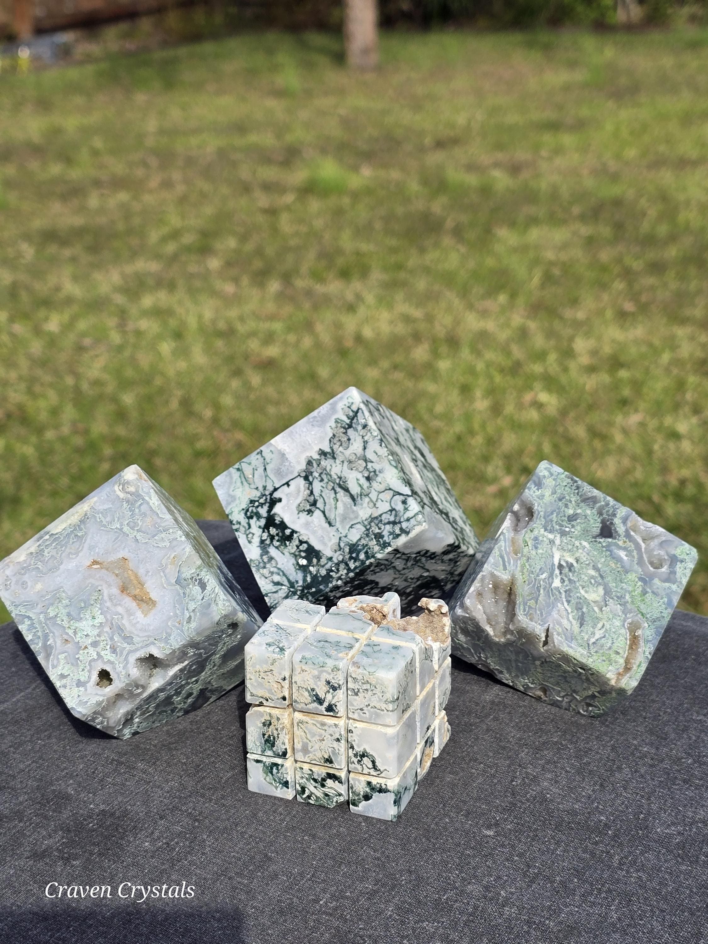 Moss Agate Crystal Cubes with cut corners for angled showcase
