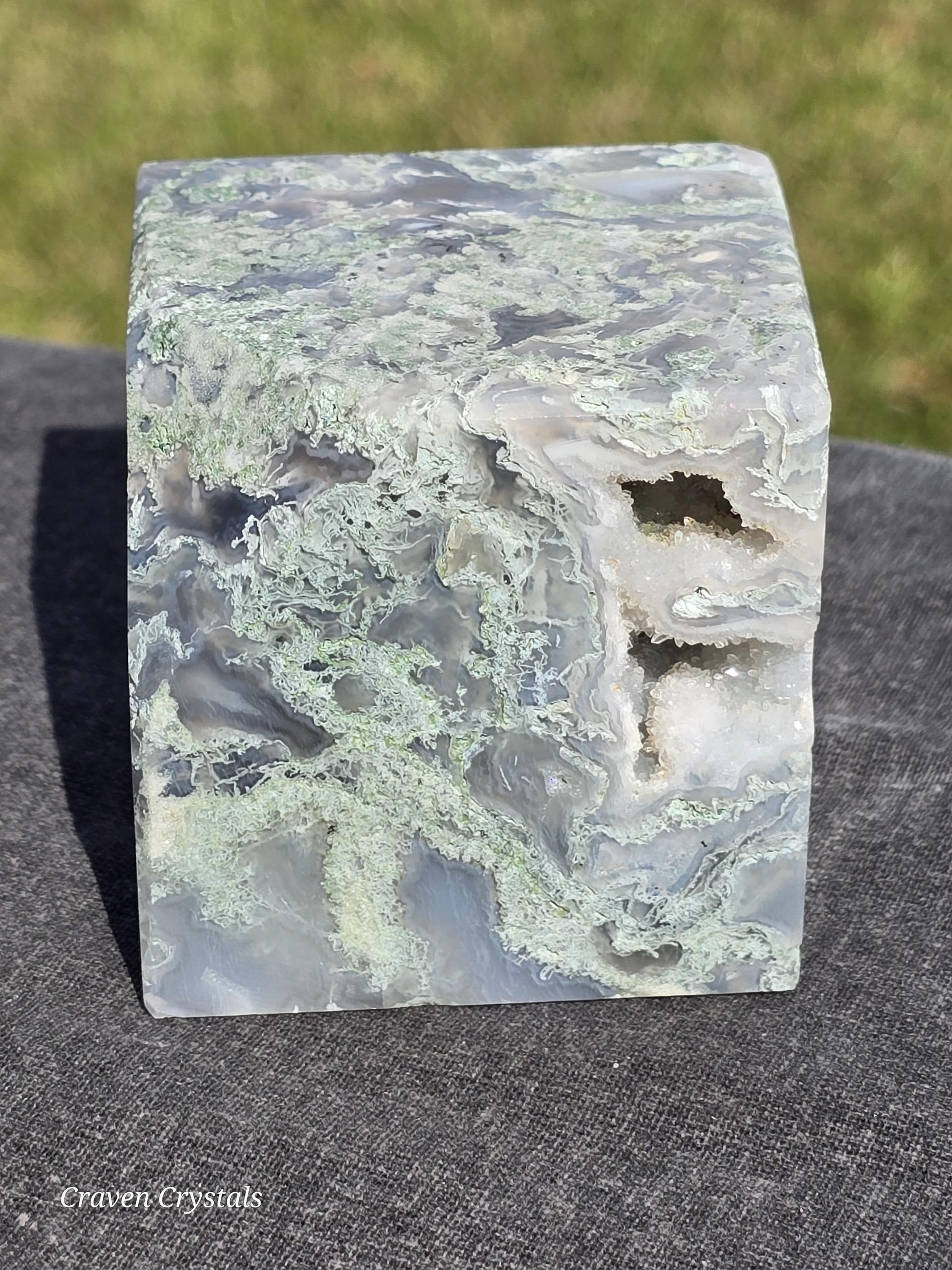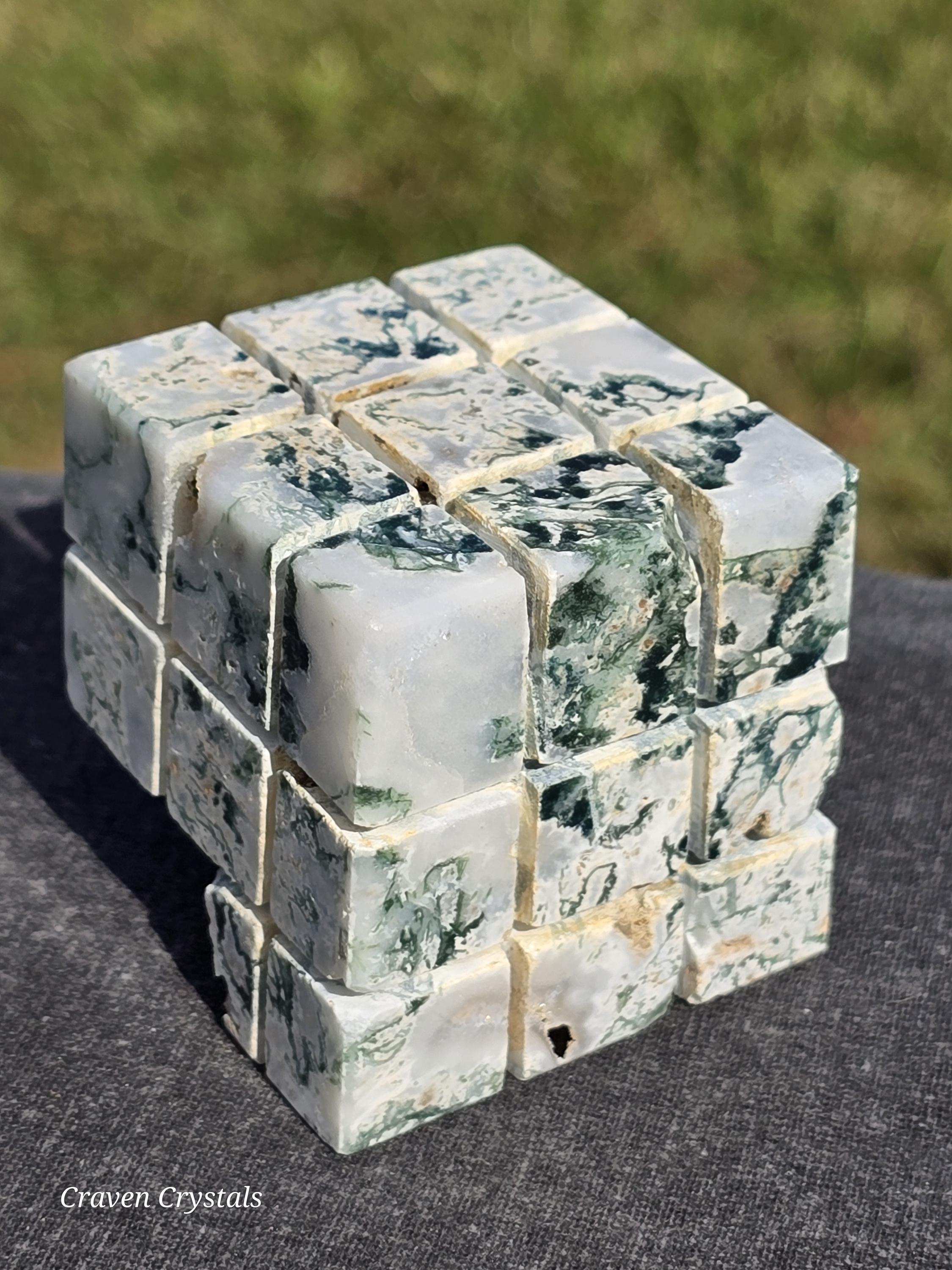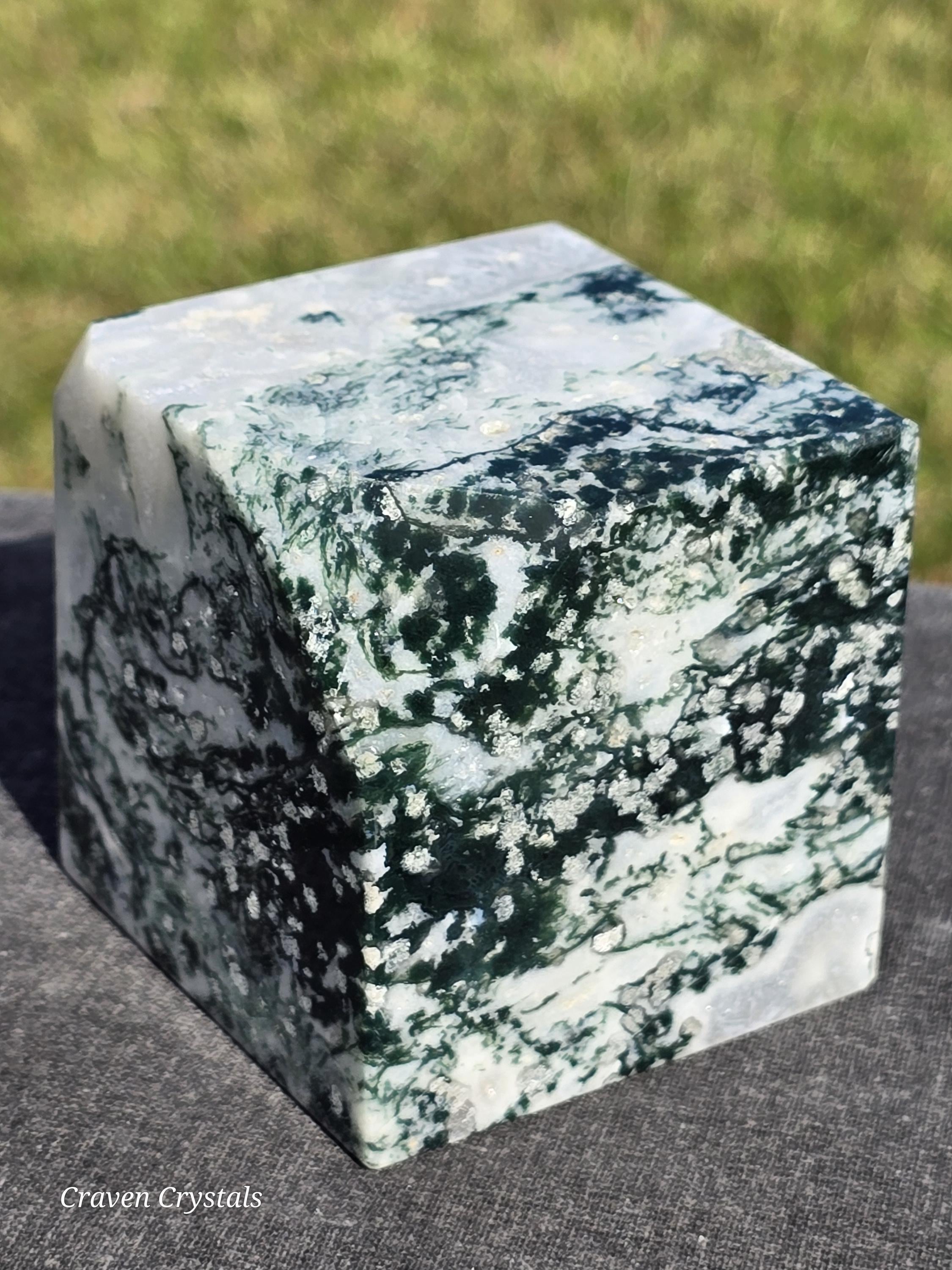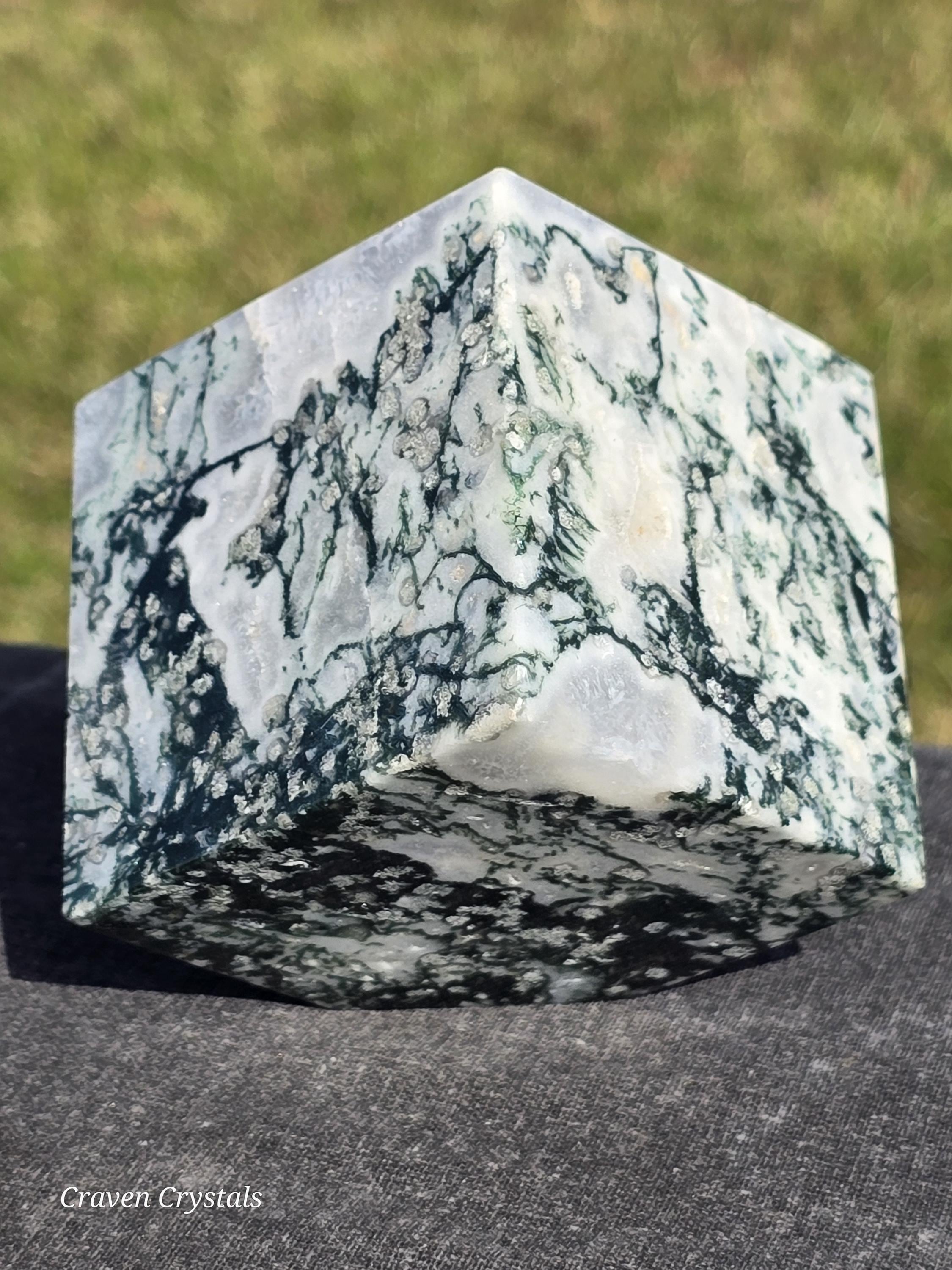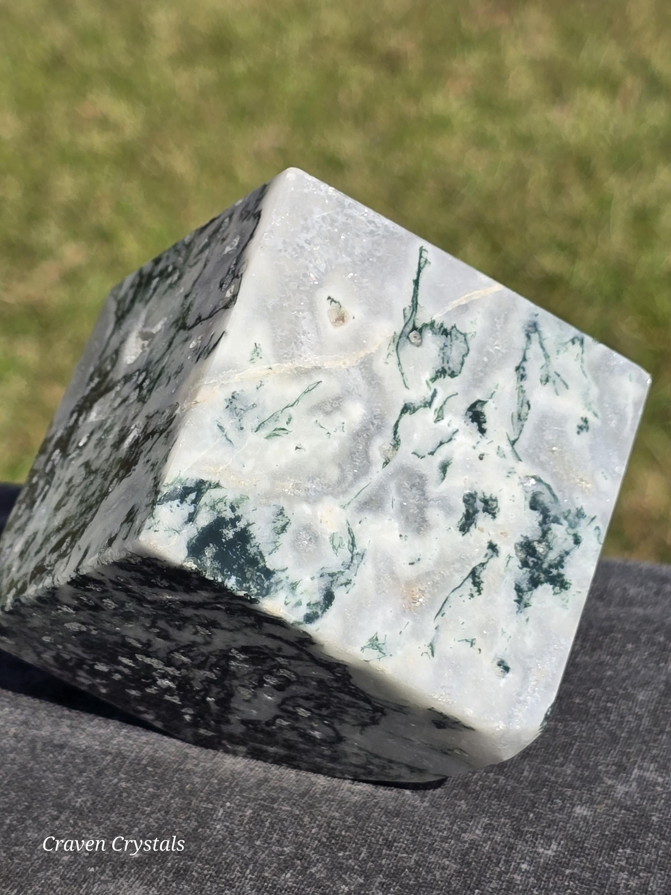 Moss Agate Crystal Cubes with cut corners for angled showcase
