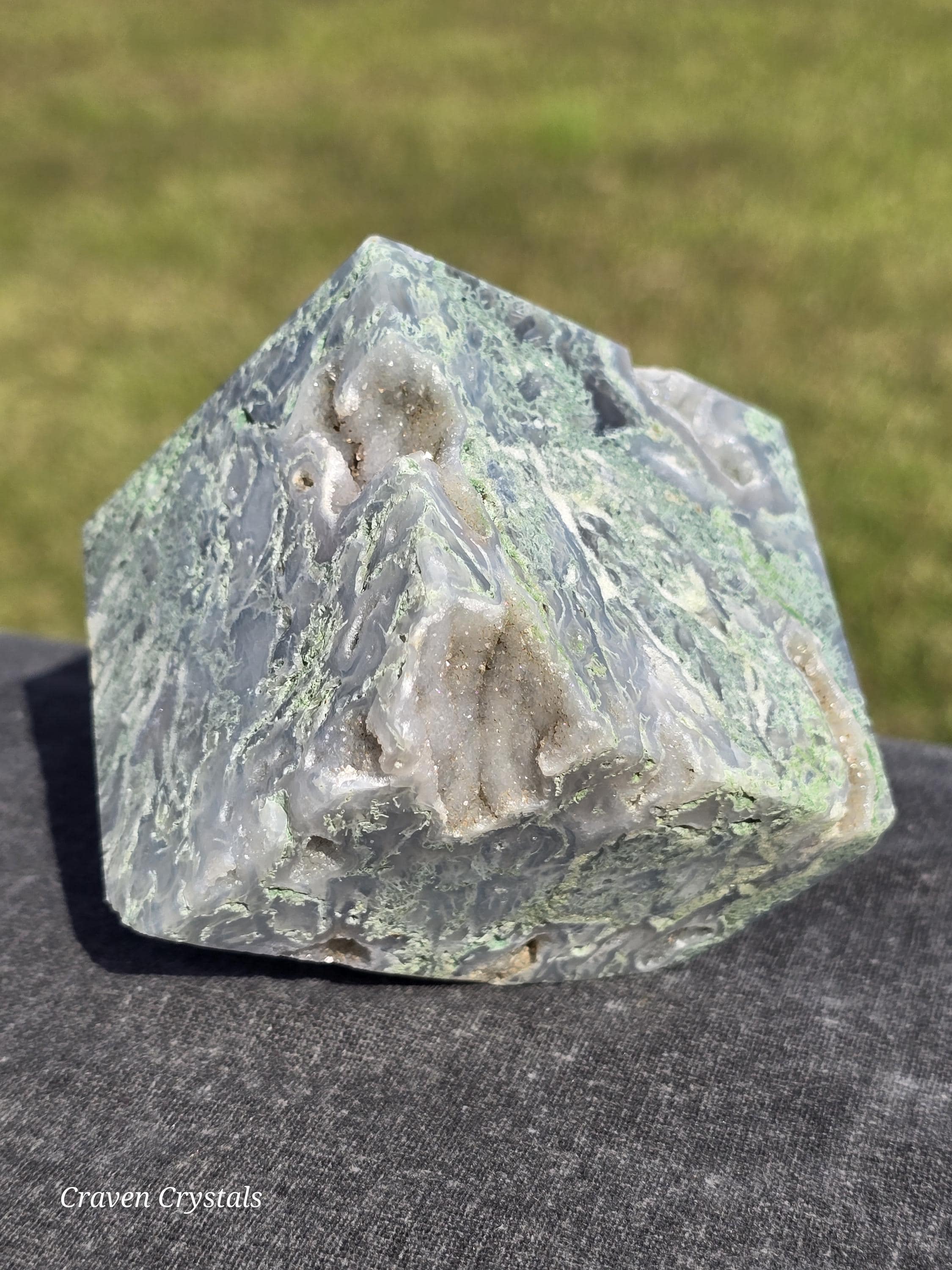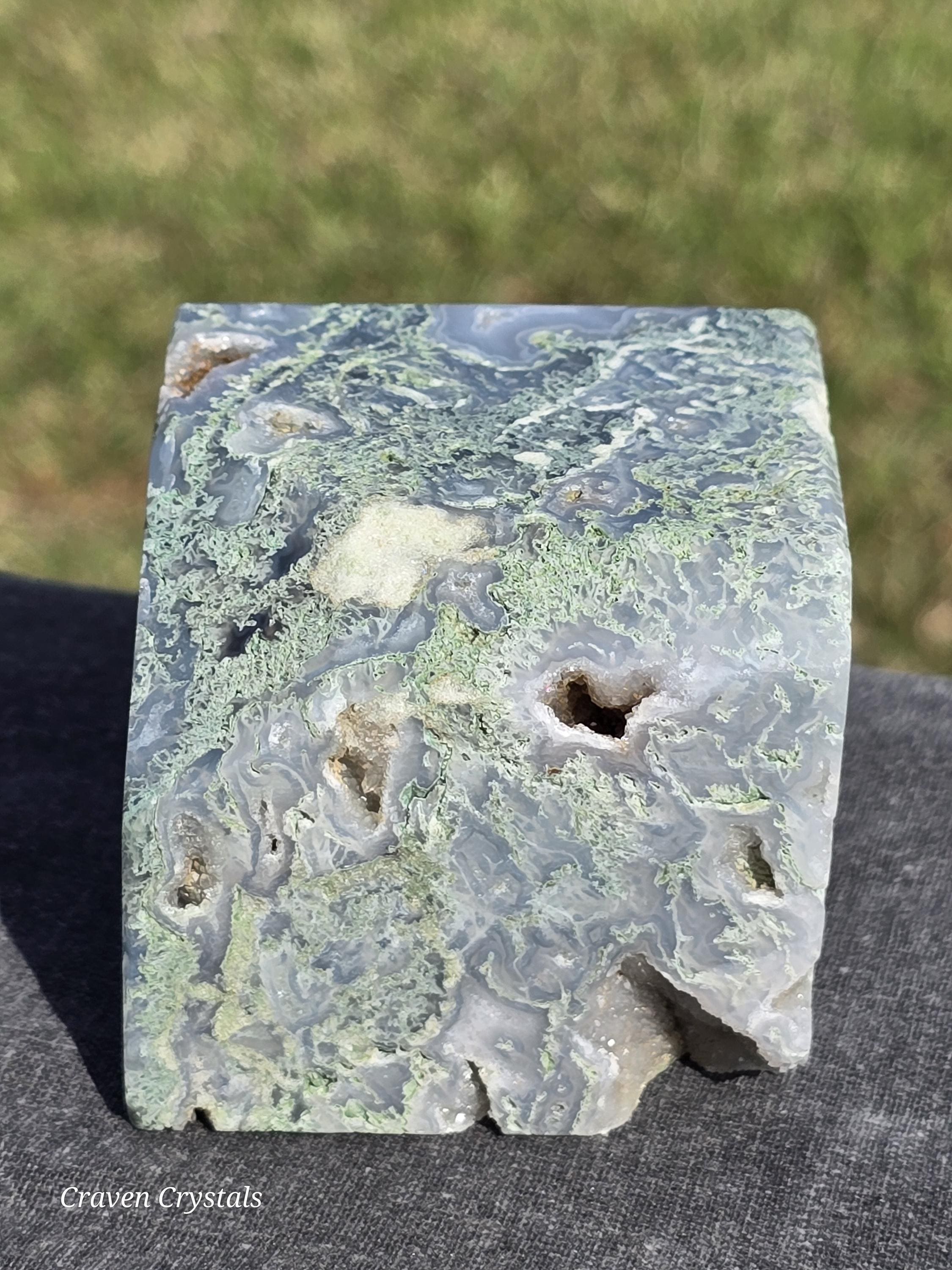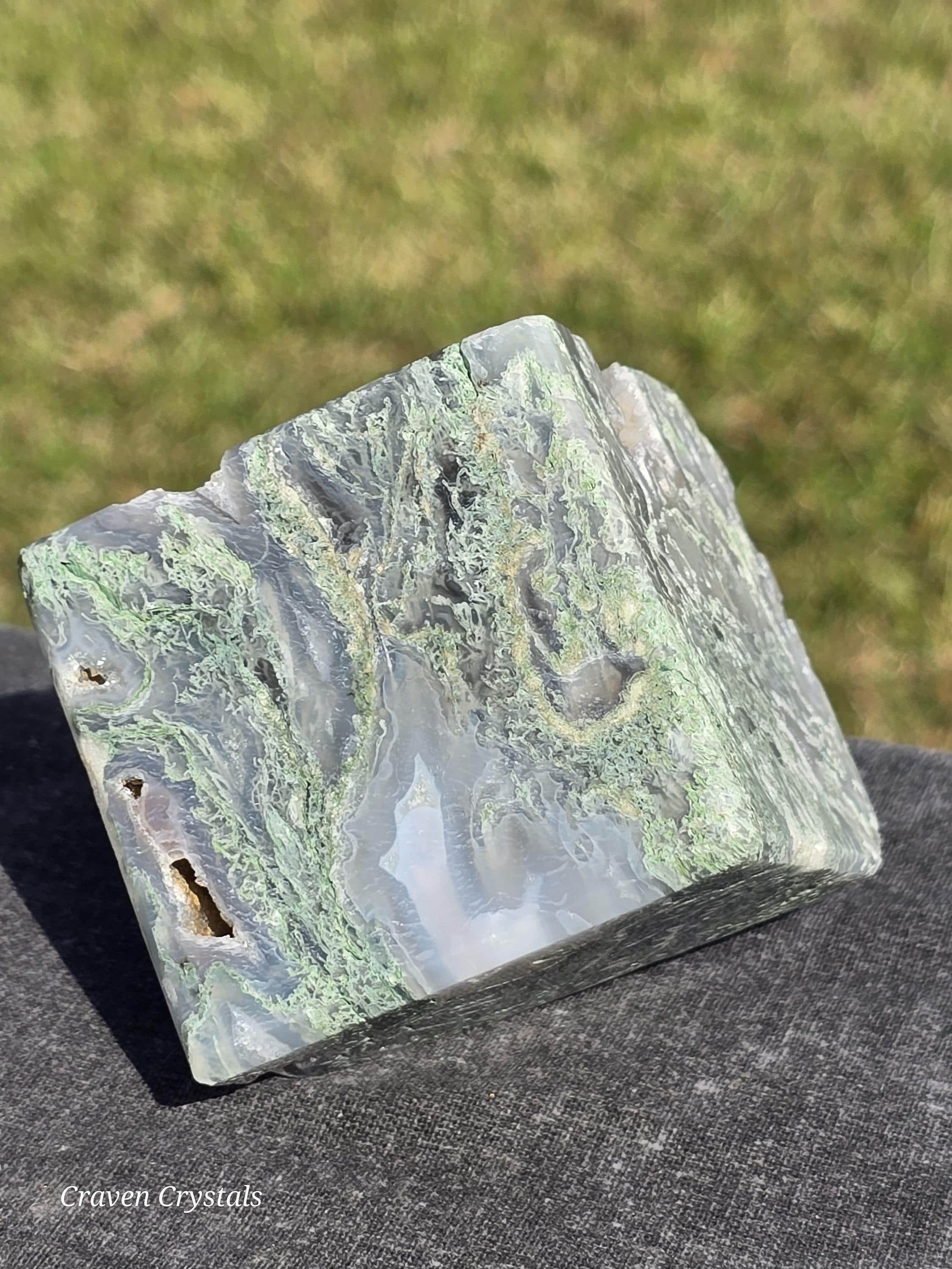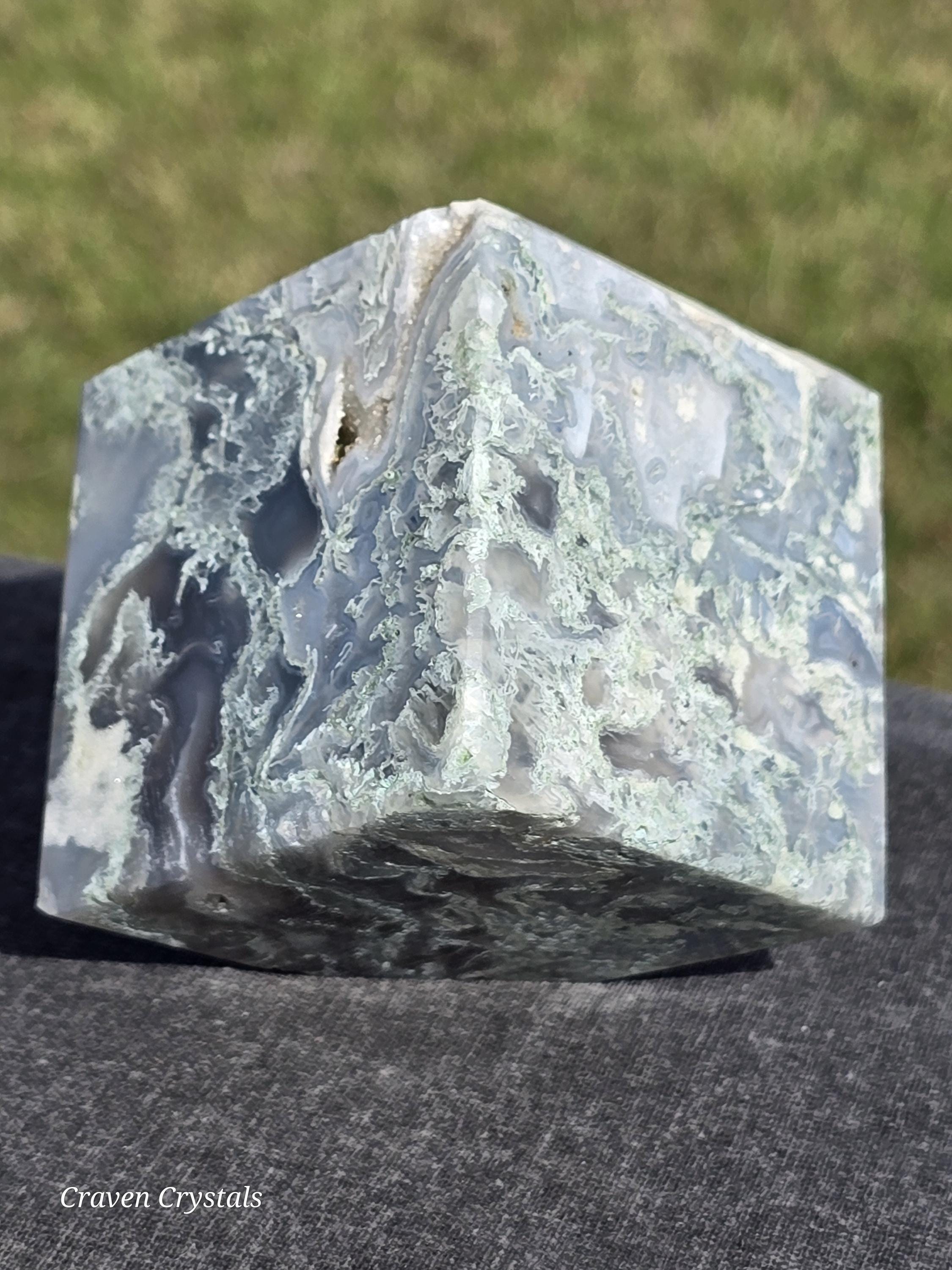 Moss Agate Crystal Cubes with cut corners for angled showcase
