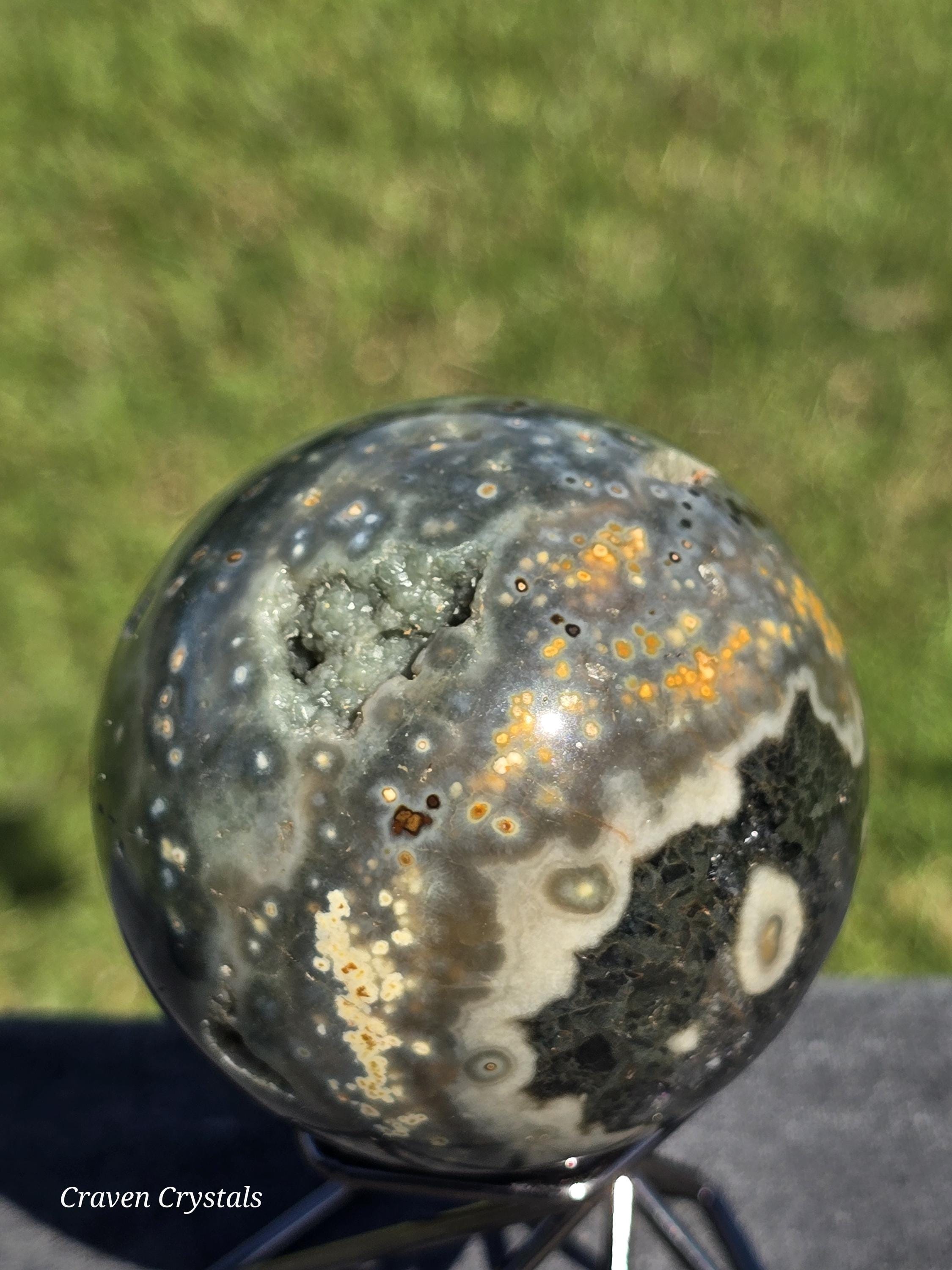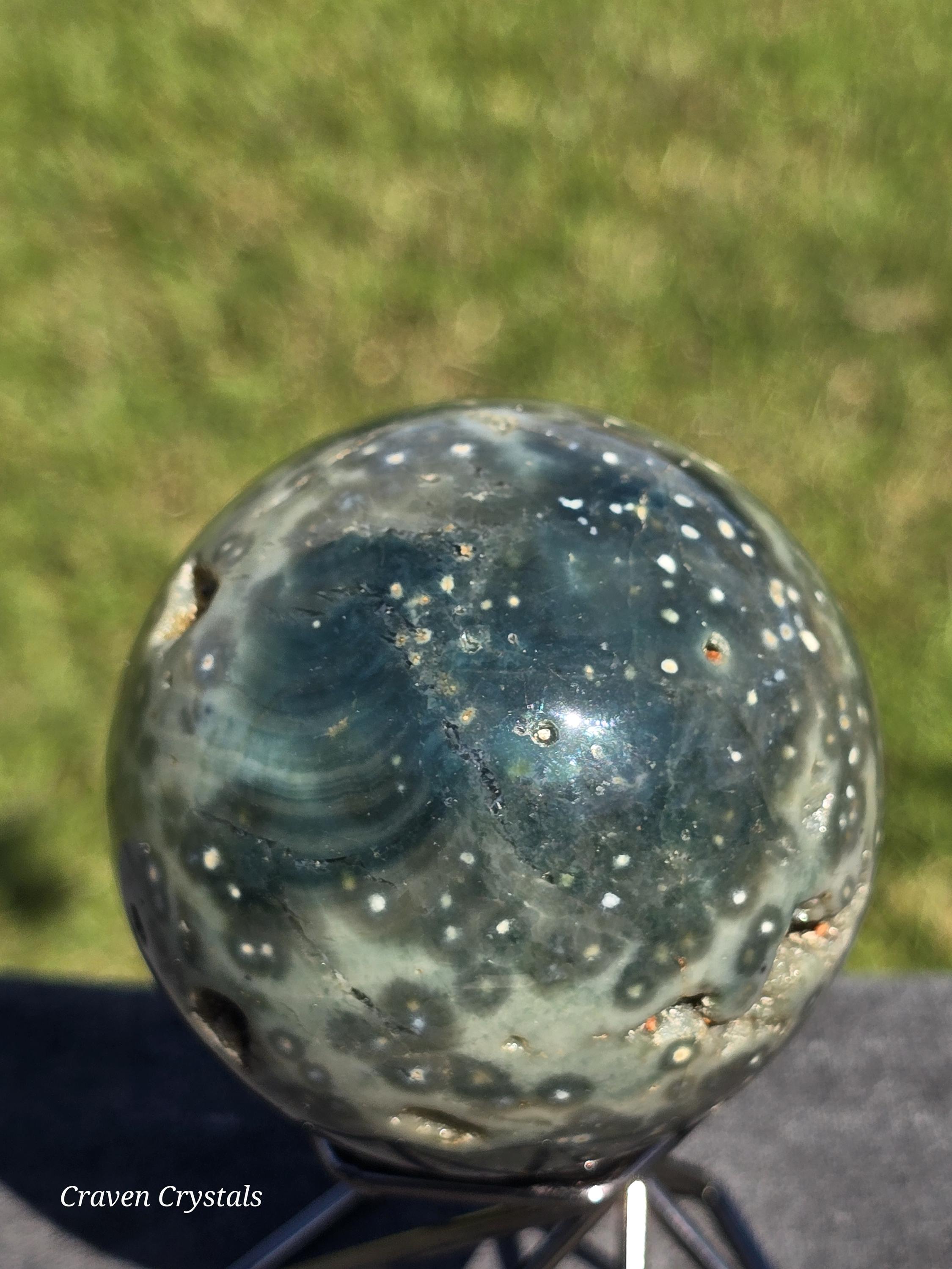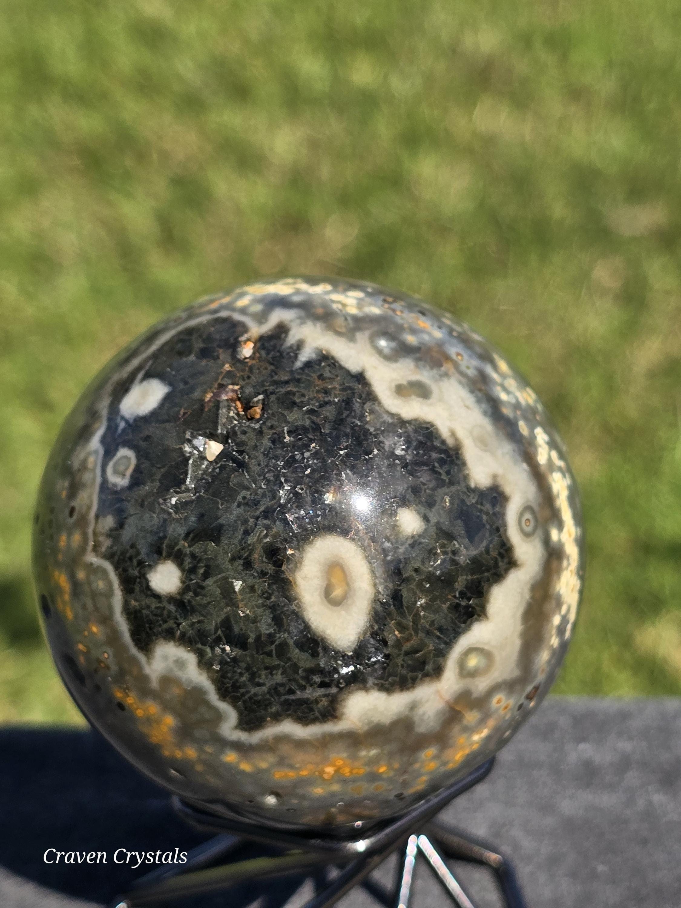 High quality Orbicular Ocean Jasper Crystal Sphere with signature green and yellow eyes