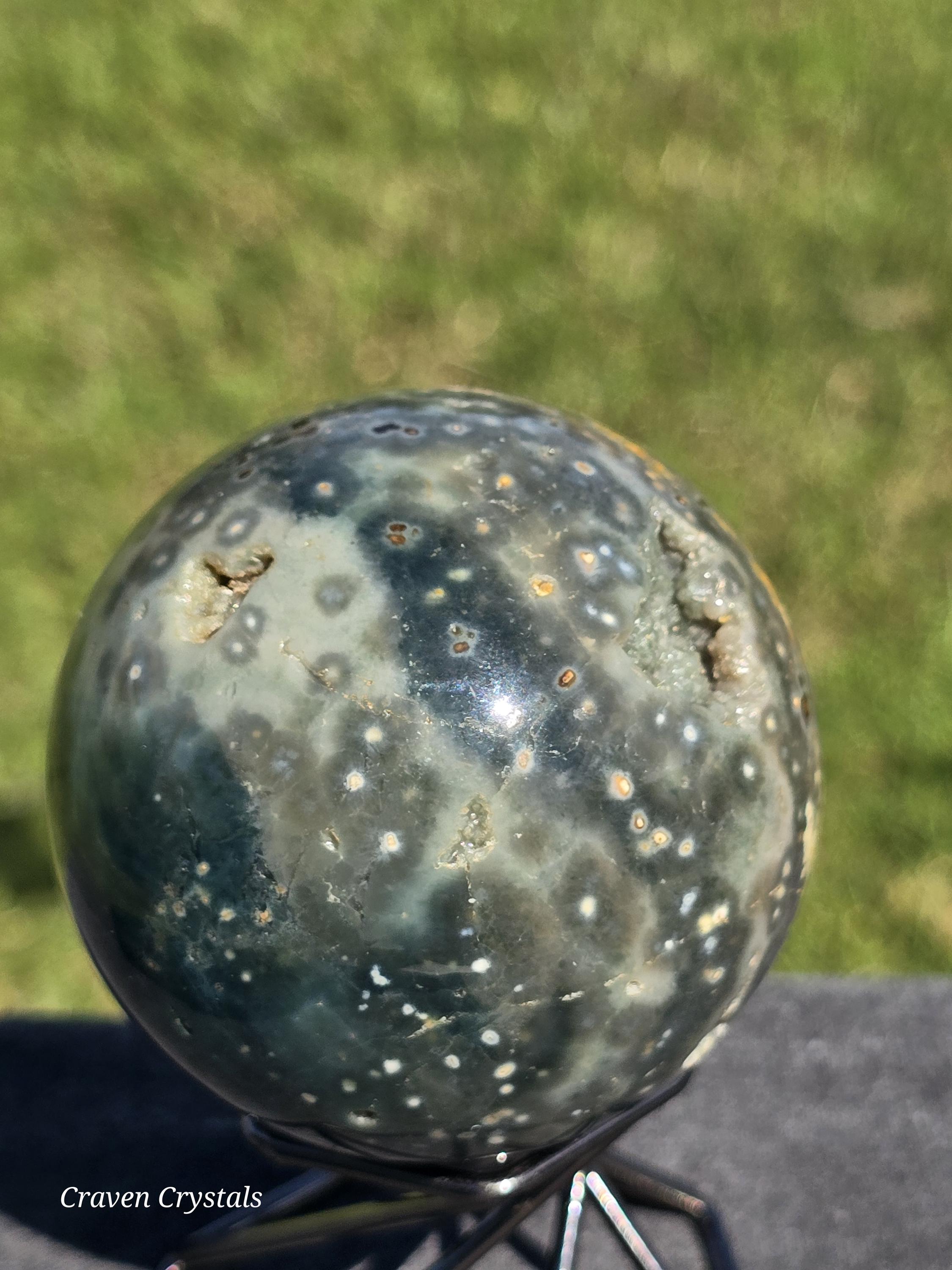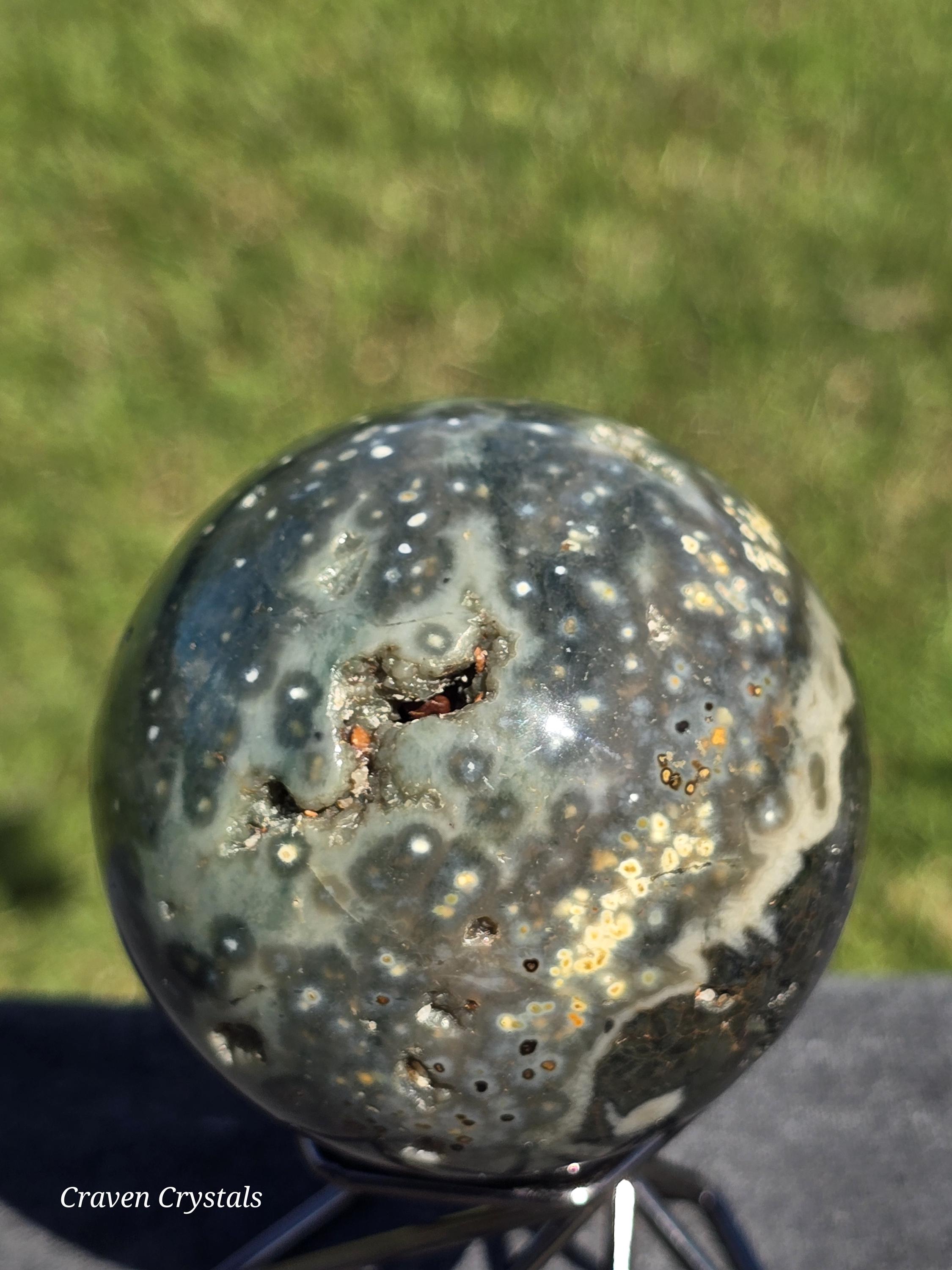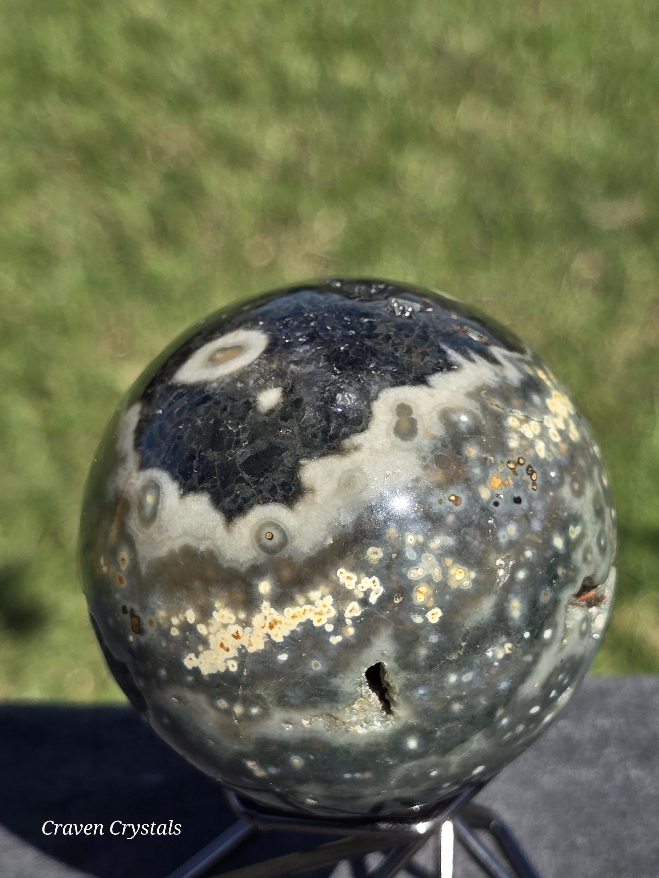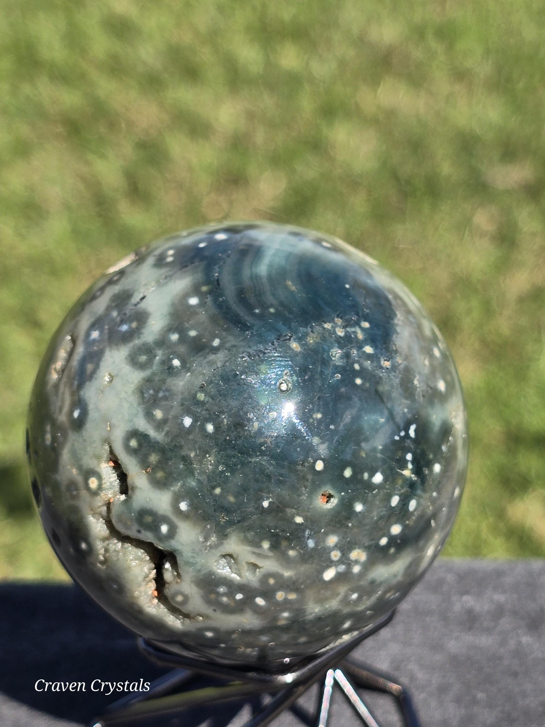 High quality Orbicular Ocean Jasper Crystal Sphere with signature green and yellow eyes