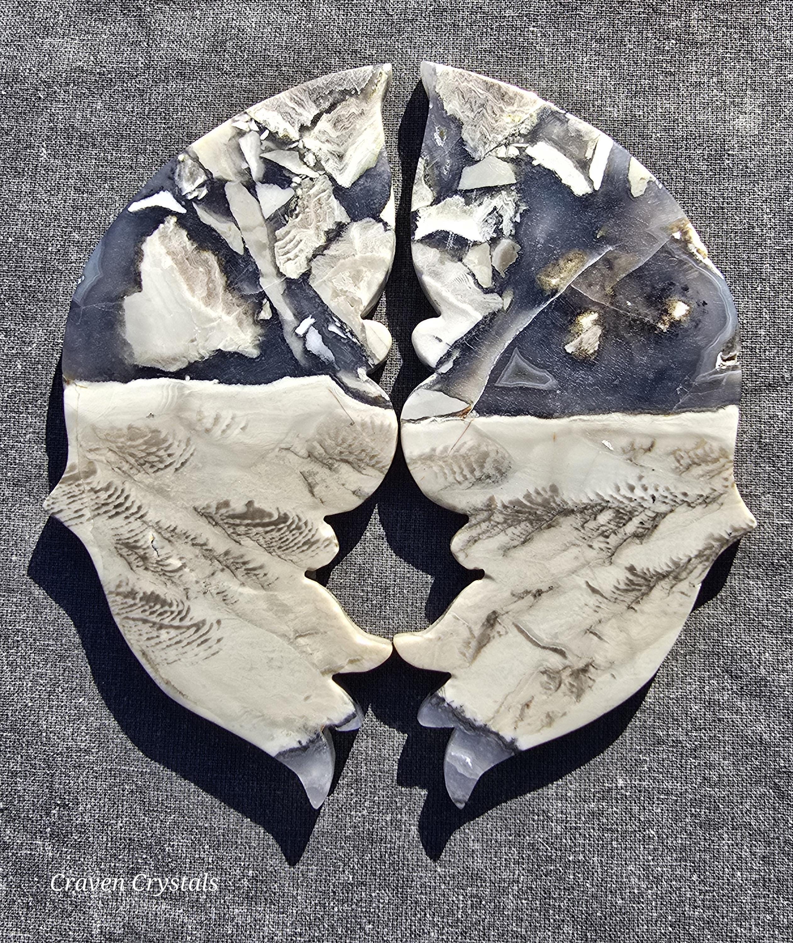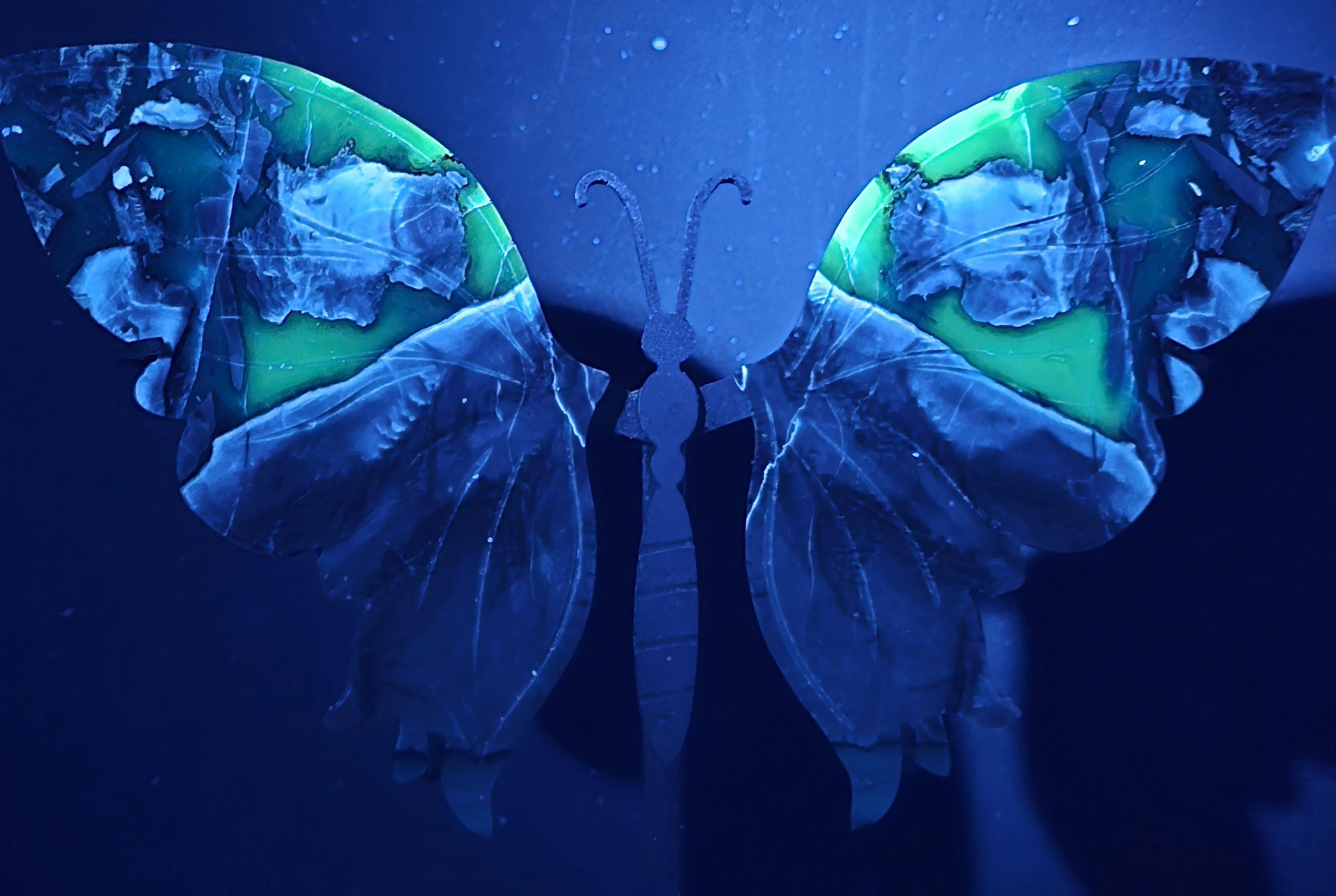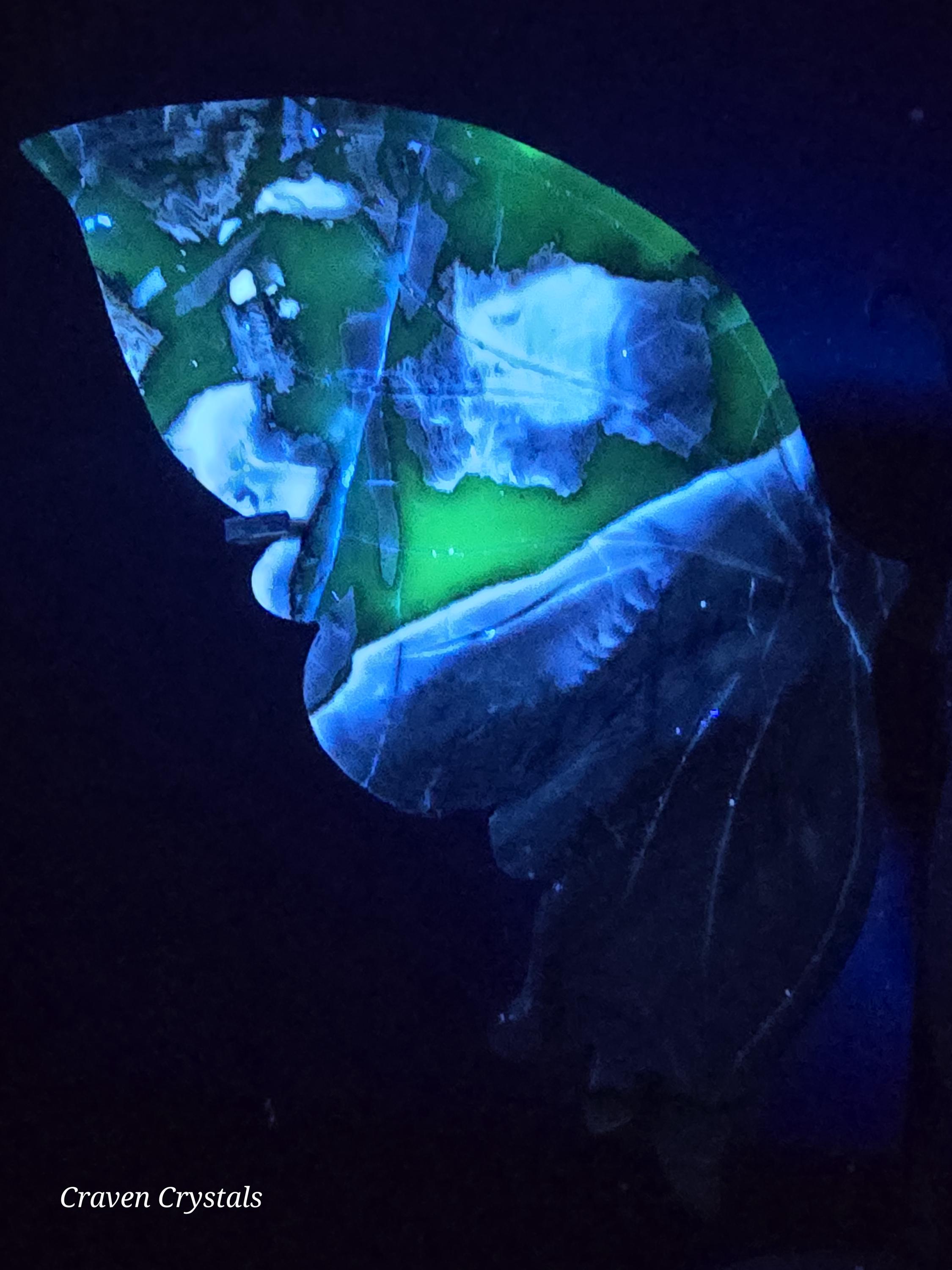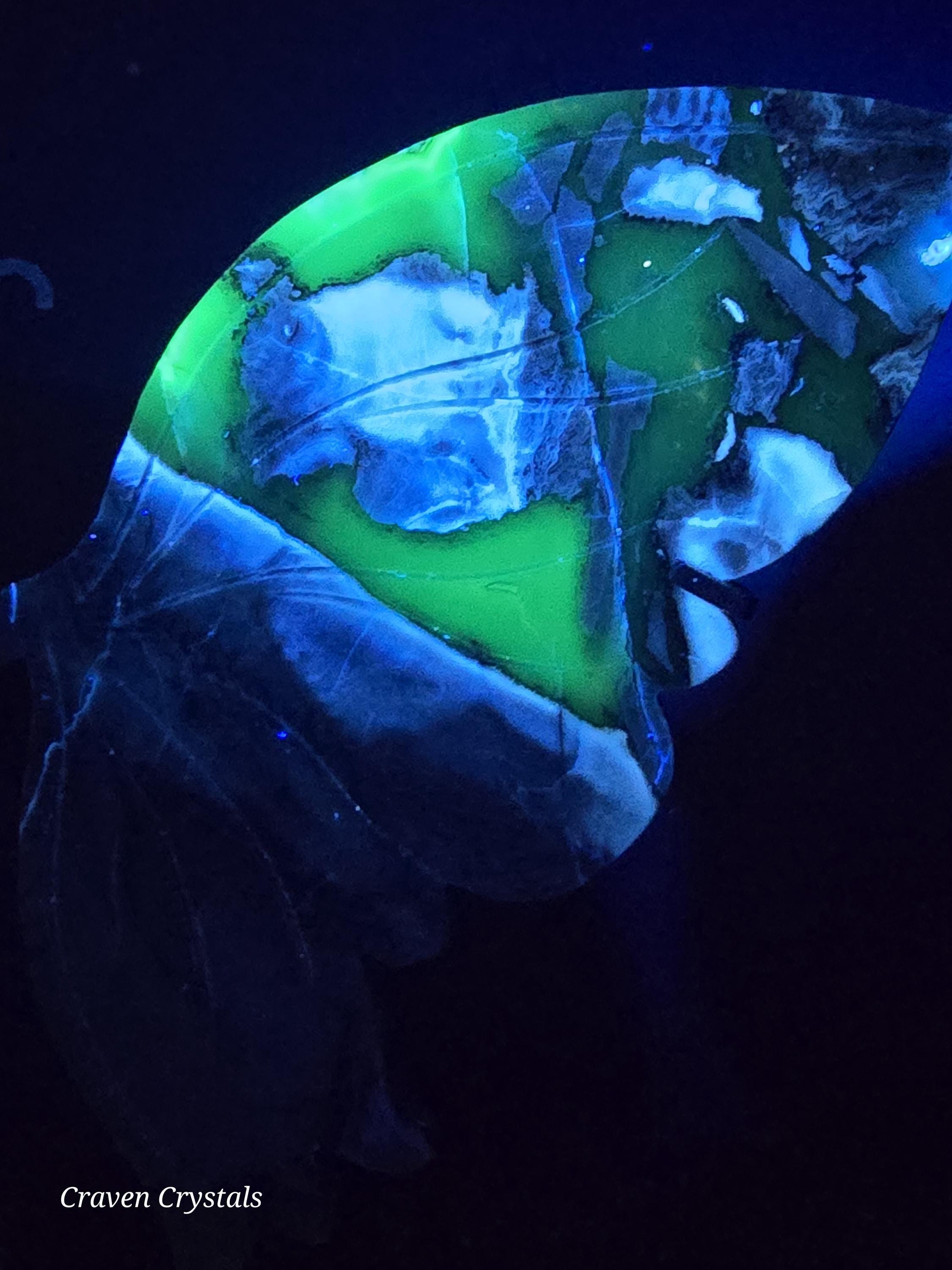 Fluorescent Volcano Agate Crystal Butterfly Wings, a type of agate that exhibits fluorescence when exposed to ultraviolet (UV) light.