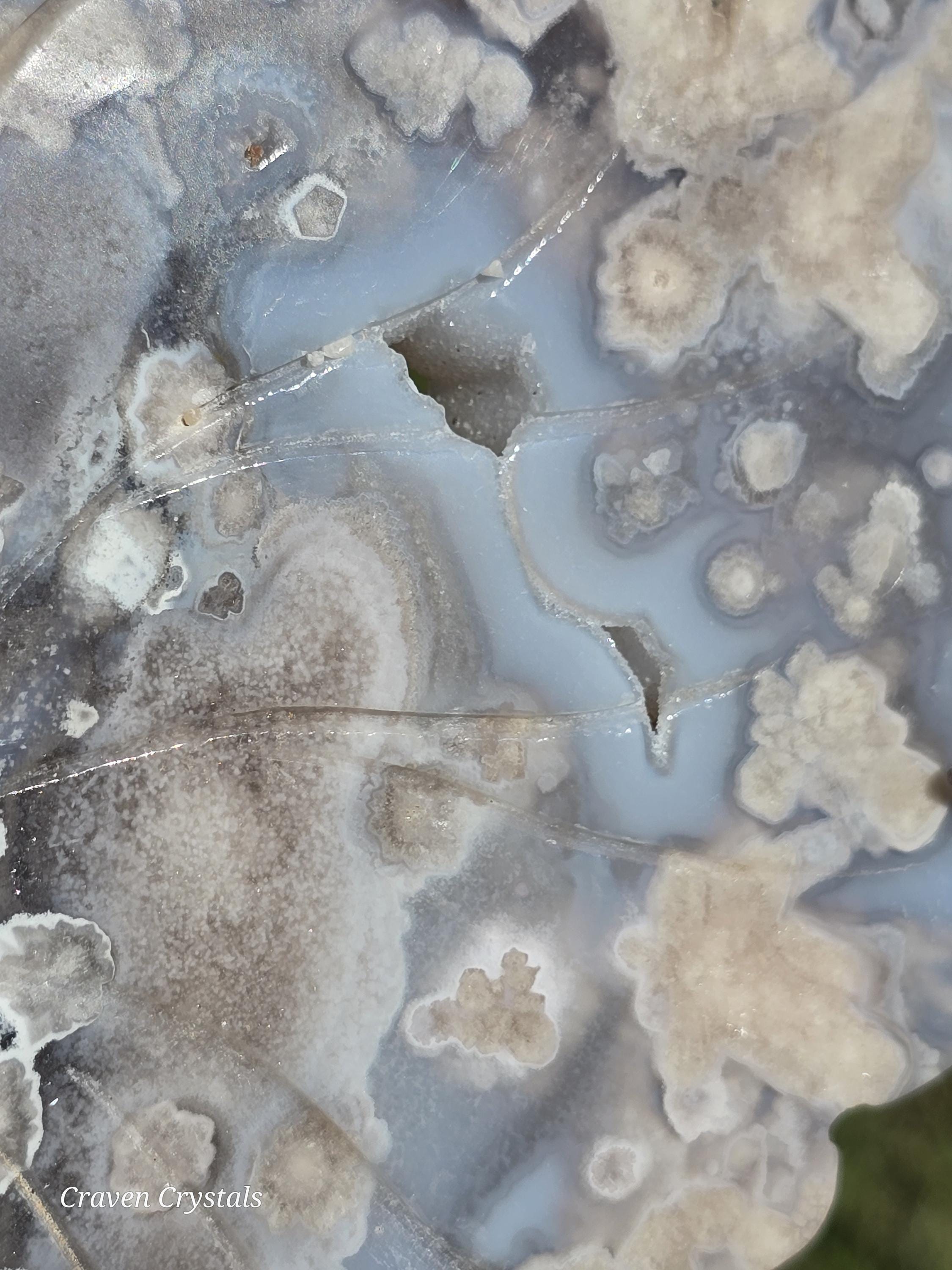 Flower Agate is believed to be associated with personal growth, transformation, and reaching one's full potential. It is considered a crystal that can inspire motivation, self-growth, and the achievement of goals. It's often associated with qualities such as grounding, stability, and protection. Blue Agate, symbolizing inner peace and introspection, emanates a tranquil and soothing energy that brings forth patience and serenity.
