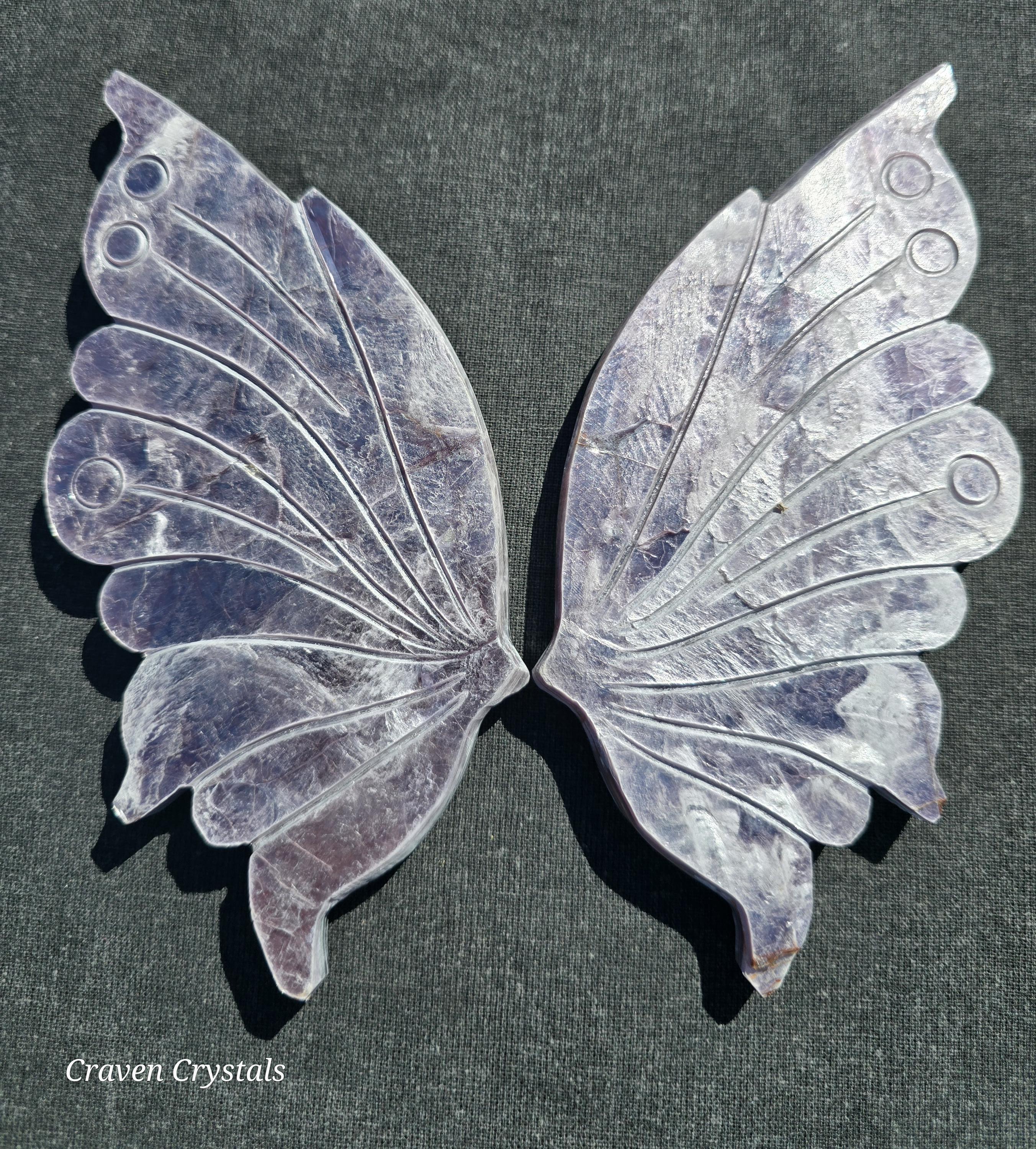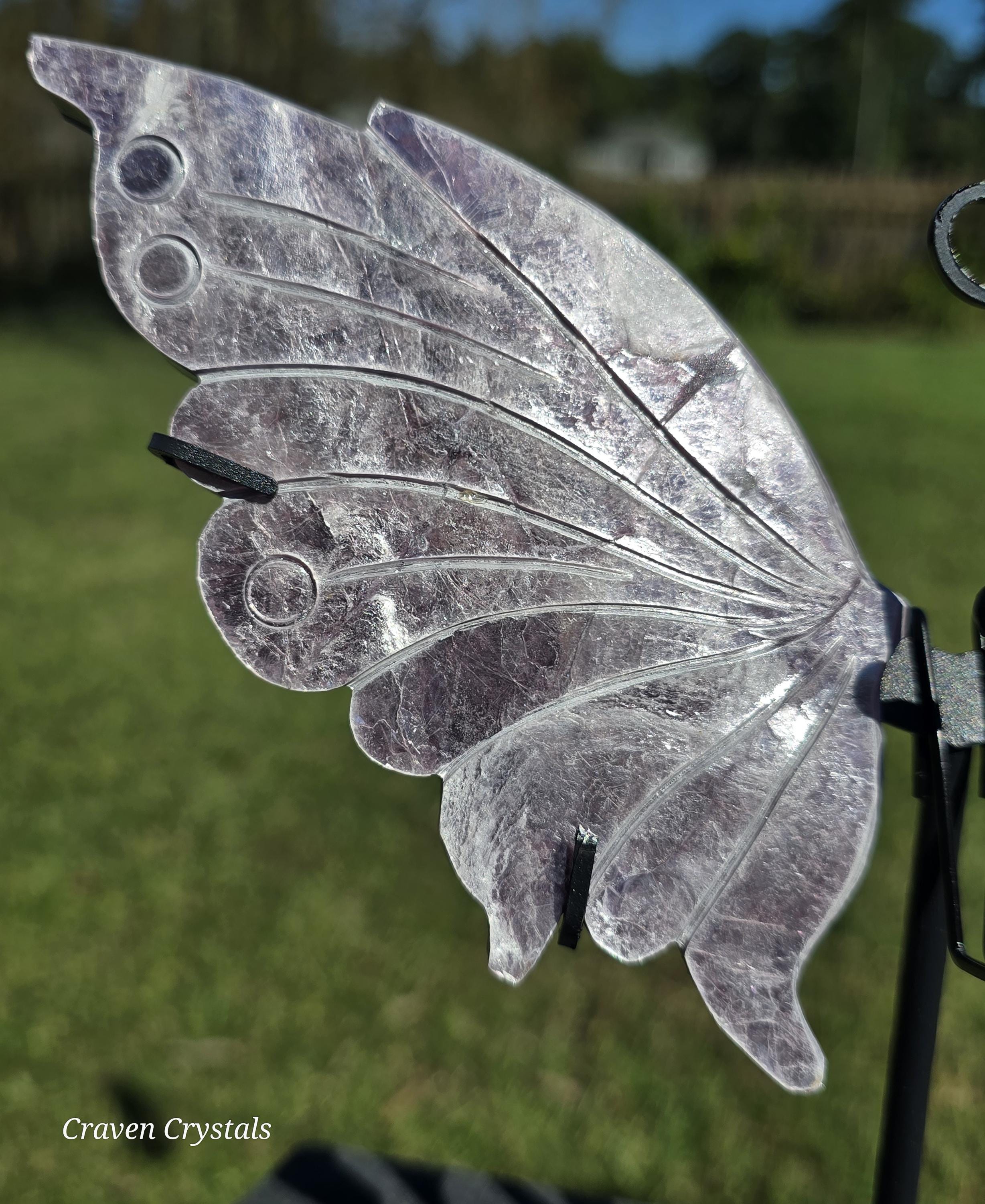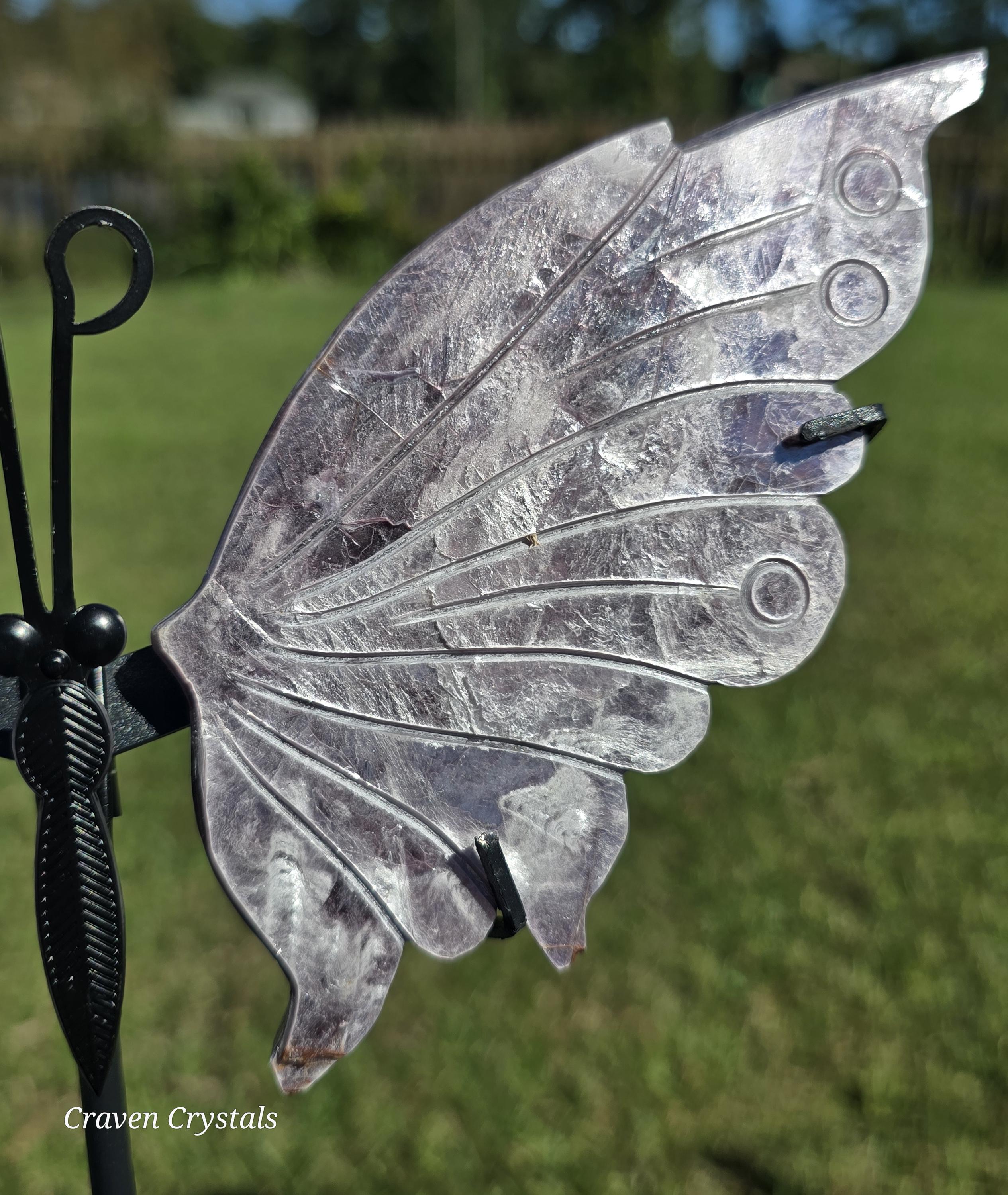 Stunning light lavender Purple Mica Crystal Butterfly Wings with silver flash. These are extremely delicate as mica is very soft and can peel or flake which makes them rare to see carved.