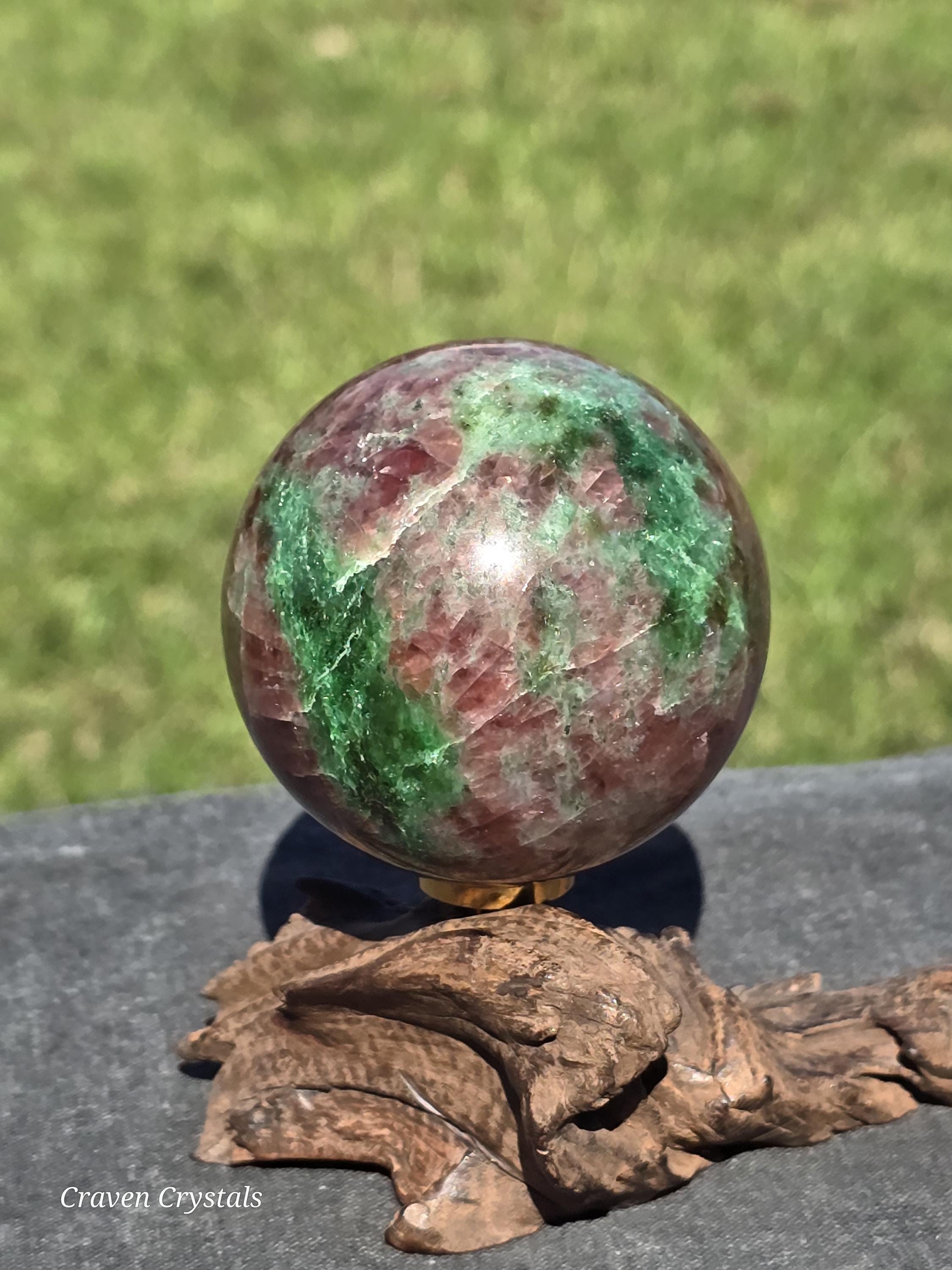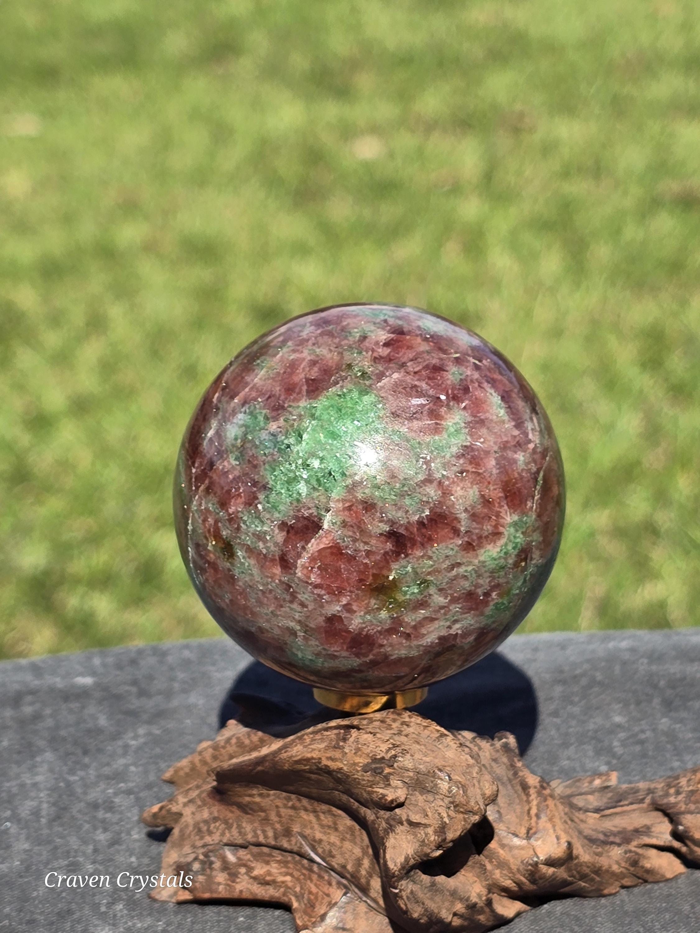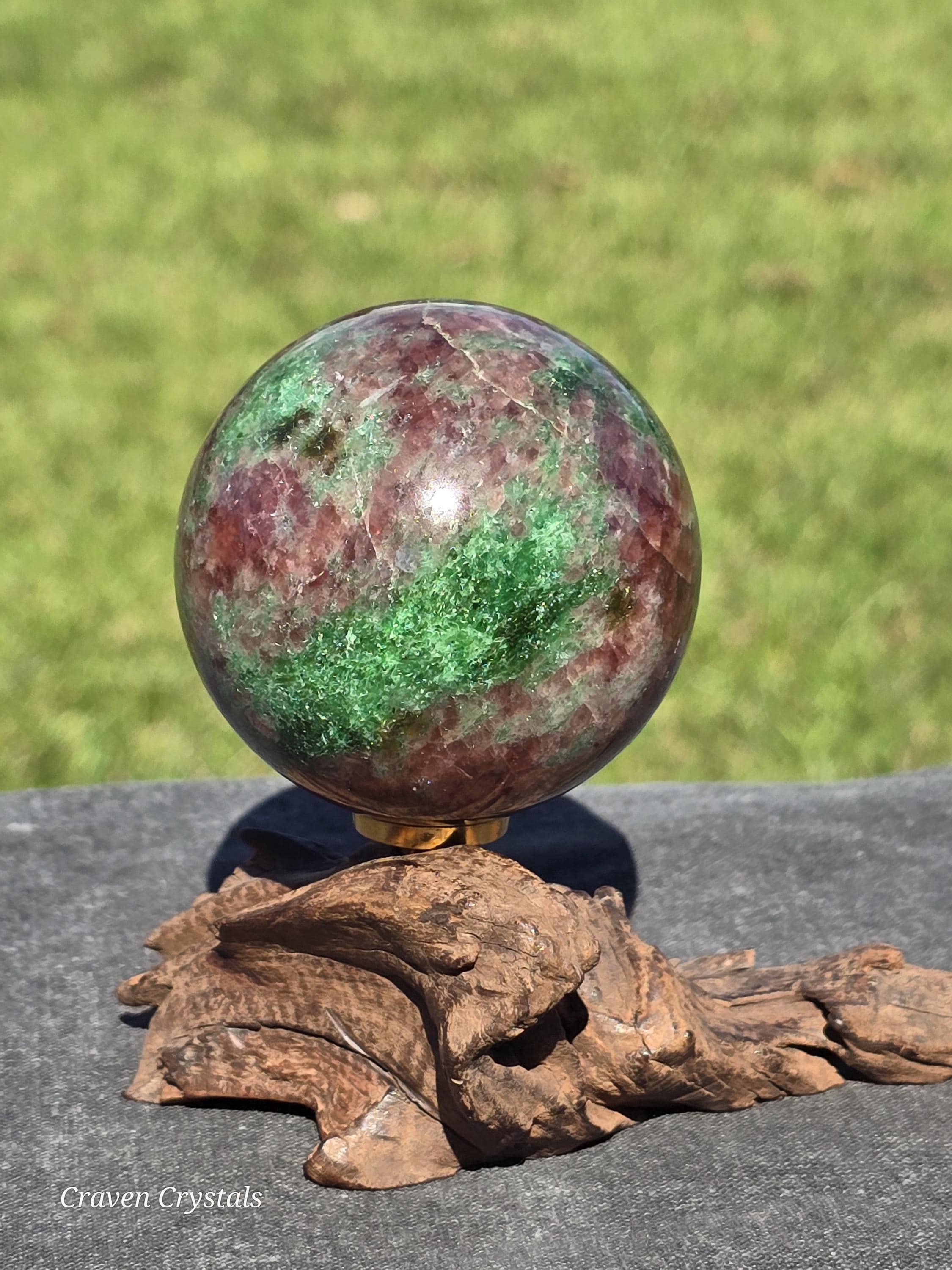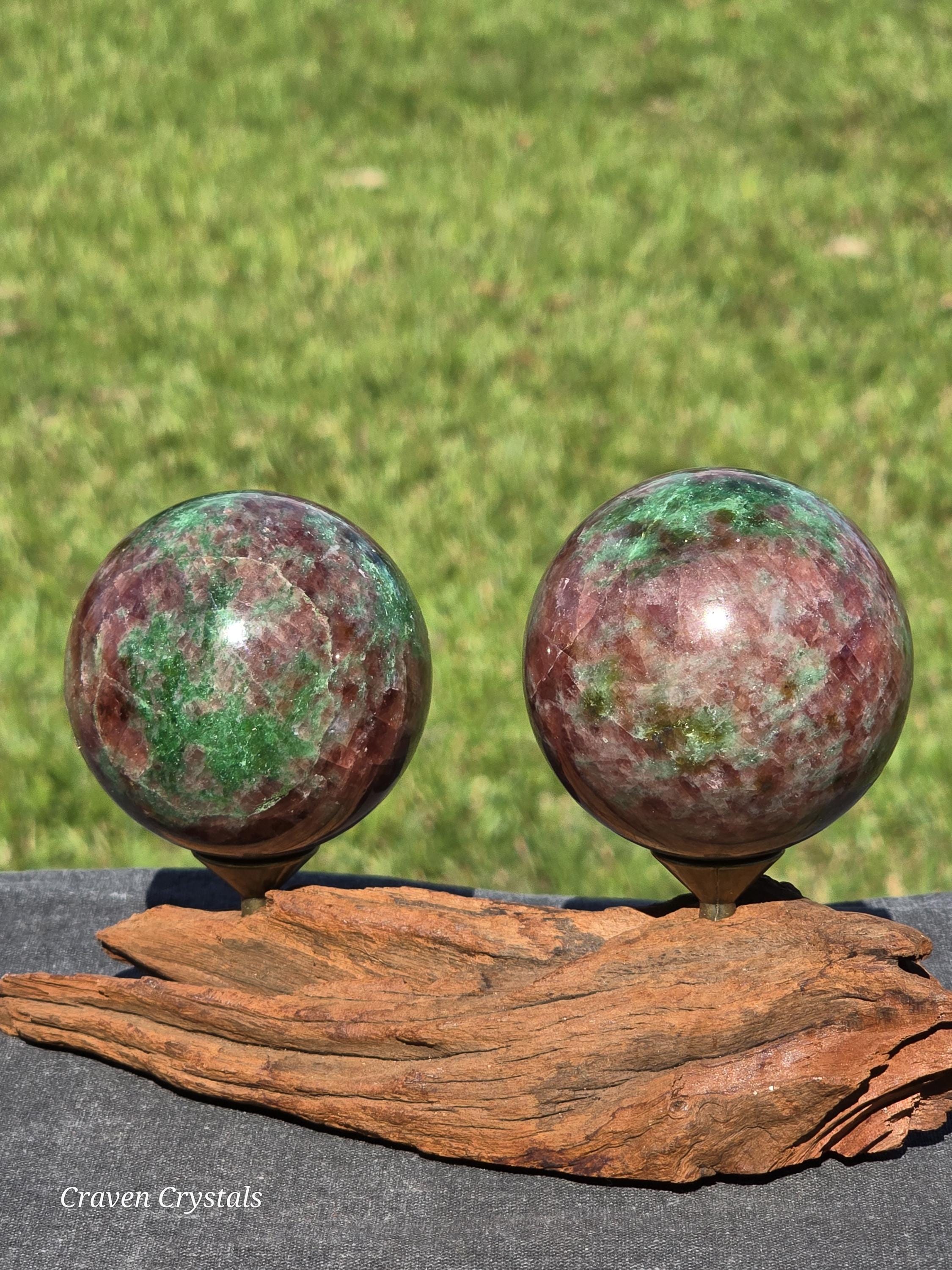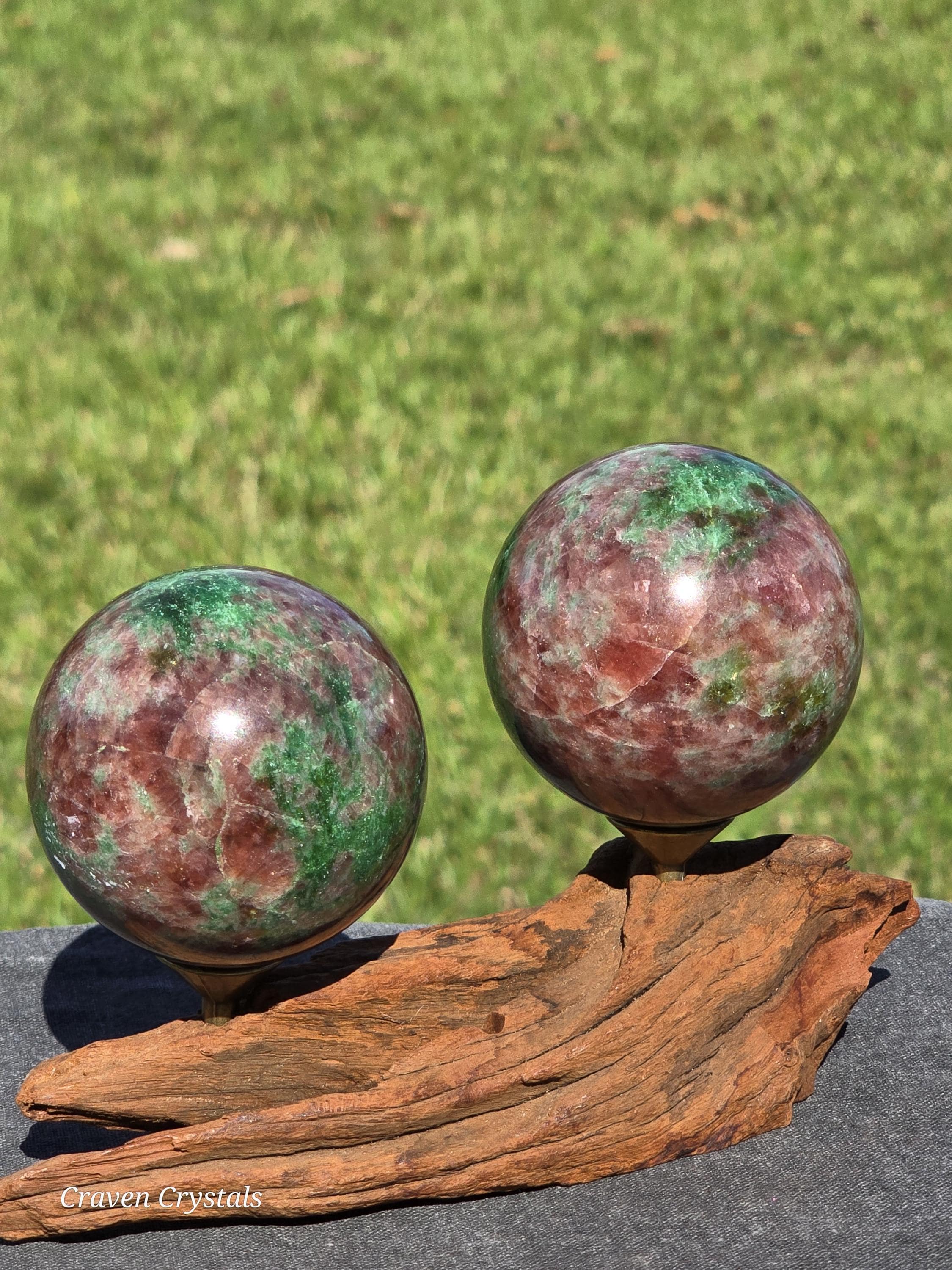 Red and Green Strawberry Quartz Crystal Spheres, a striking contrast of warm, berry-like reds and cool, earthy greens