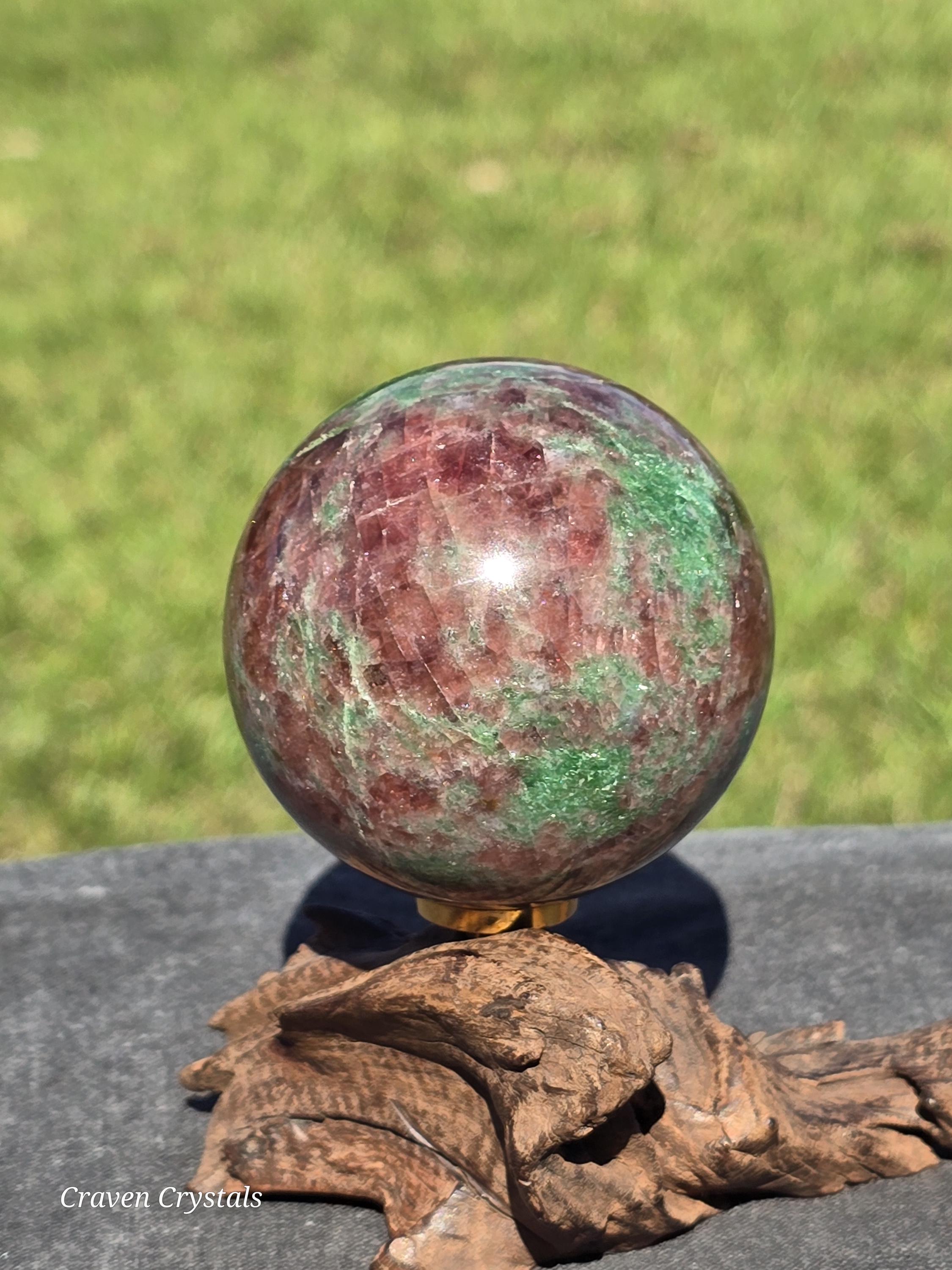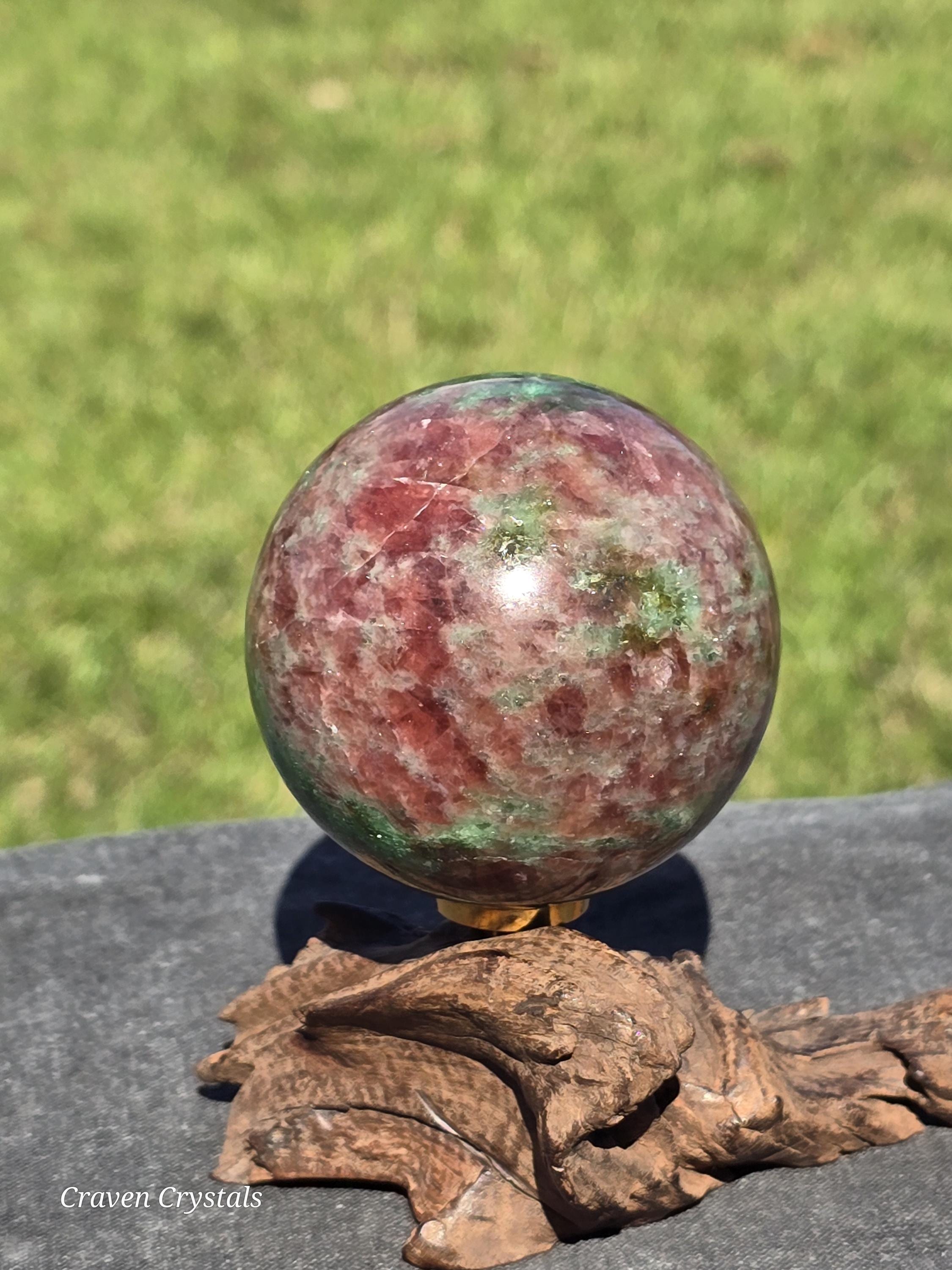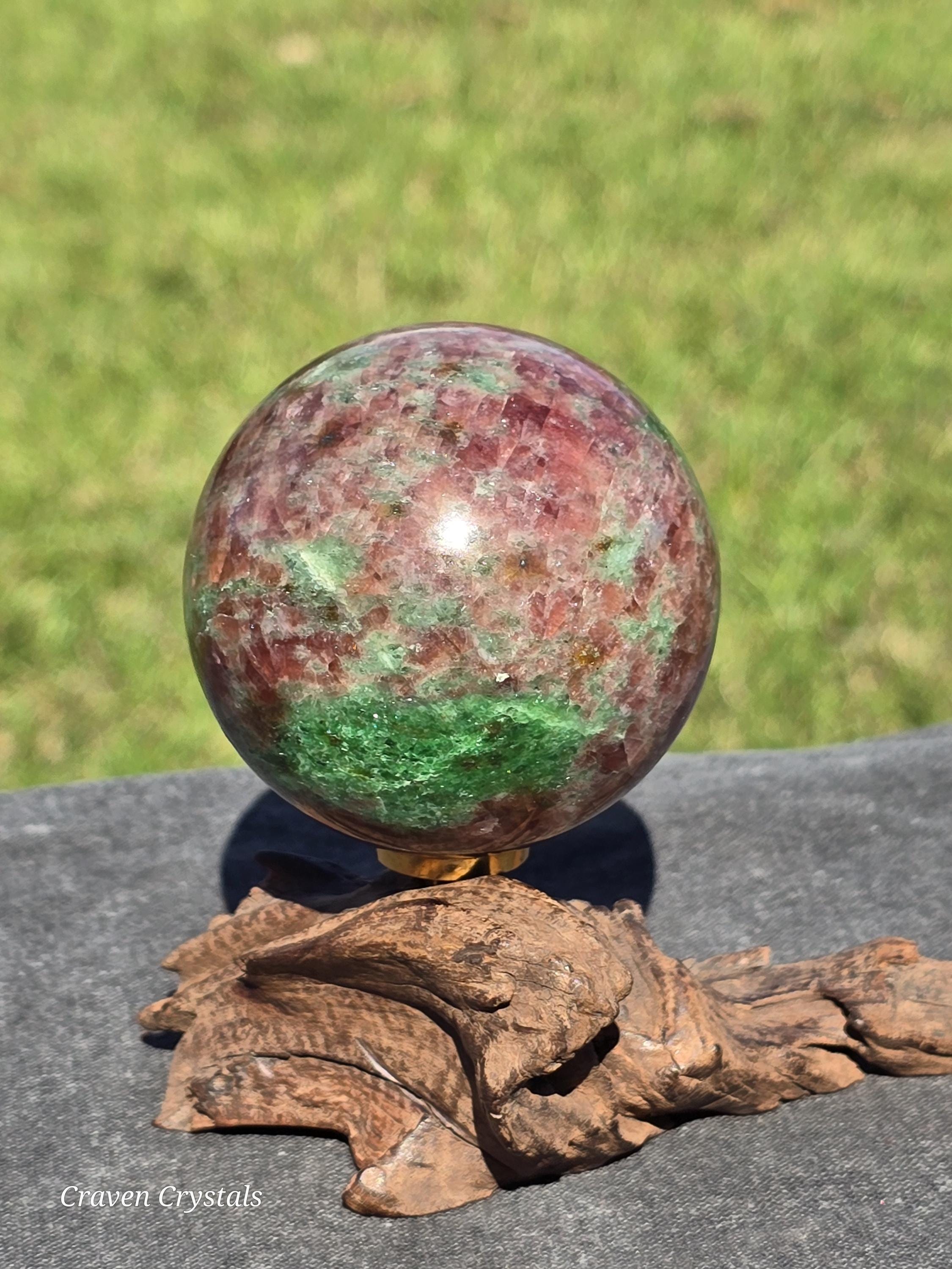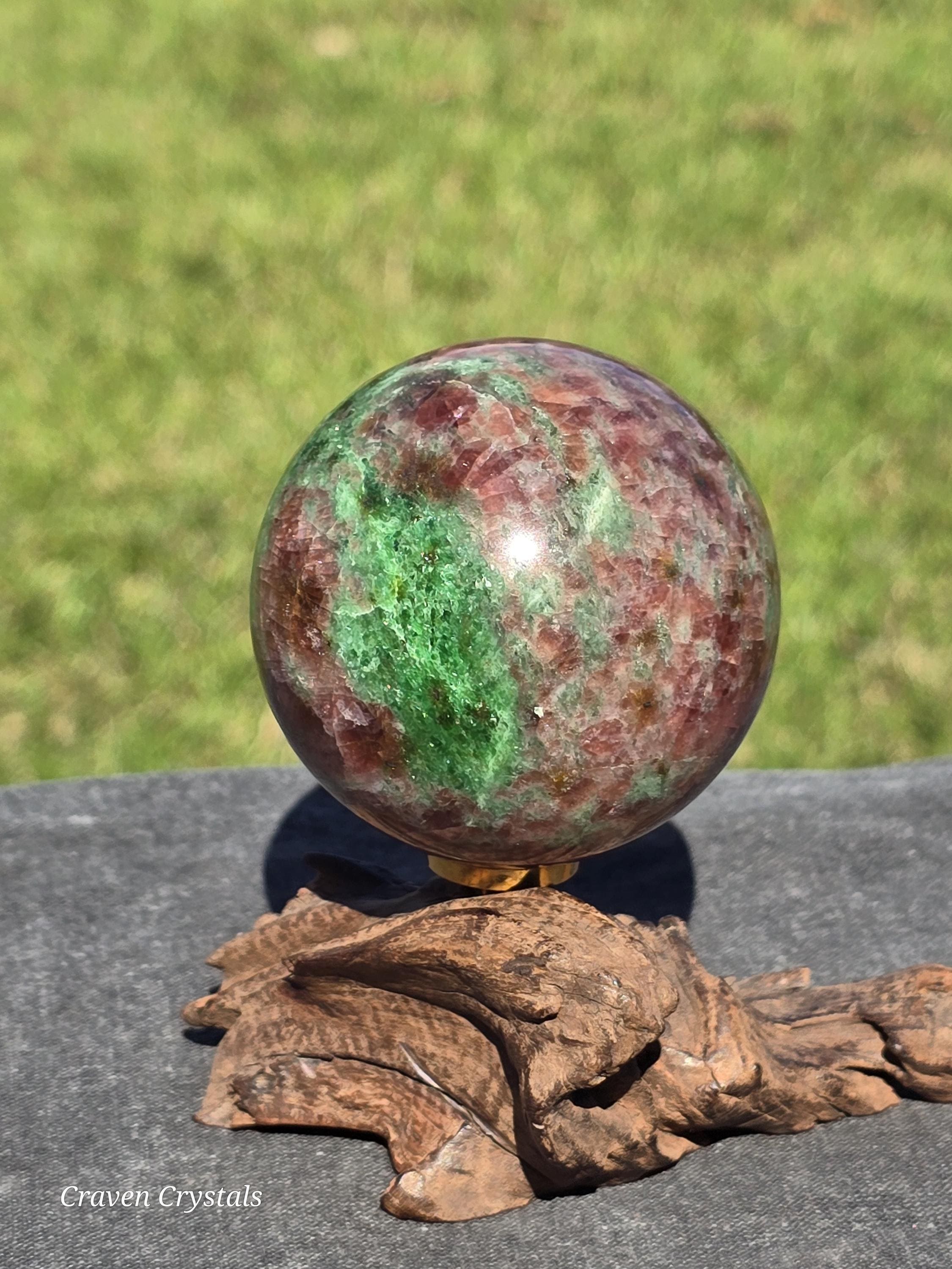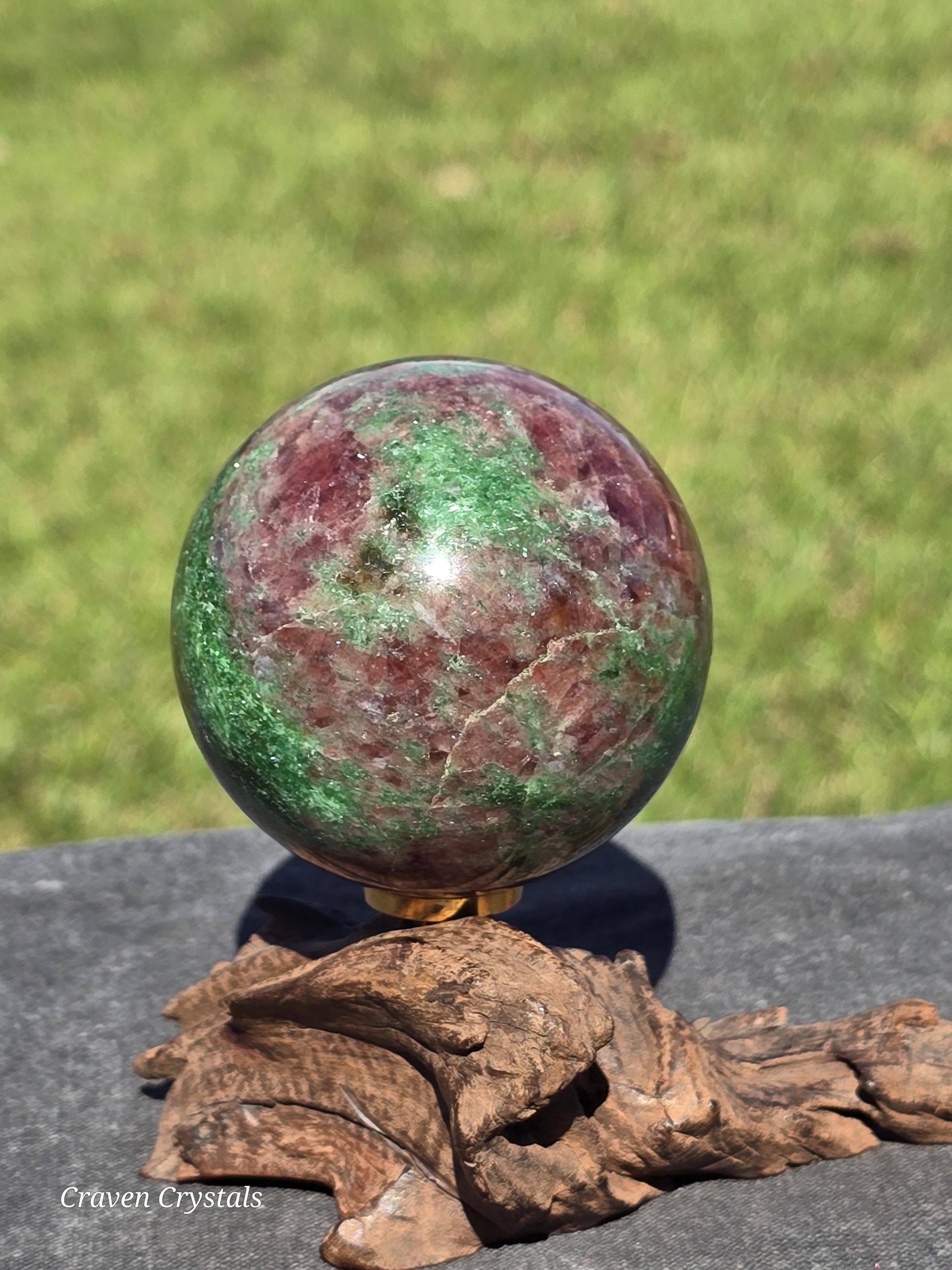 Red and Green Strawberry Quartz Crystal Spheres, a striking contrast of warm, berry-like reds and cool, earthy greens