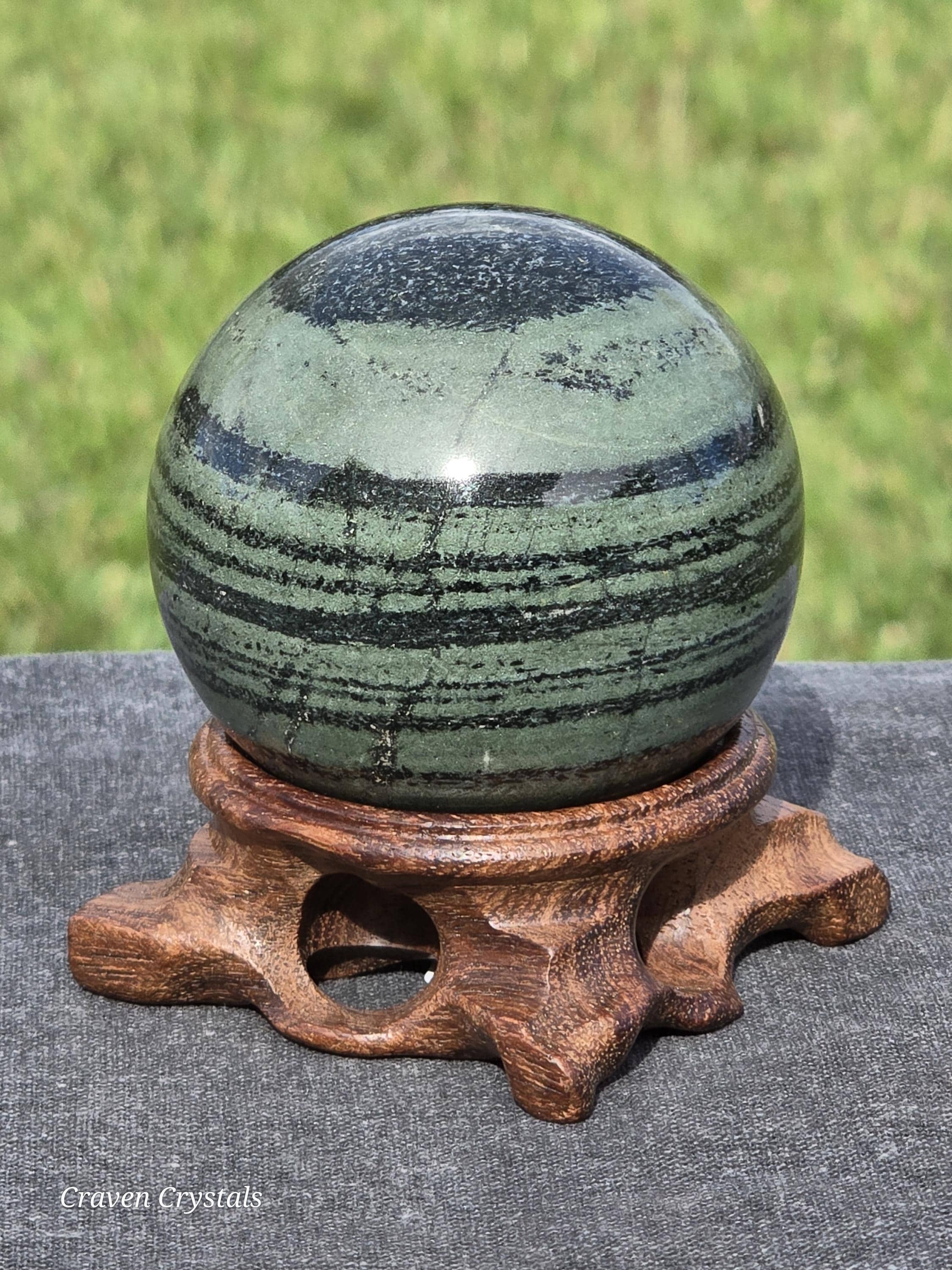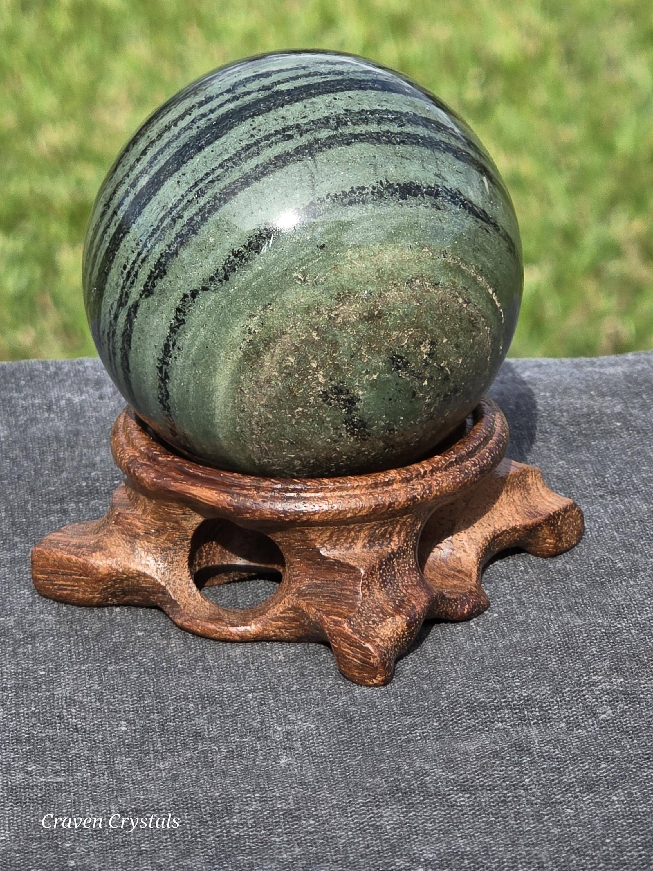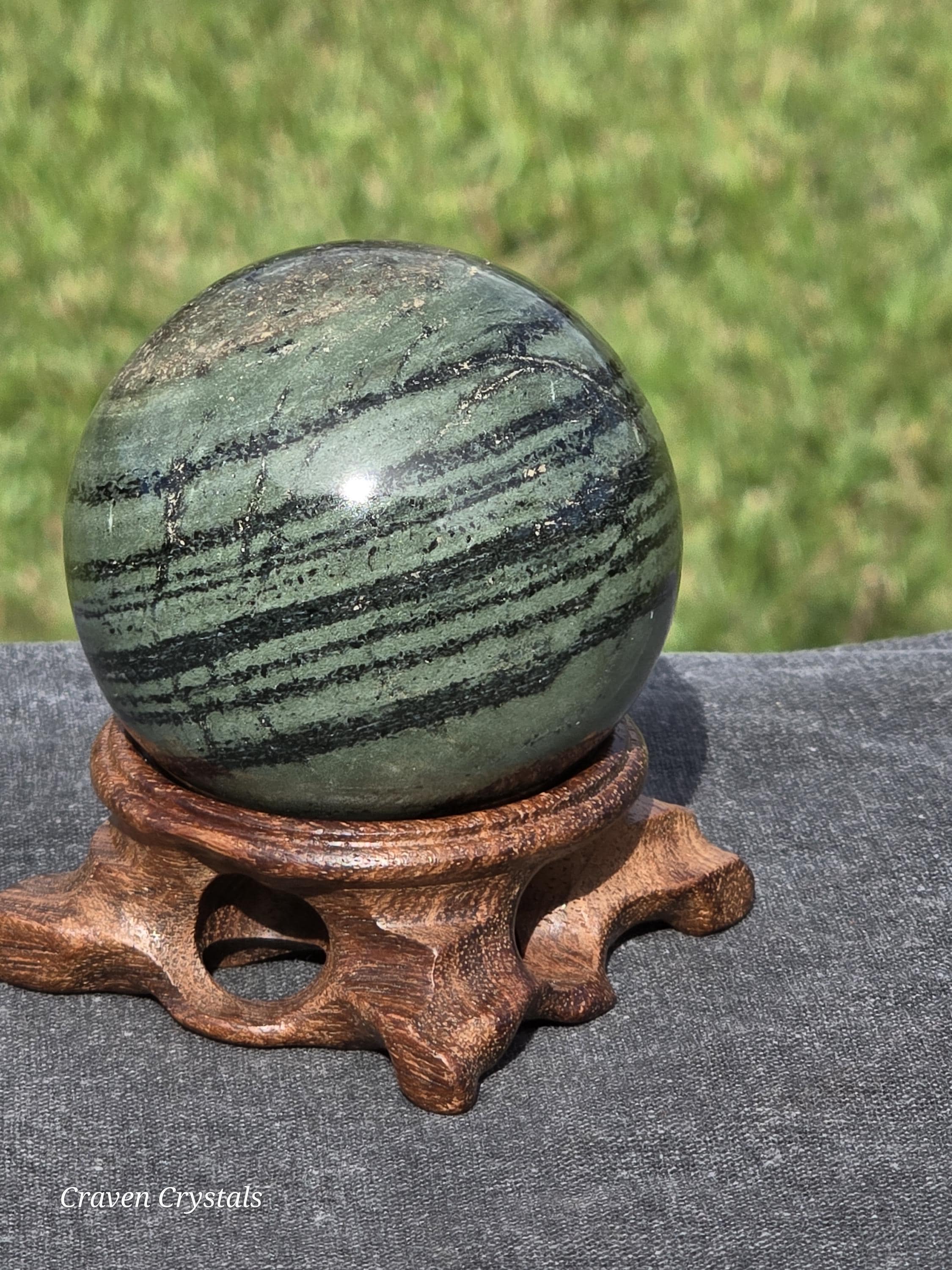 Gorgeous shades of Green are included in this Green Zebra Jasper Crystal Sphere with lovely banding.