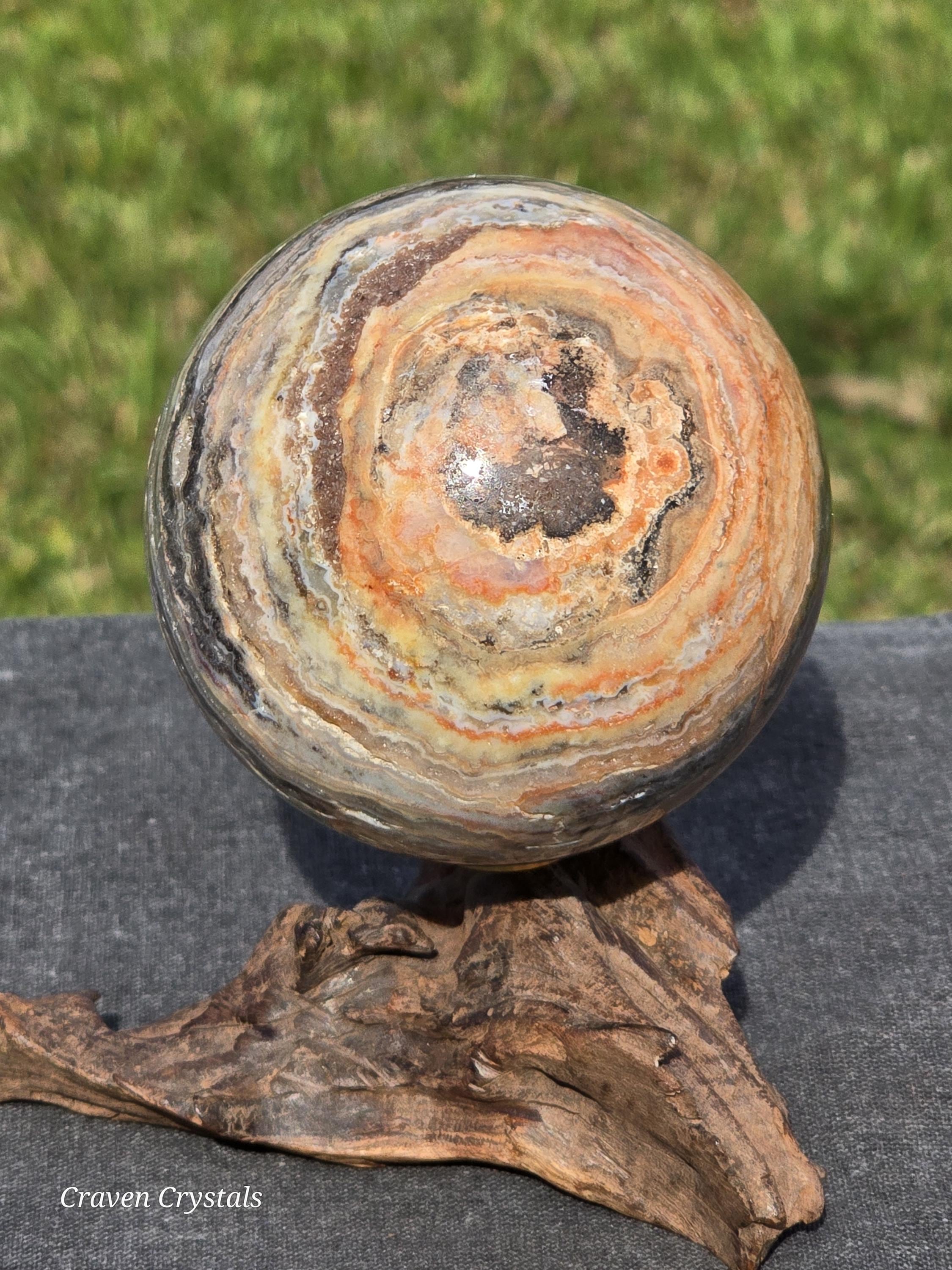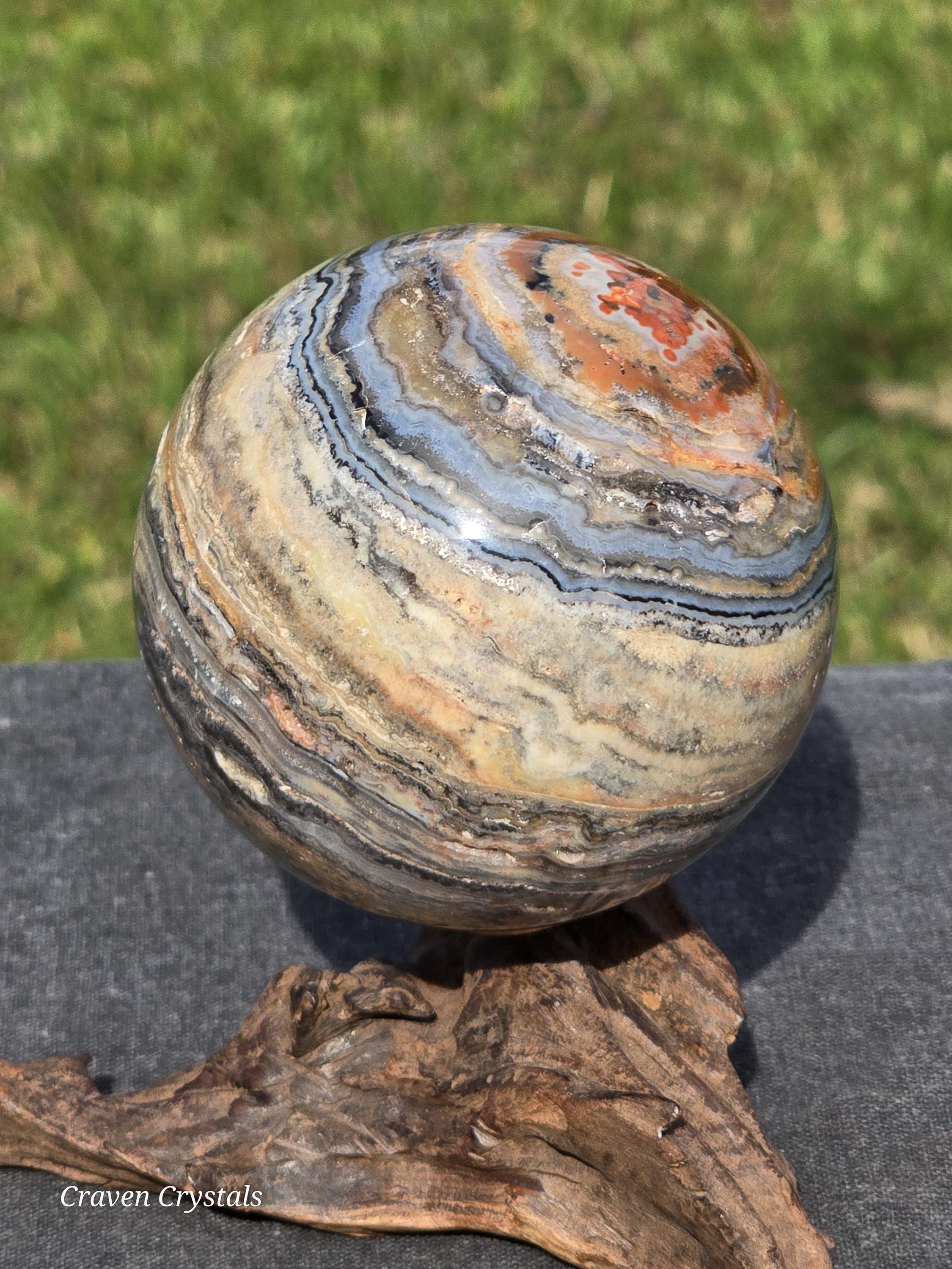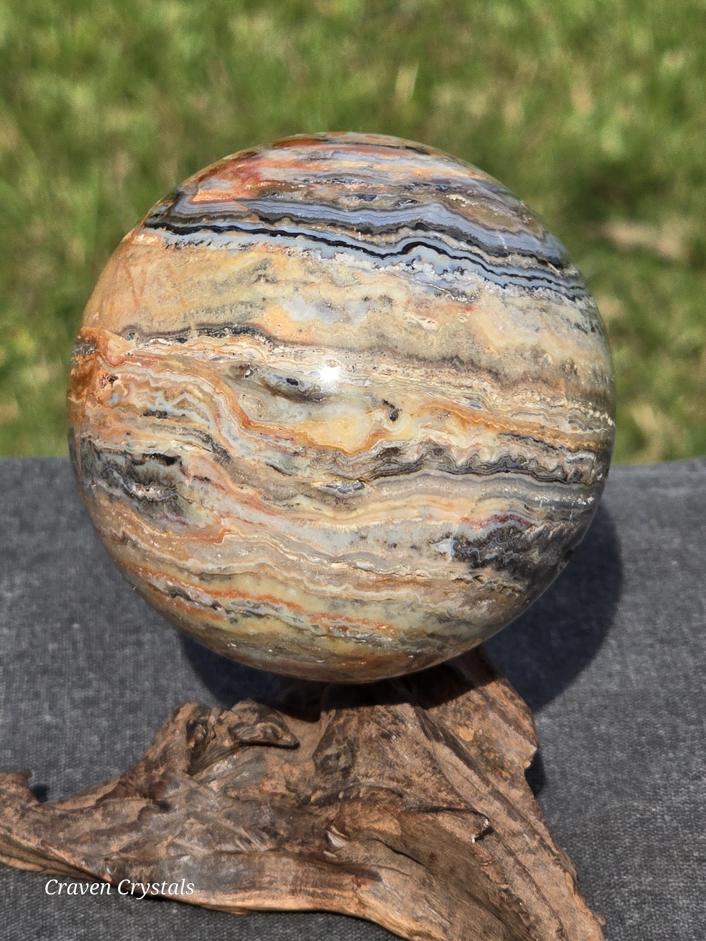 Laguna Crazy Lace Agate Crystal Sphere is one of the most vividly patterned and energetically uplifting varieties of agate, prized for its intricate, swirling lace-like bands of color.