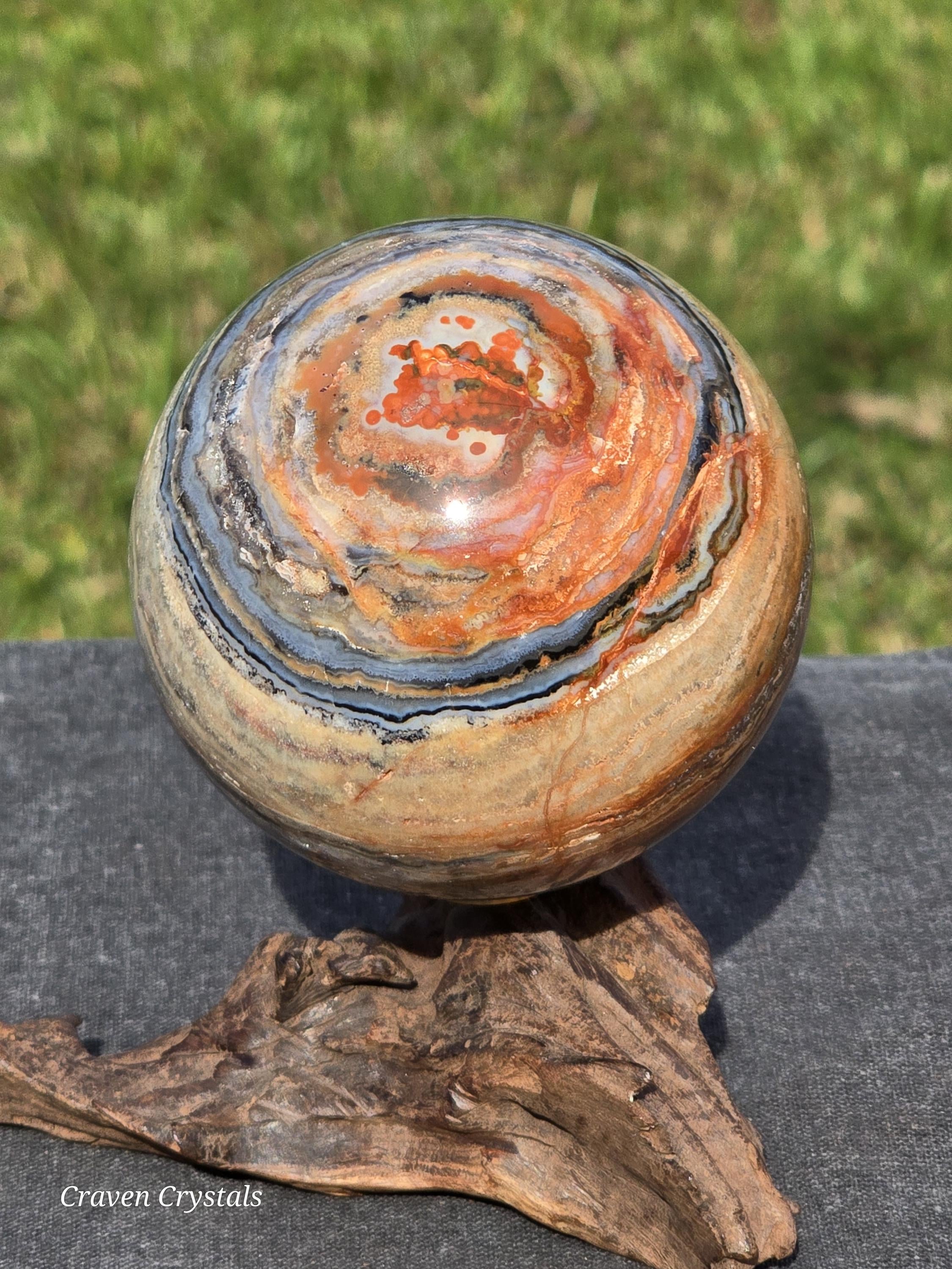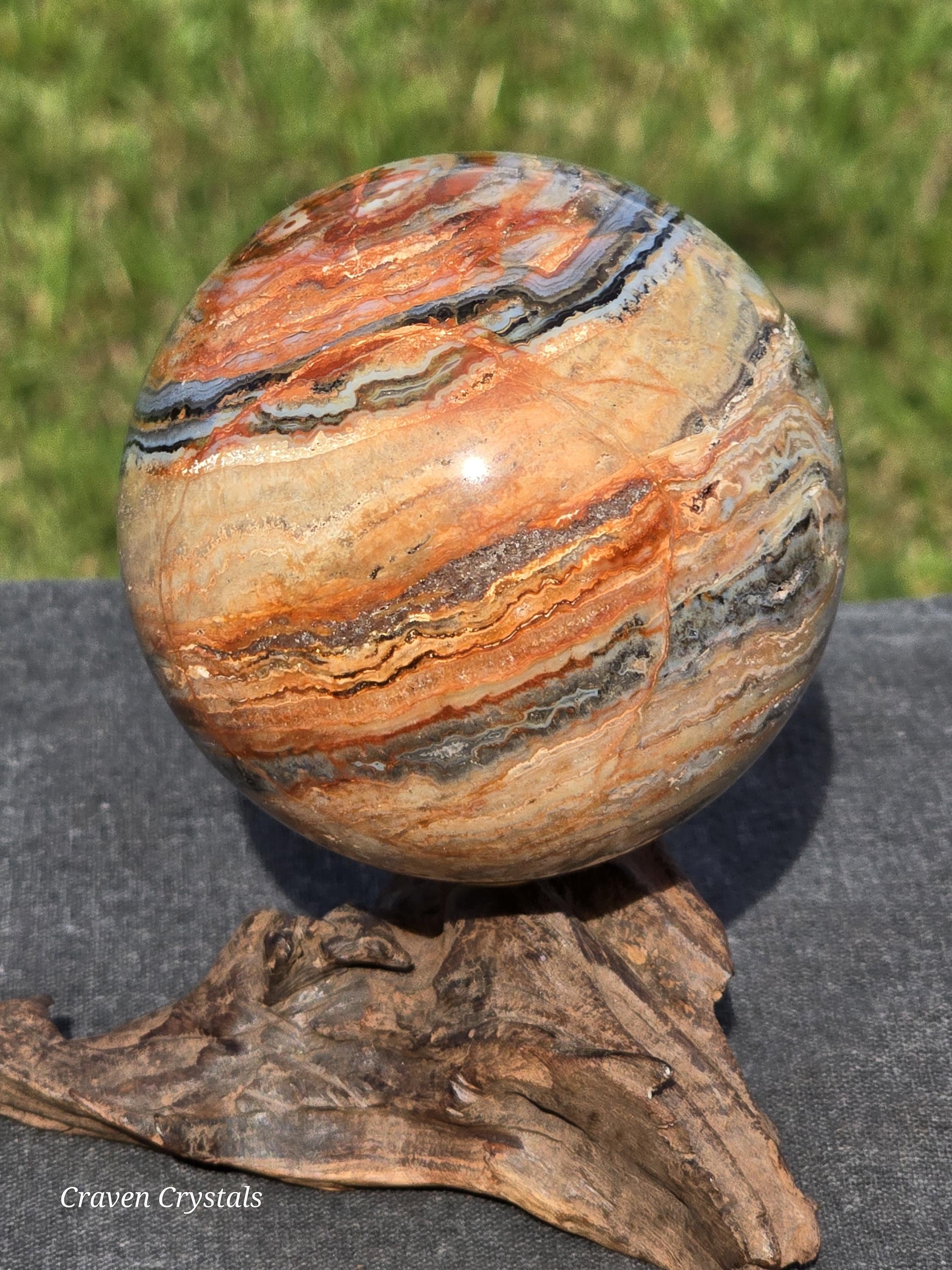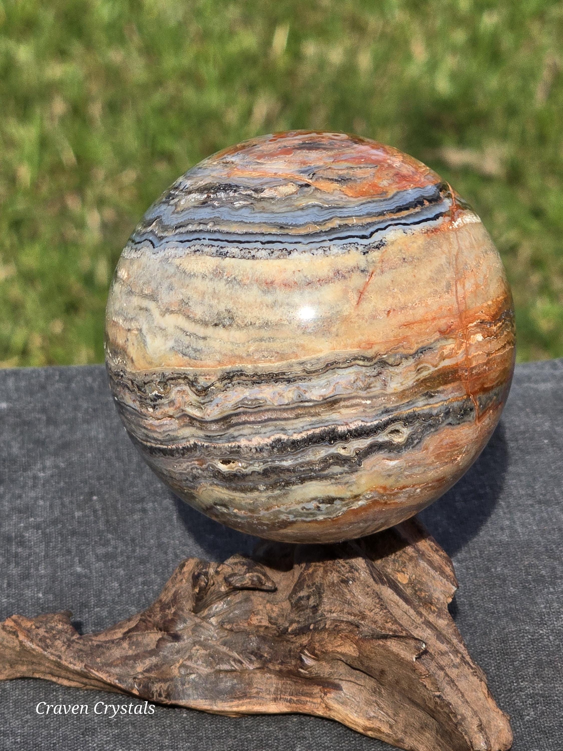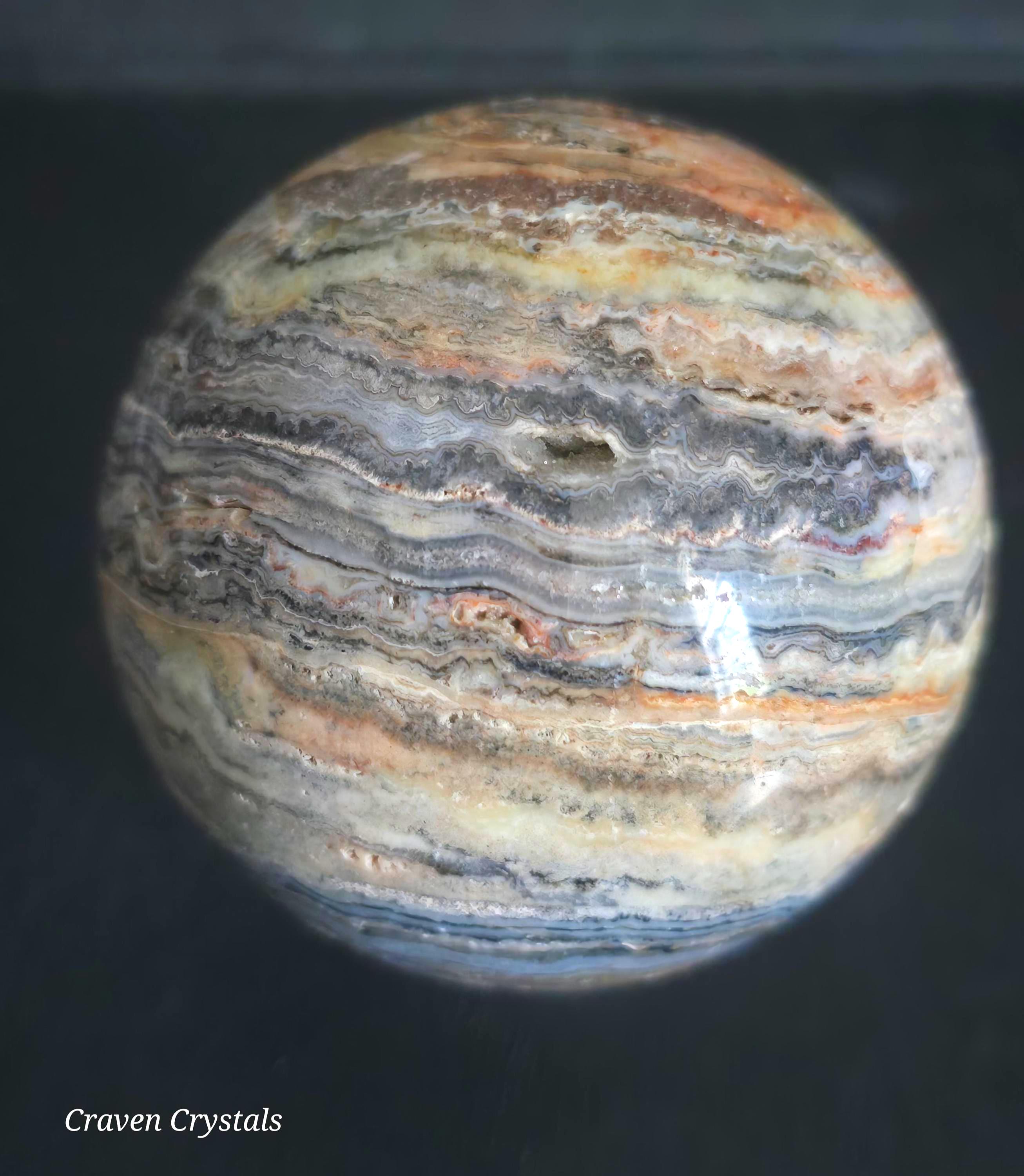 Laguna Crazy Lace Agate Crystal Sphere is one of the most vividly patterned and energetically uplifting varieties of agate, prized for its intricate, swirling lace-like bands of color.