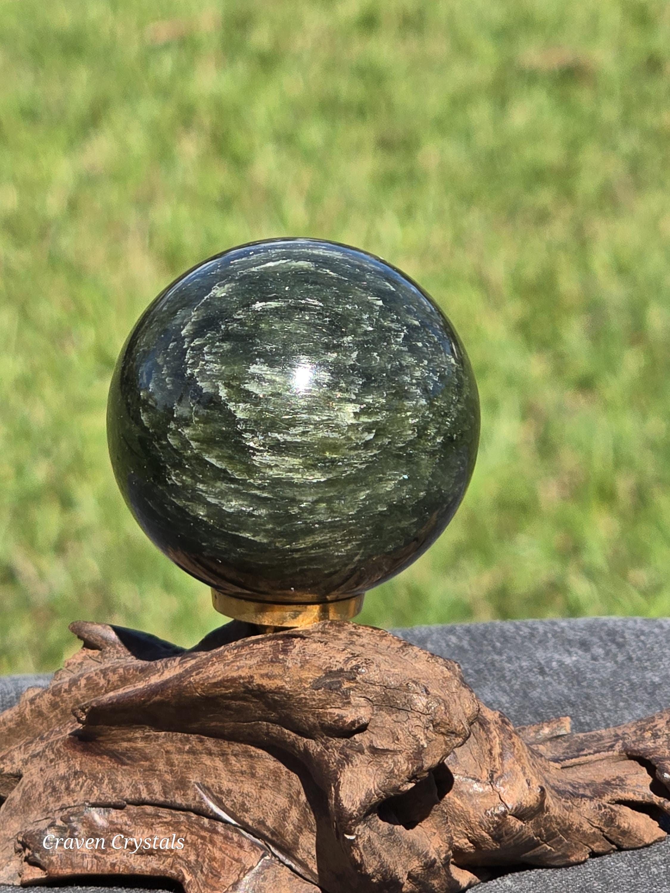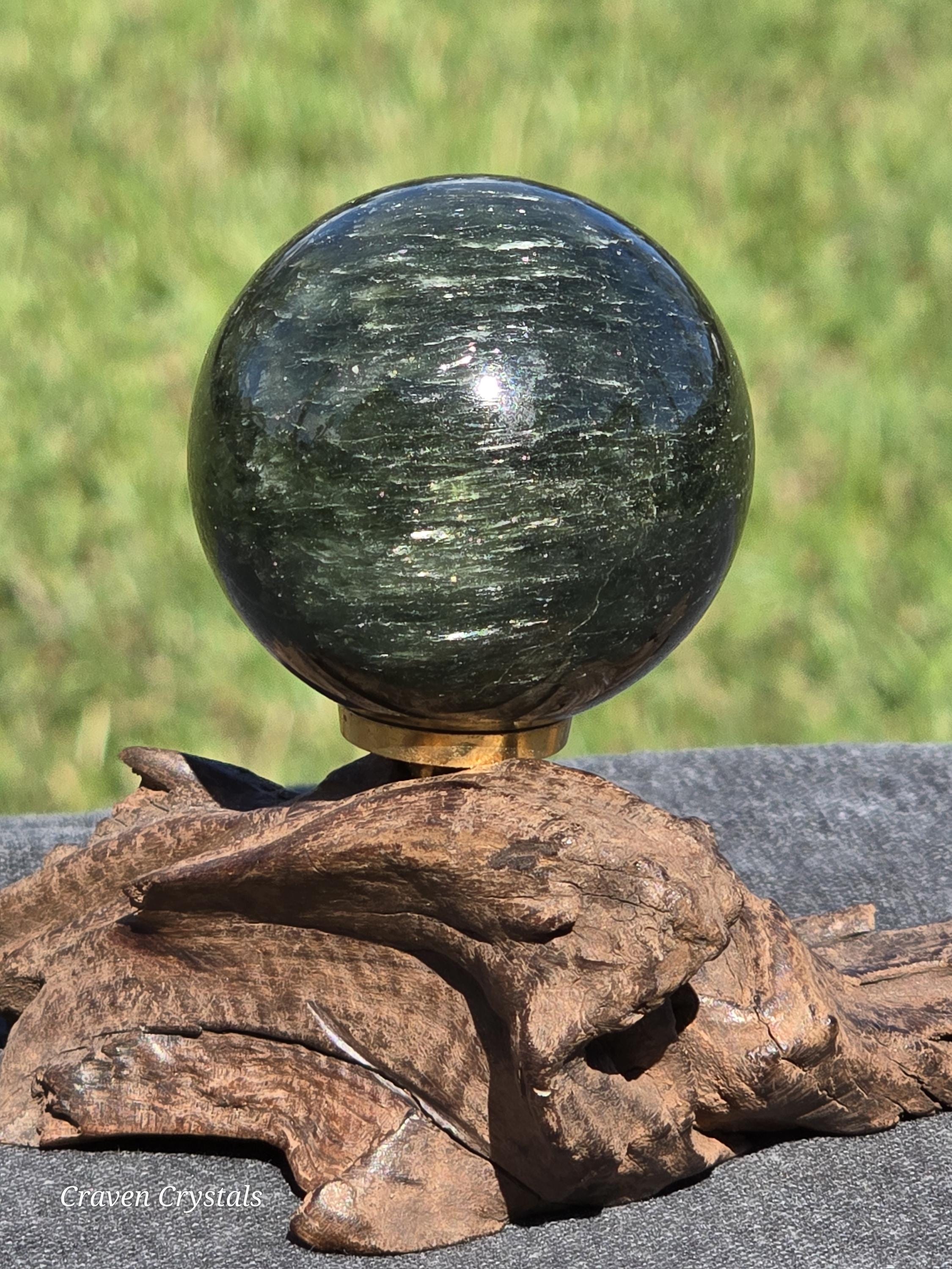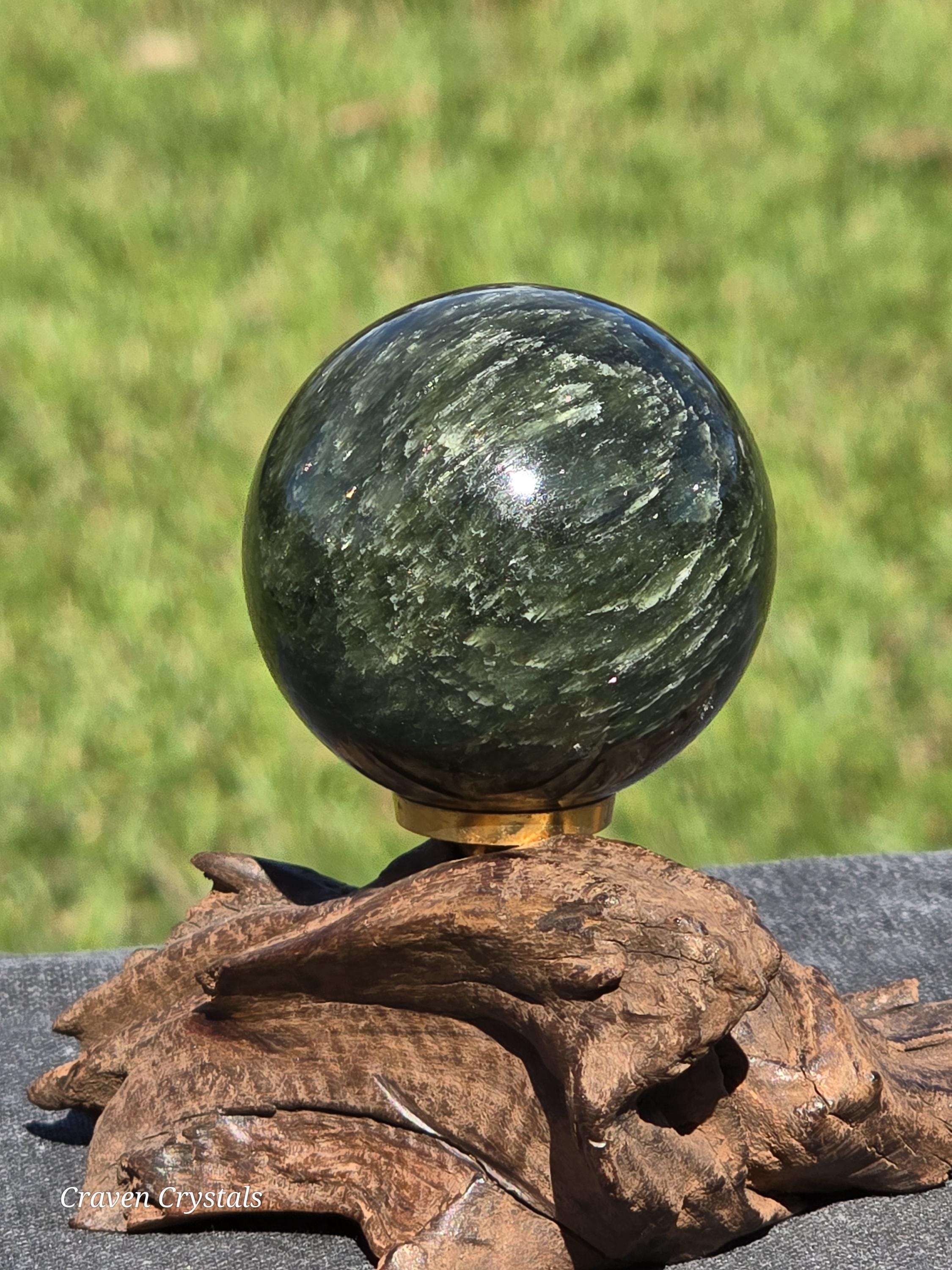 Seraphinite Crystal Sphere, also known as clinochlore, a rare, deep green stone with shimmering silvery or white feathery inclusions that resemble angel wings.