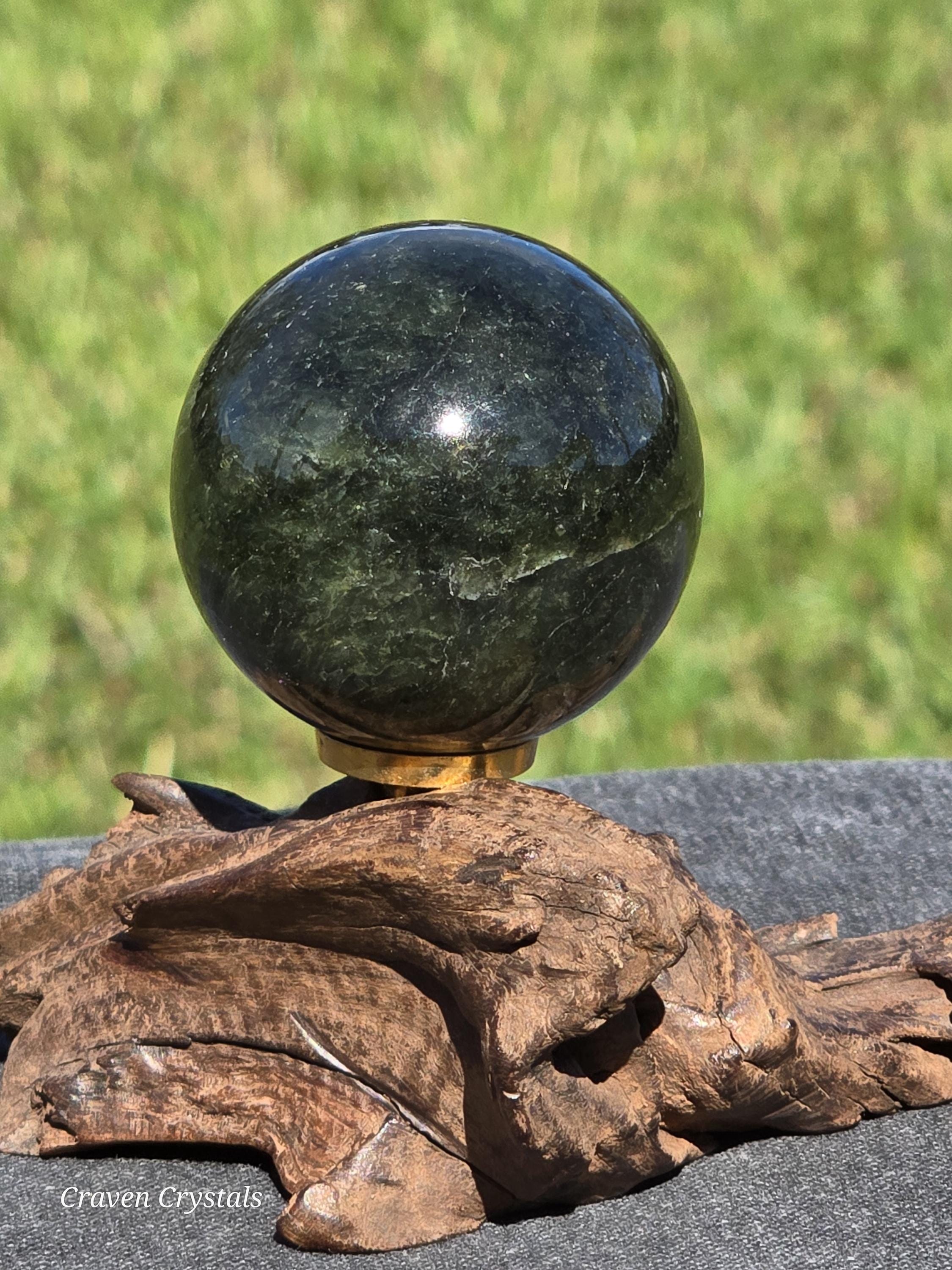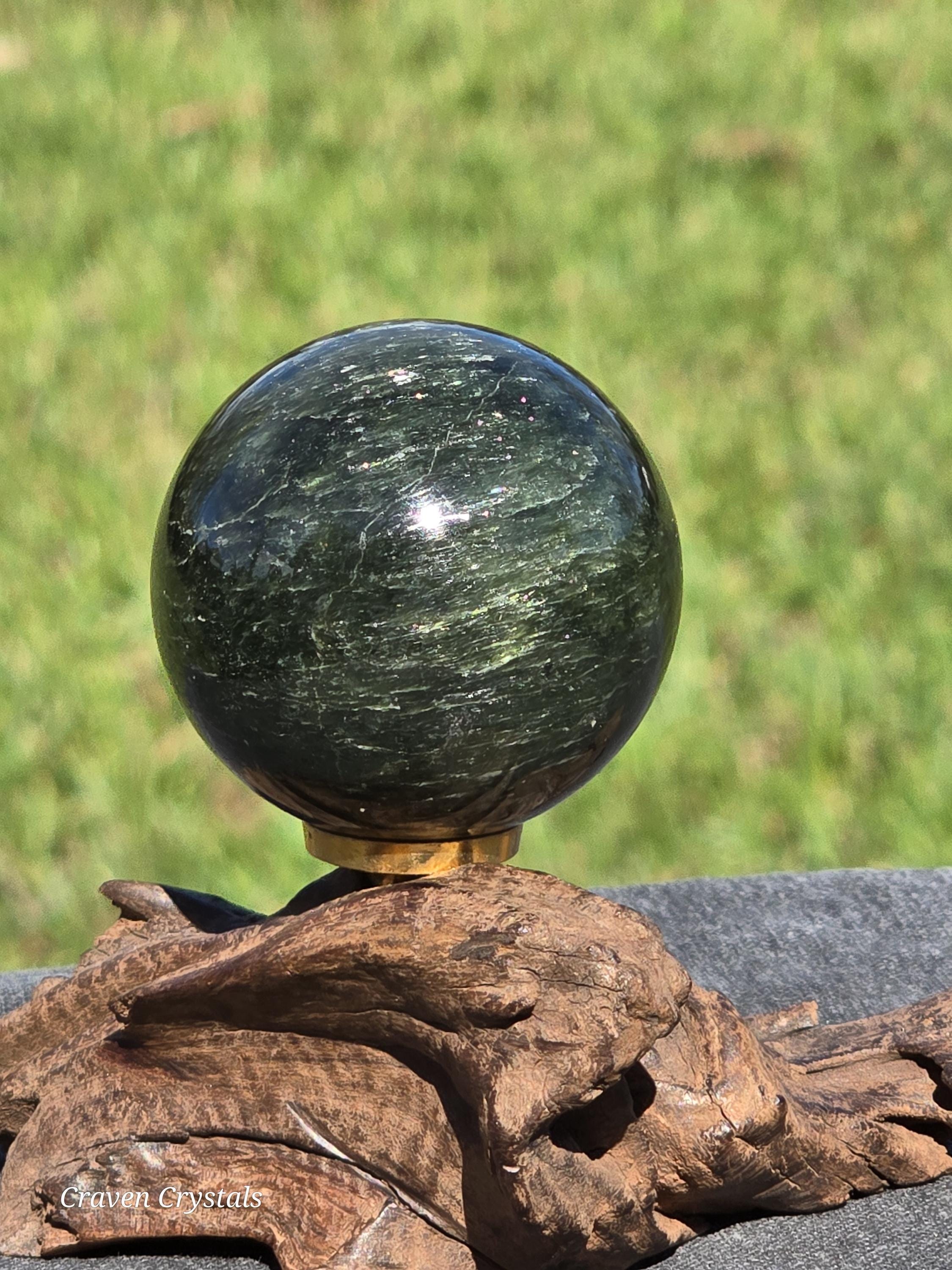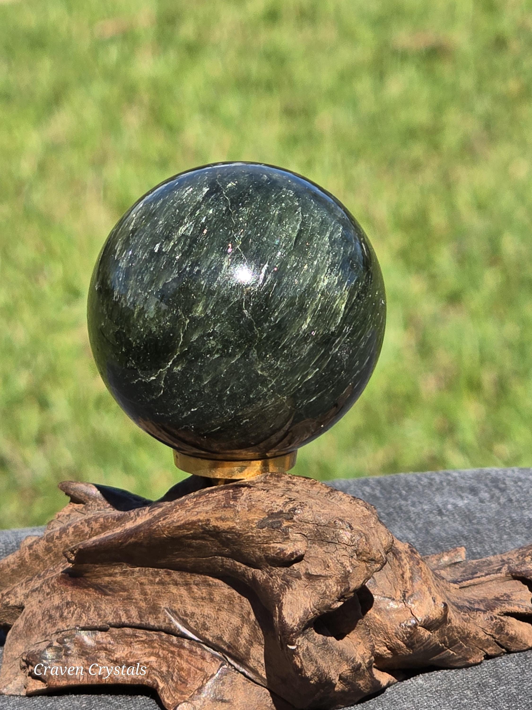 Seraphinite Crystal Sphere, also known as clinochlore, a rare, deep green stone with shimmering silvery or white feathery inclusions that resemble angel wings.