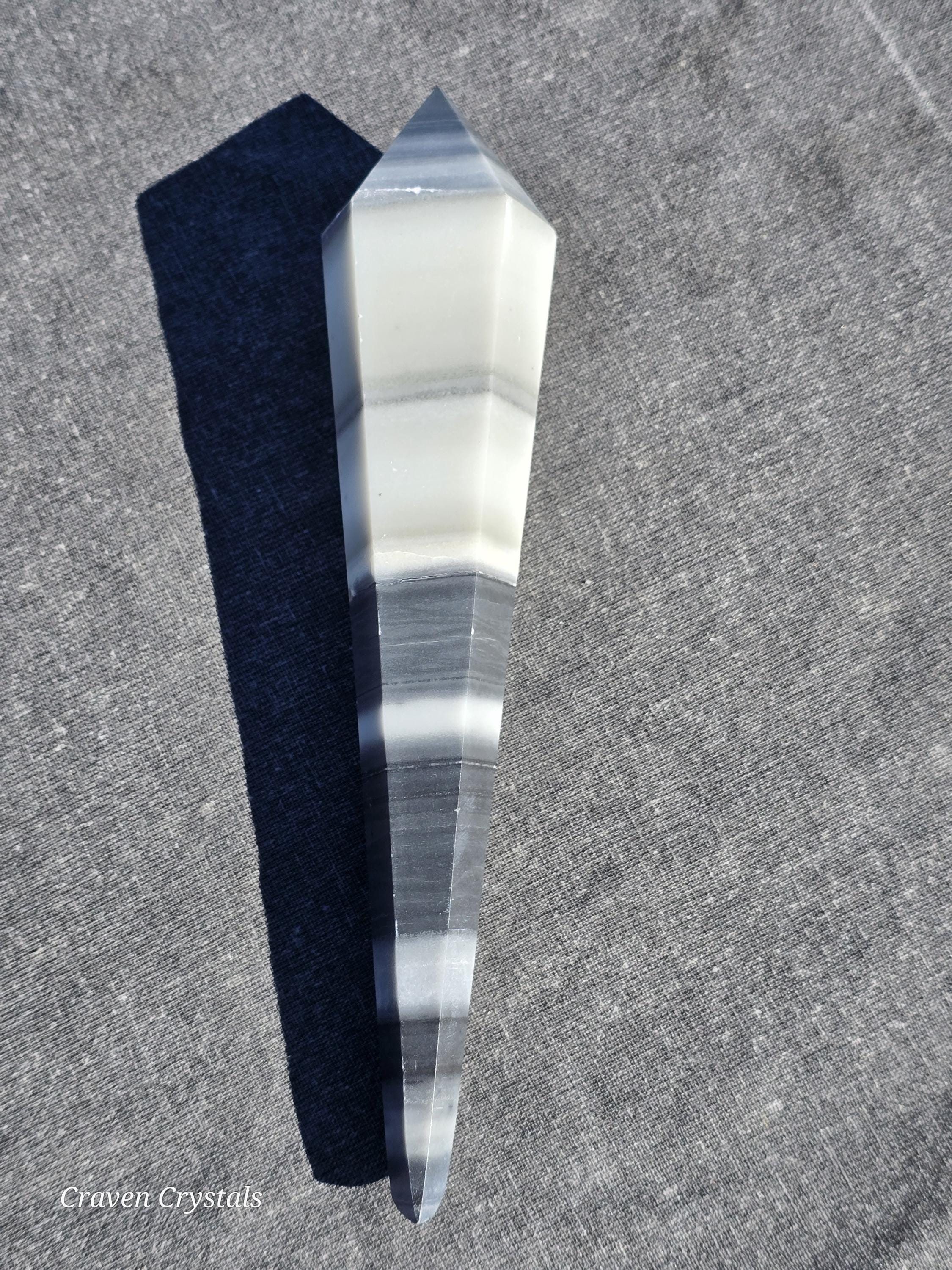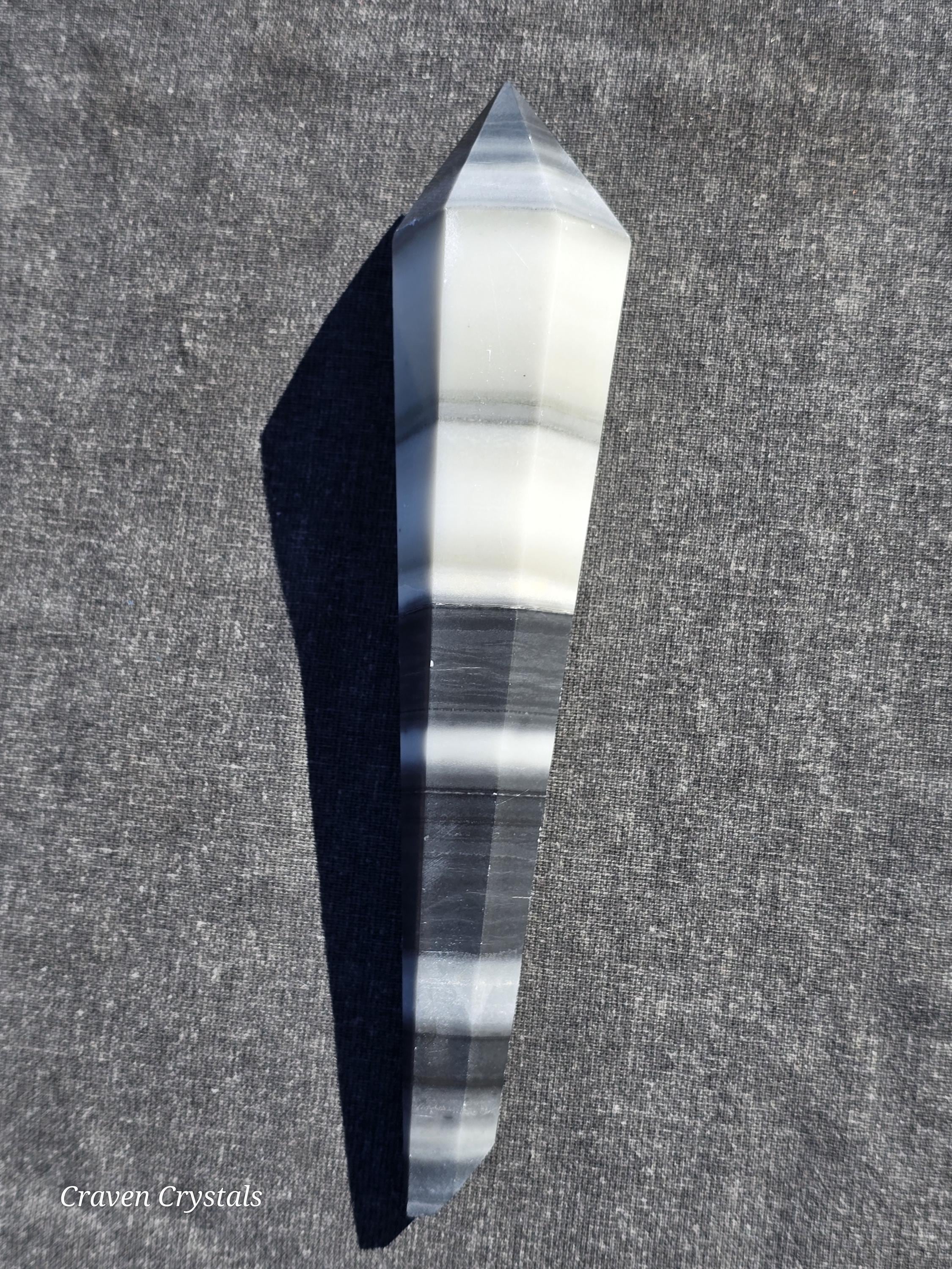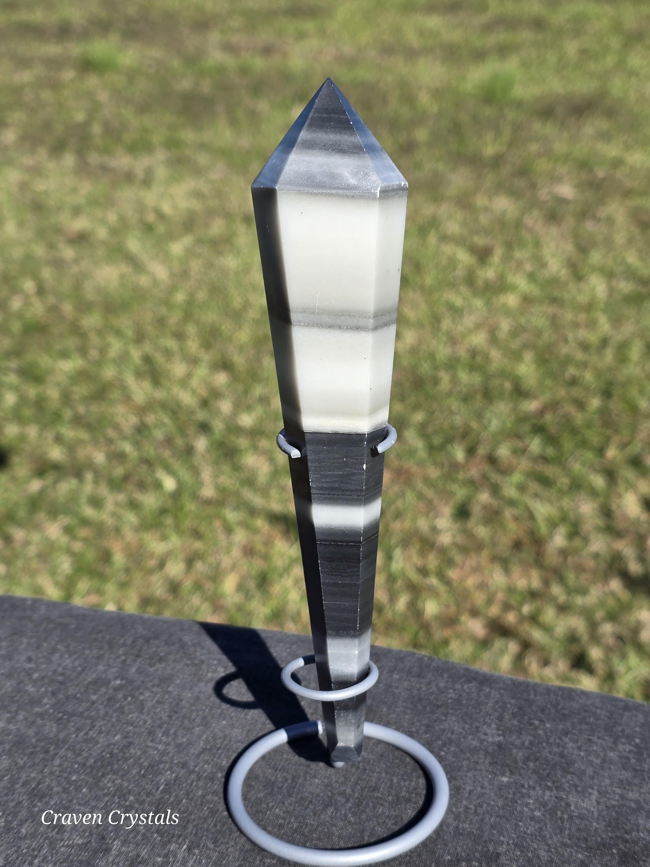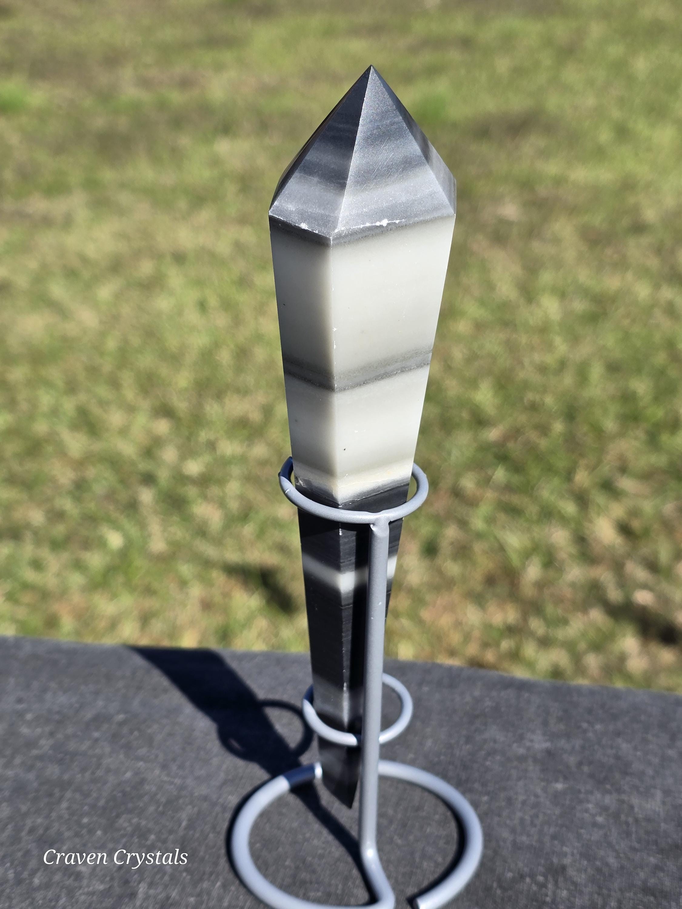 Taiji Jasper Crystal Wand, also known as Tai Chi Jasper or Taiji Jade, a unique and visually striking wand featuring a combination of black, white and gray bands.
