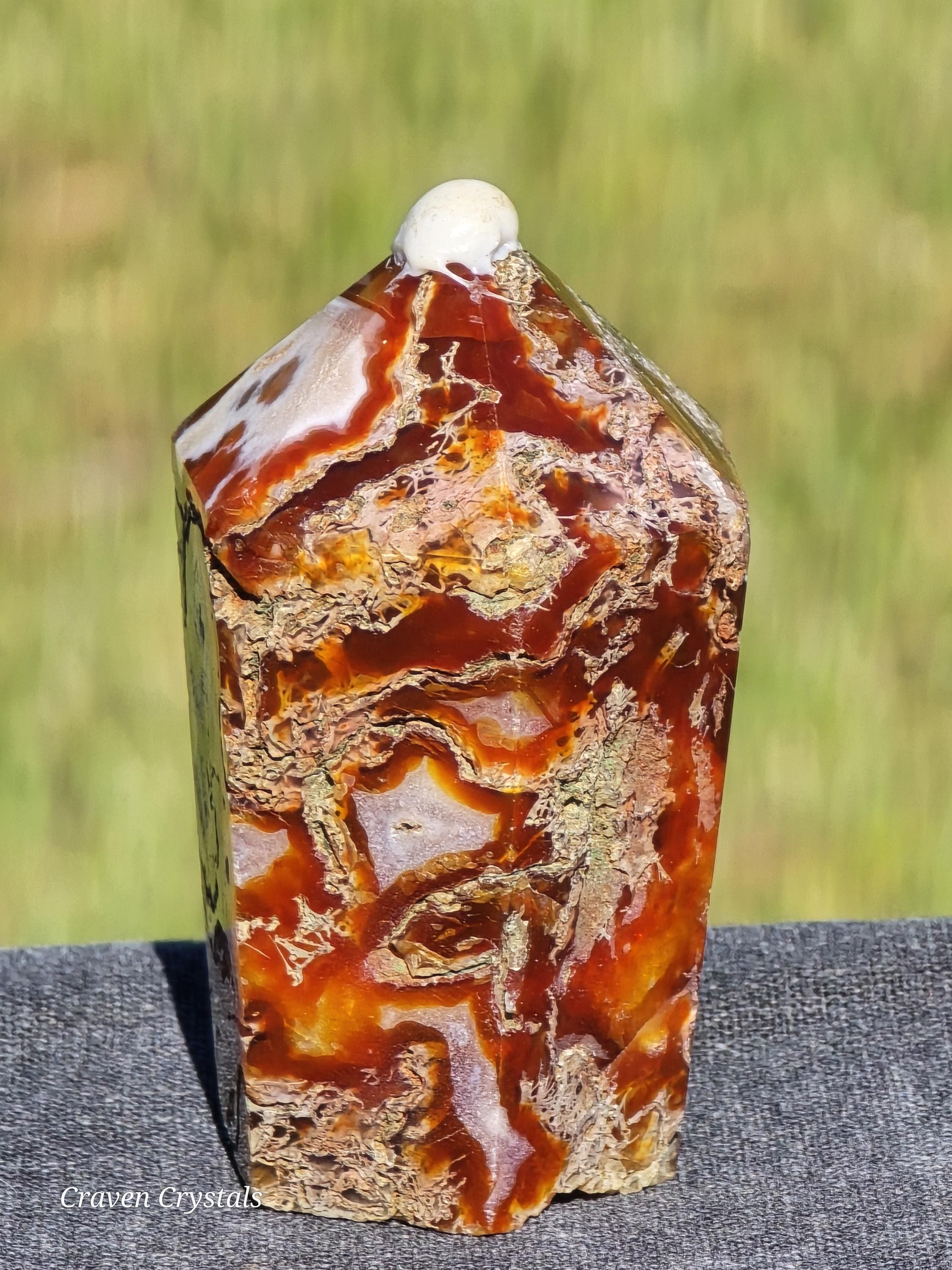 Red Moss Agate Crystal Cupcake Tower with rich red coloration and distinctive moss-like inclusions.
