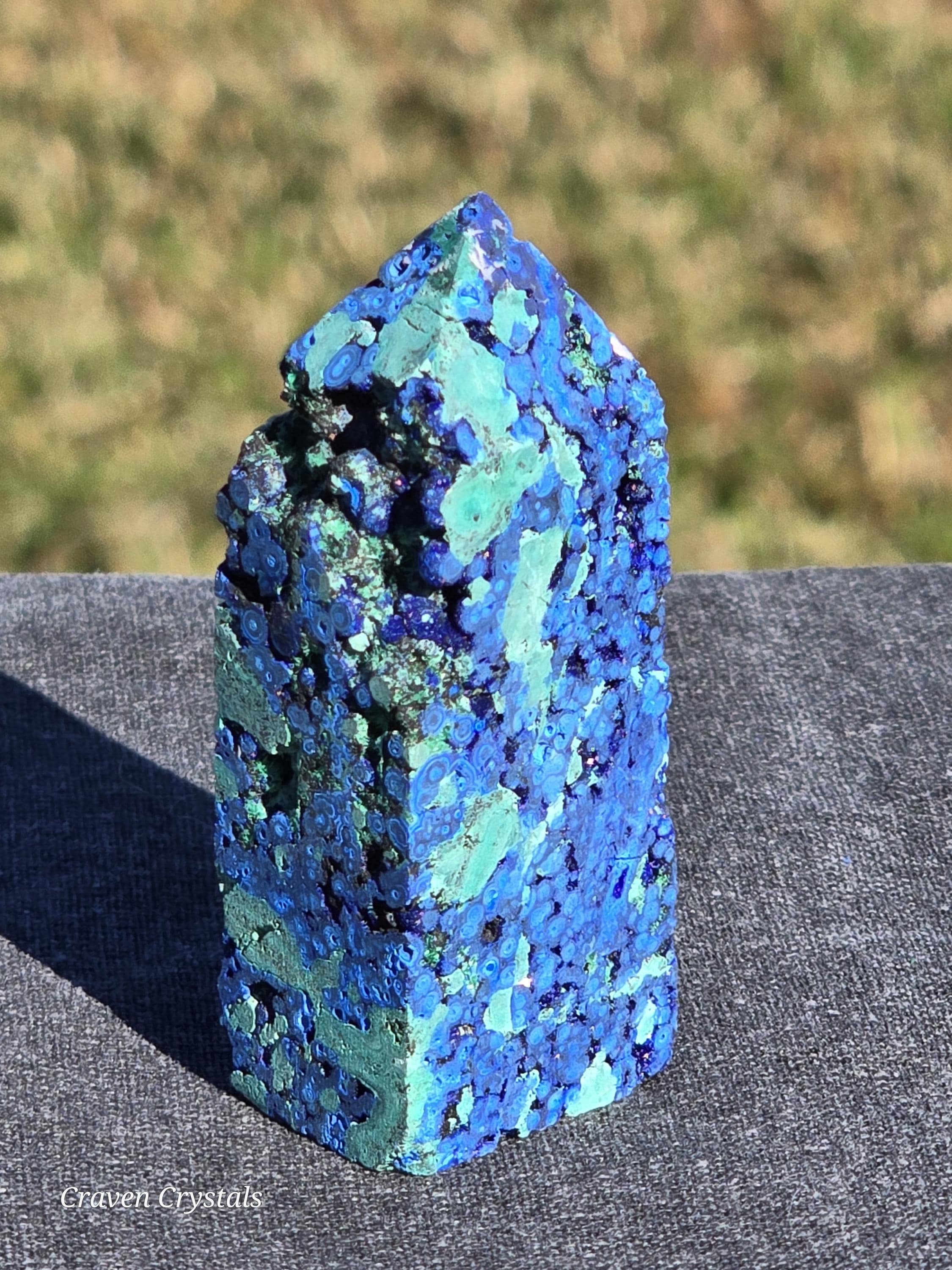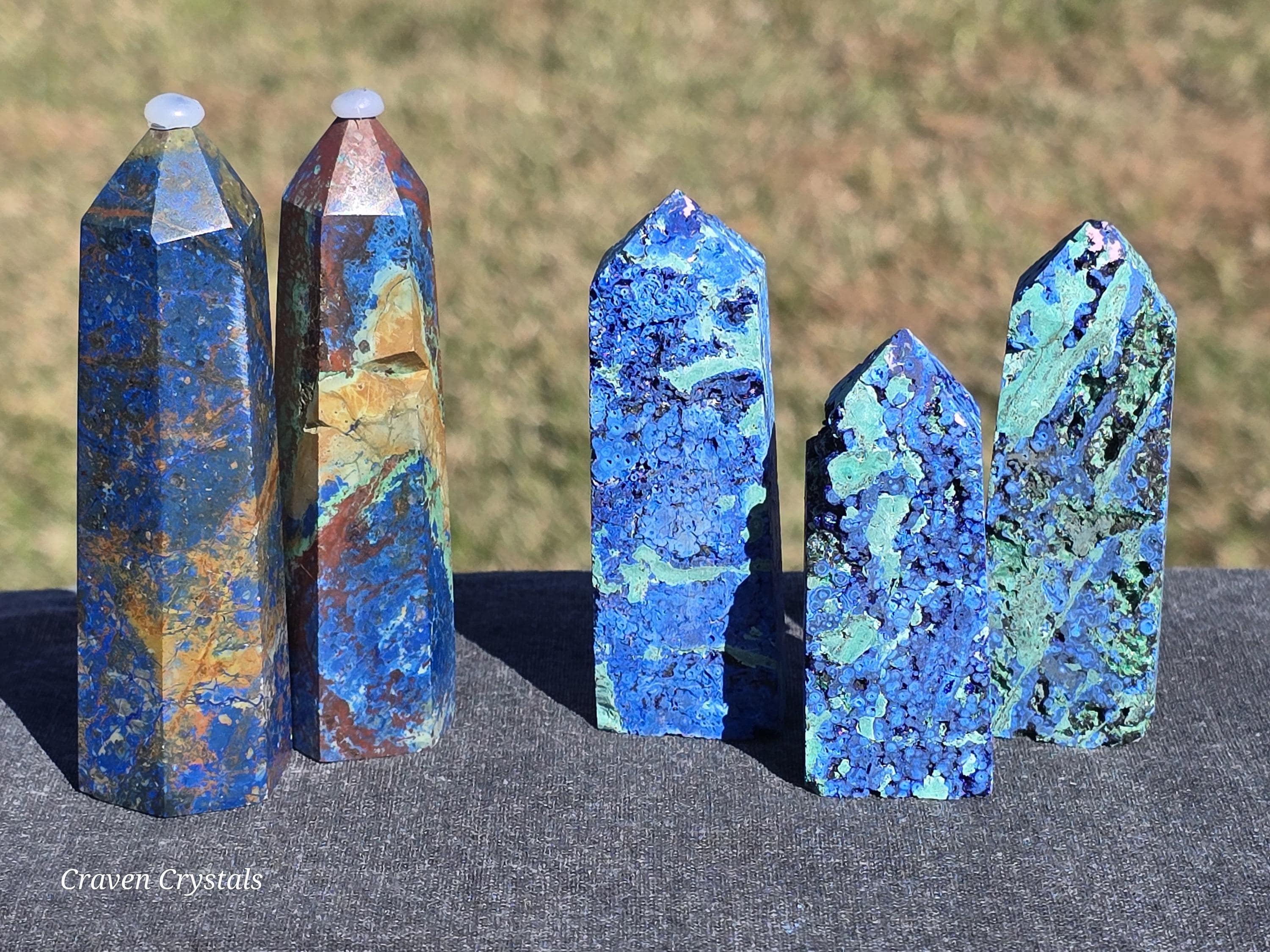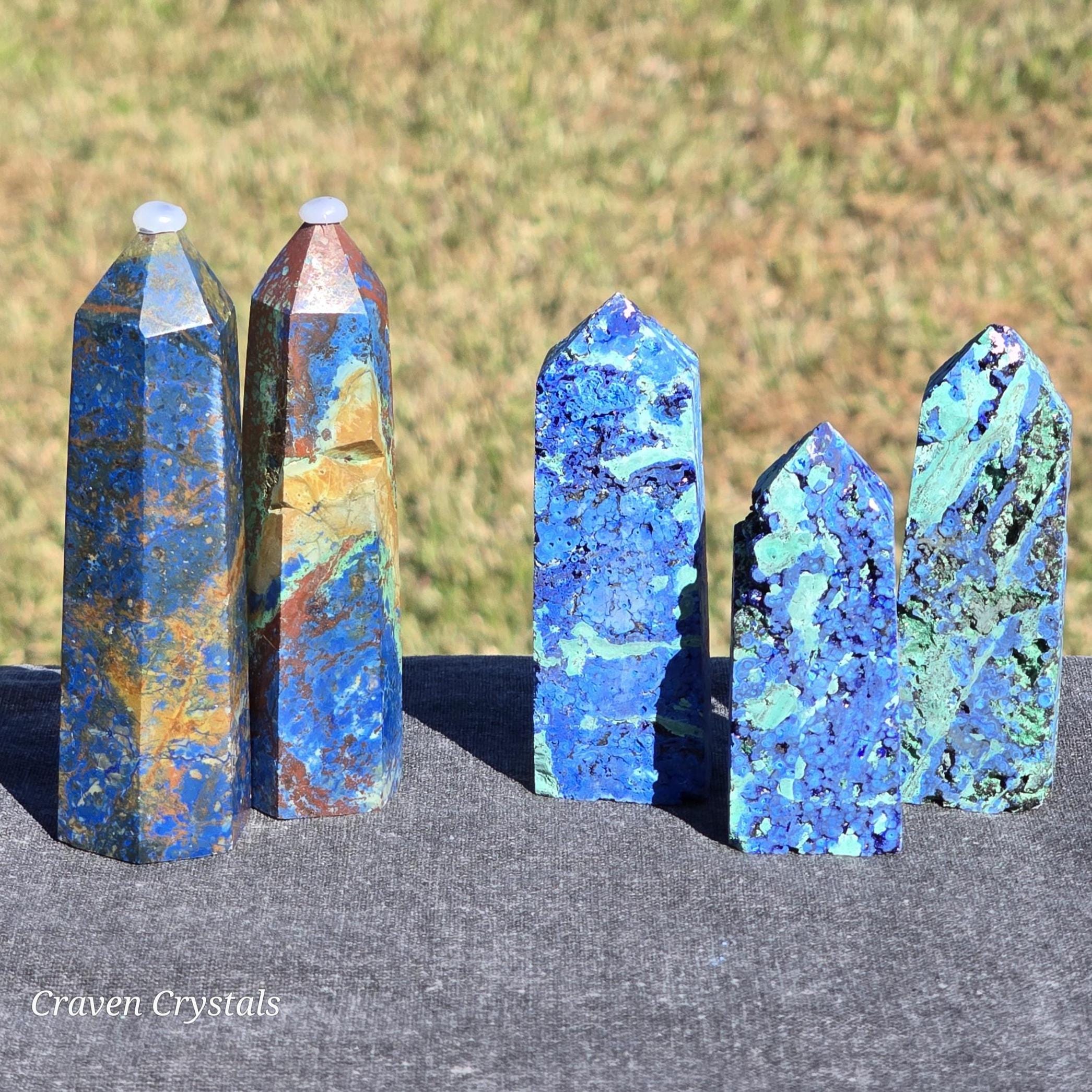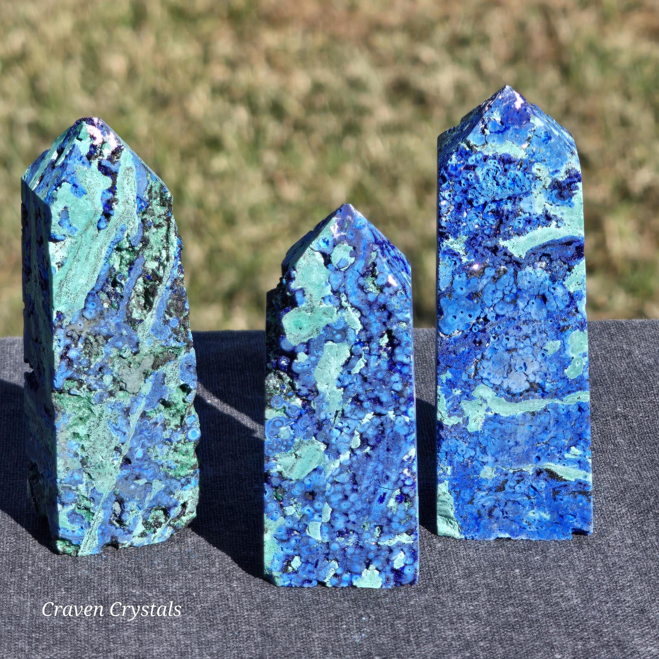 Azurite Crystal Towers, a visually stunning and energetically potent mineral combination that unites two closely related copper carbonates—Azurite and Malachite—in a naturally occurring fusion of deep royal blue and vibrant green.