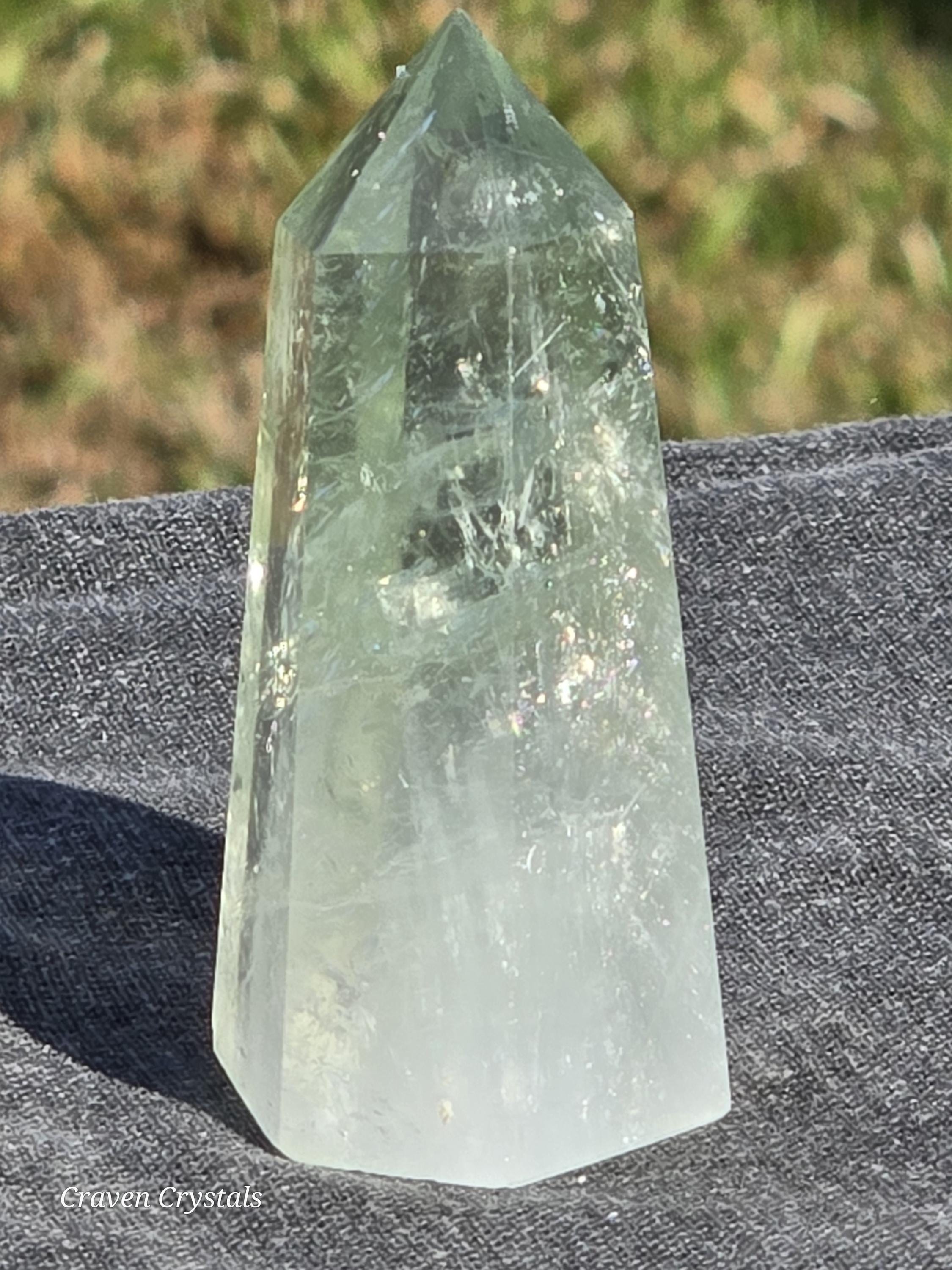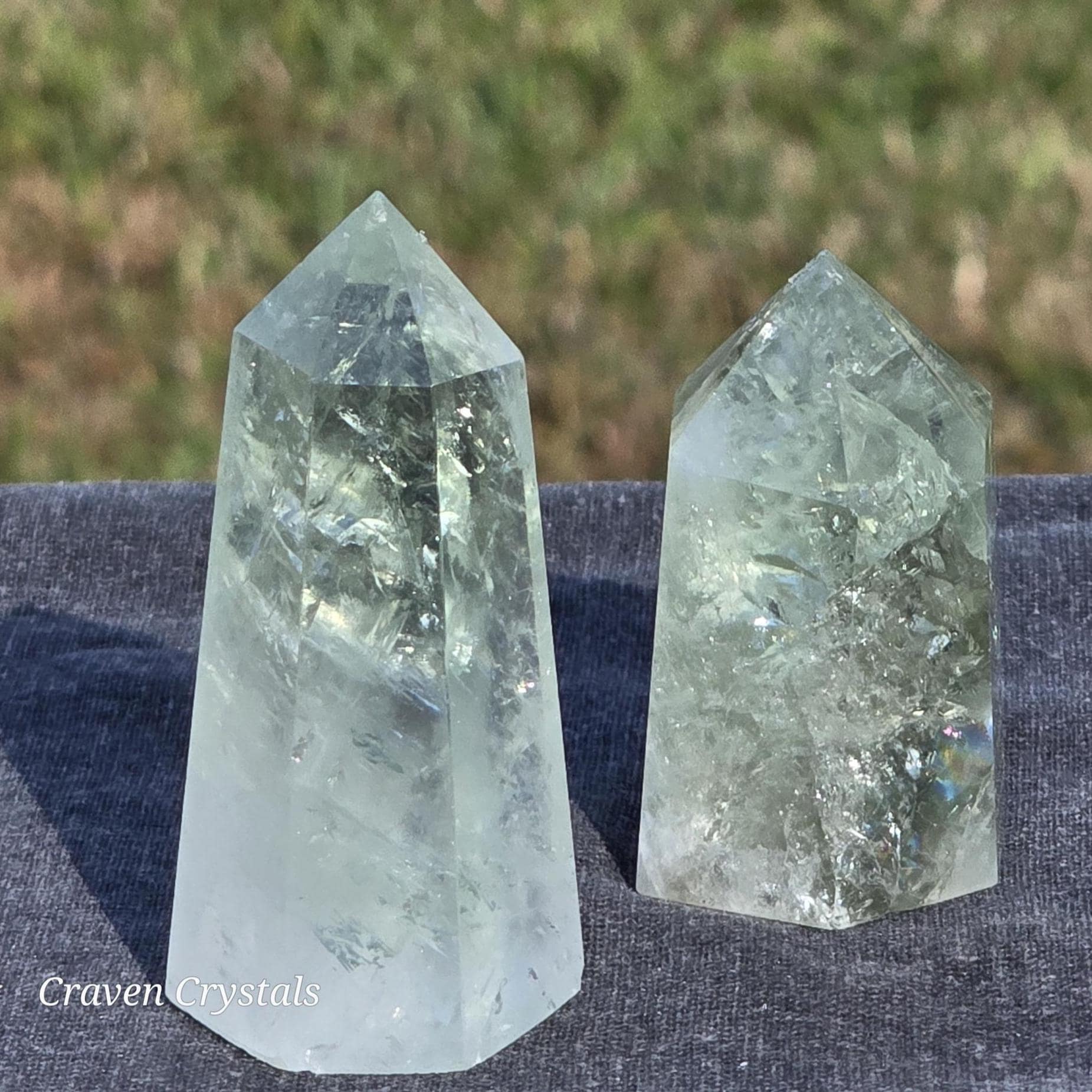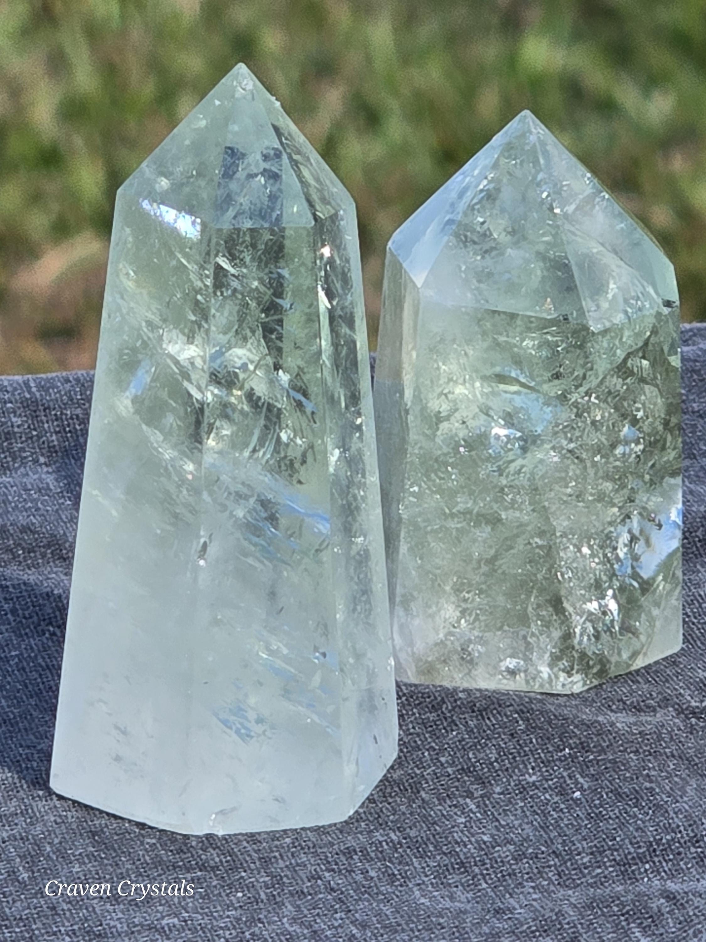 Prasiolite Crystal Towers, also known as Green Amethyst, a rare and elegant variety of quartz prized for its soft, mint-to-olive-green coloration and serene energy.
