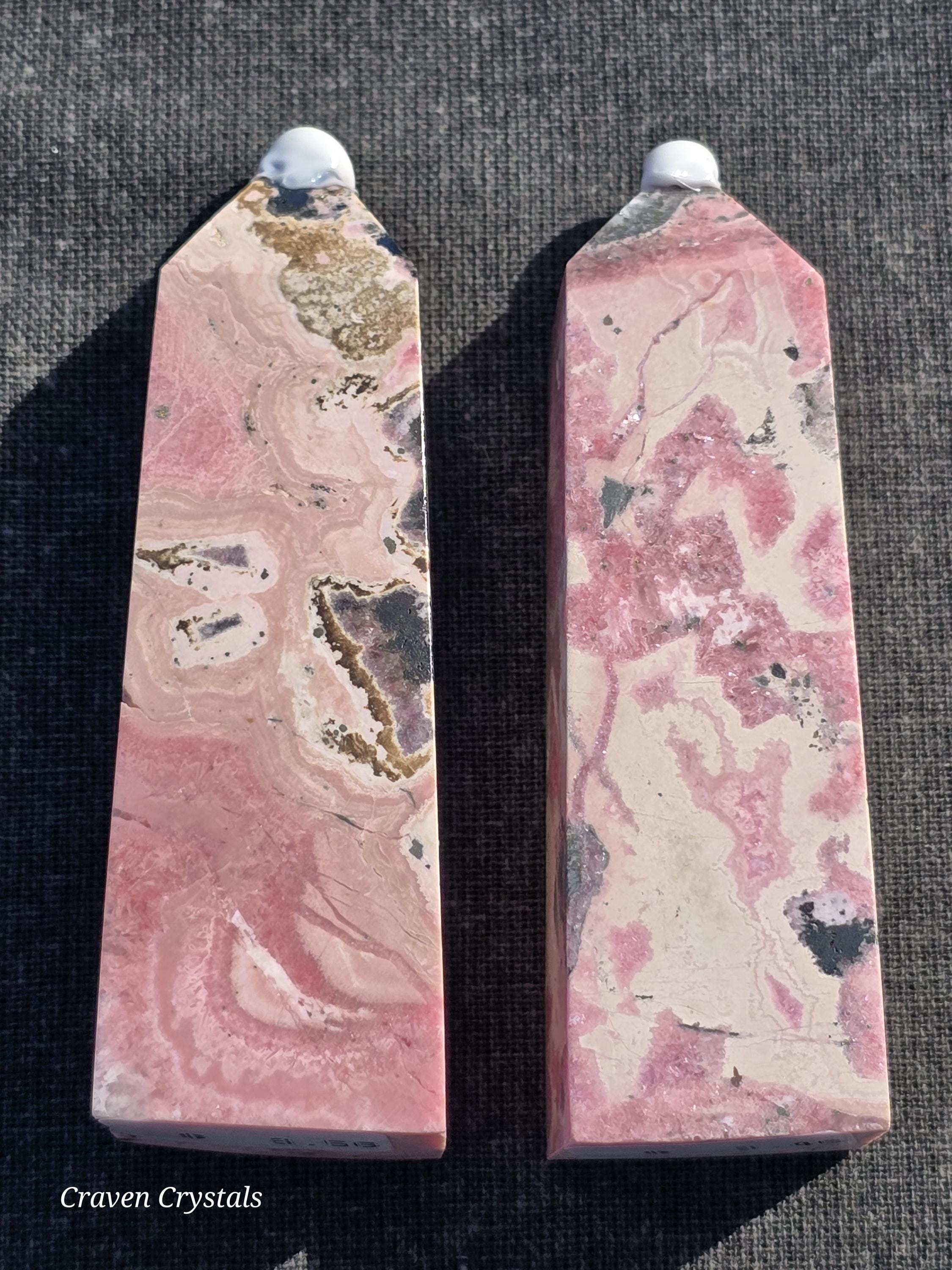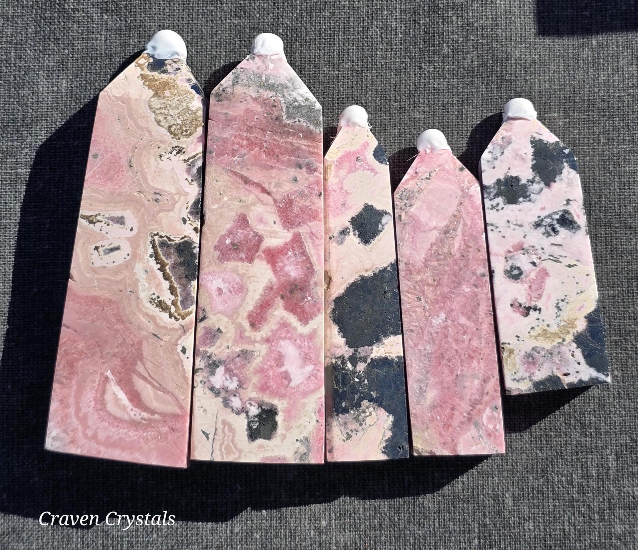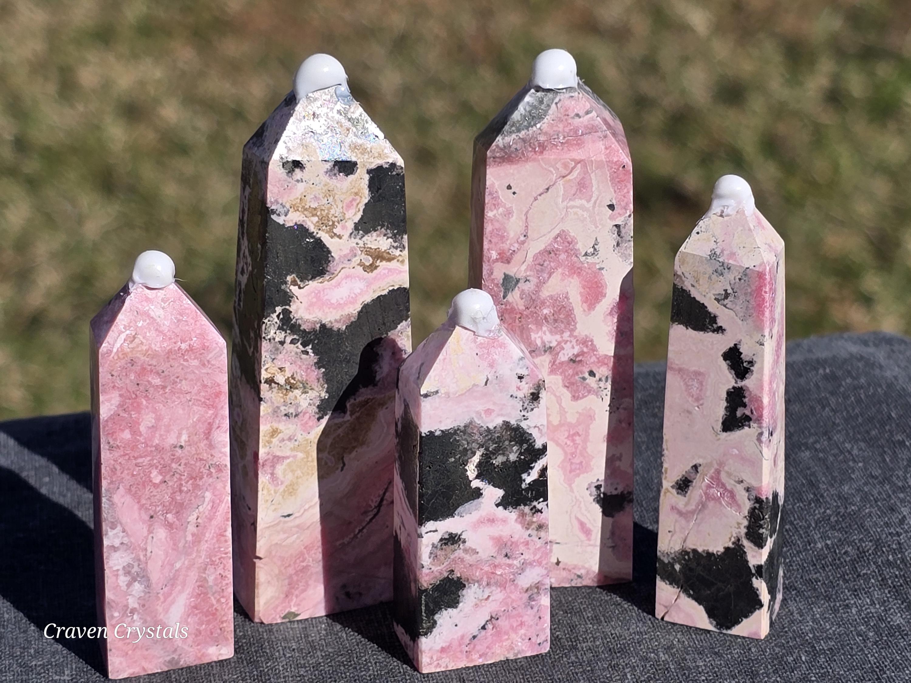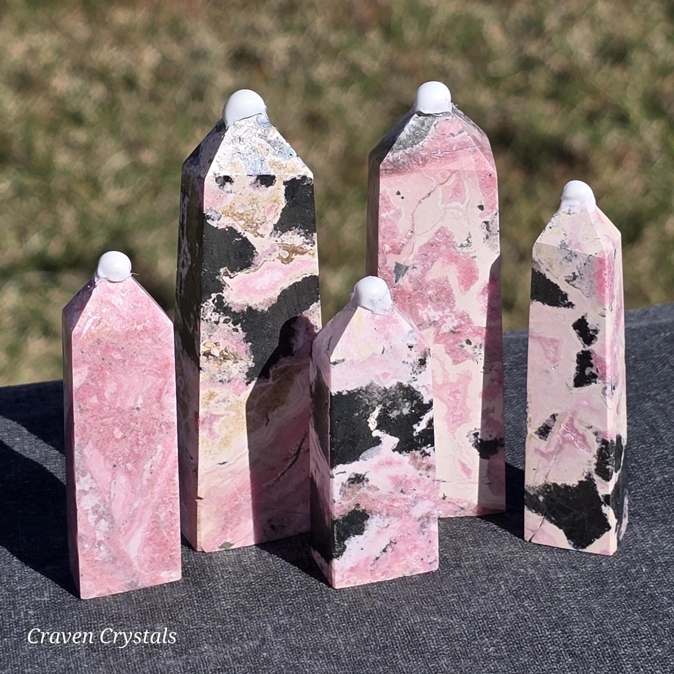 Pink Peruvian Rhodochrosite Crystal Towers, a stunning and emotionally powerful gemstone known for its soft pink to vibrant rose hues, often blended with creamy whites or pale beige banding.