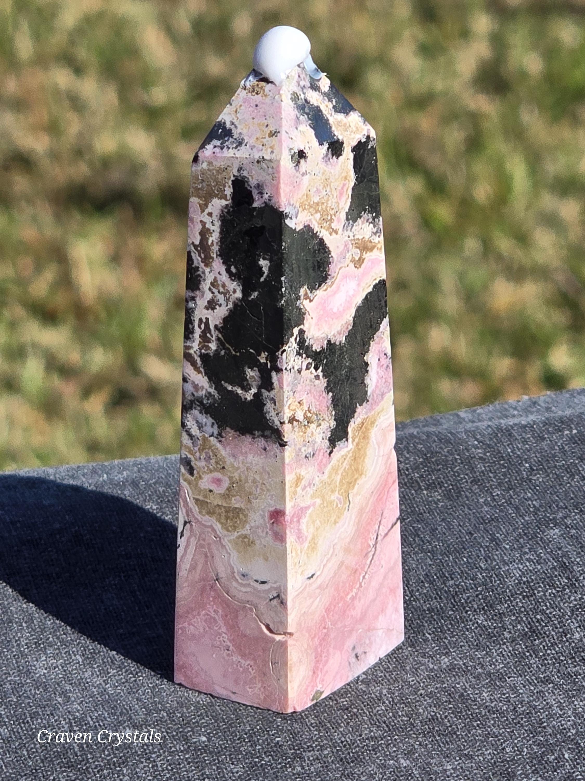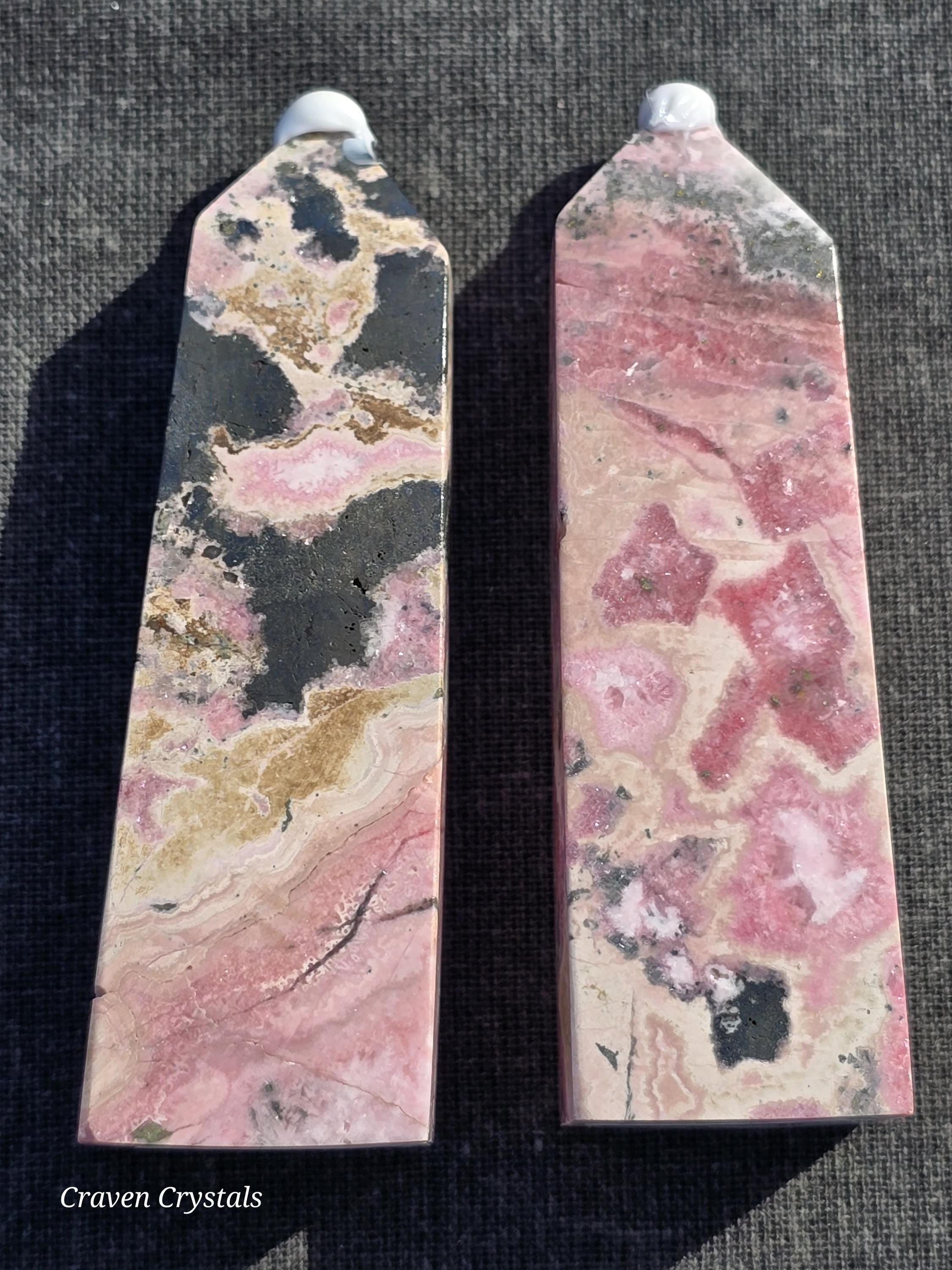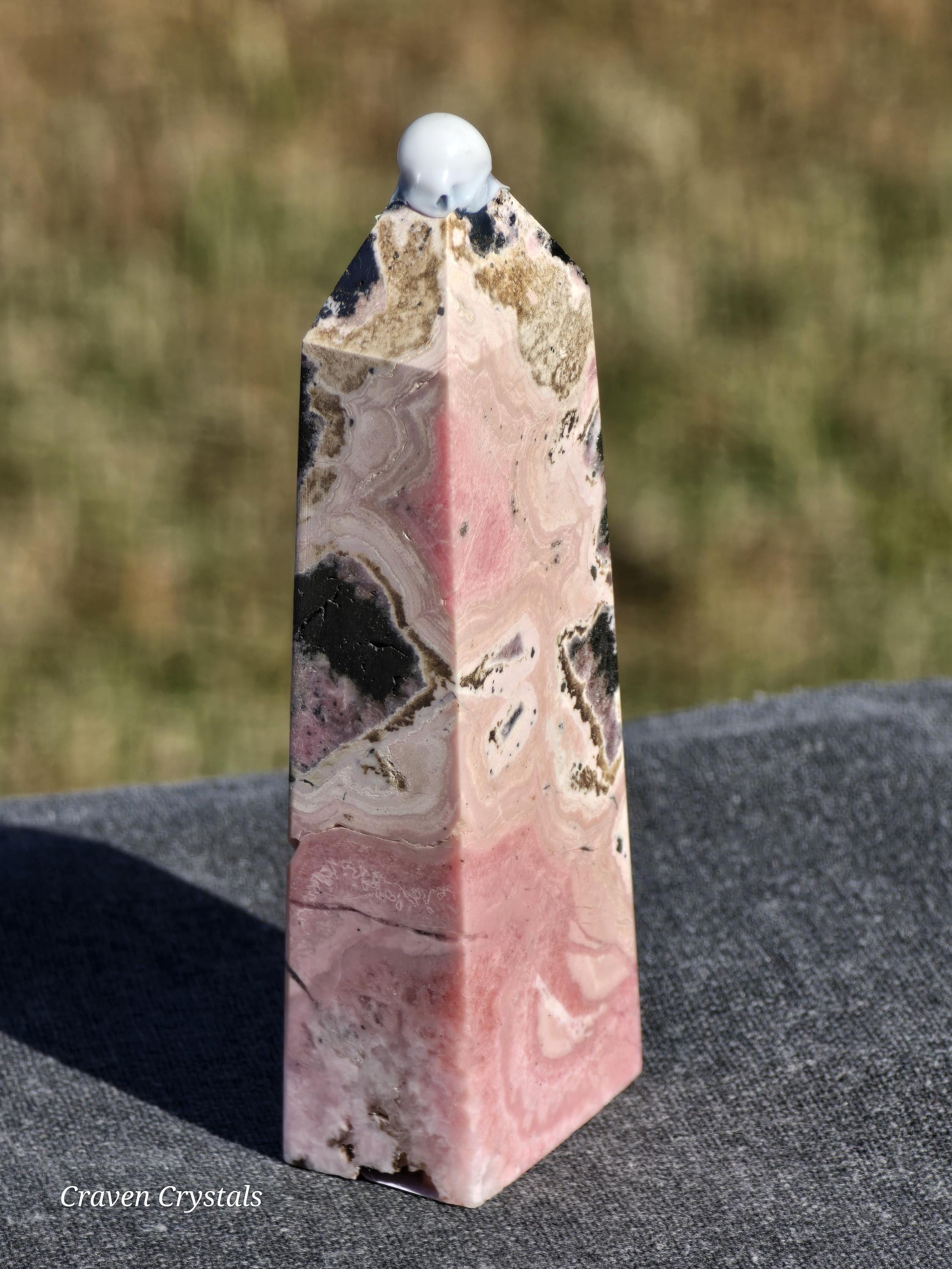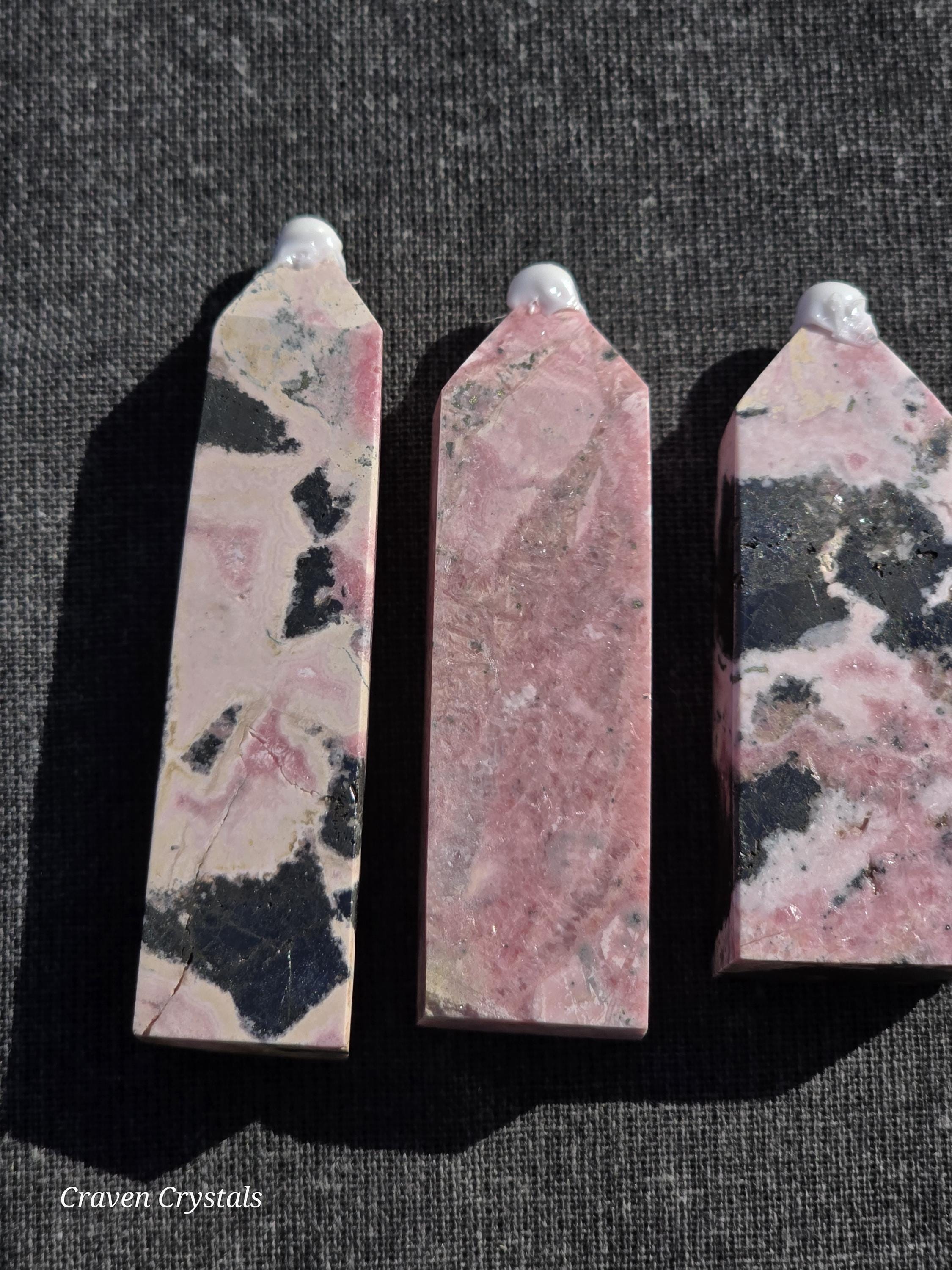 Pink Peruvian Rhodochrosite Crystal Towers, a stunning and emotionally powerful gemstone known for its soft pink to vibrant rose hues, often blended with creamy whites or pale beige banding.