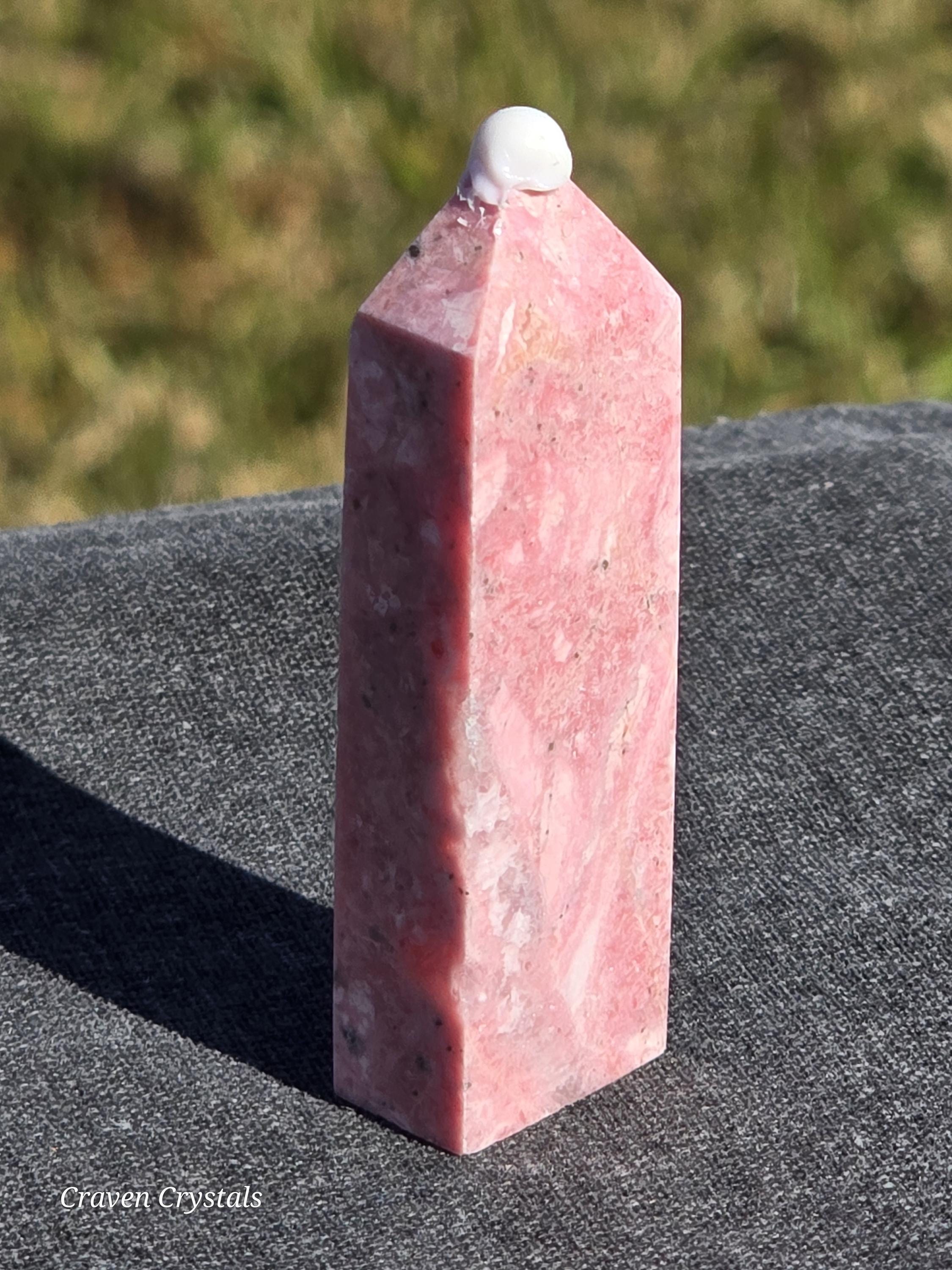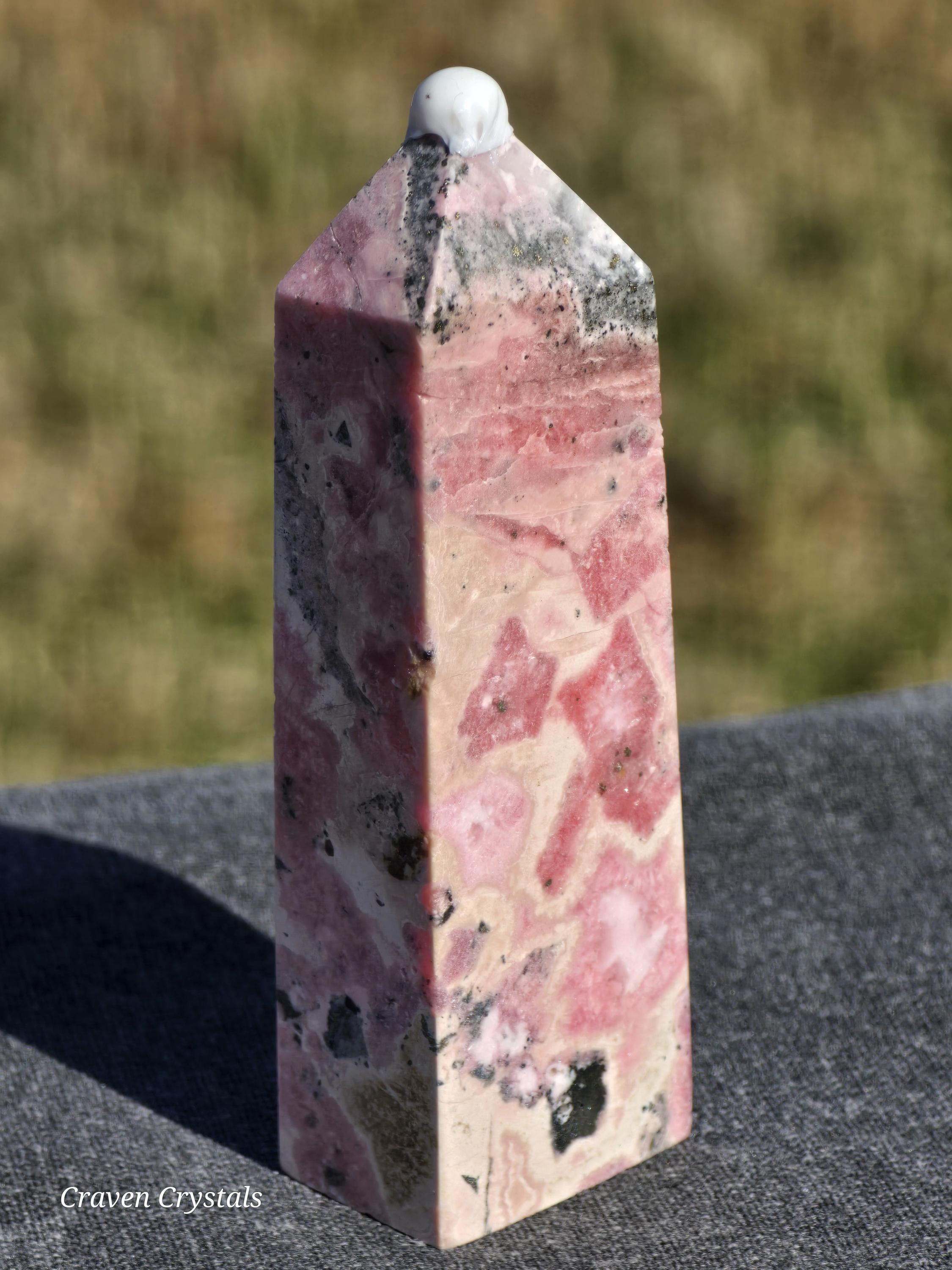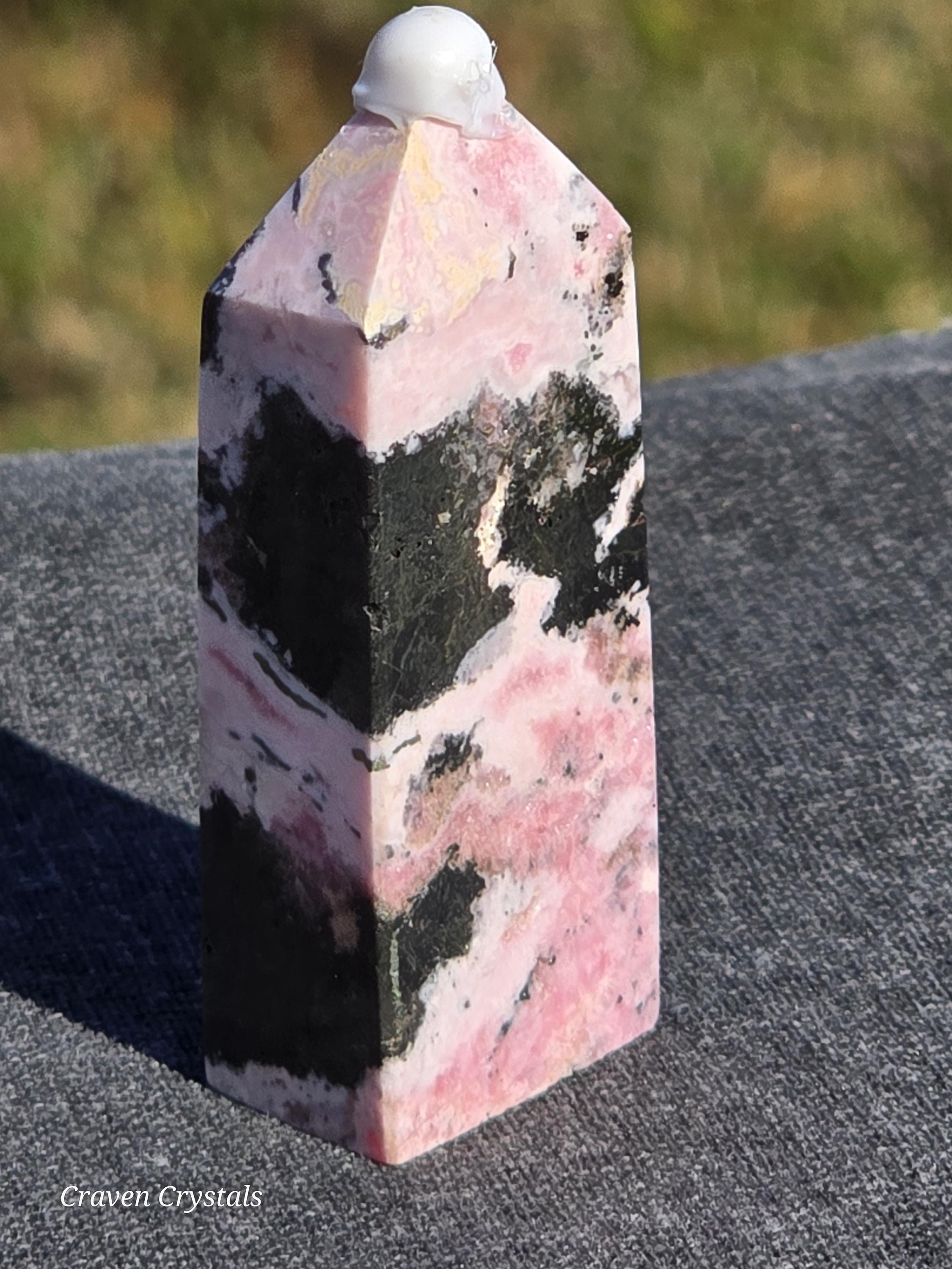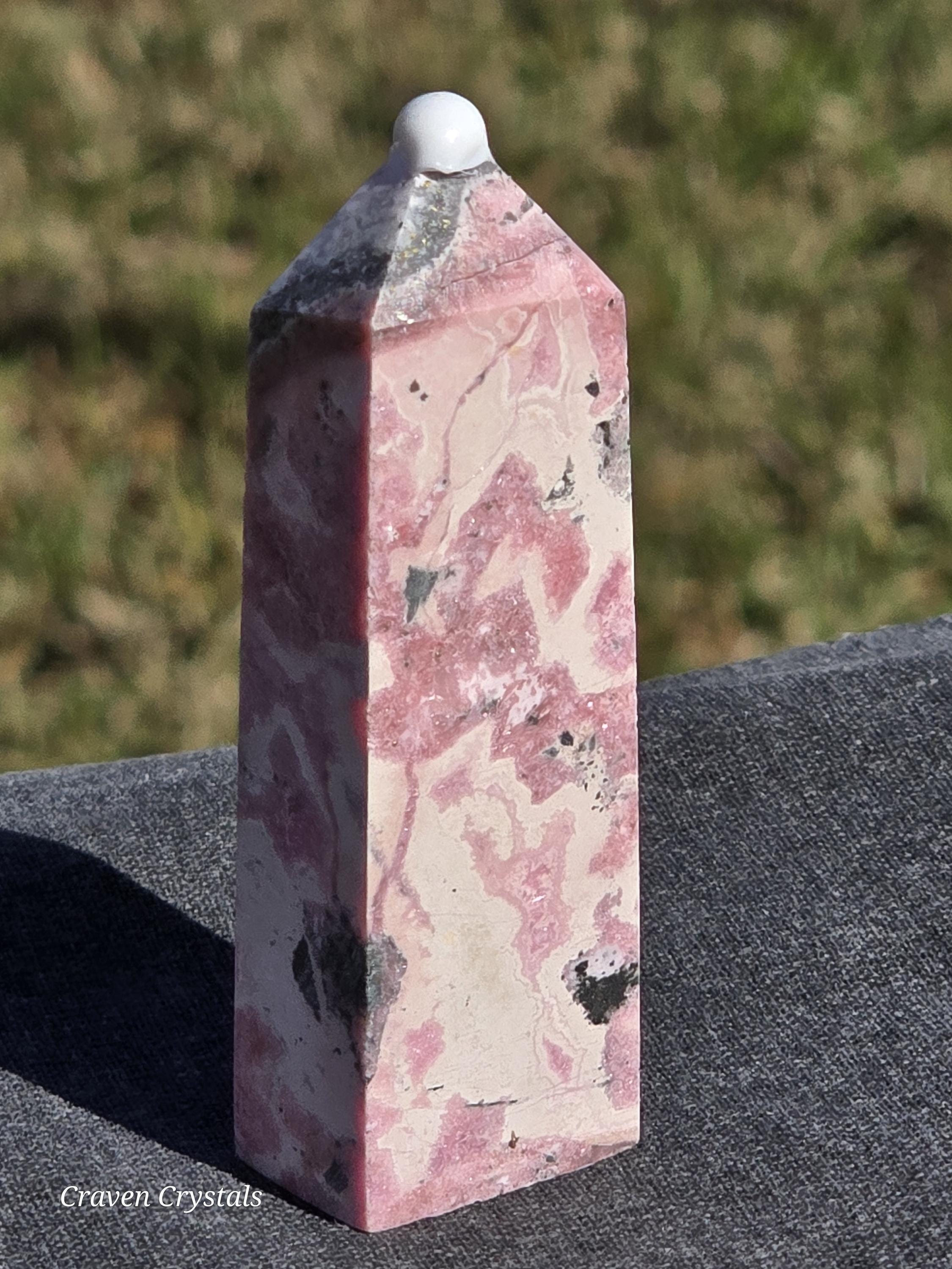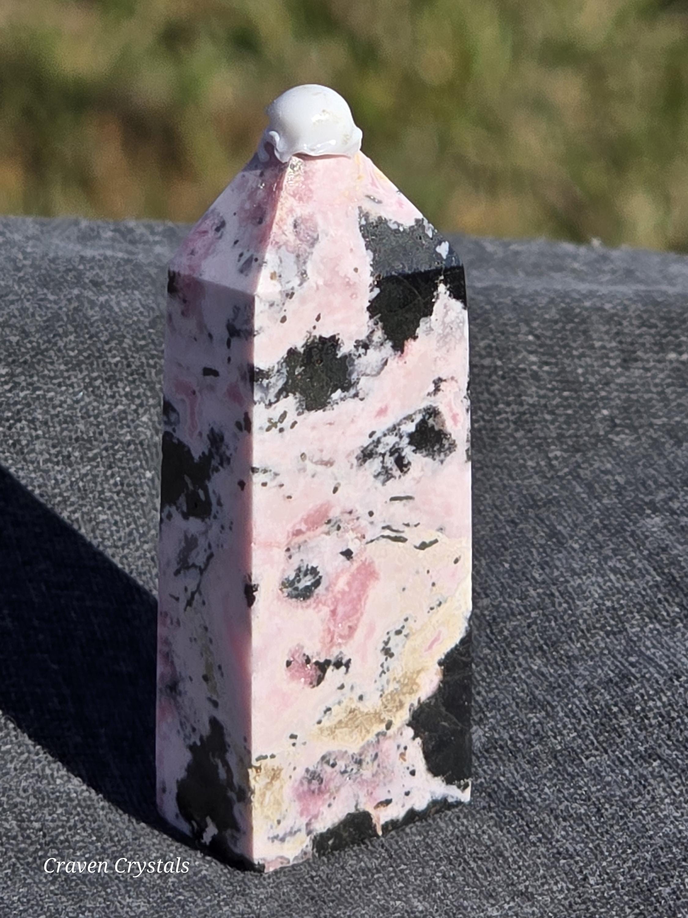 Pink Peruvian Rhodochrosite Crystal Towers, a stunning and emotionally powerful gemstone known for its soft pink to vibrant rose hues, often blended with creamy whites or pale beige banding.