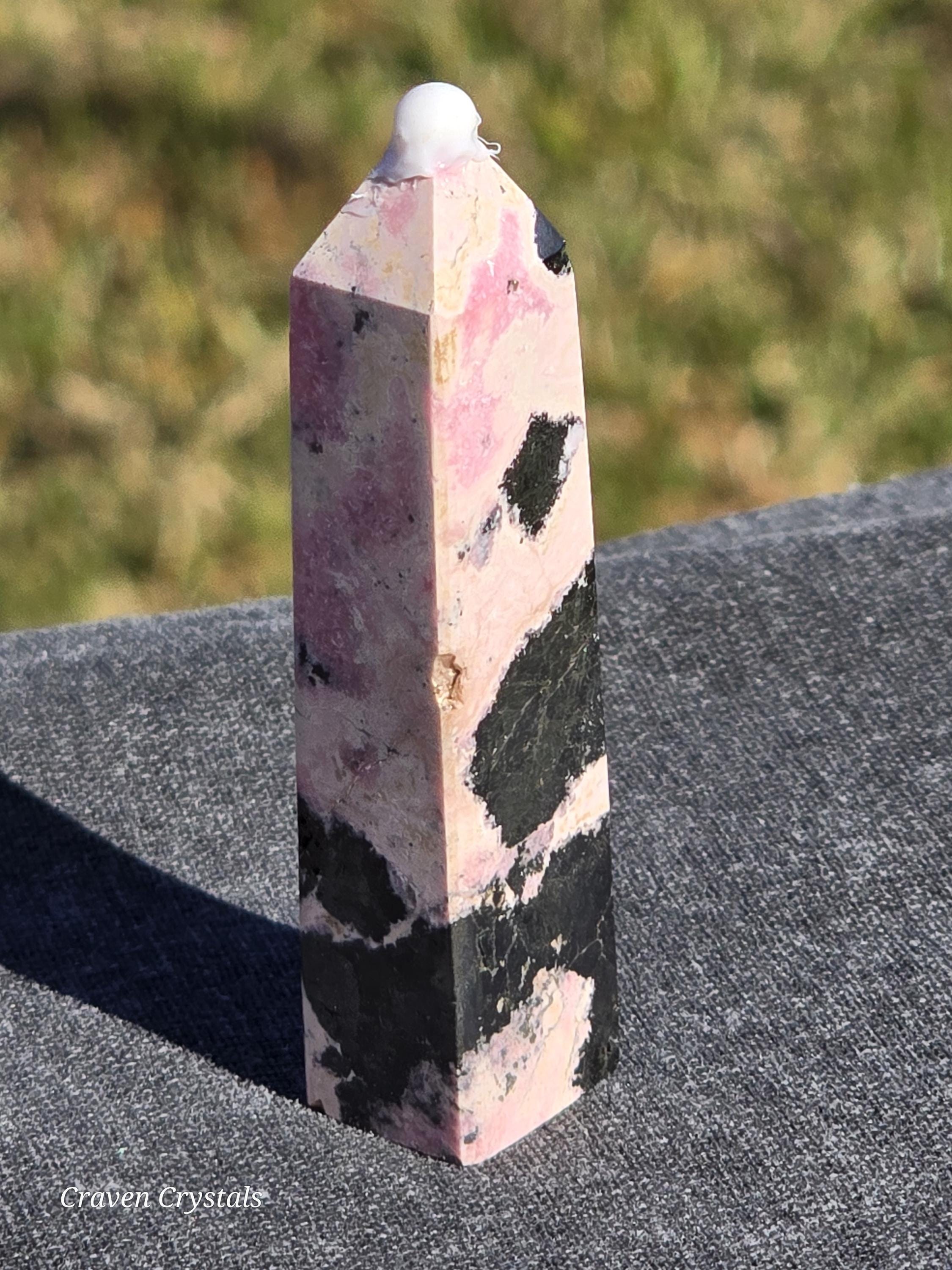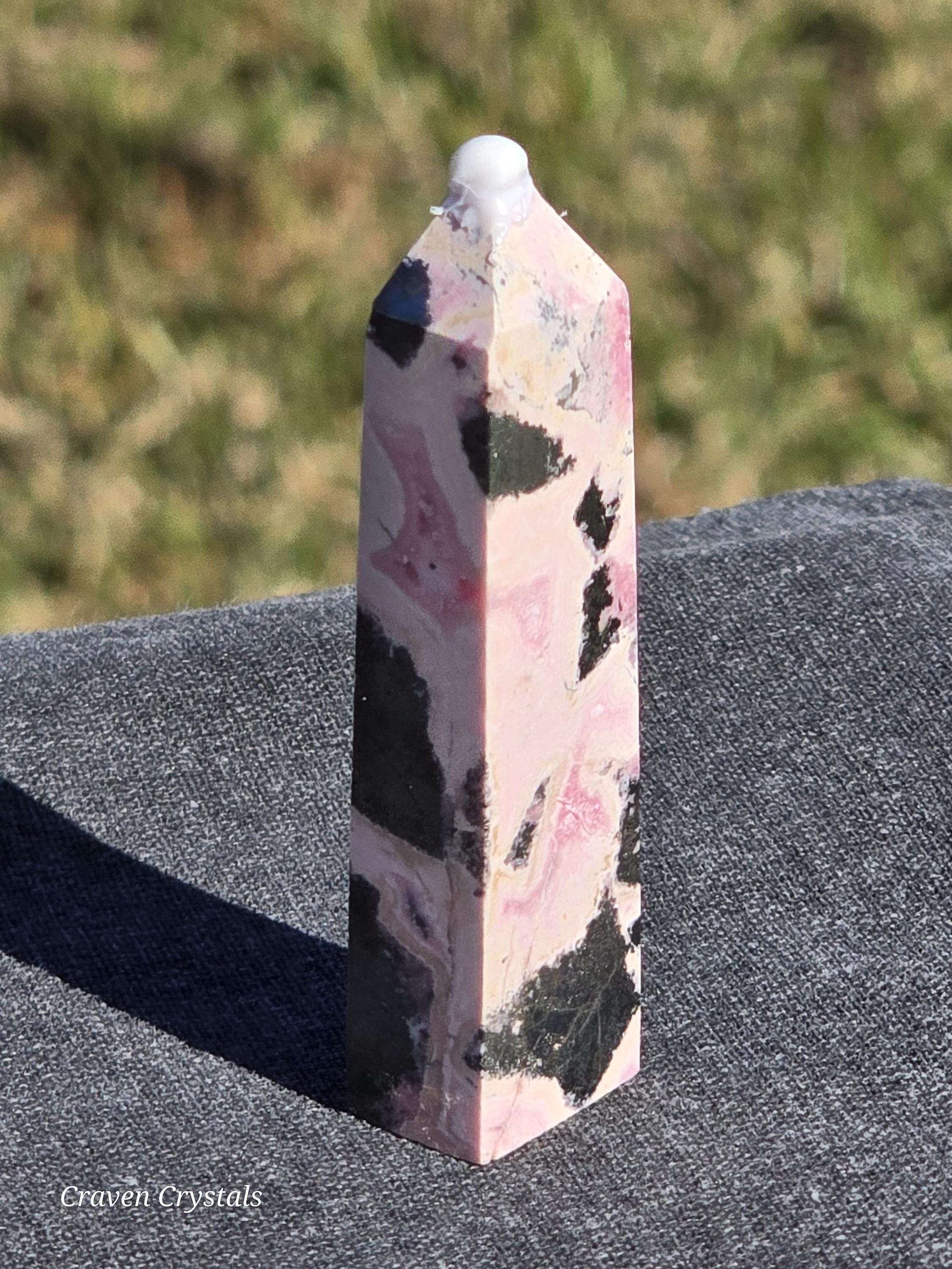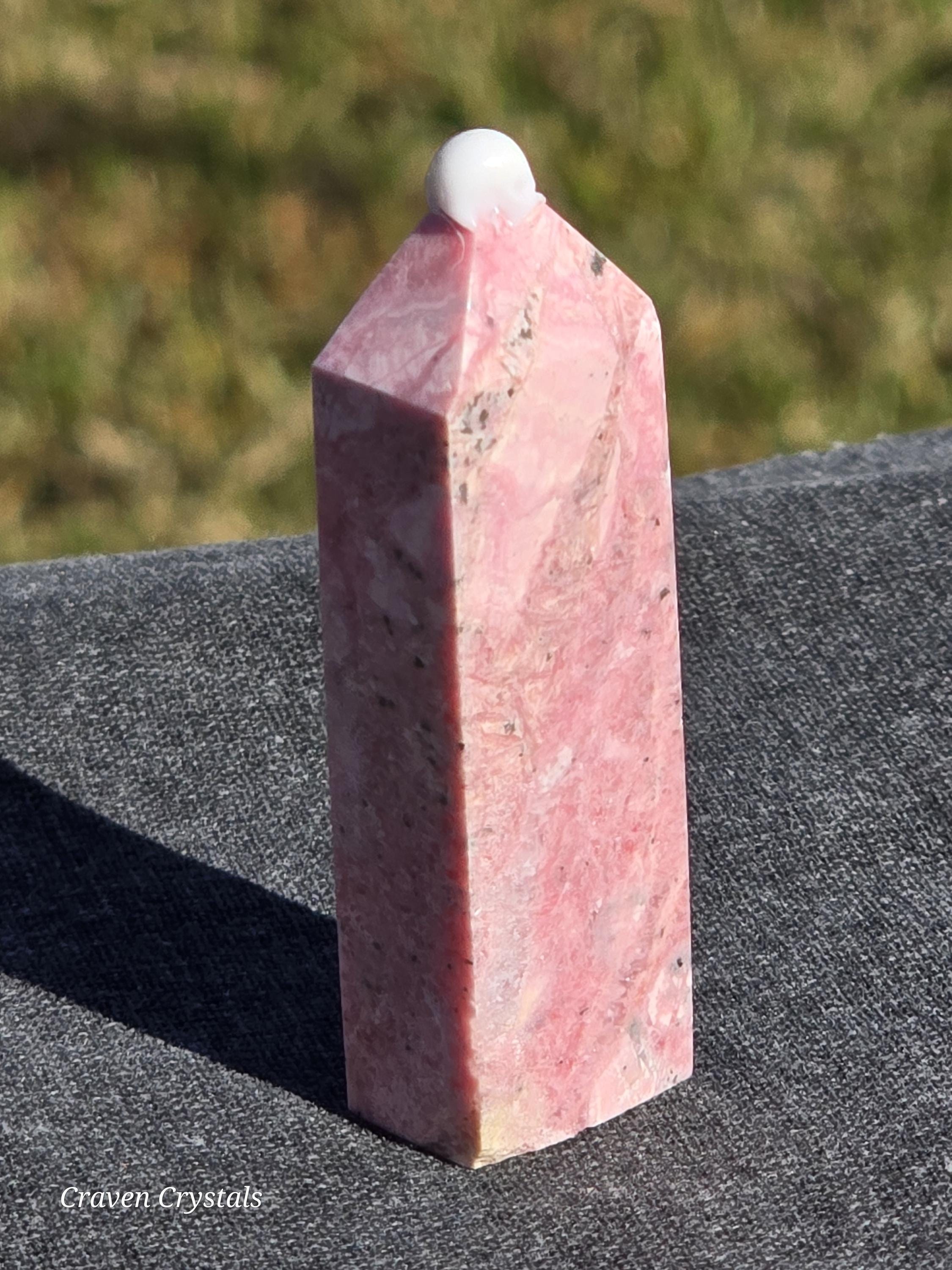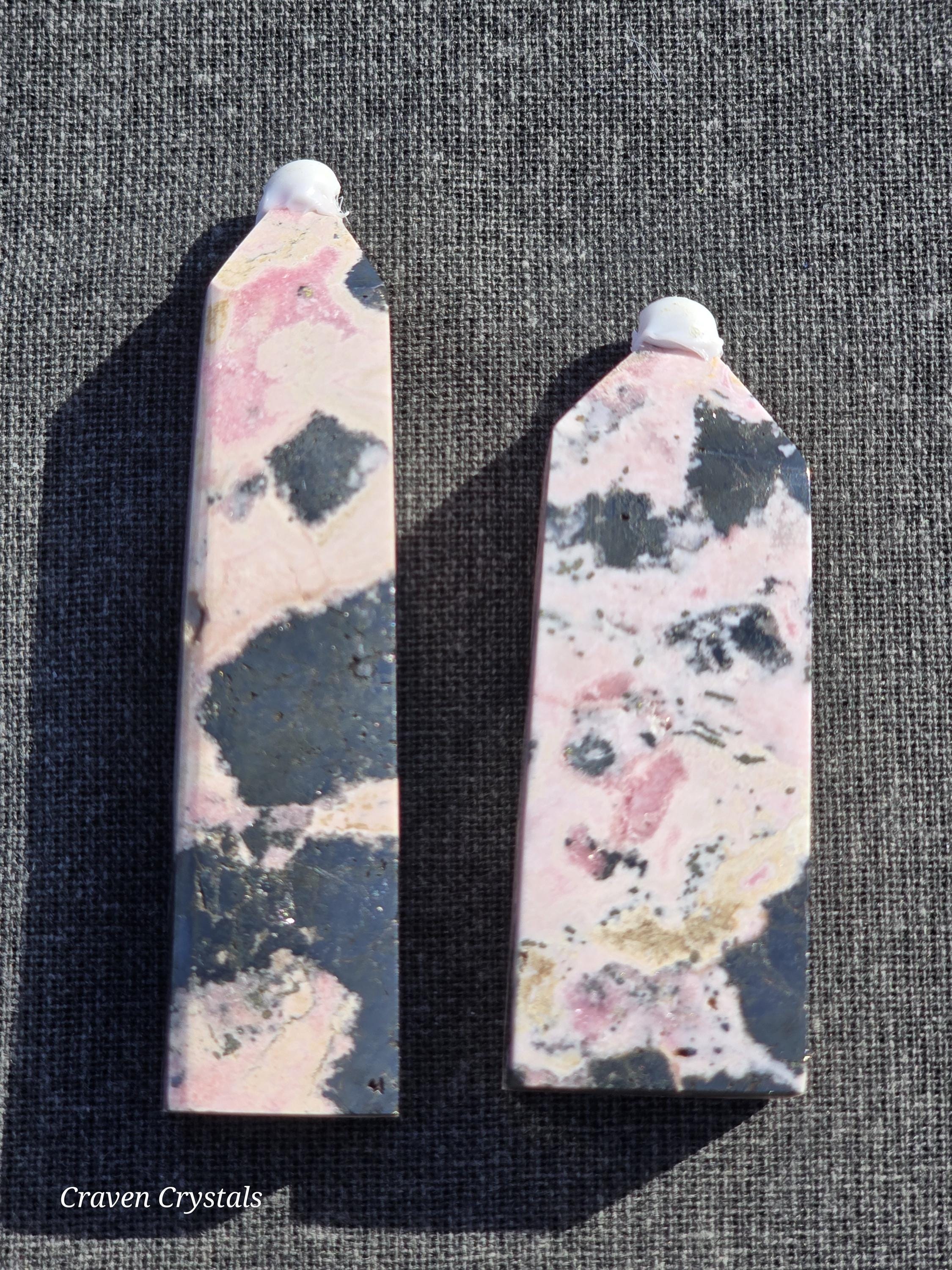 Pink Peruvian Rhodochrosite Crystal Towers, a stunning and emotionally powerful gemstone known for its soft pink to vibrant rose hues, often blended with creamy whites or pale beige banding.