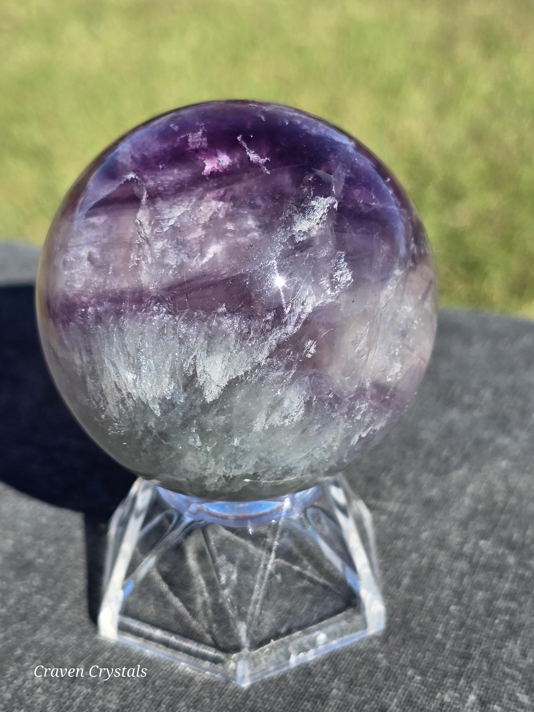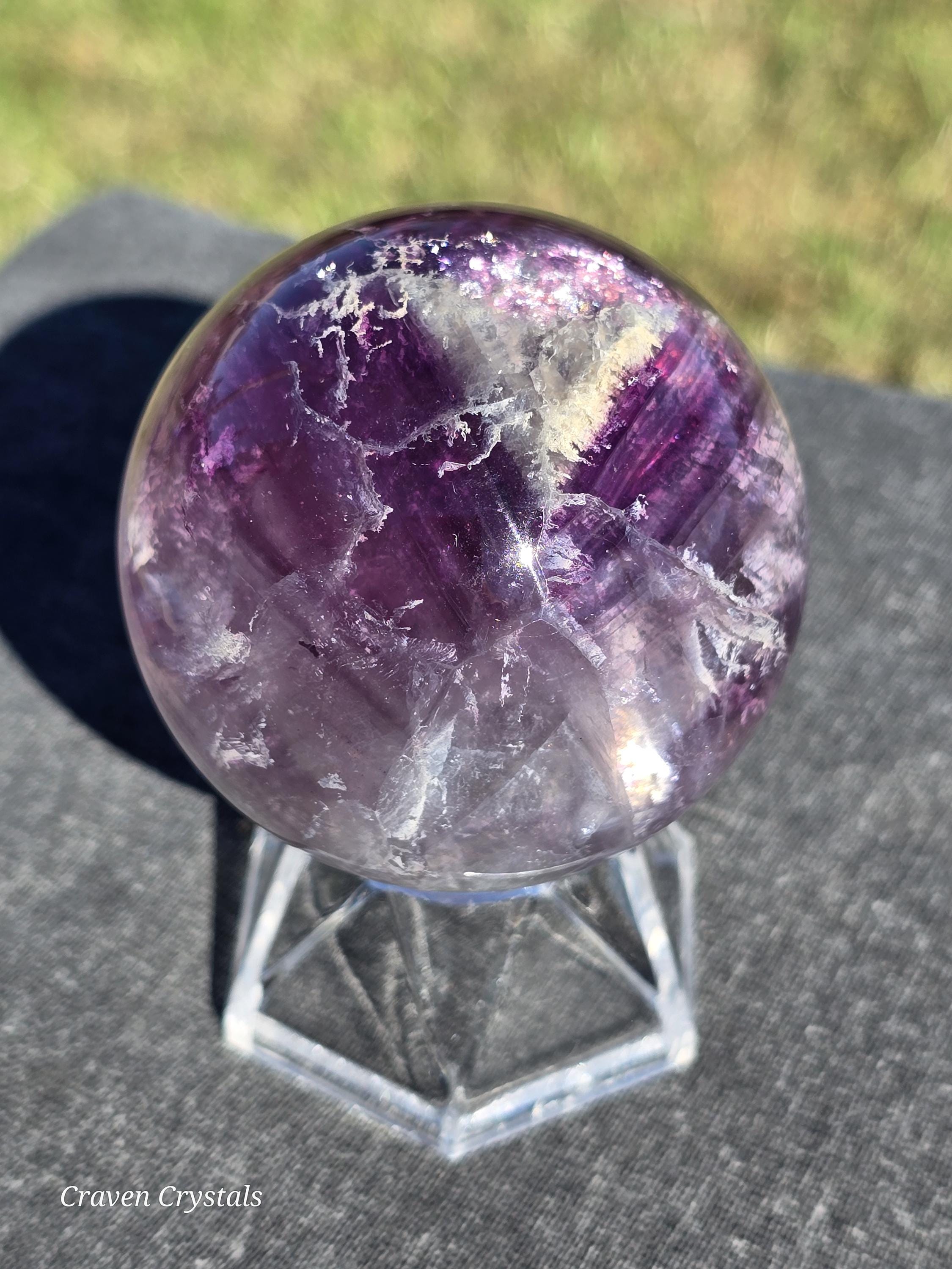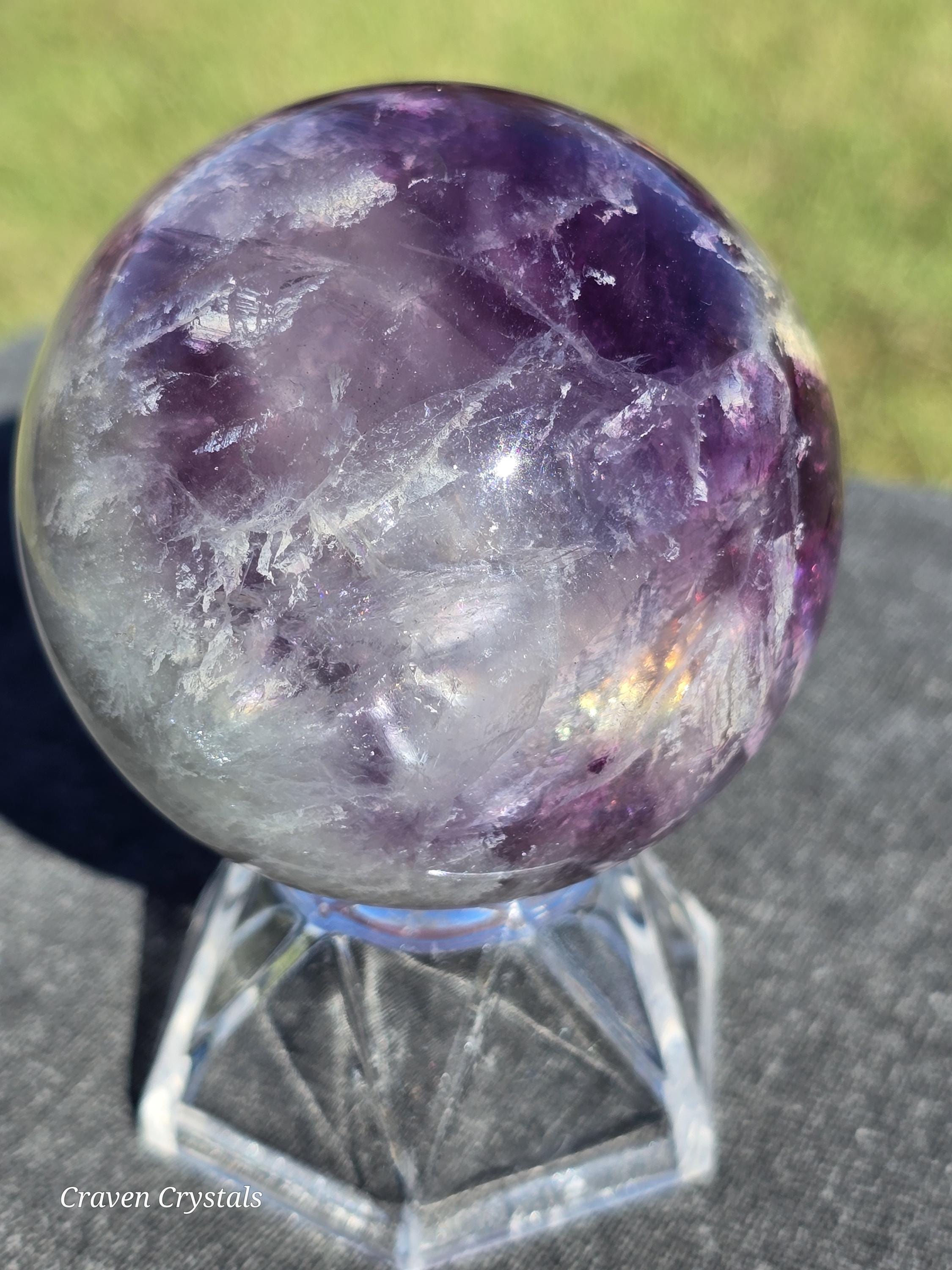 Feather Purple & Green Fluorite Crystal Sphere with rainbow inclusions