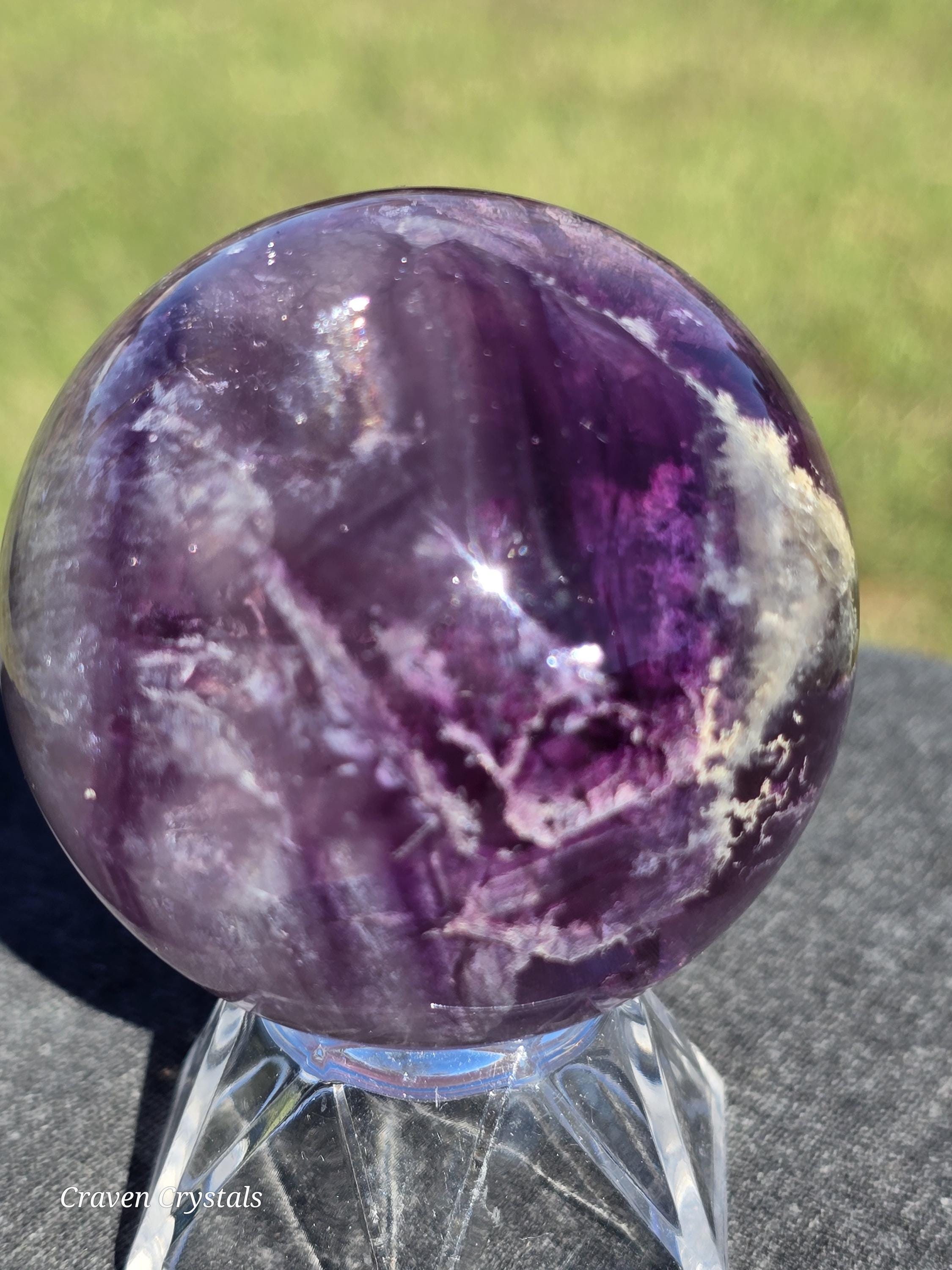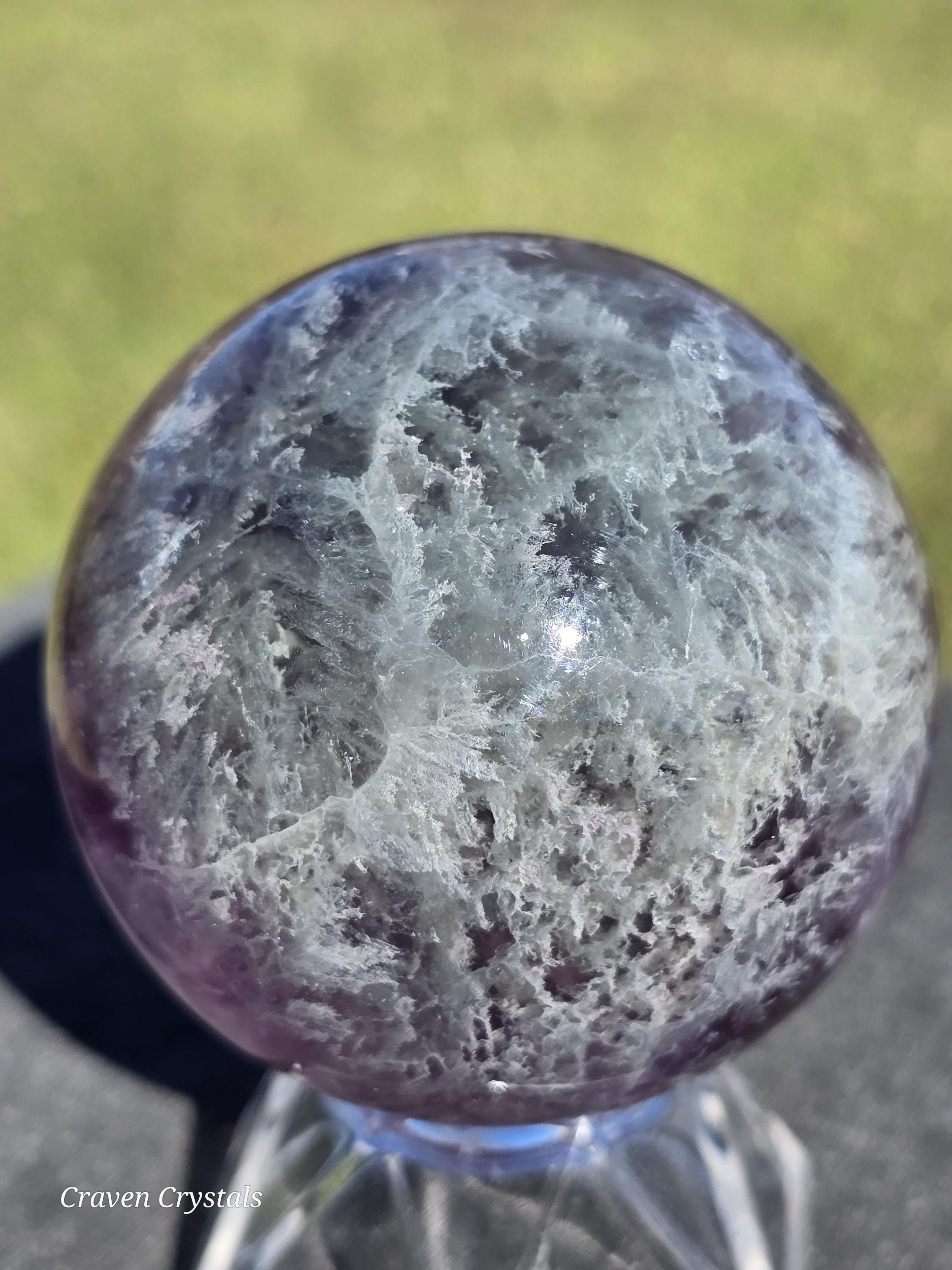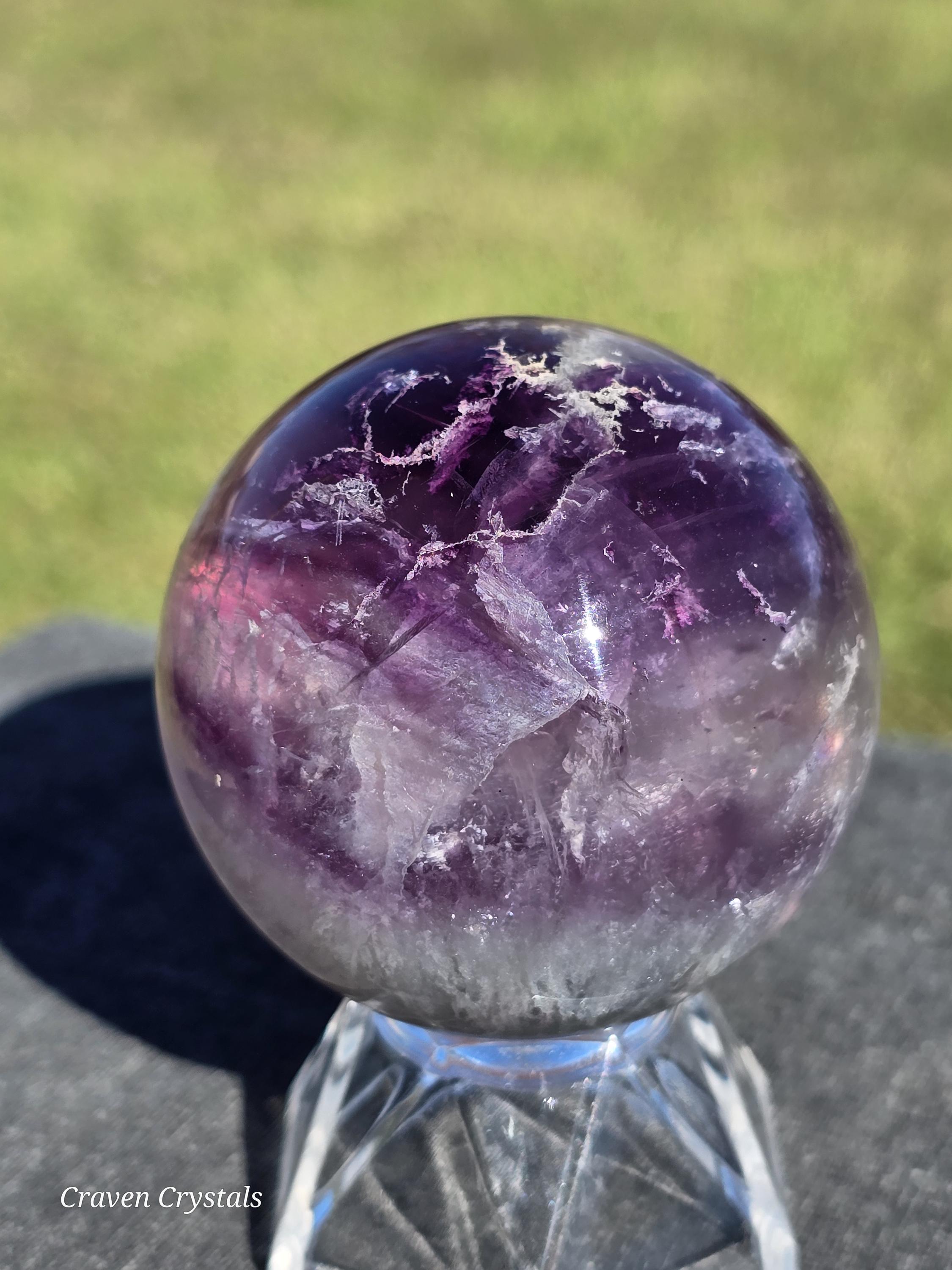 Feather Purple & Green Fluorite Crystal Sphere with rainbow inclusions