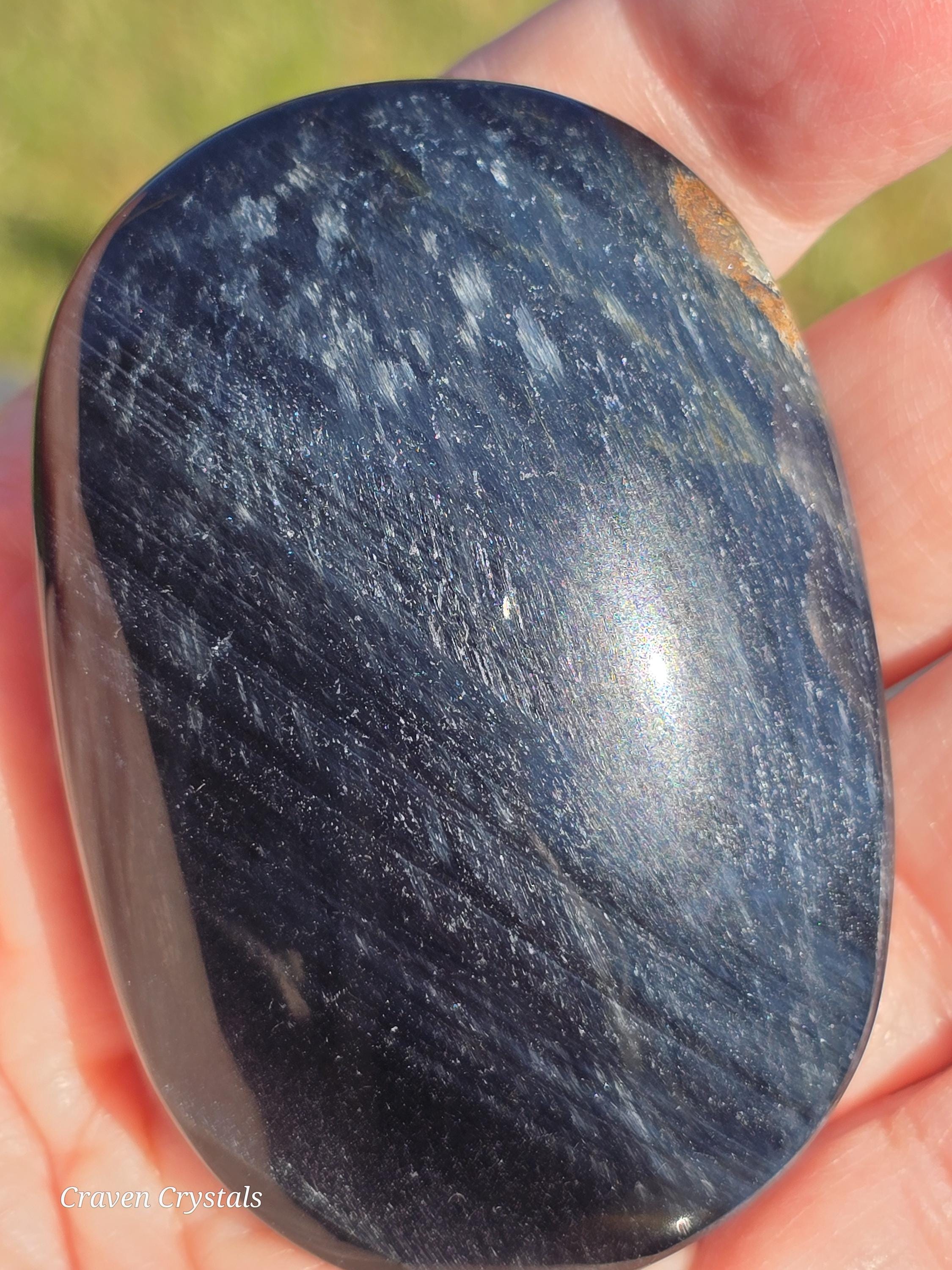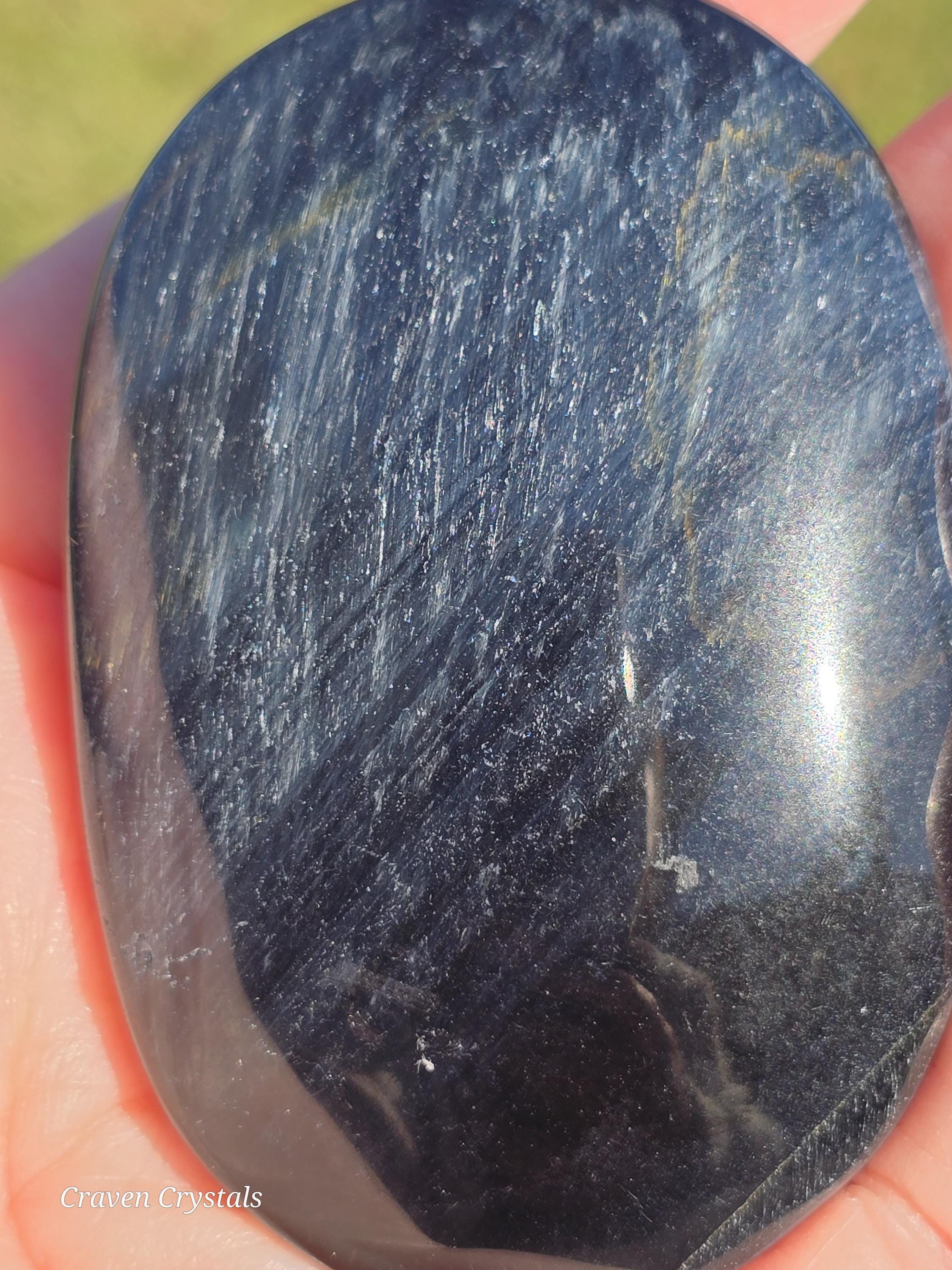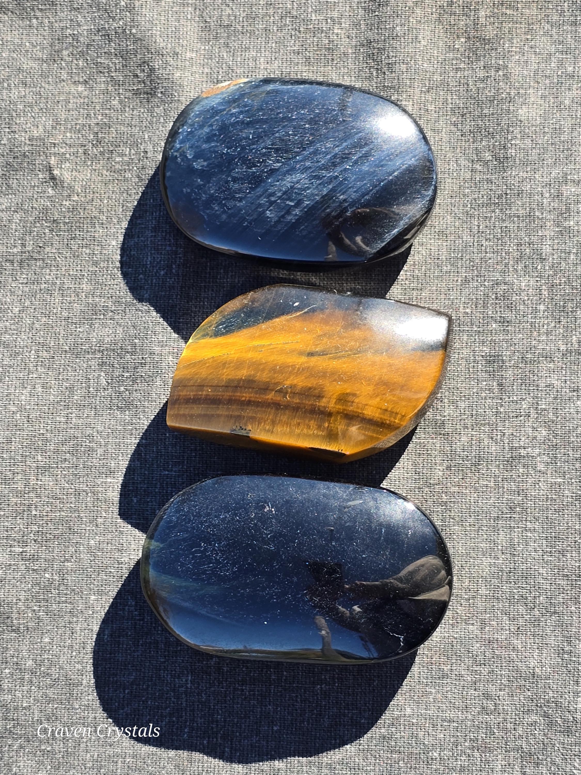 Tigers Eye and Blue Tigers Eye, also known as Falcons Eye, Crystal Palm Stones