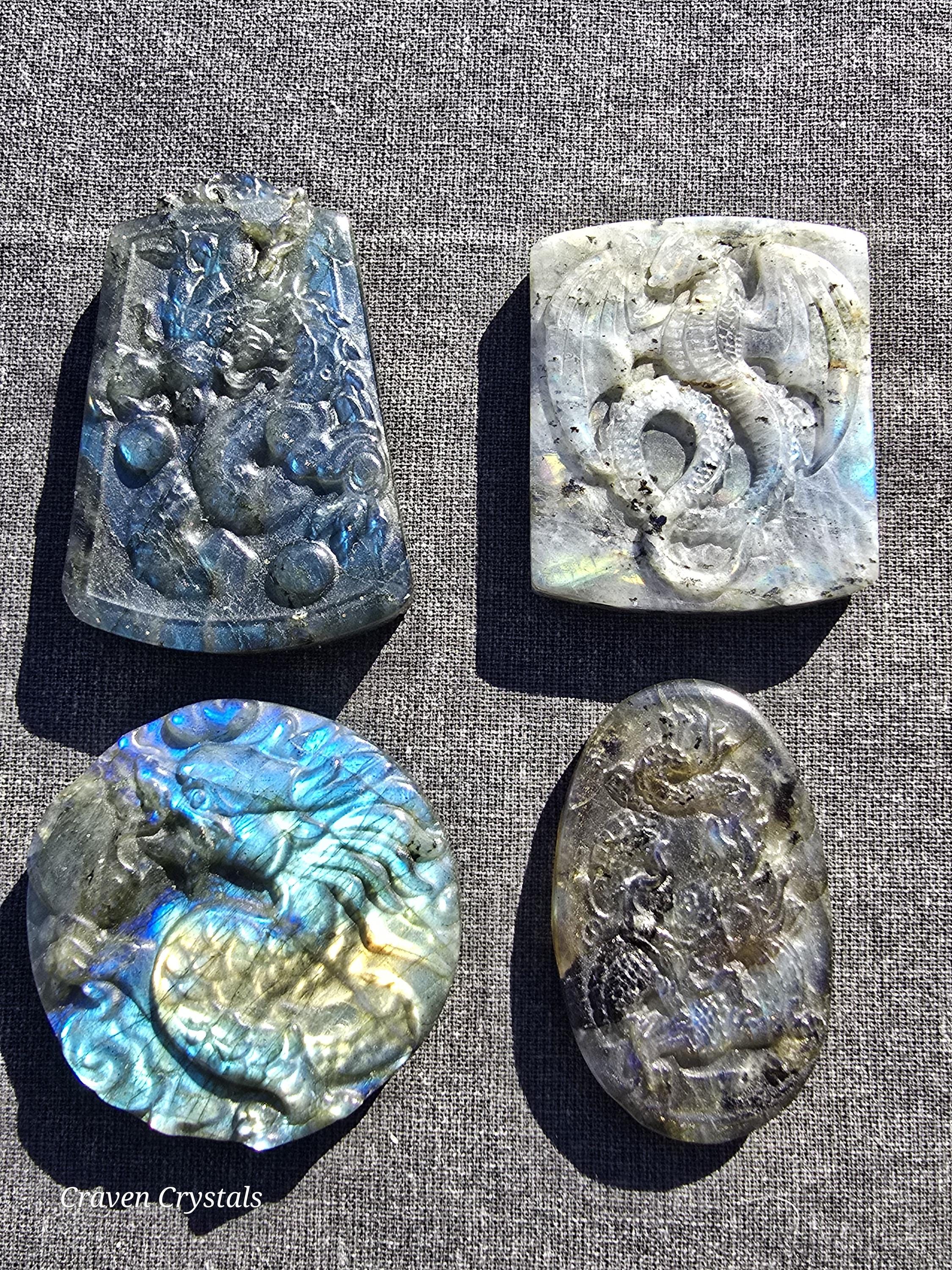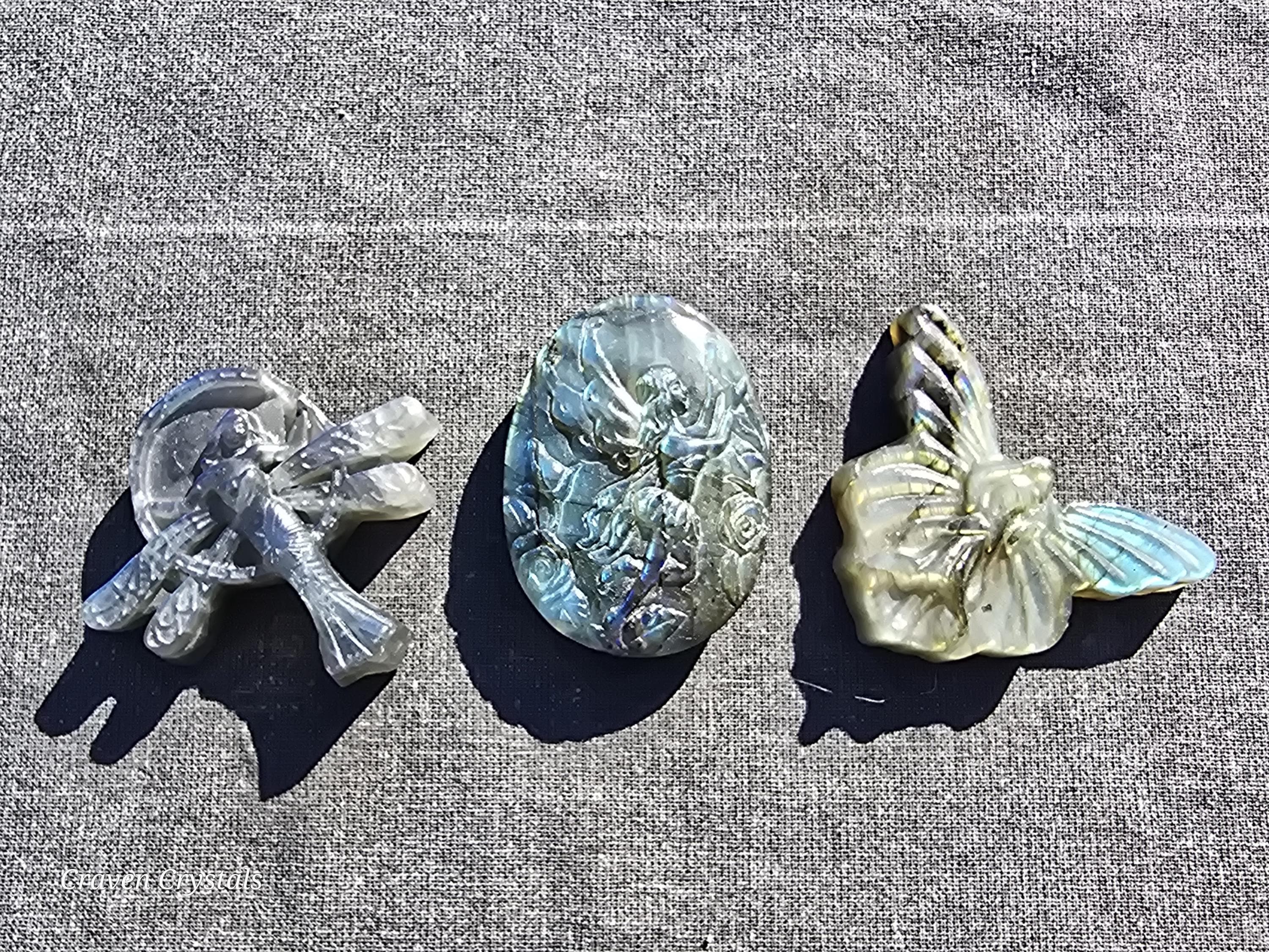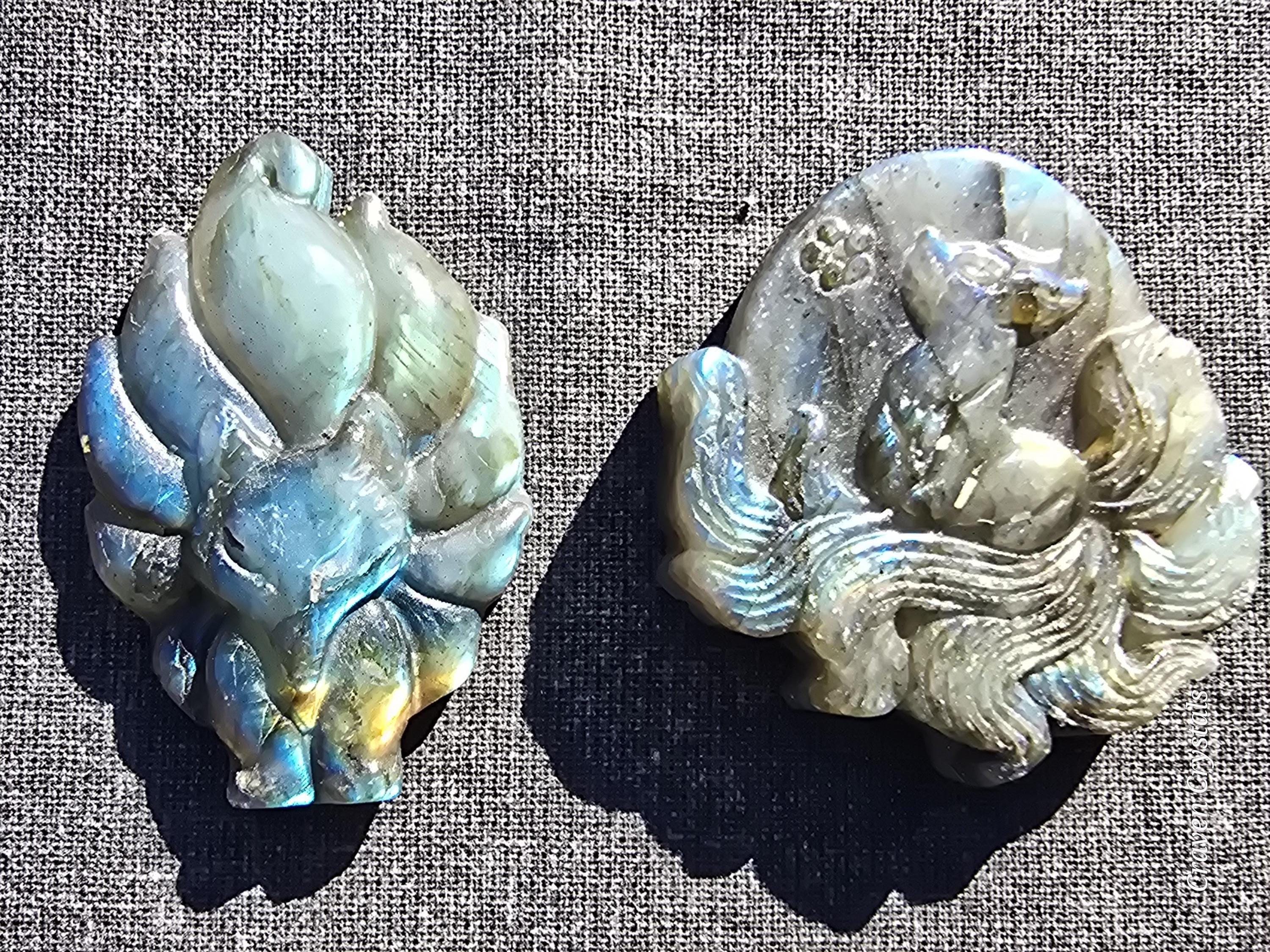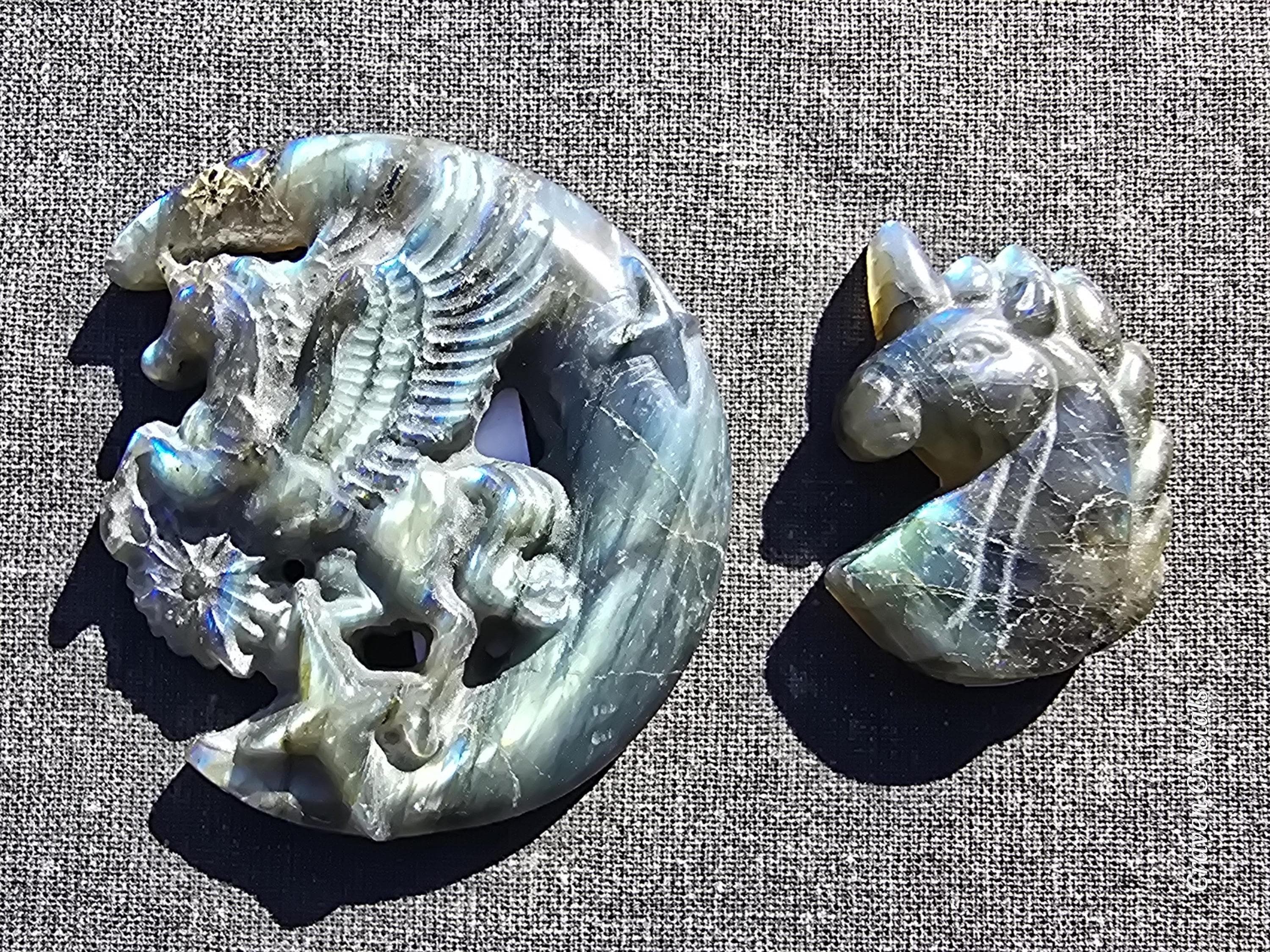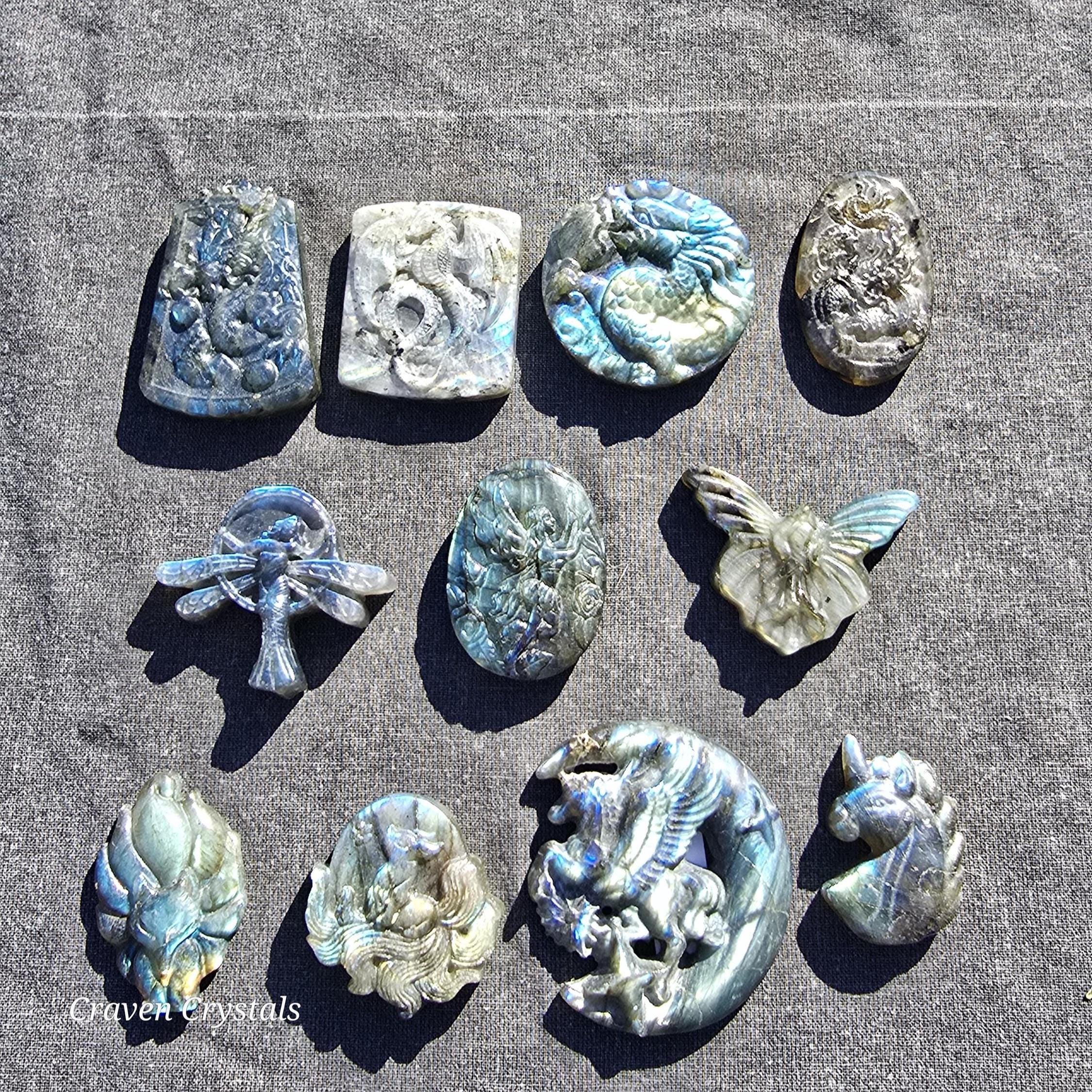 Labradorite mystical carvings ~ dragons, unicorns, pegasus, fairies, and 9-tail fox
