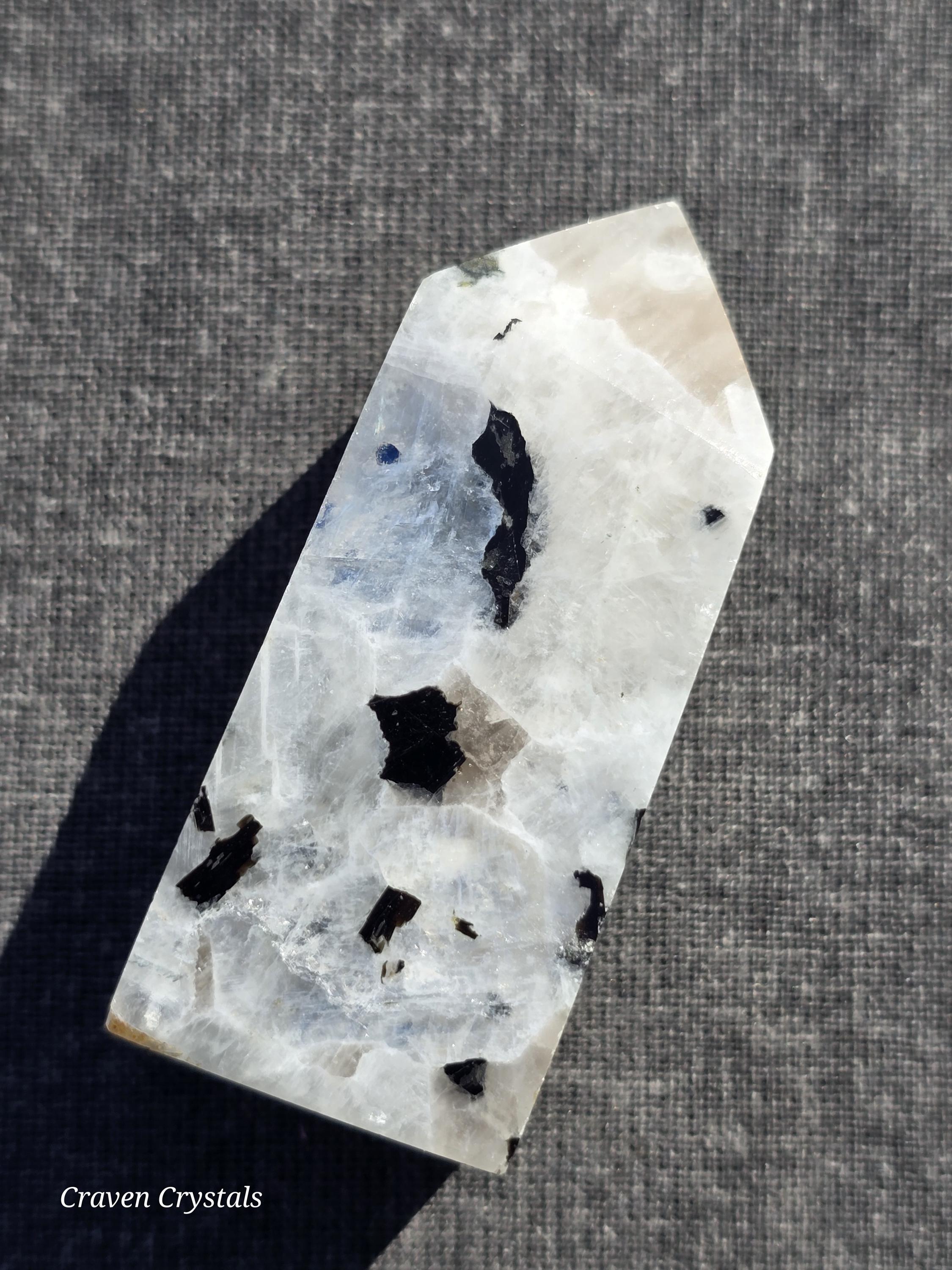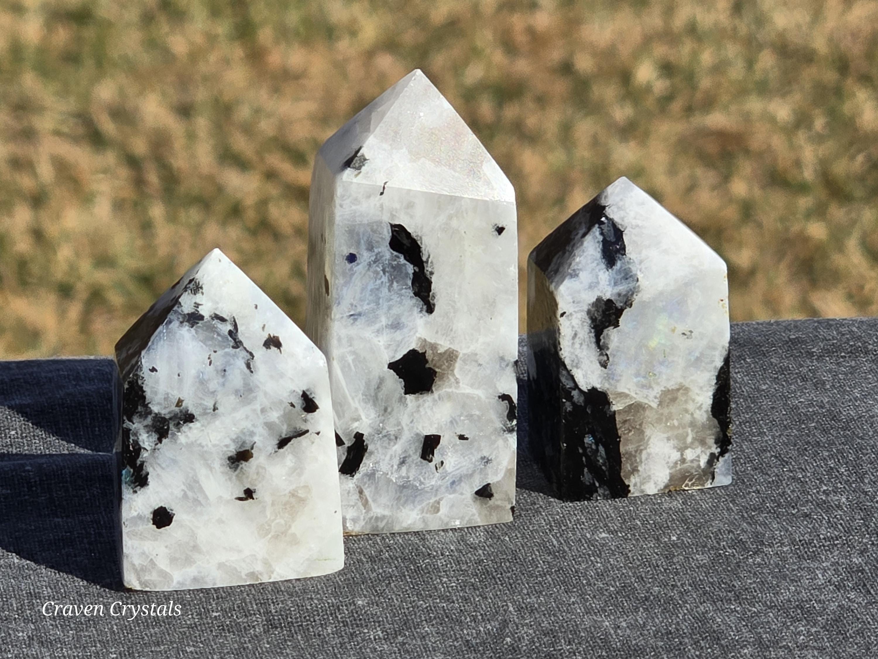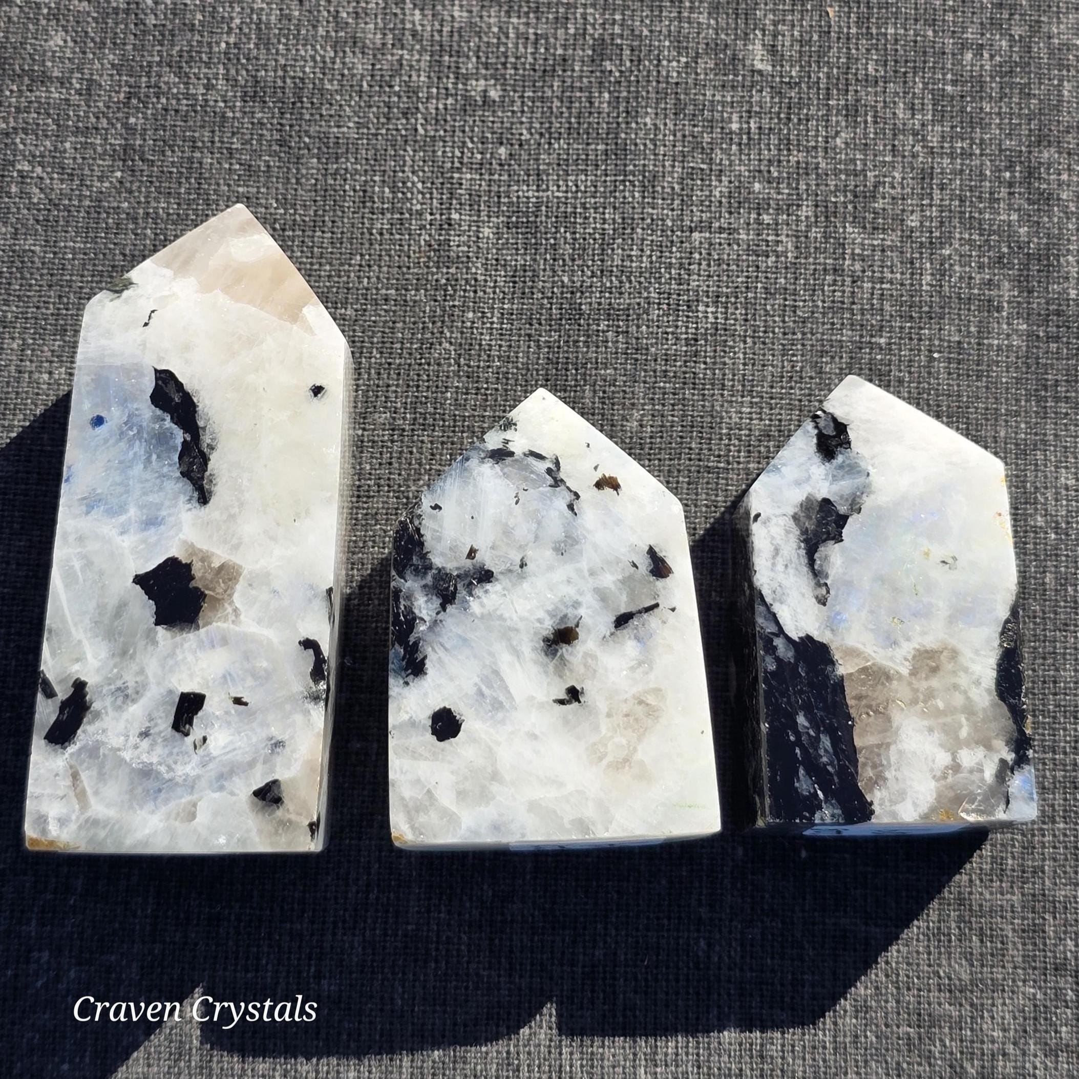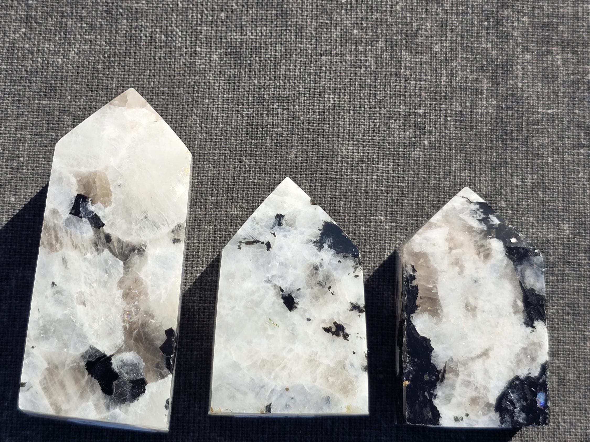 Rainbow Moonstone Crystal Towers, also known as White Labradorite with Tourmaline