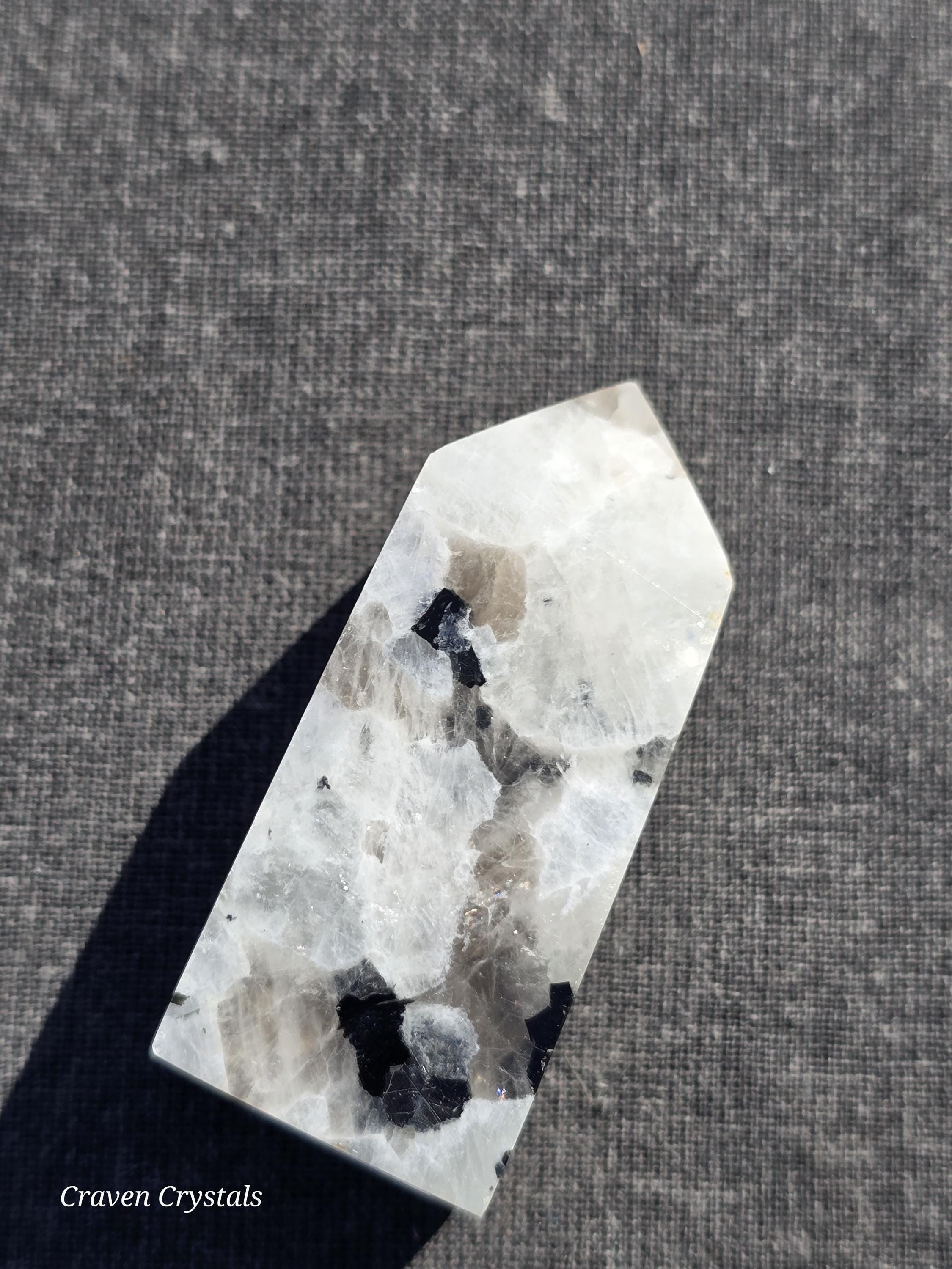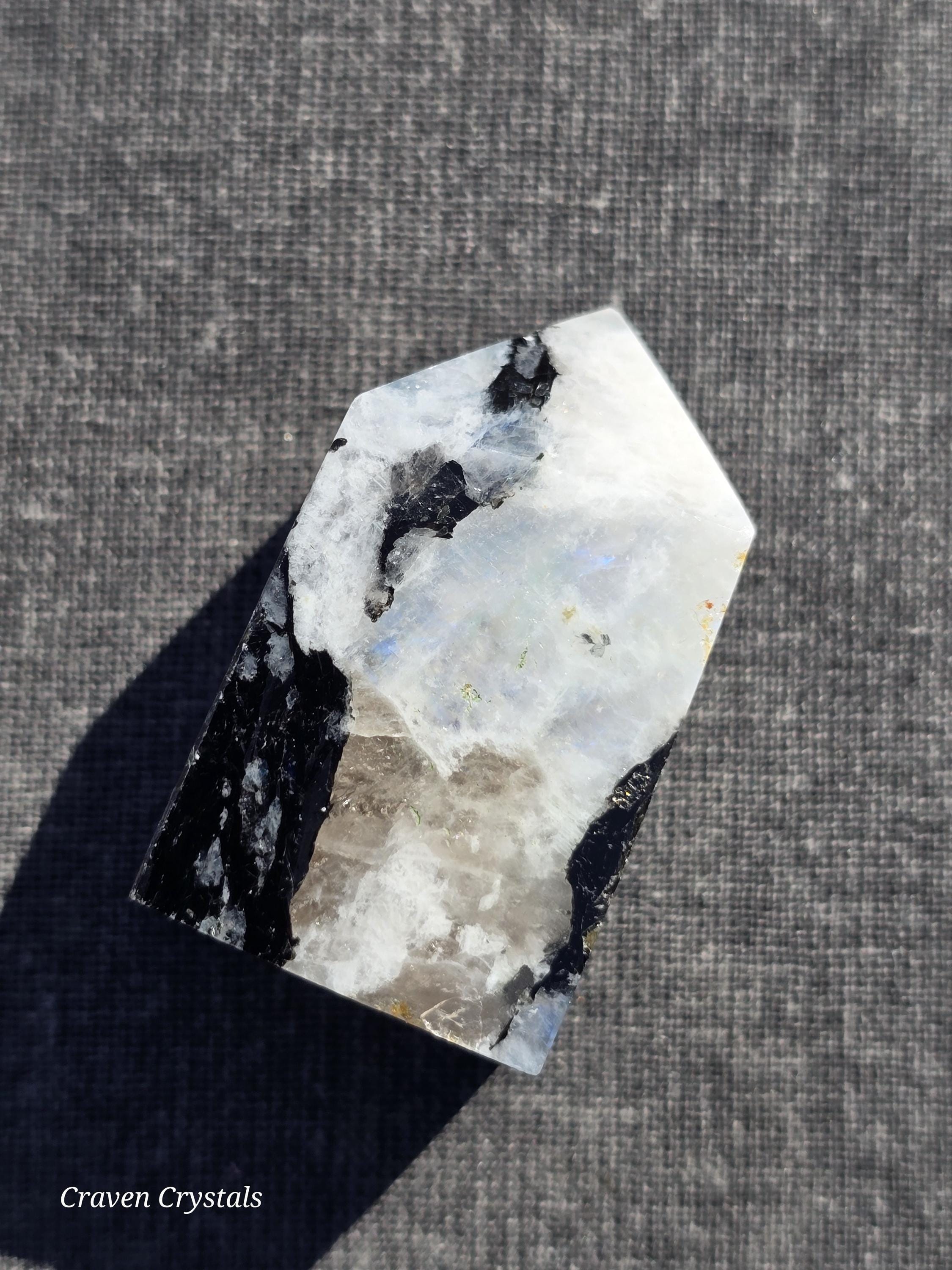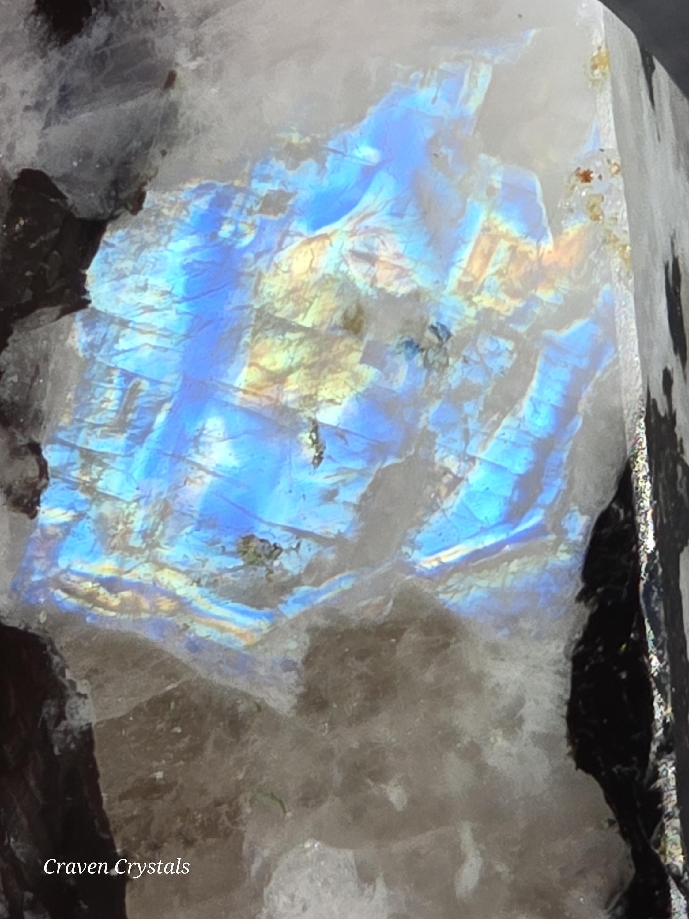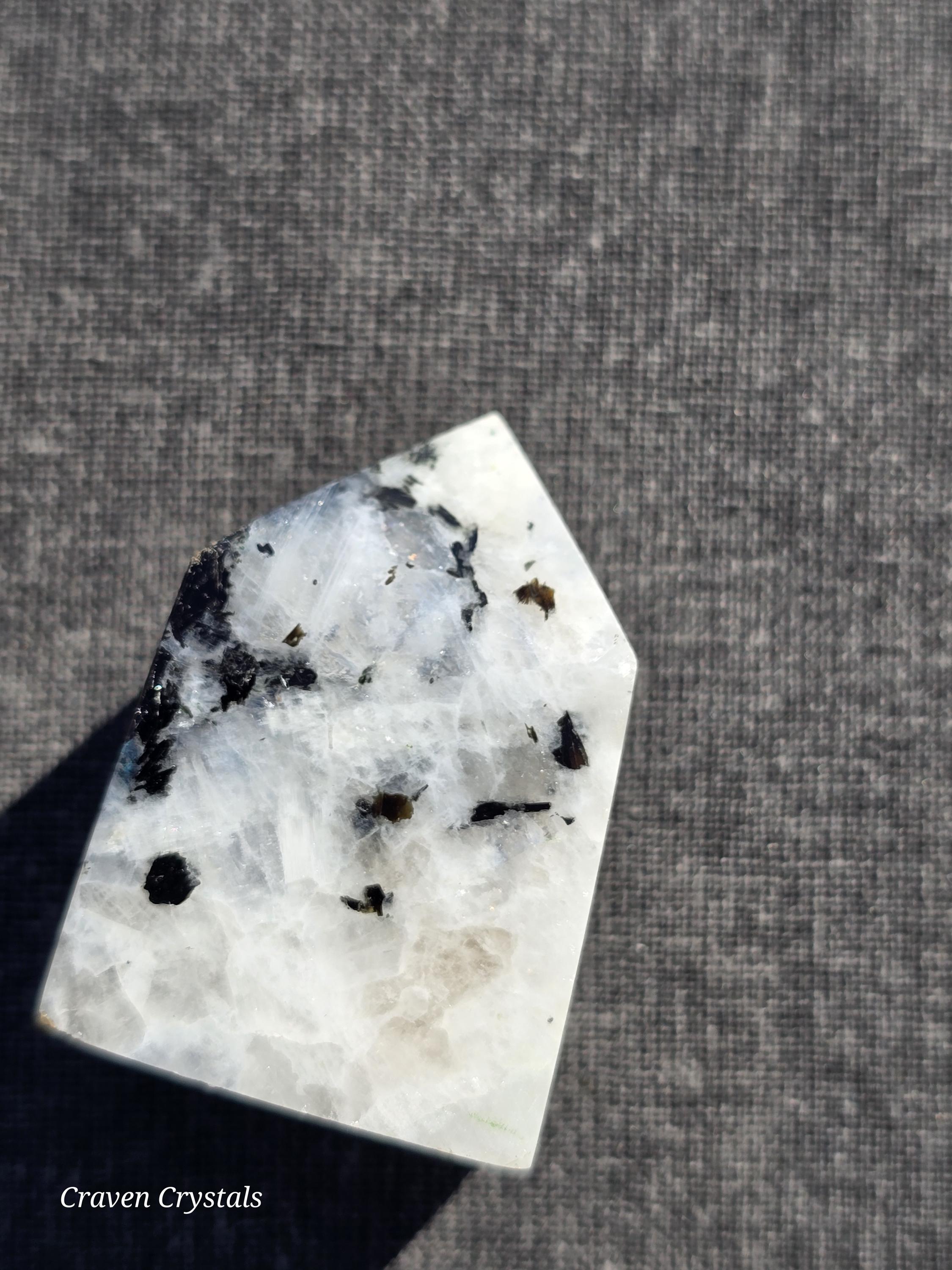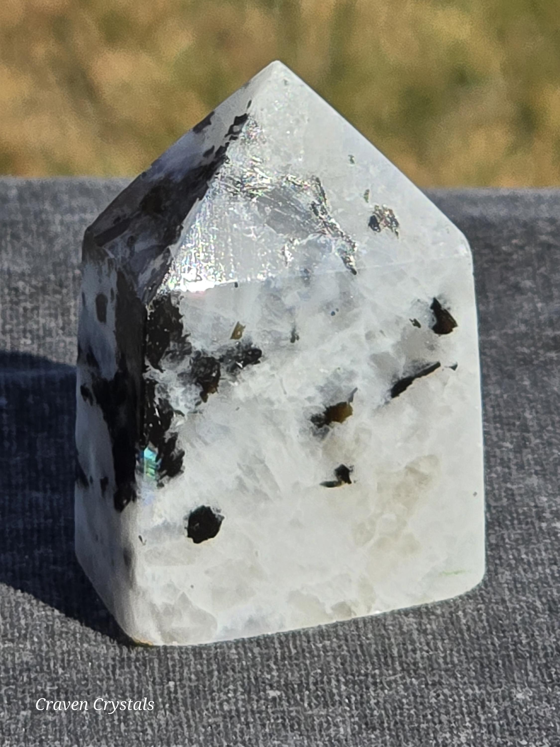 Rainbow Moonstone Crystal Towers, also known as White Labradorite with Tourmaline
