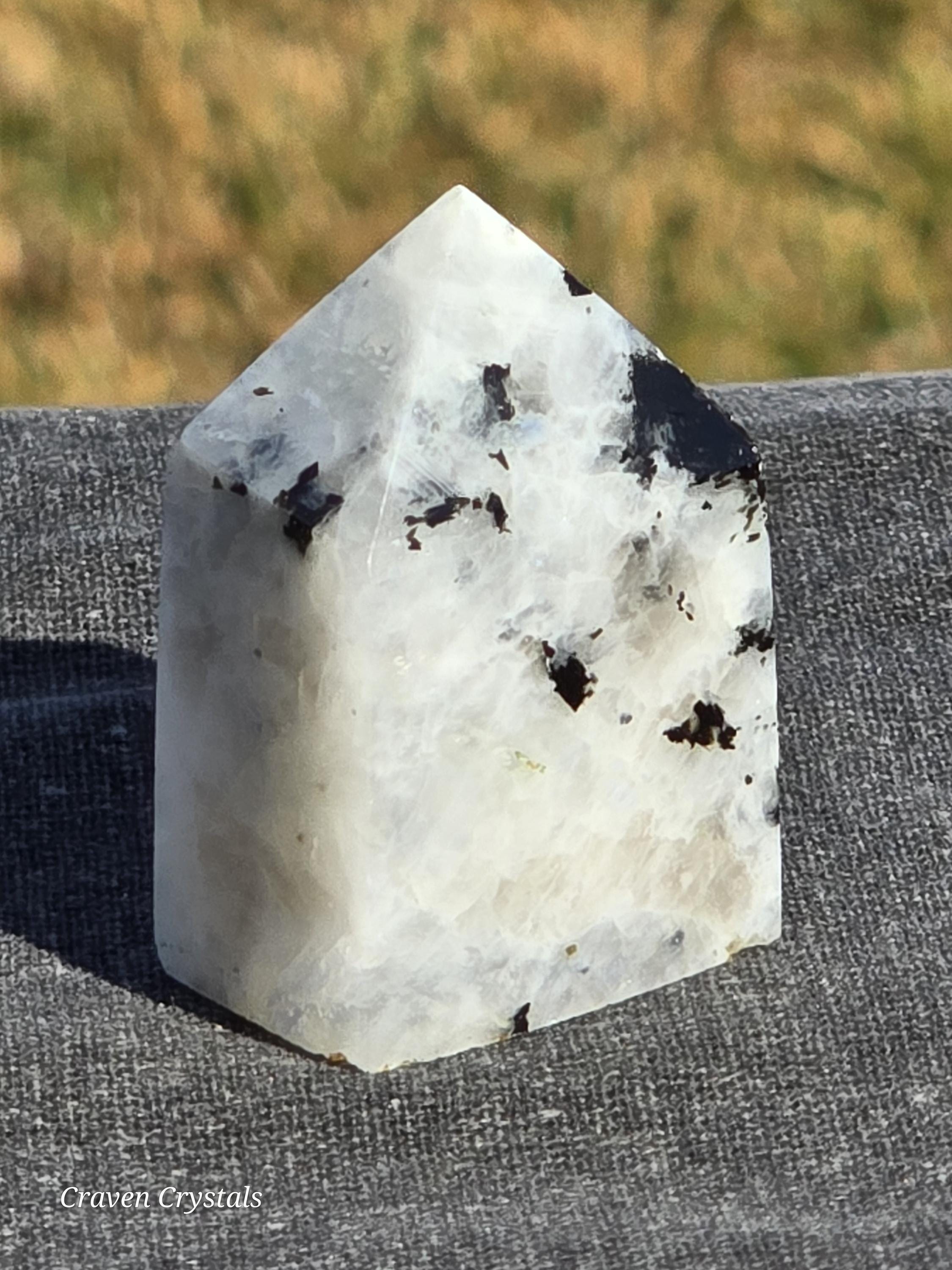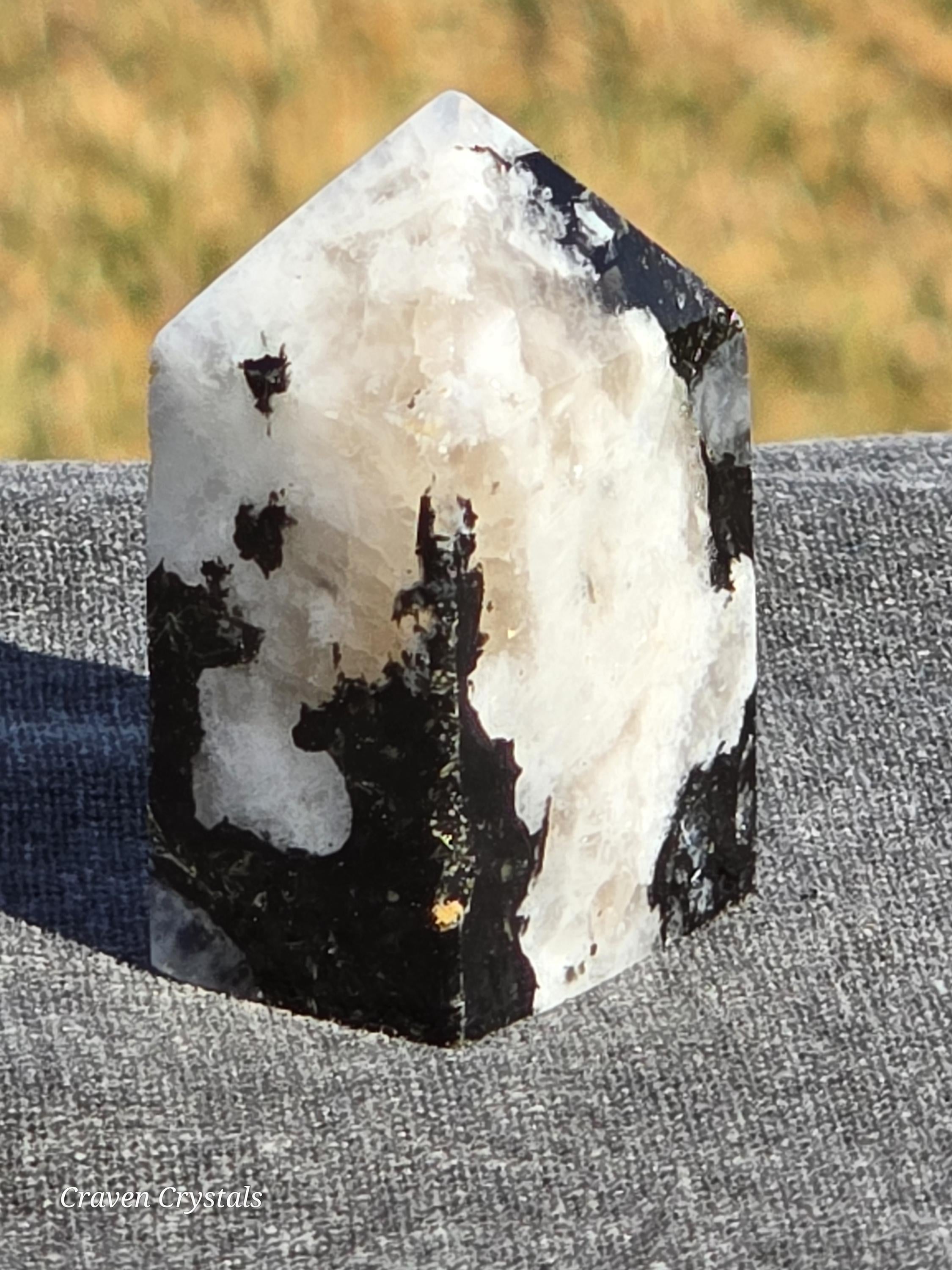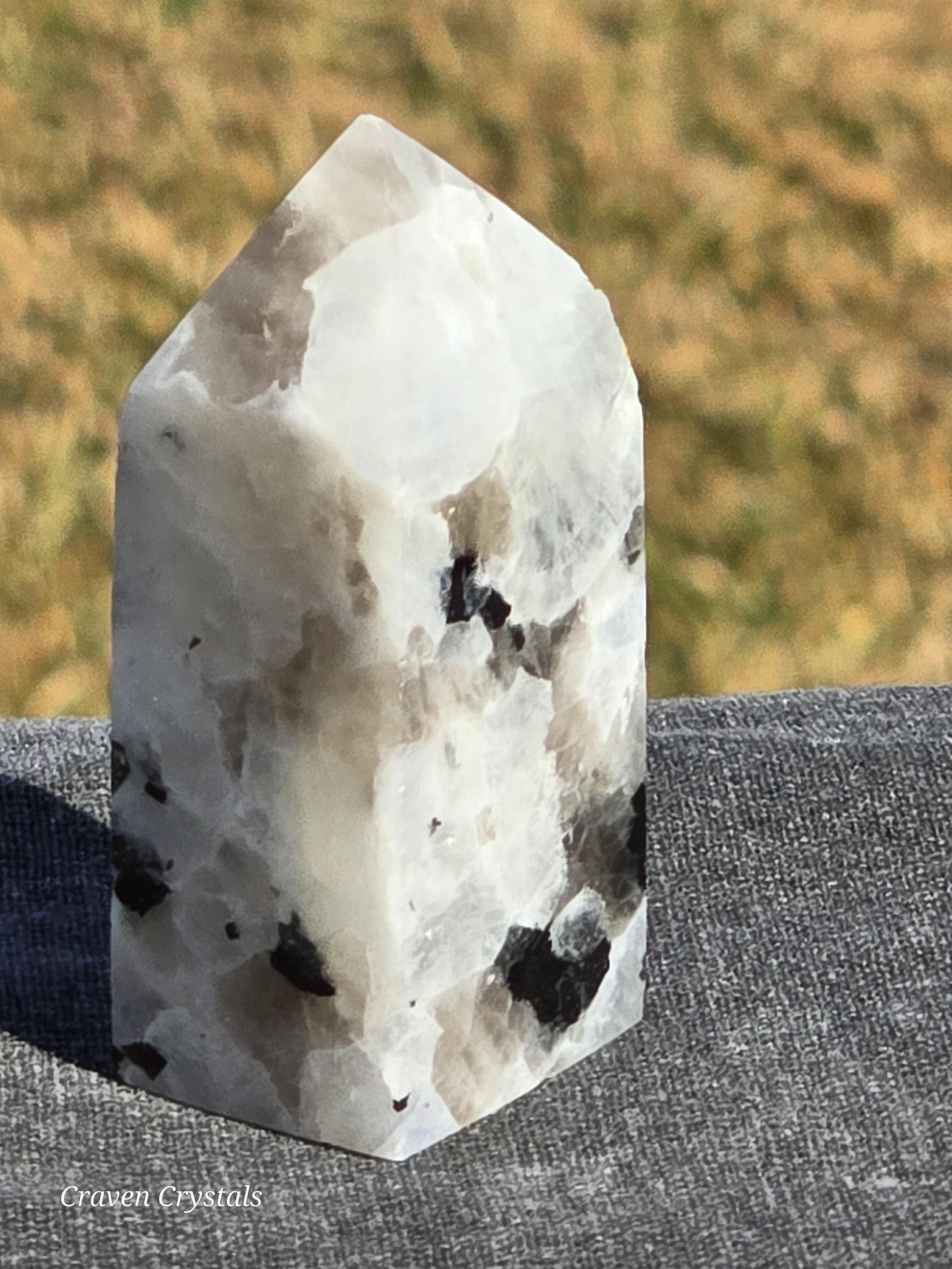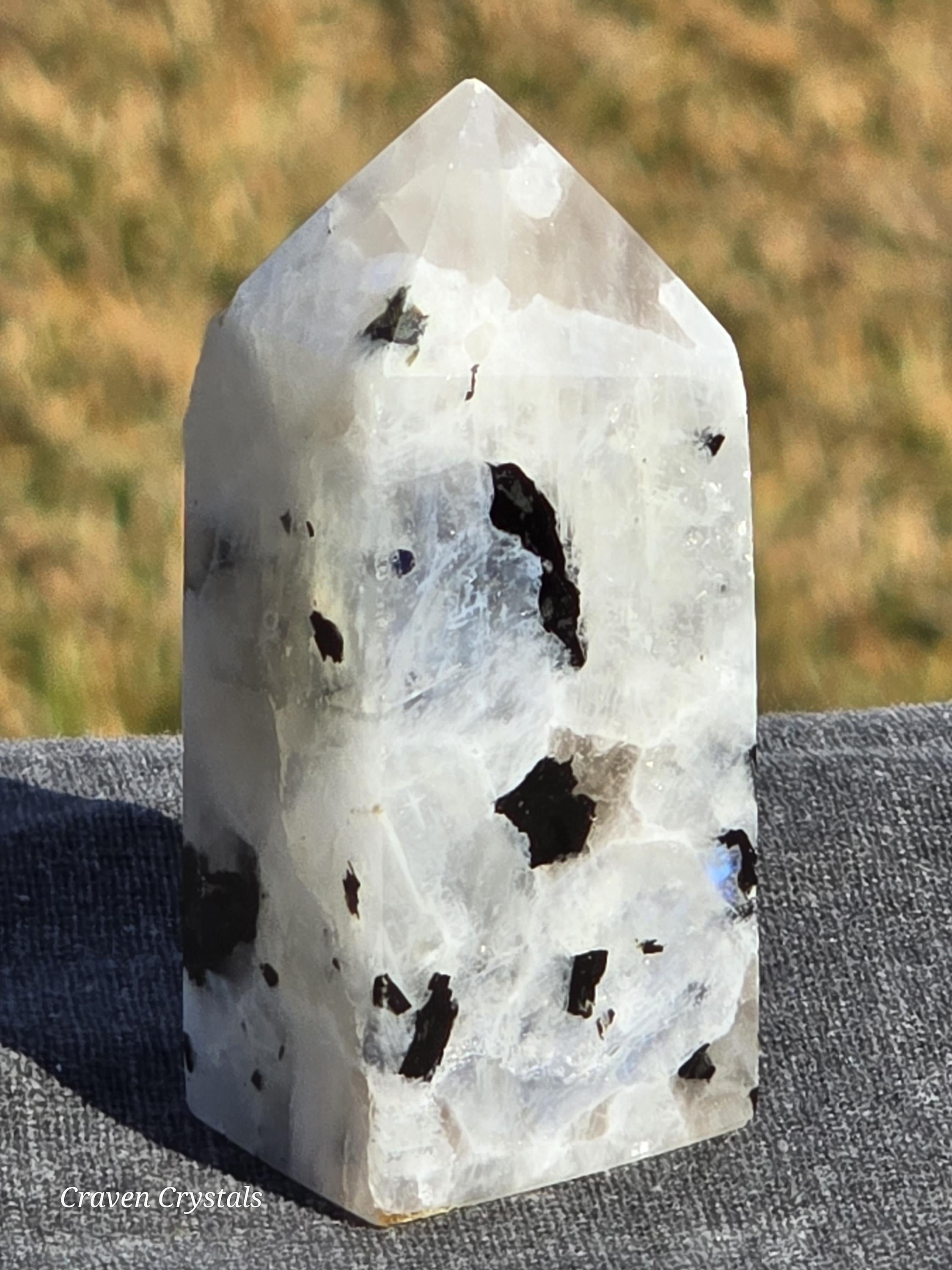 Rainbow Moonstone Crystal Towers, also known as White Labradorite with Tourmaline