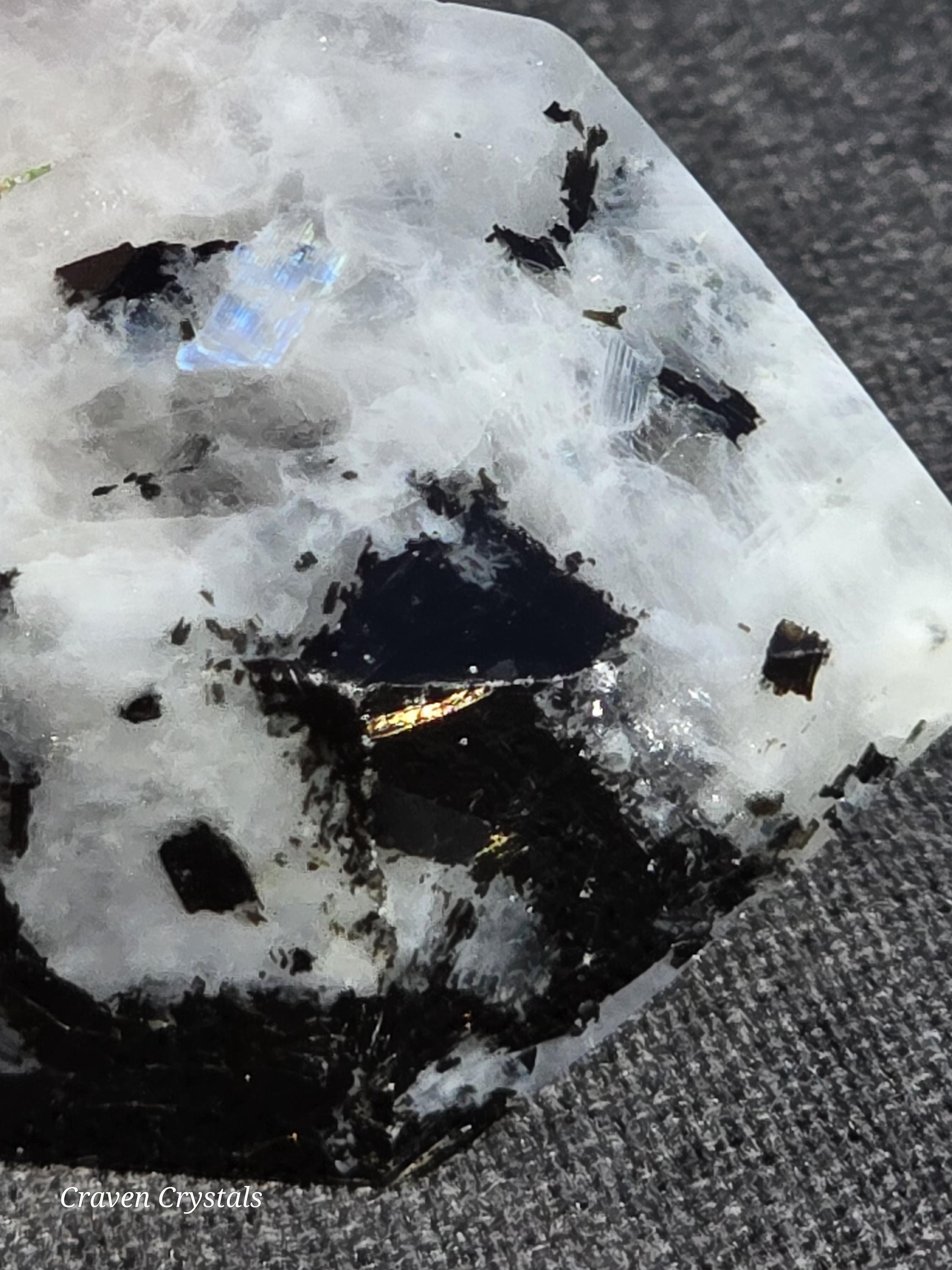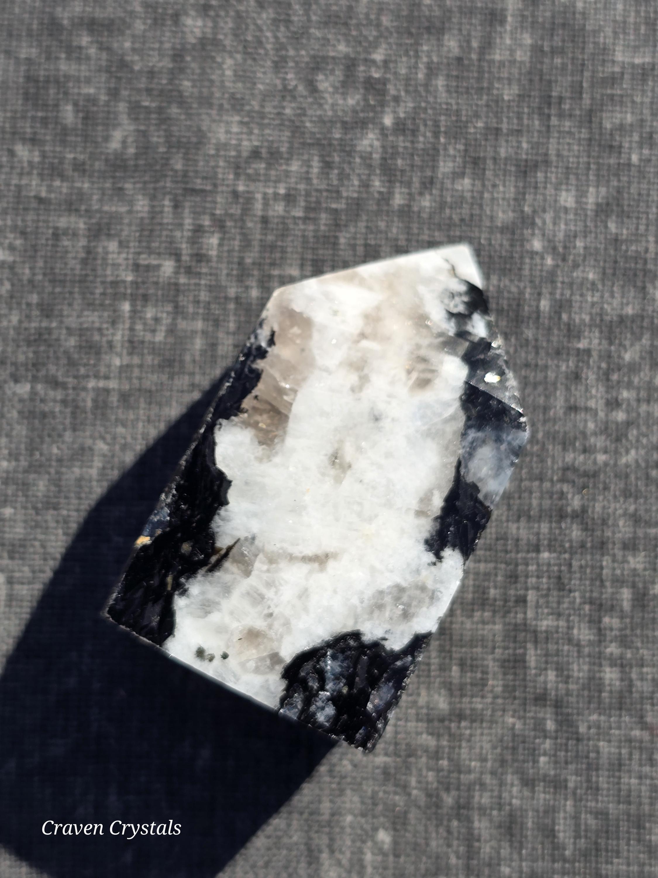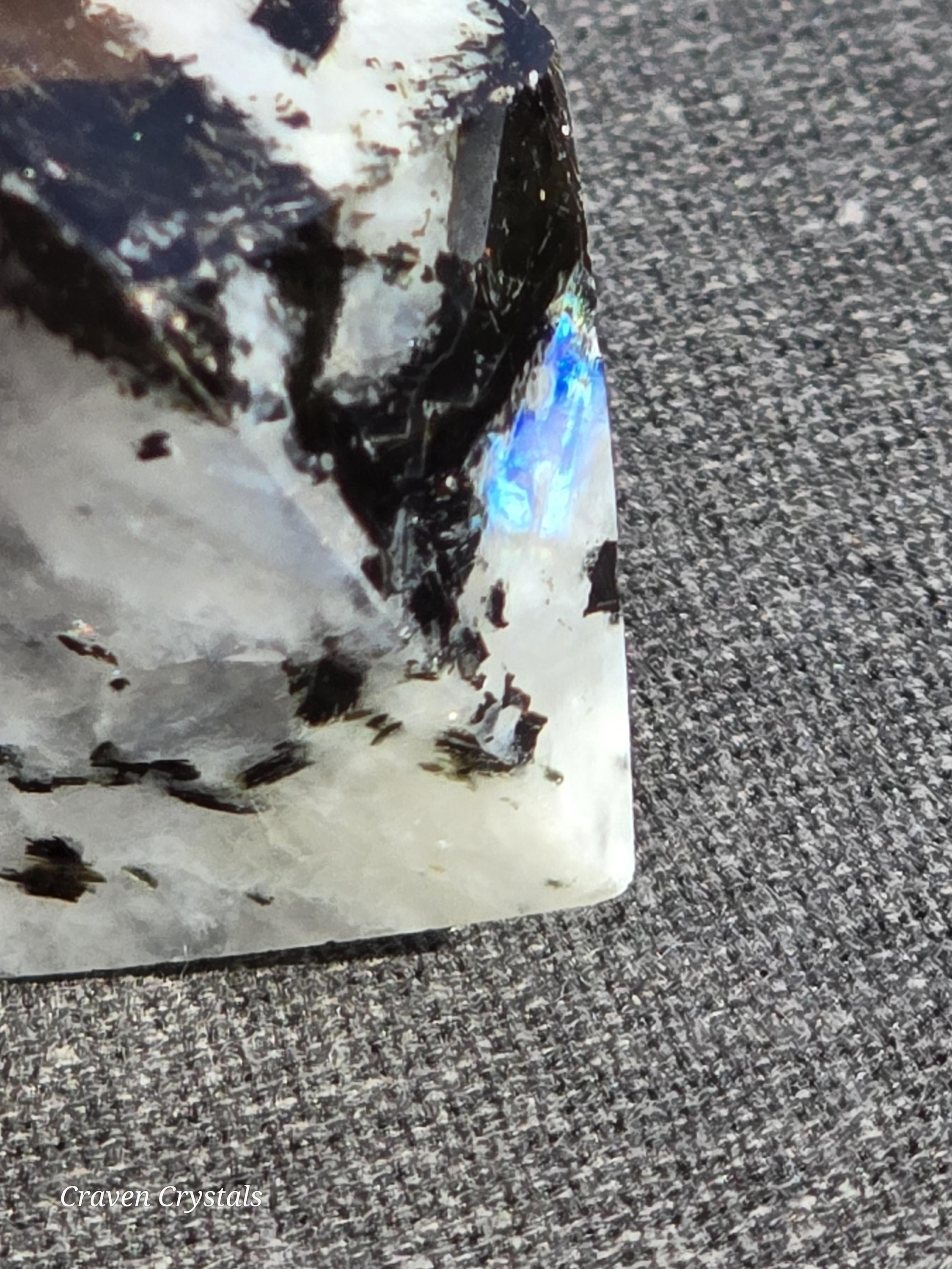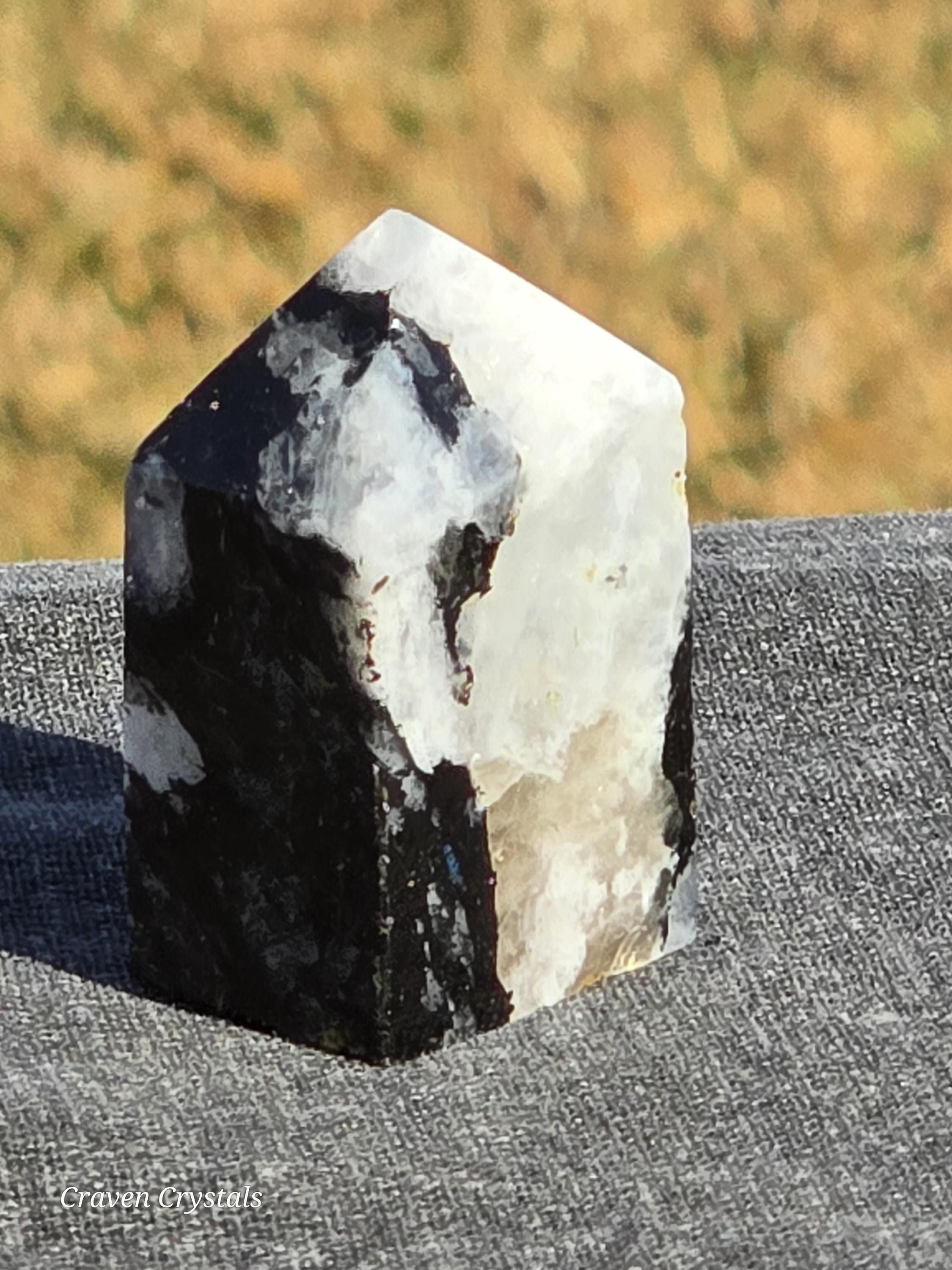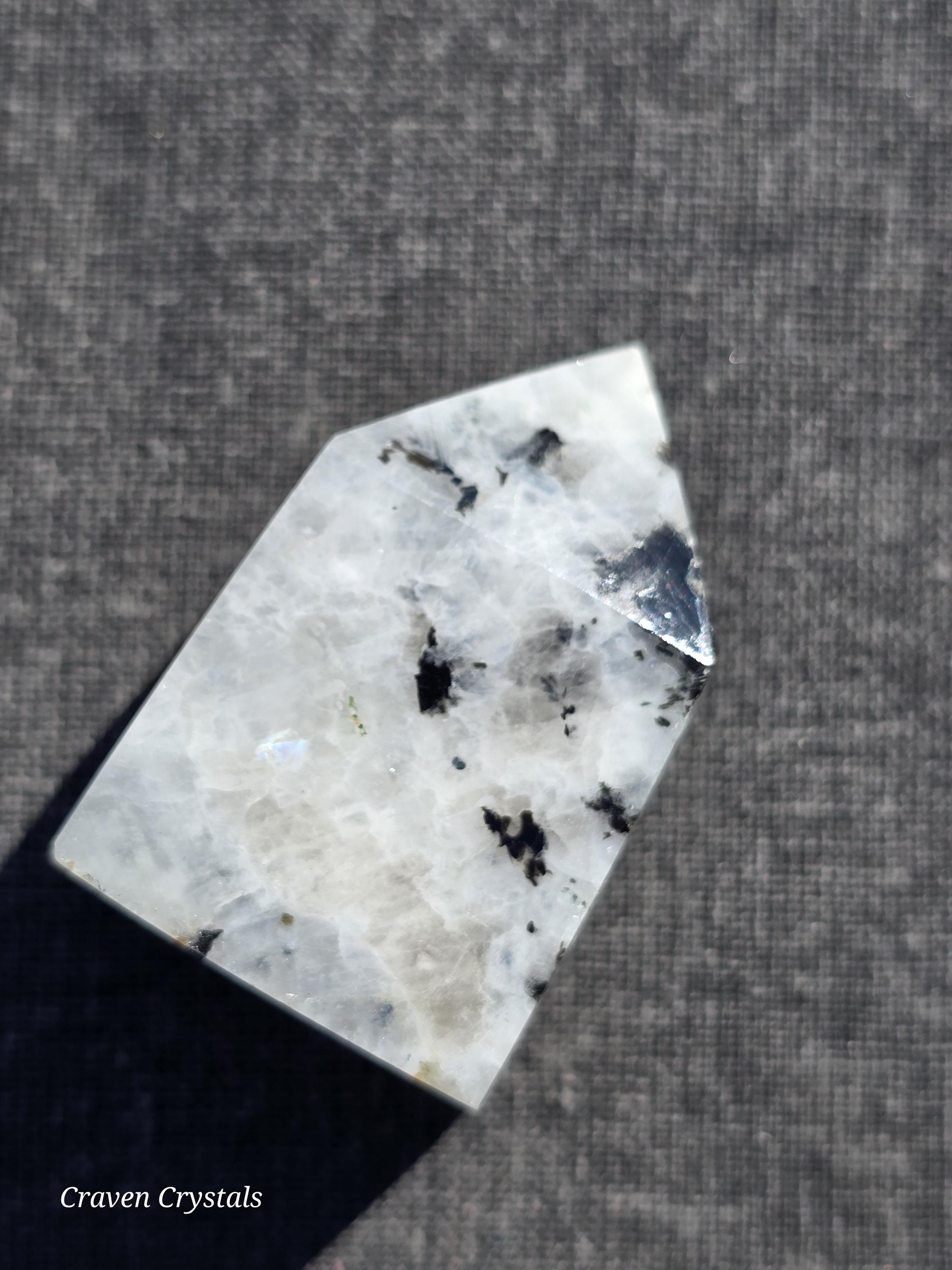 Rainbow Moonstone Crystal Towers, also known as White Labradorite with Tourmaline