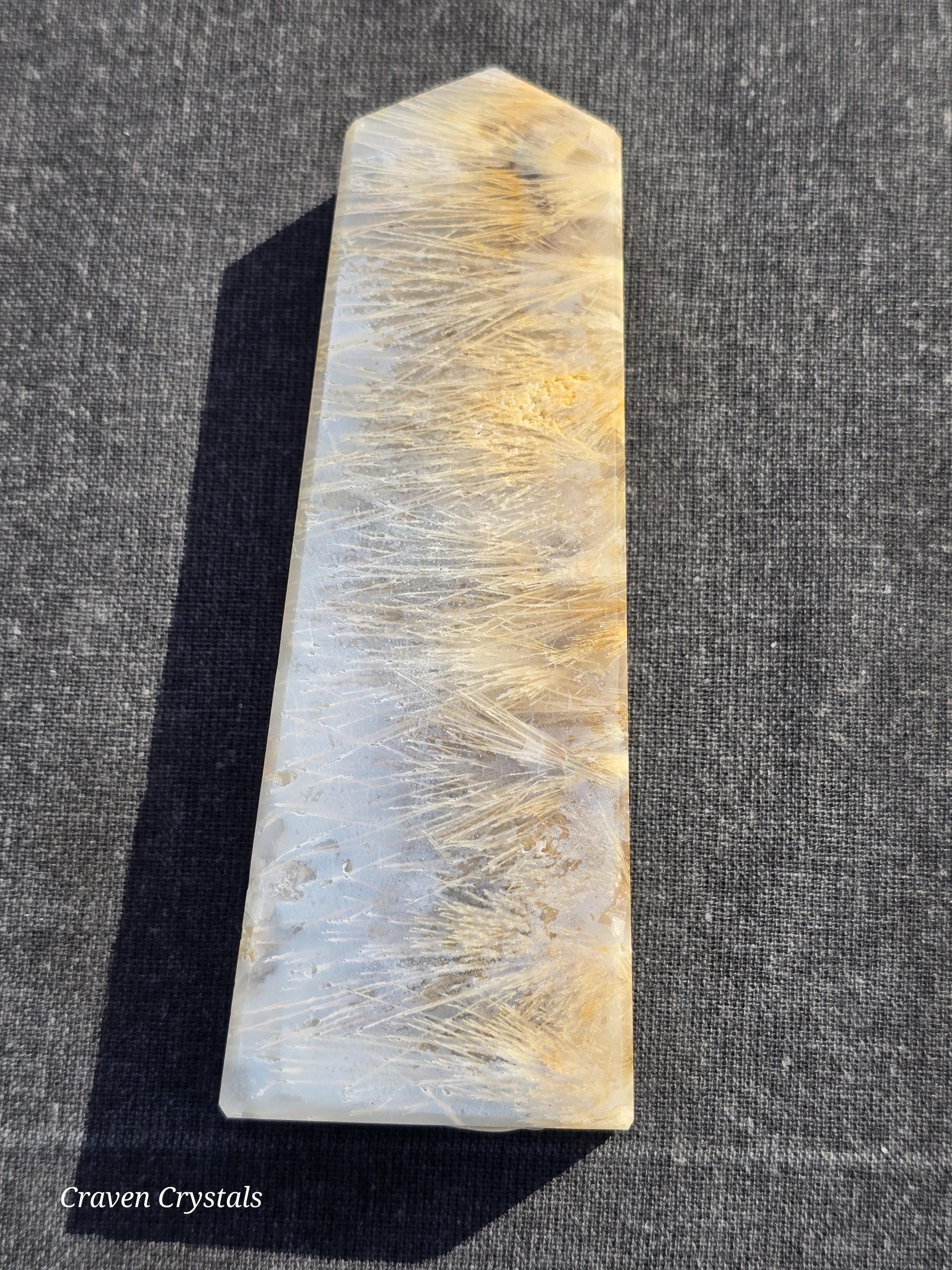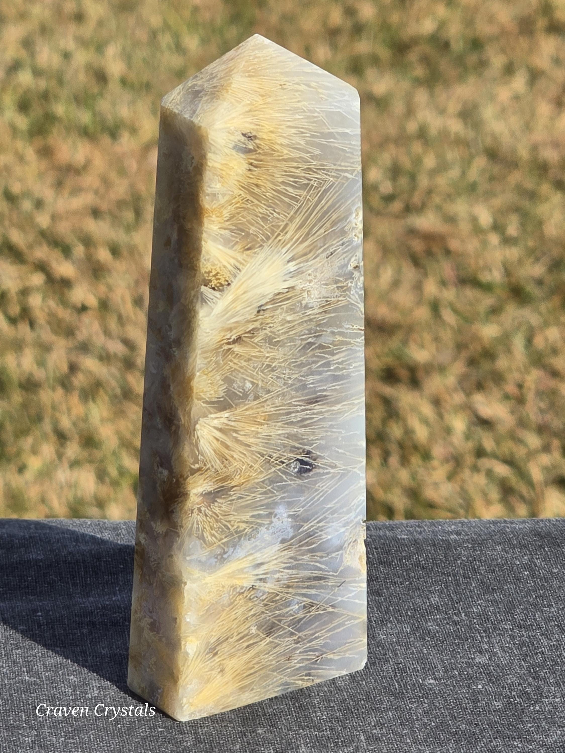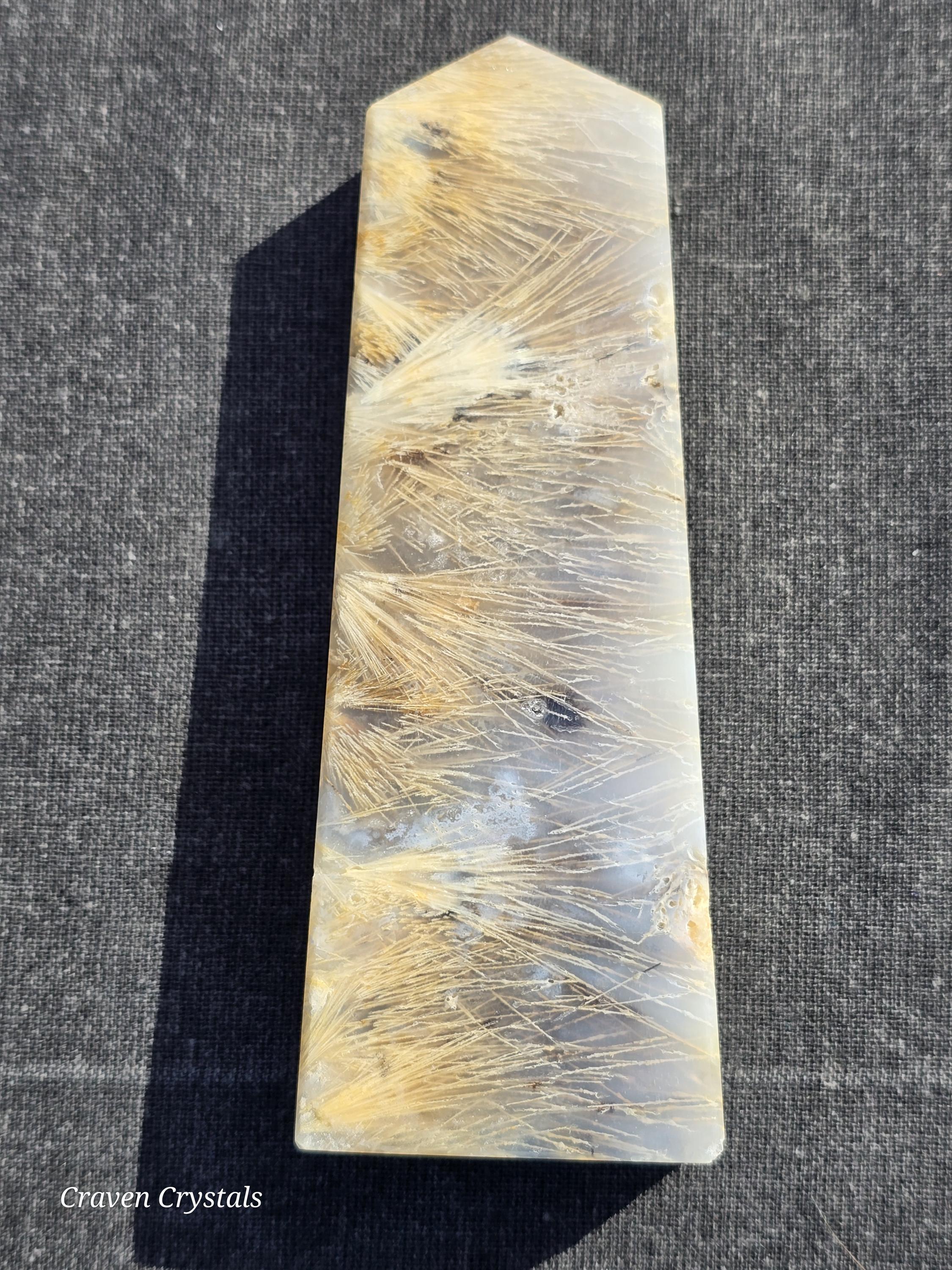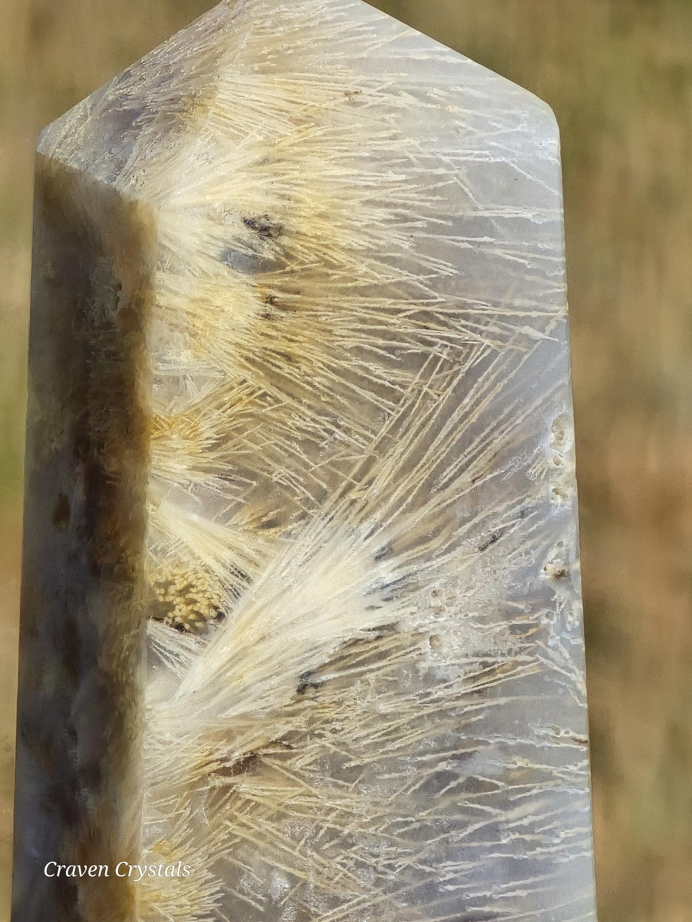 Sagenite Agate Crystal Tower, a variety of agate distinguished by its delicate, needle-like inclusions arranged in starburst, radiating, or lattice-like formations.