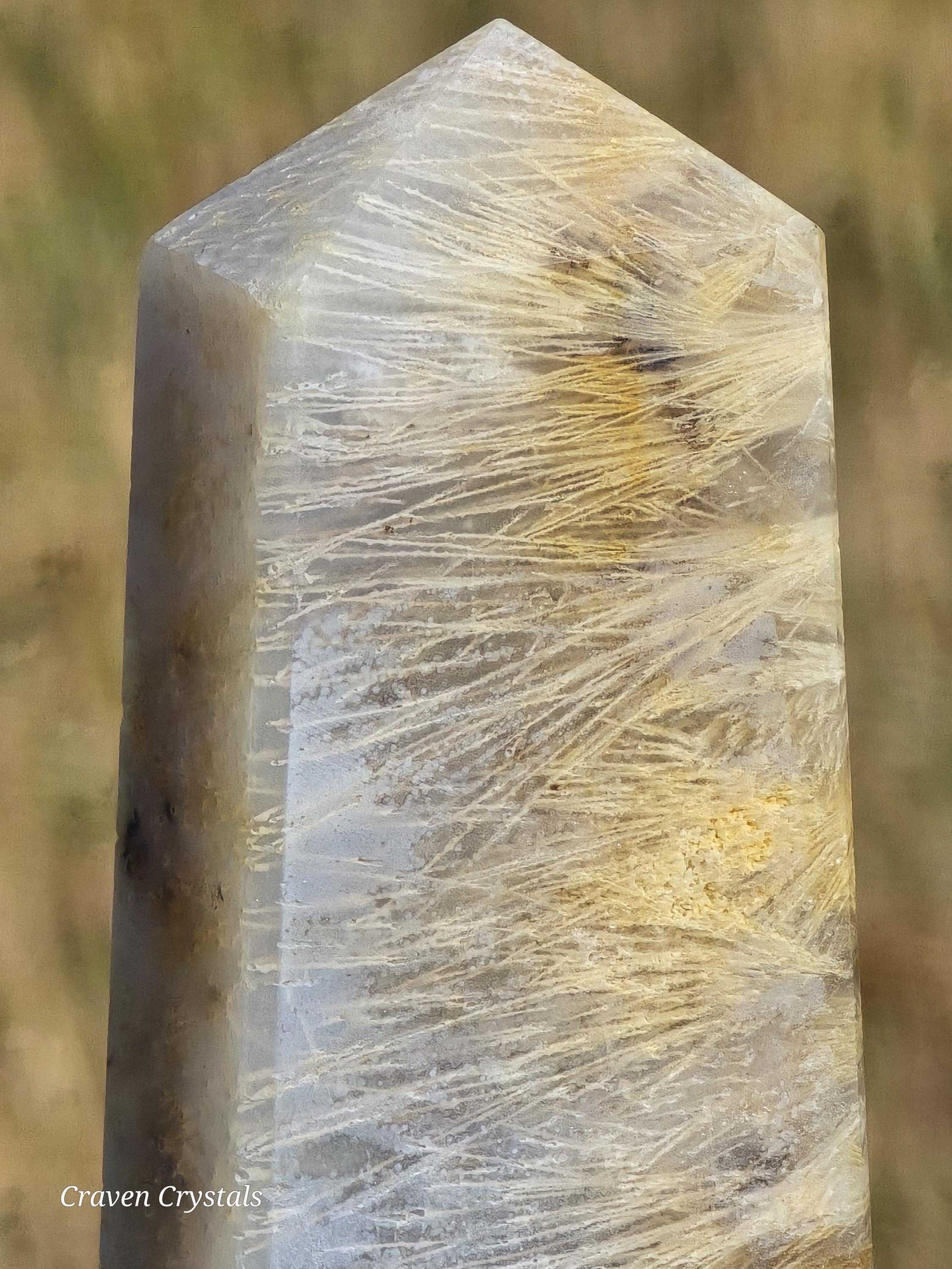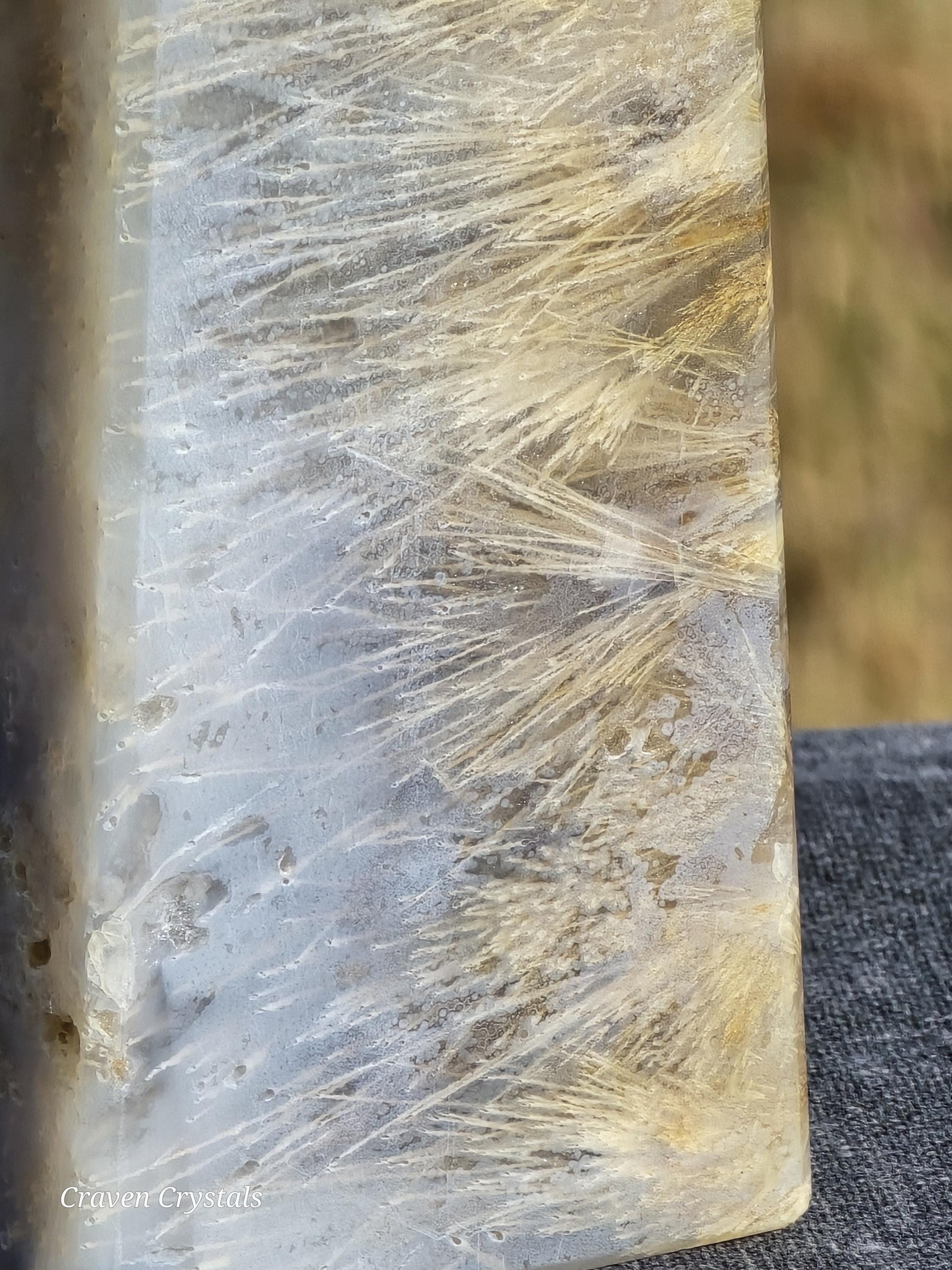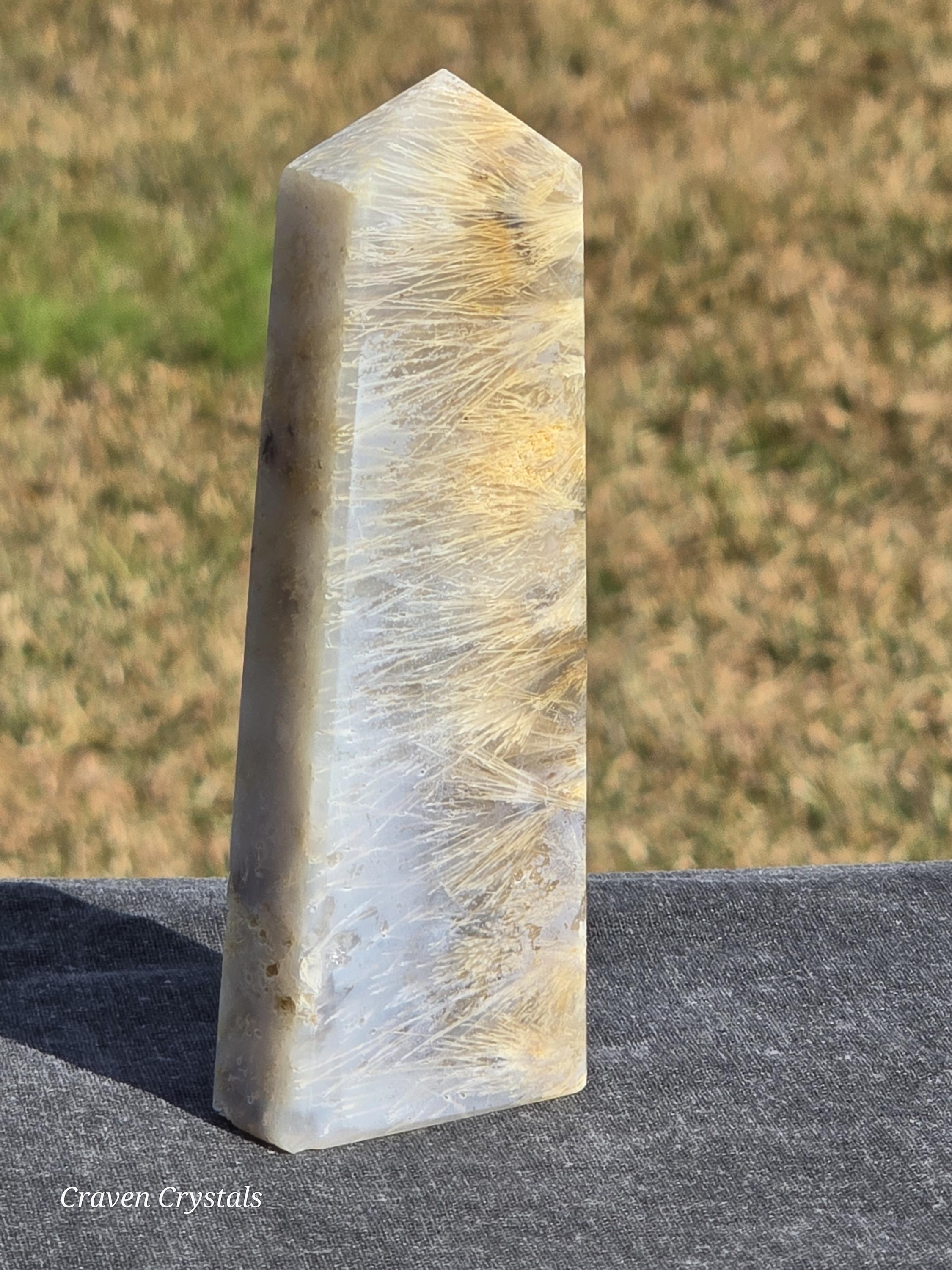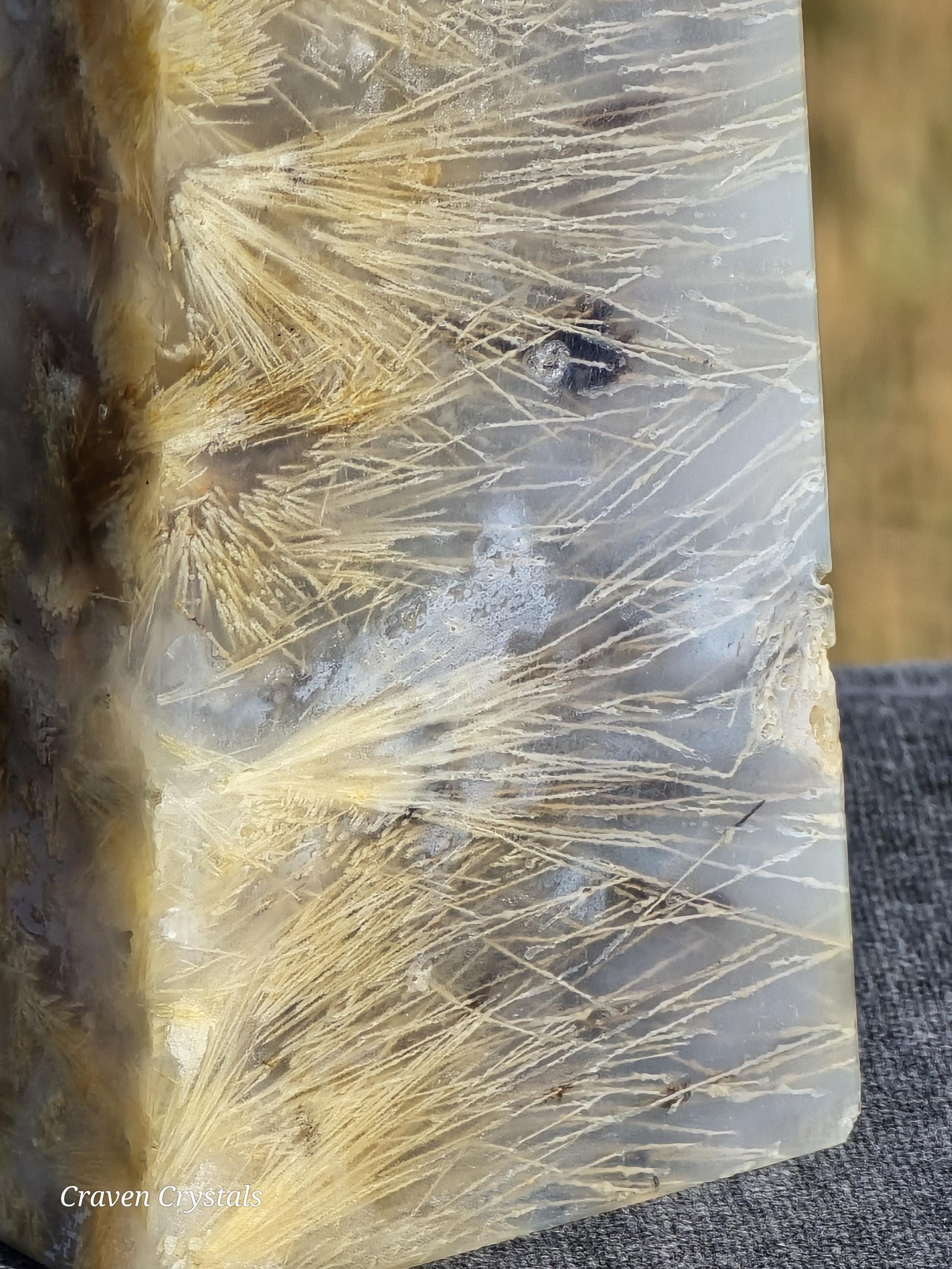Sagenite Agate Crystal Tower, a variety of agate distinguished by its delicate, needle-like inclusions arranged in starburst, radiating, or lattice-like formations.