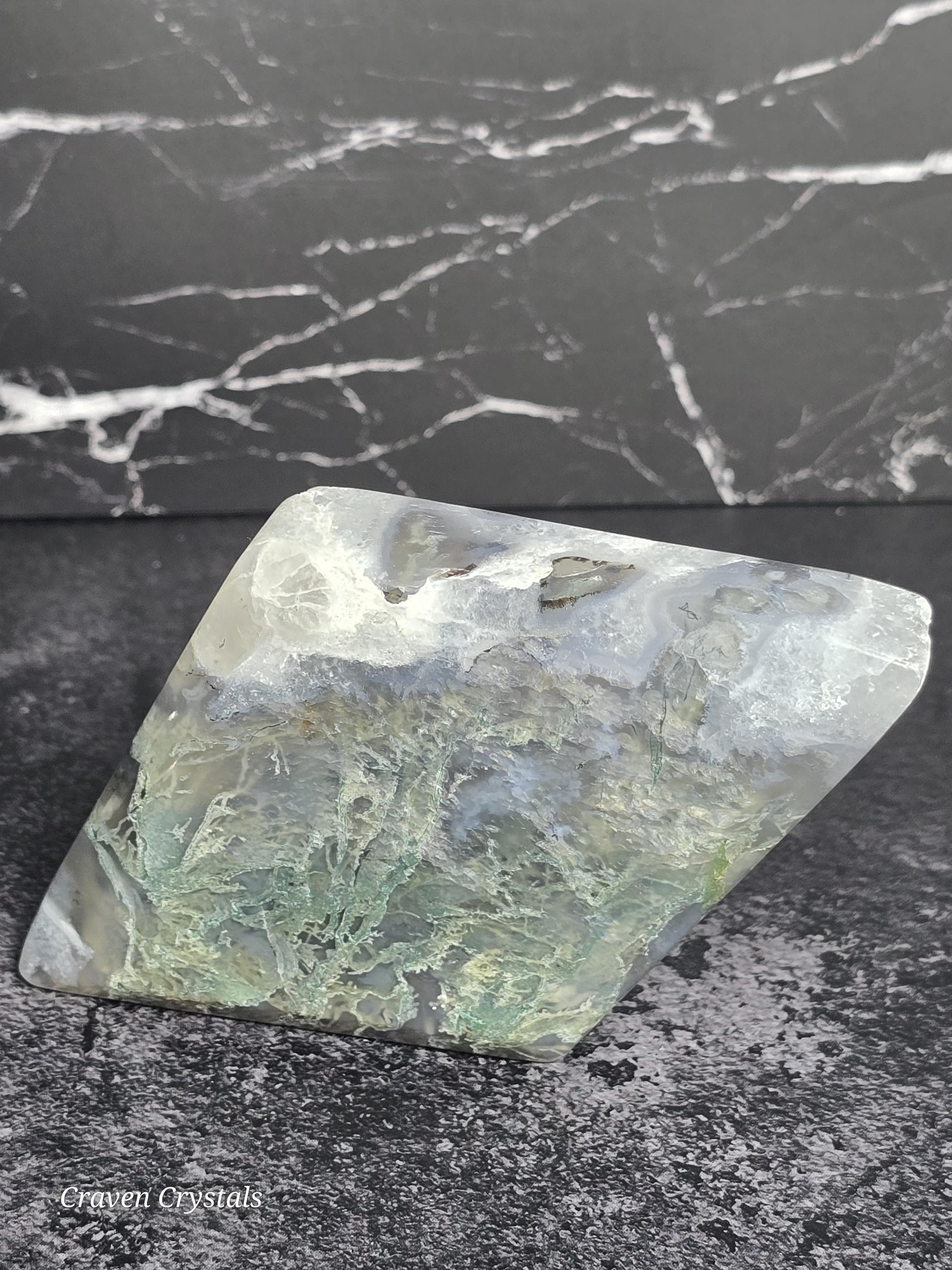 L~2.86" wide x 4.87" tall x 1.45" thick and 167g - most moss within a blue agate matrix and a corner of white agate