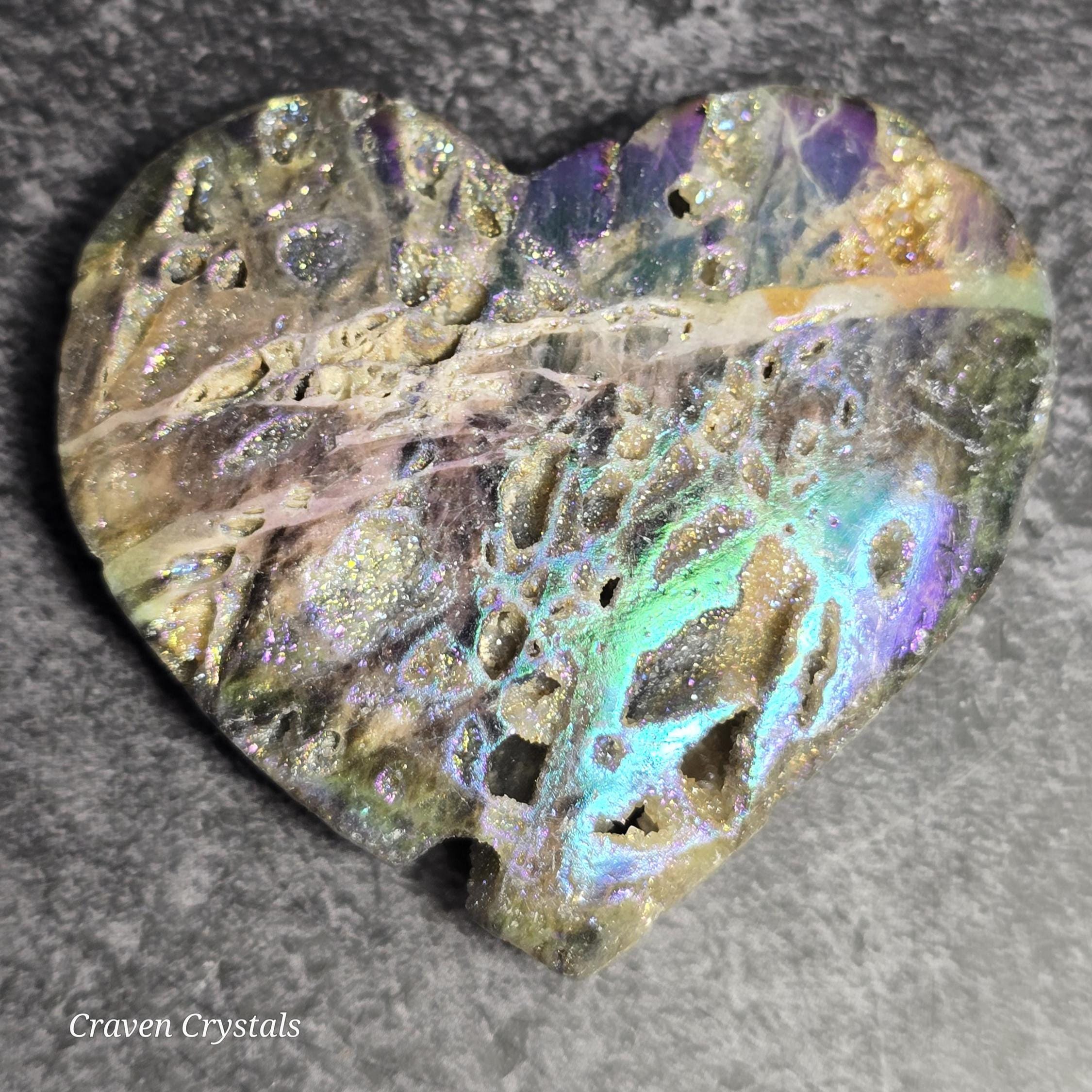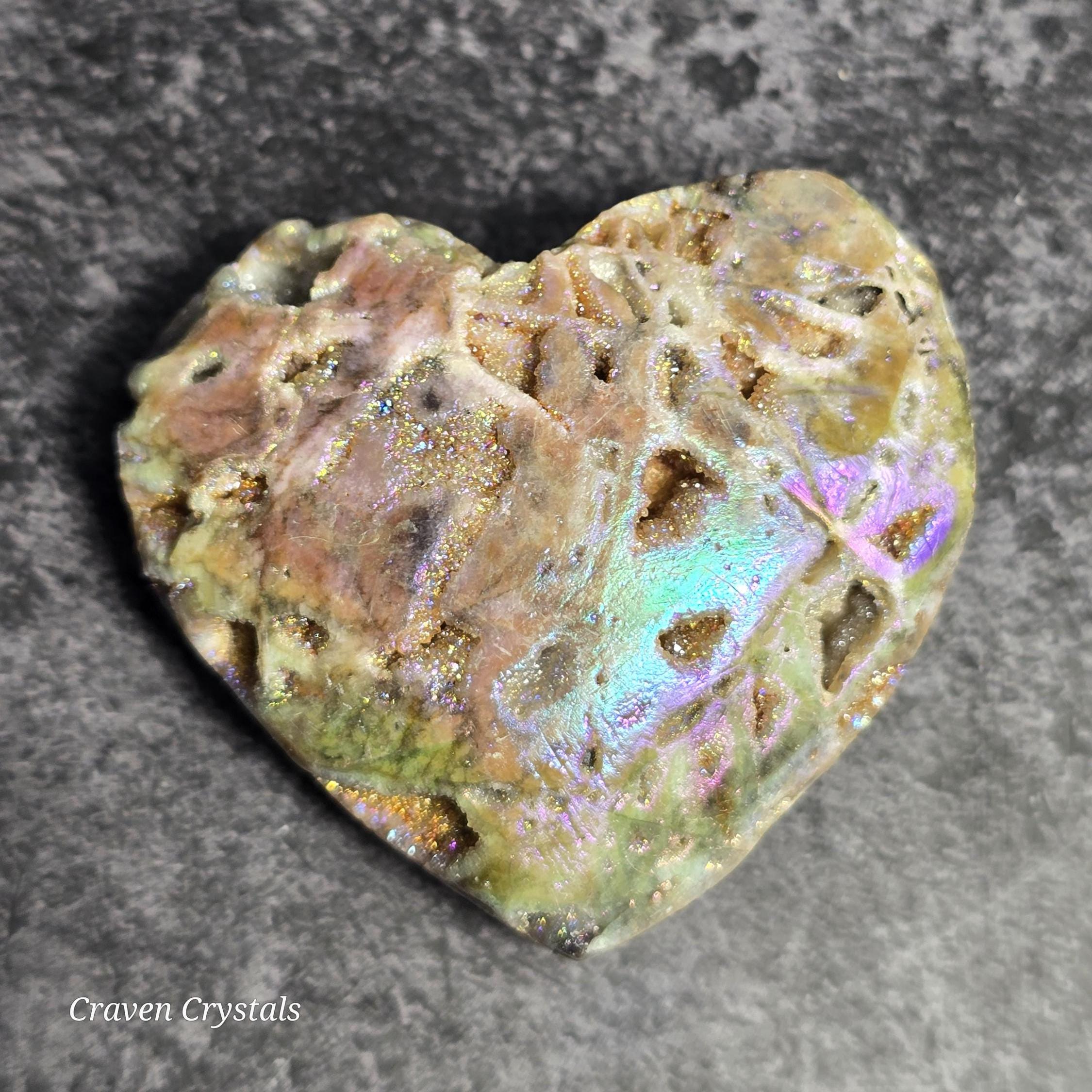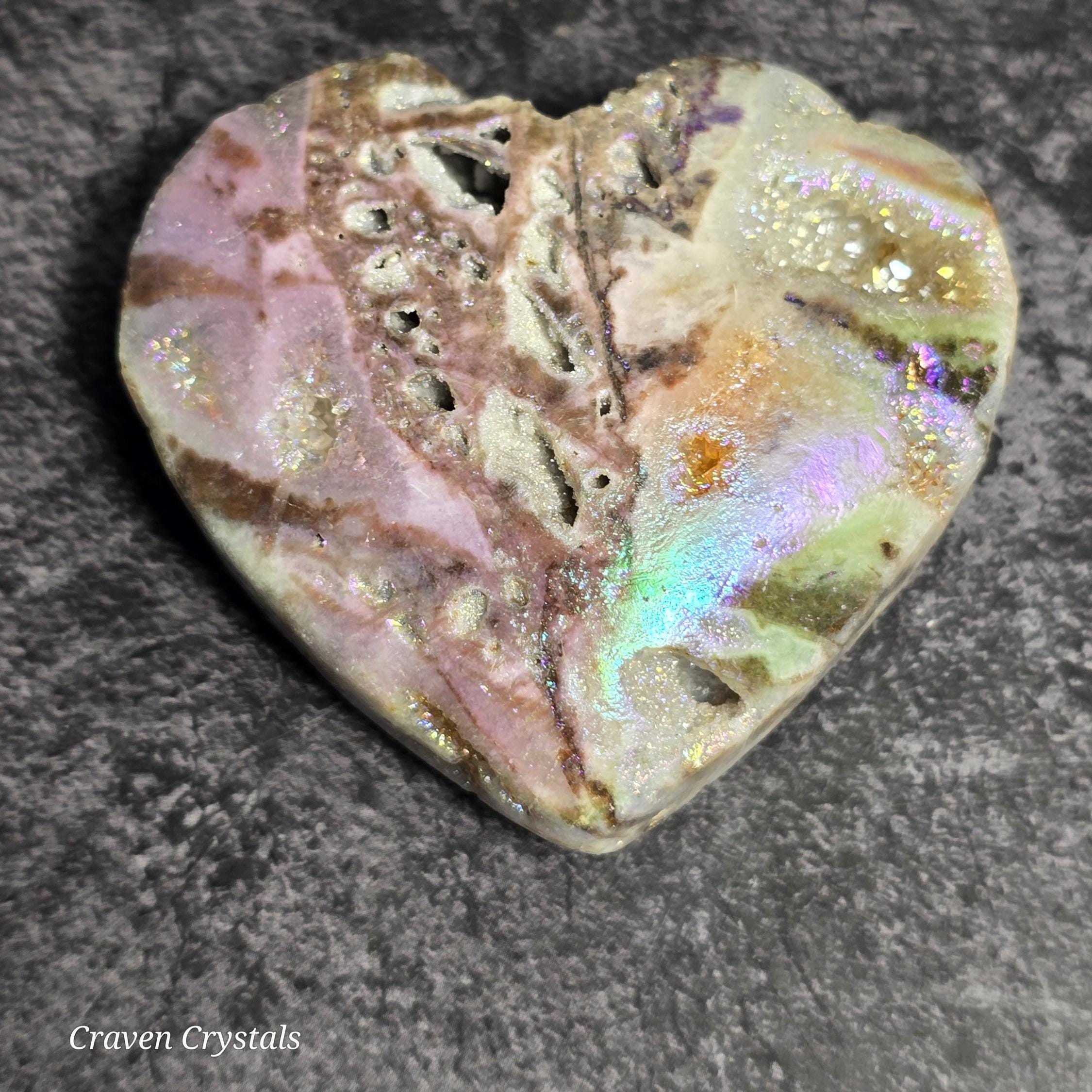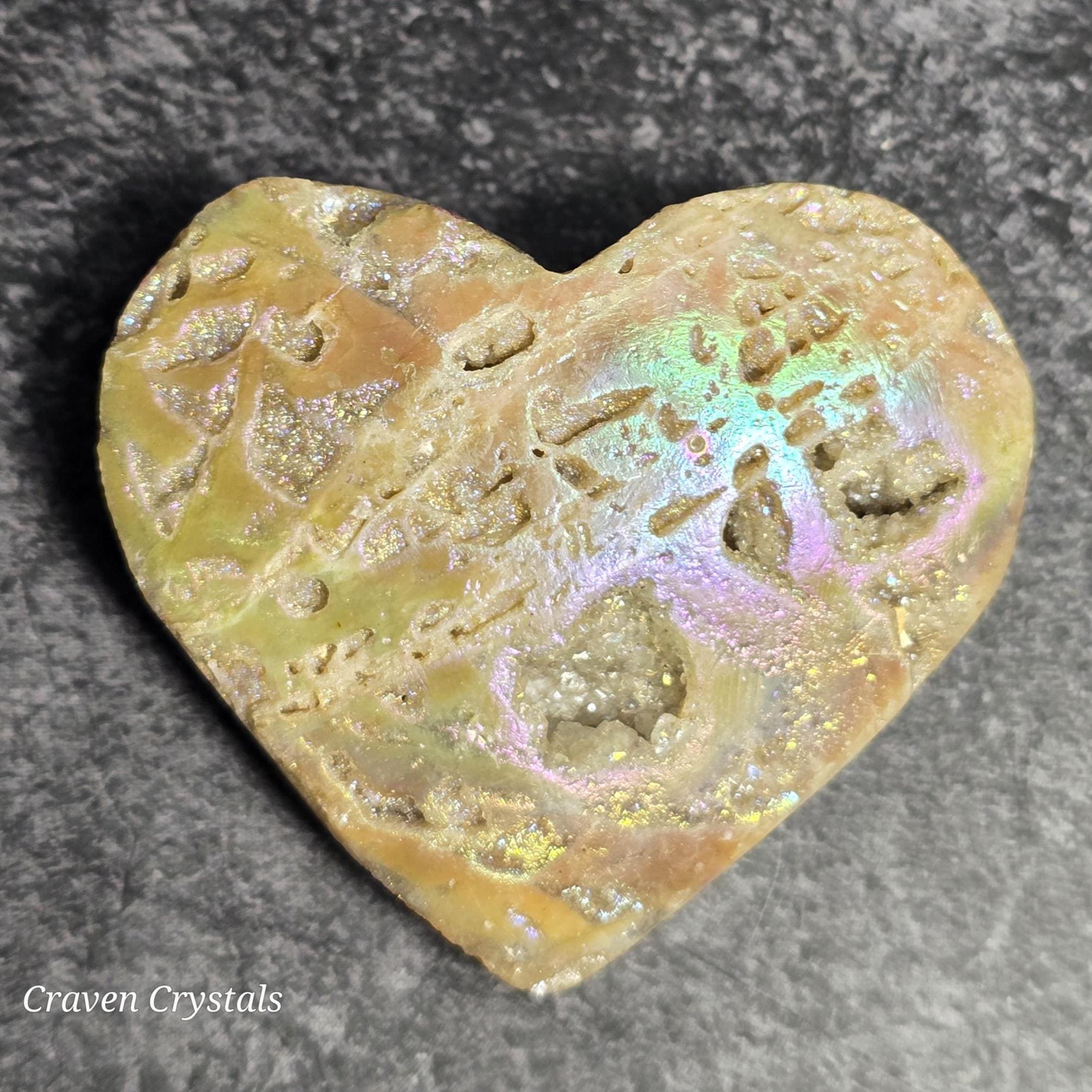 Aura Sphalerite Crystal Hearts with a rainbow of colors and sparkly drusy