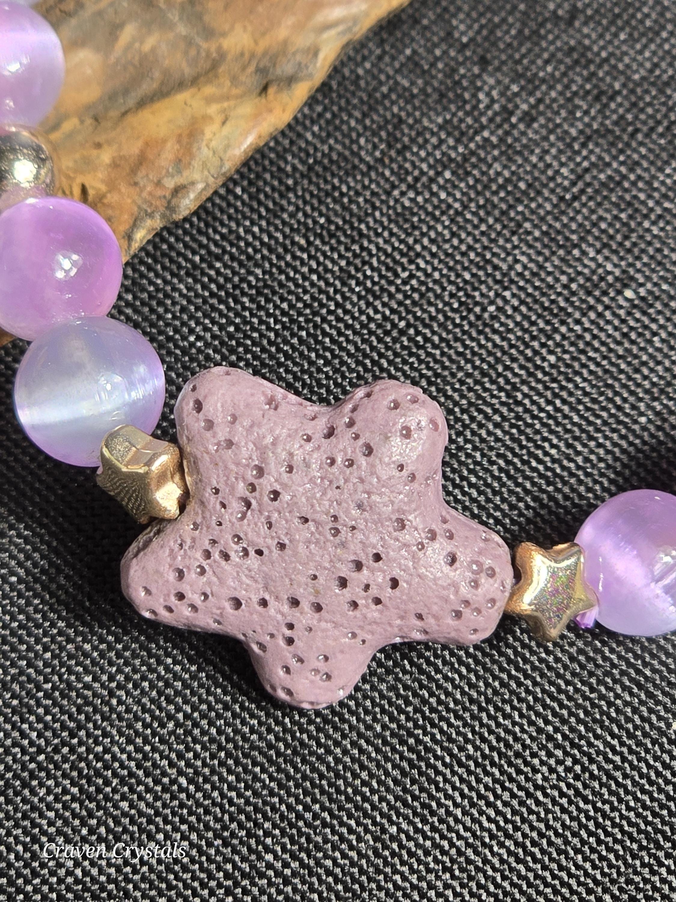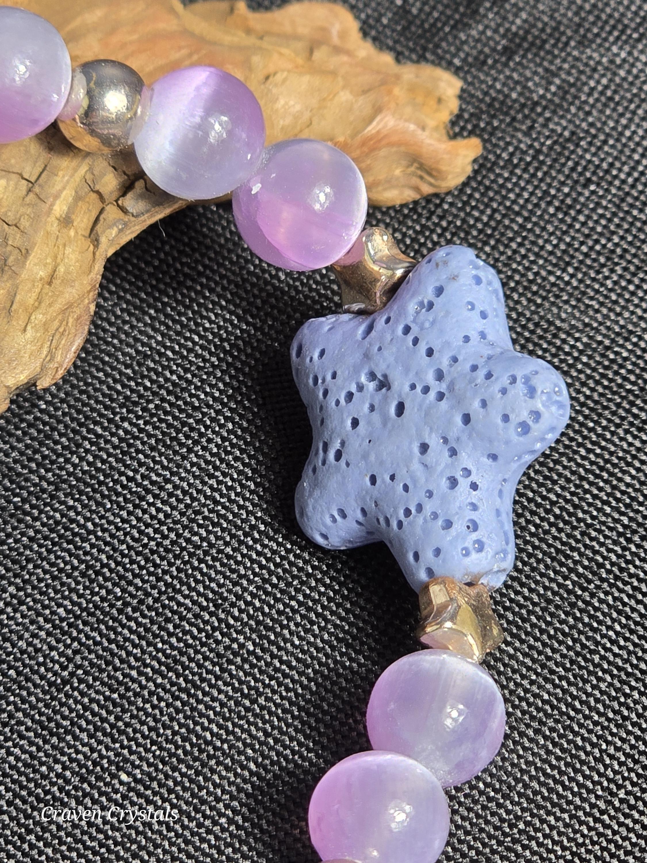 Where ocean dreams meet the night sky, “Tidepool Treasures” comes to life. This luminous bracelet is crafted with enhanced-color cat eye selenite in soft pinks, dreamy purples, and tranquil blues, each bead glowing with a silky, moonlit shimmer that shifts like starlight dancing on water. Golden star beads add warmth and radiance, while star-shaped enhanced-color lava stone sea stars ground the piece with an earthy, elemental contrast — a reminder that even the most magical things are shaped by the natural world. The blend of airy selenite and volcanic stone creates a beautiful balance of light and strength, calm and resilience. This bracelet feels like discovering something special tucked away in a quiet tidepool — a small, radiant reminder of wonder waiting to be found.