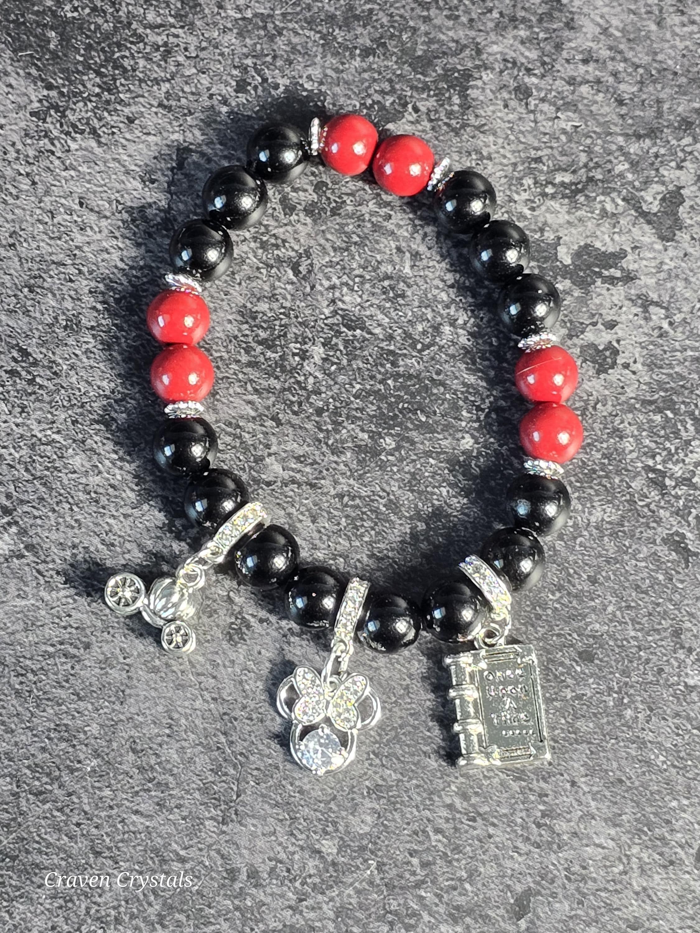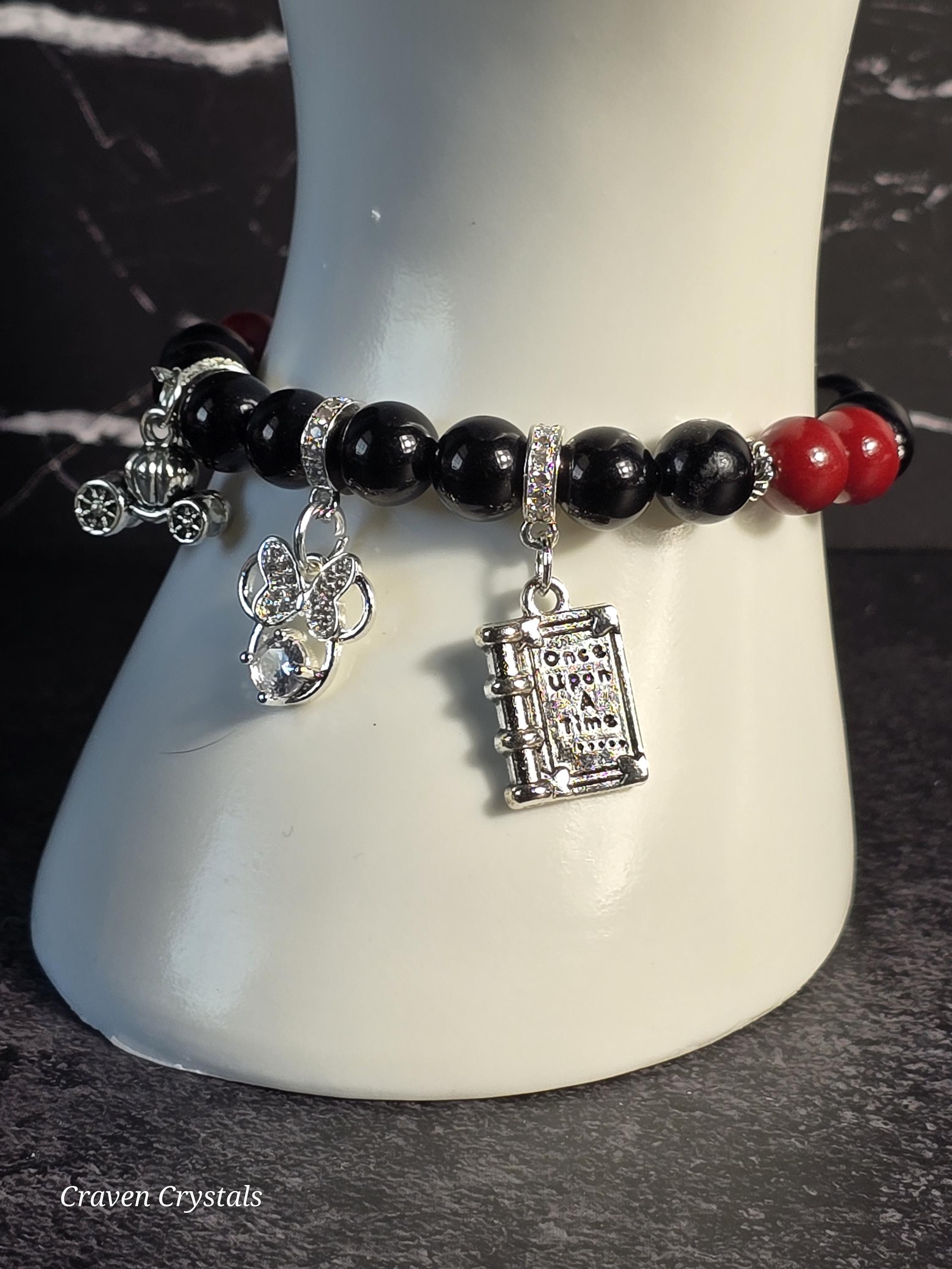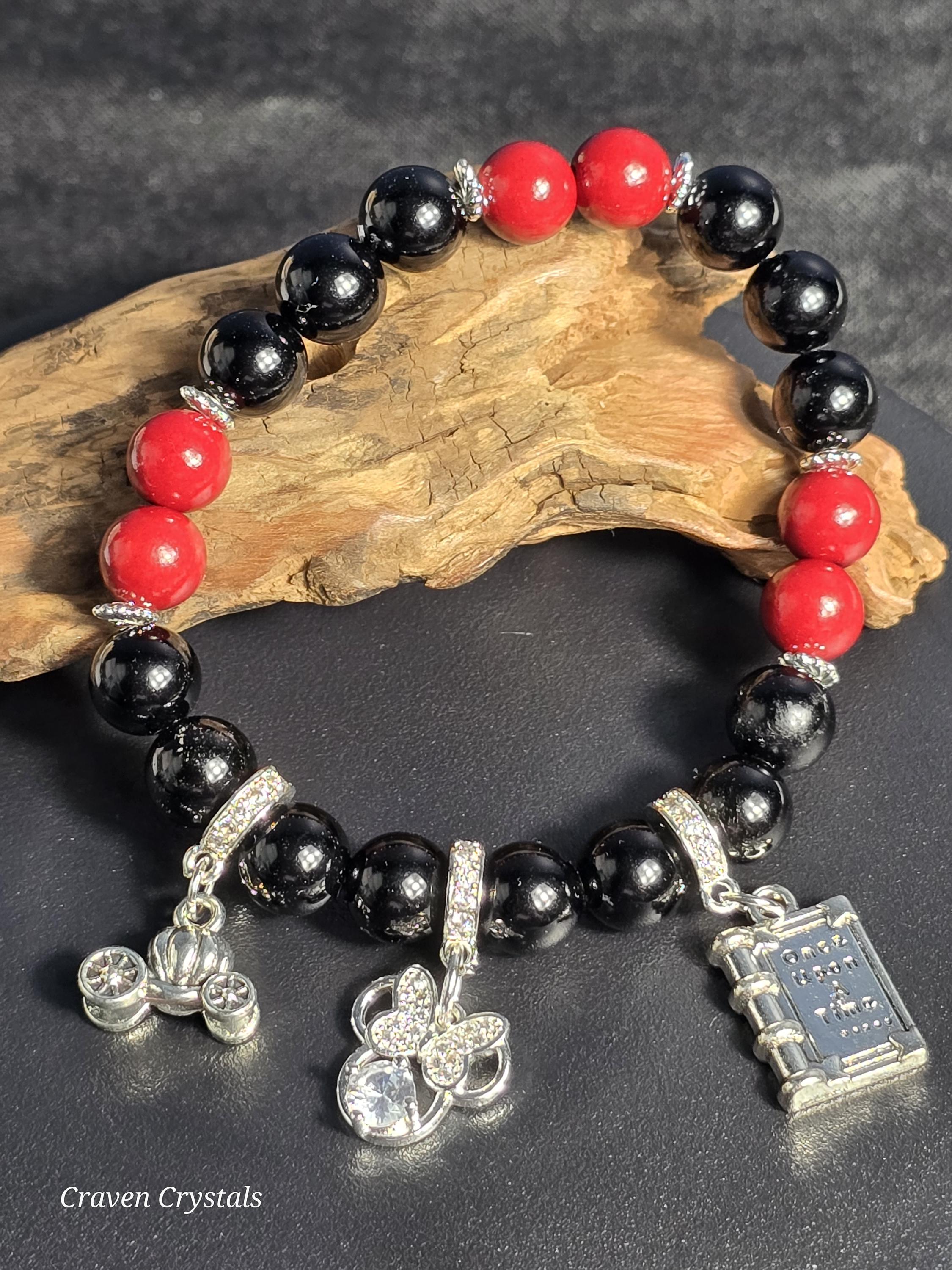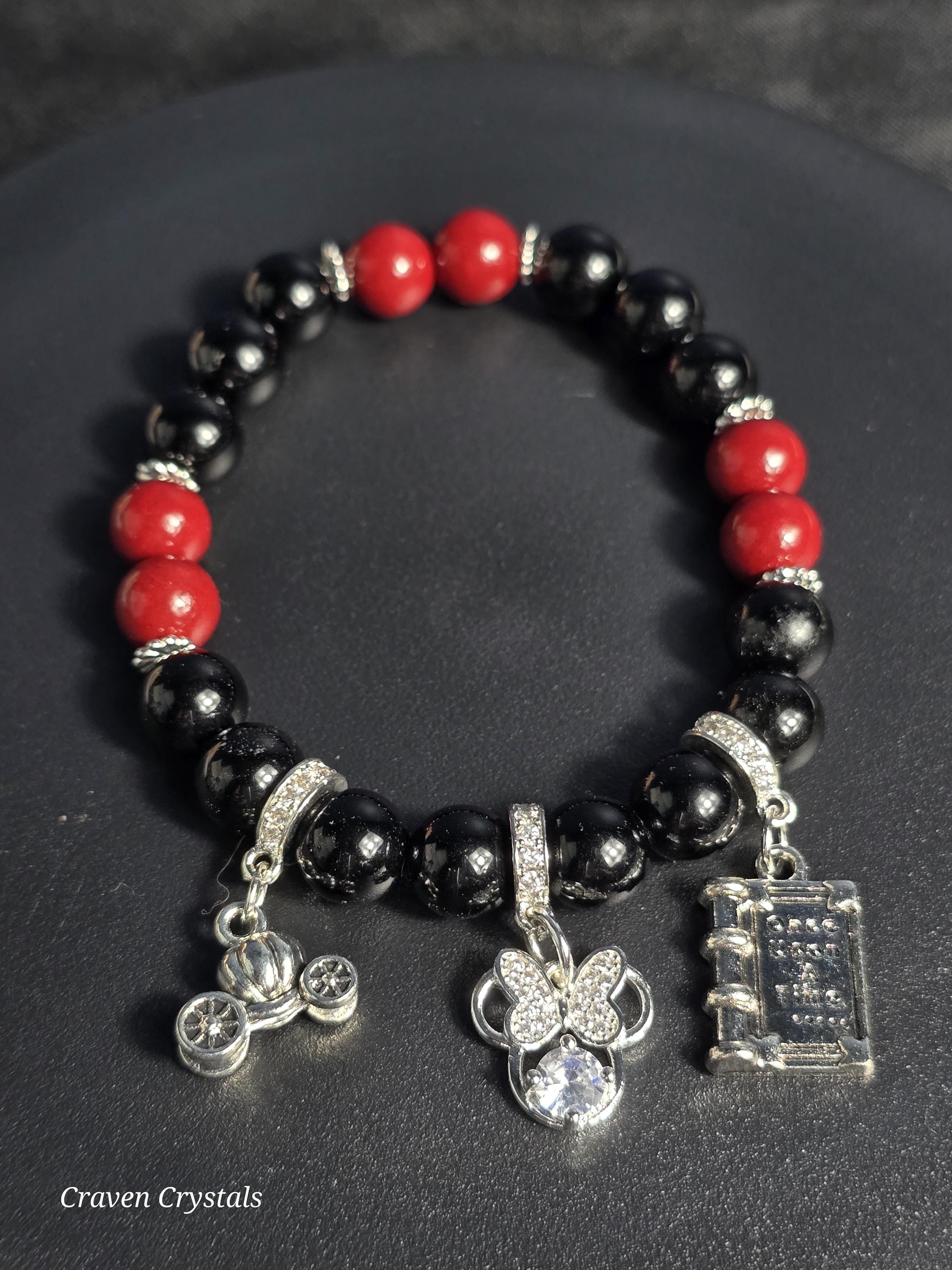 Every fairytale begins with a whisper of magic… “Once Upon a Time” is a bracelet created for dreamers, storytellers, and those who never outgrew believing. Crafted with rich red cinnabar and deep black obsidian, this piece blends passion, protection, and timeless enchantment, all while giving honor to a certain mouse we all love. Elegant silver accents add moonlit contrast, while three charming story-inspired charms bring the narrative to life: a “Once Upon a Time” storybook, a beloved Minnie Mouse charm representing joy and nostalgia, and a sparkling pumpkin carriage symbolizing transformation, wishes, and happily-ever-after.