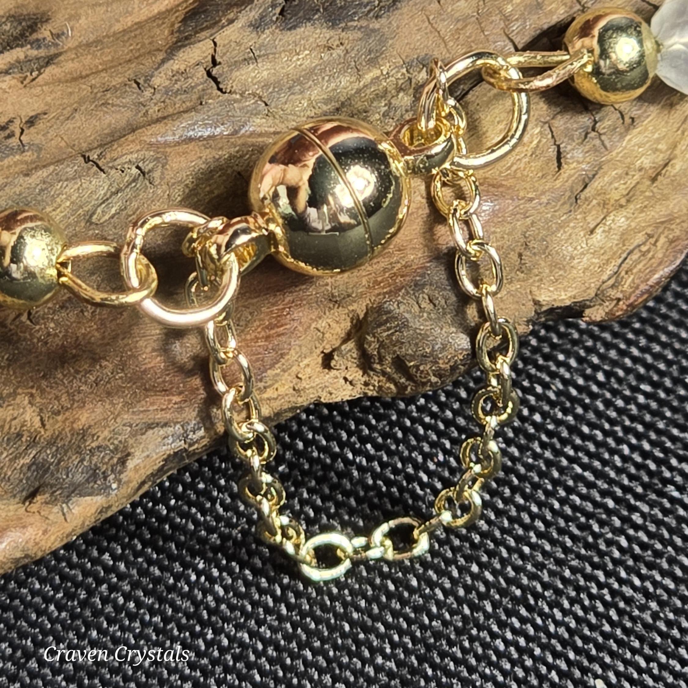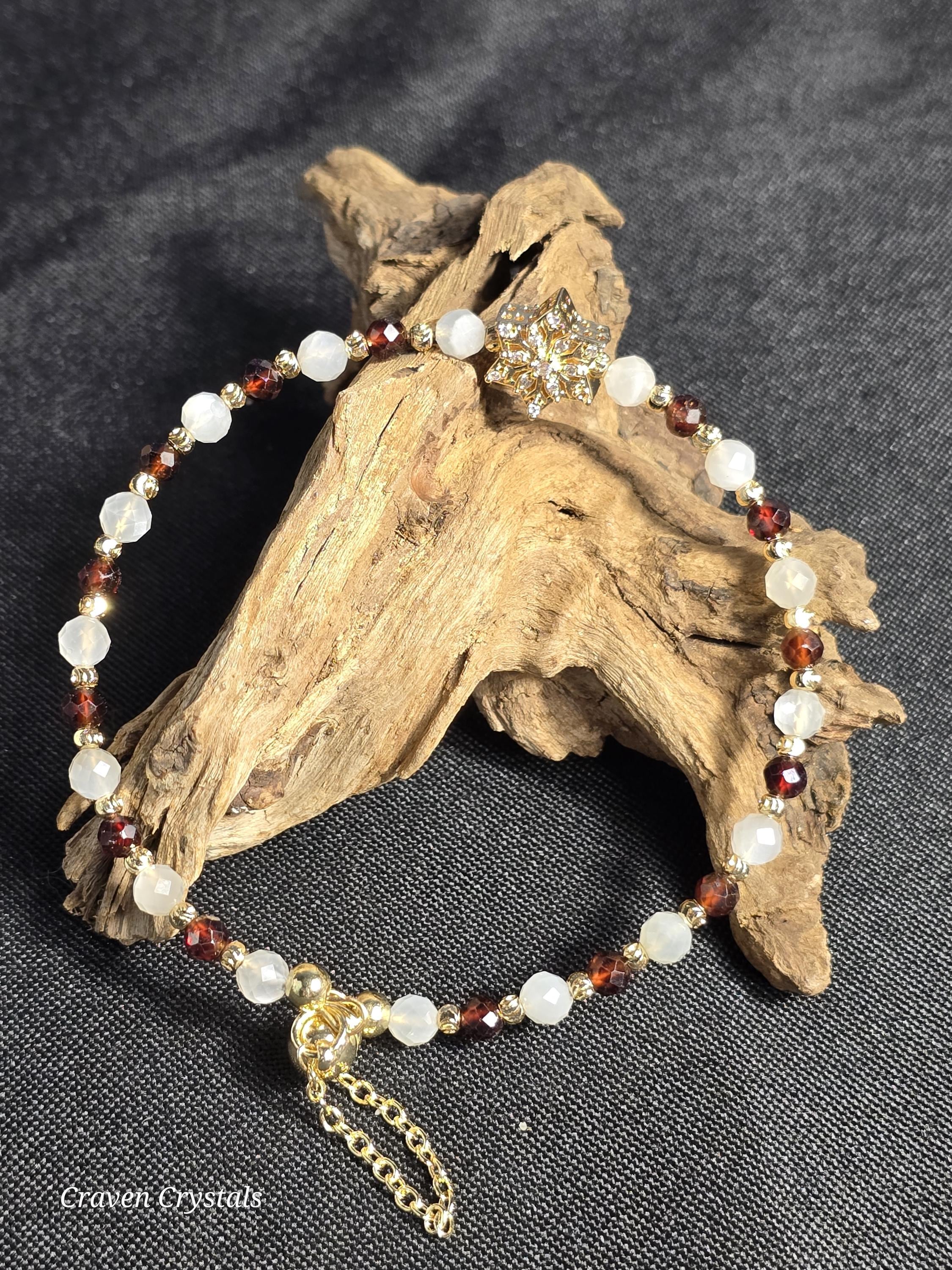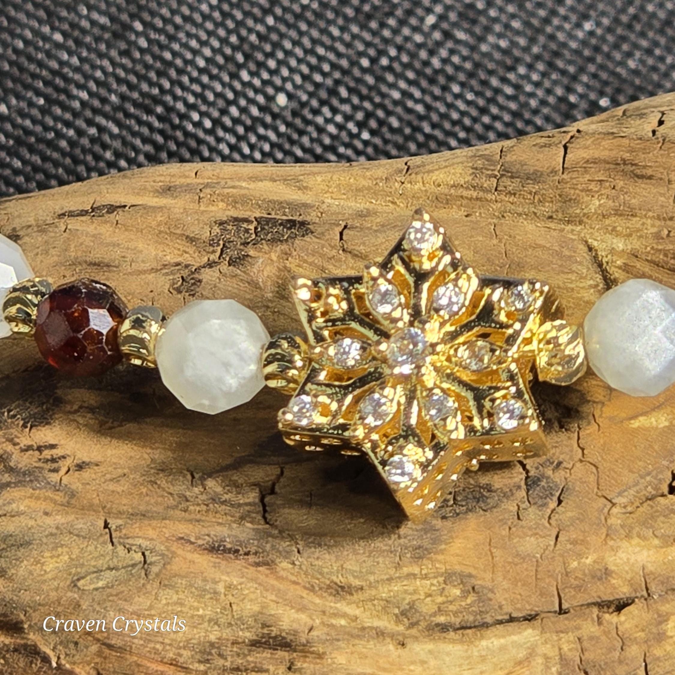 Frosted Berries pairs rich Garnet with glowing Moonstone, offering a warm contrast inspired by winter berries against fresh snow. Golden spacers add cozy radiance, and the matching snowflake centerpiece ties the design to the quiet beauty of winter. A magnetic clasp ensures both comfort and ease of wear.