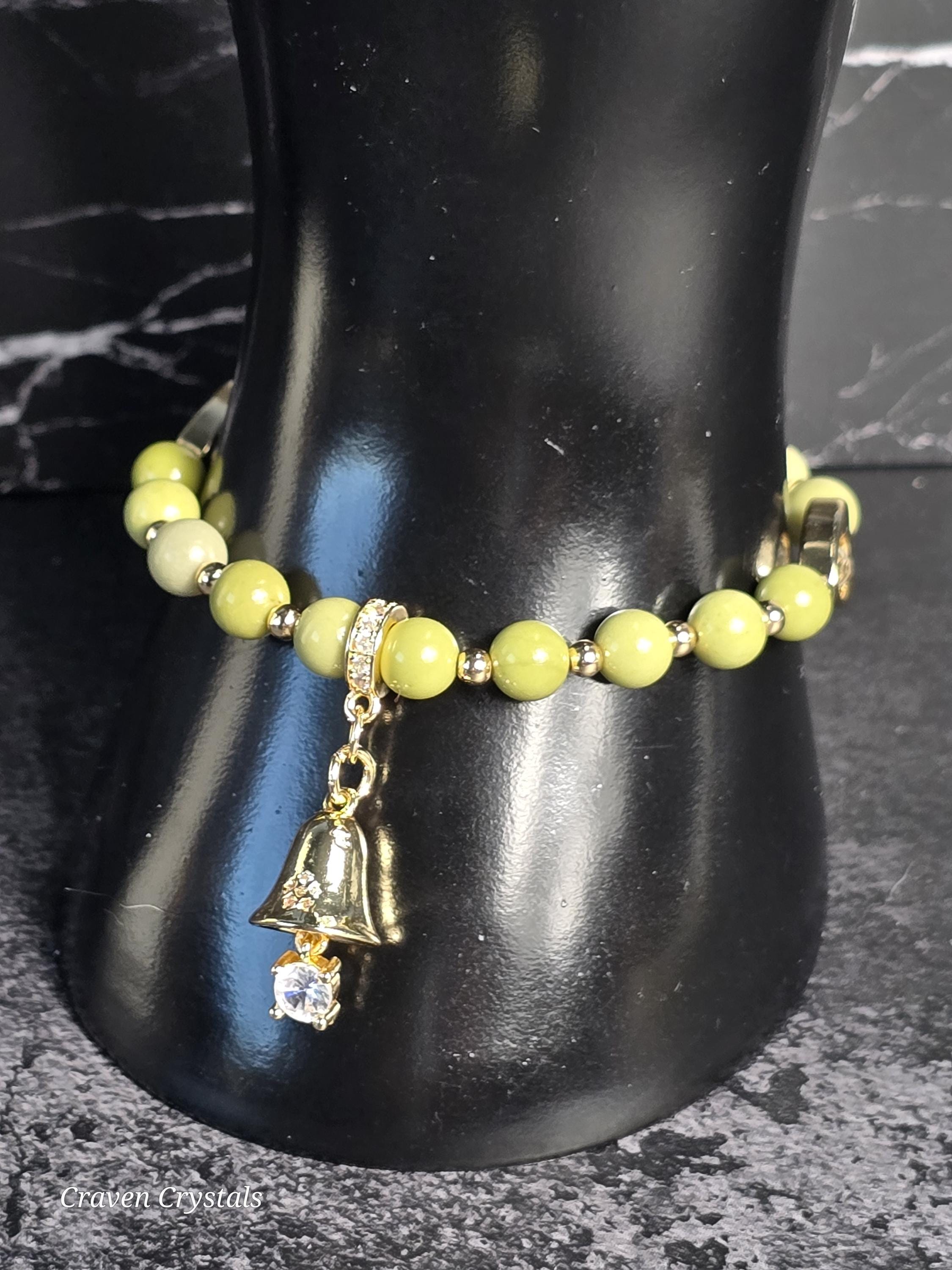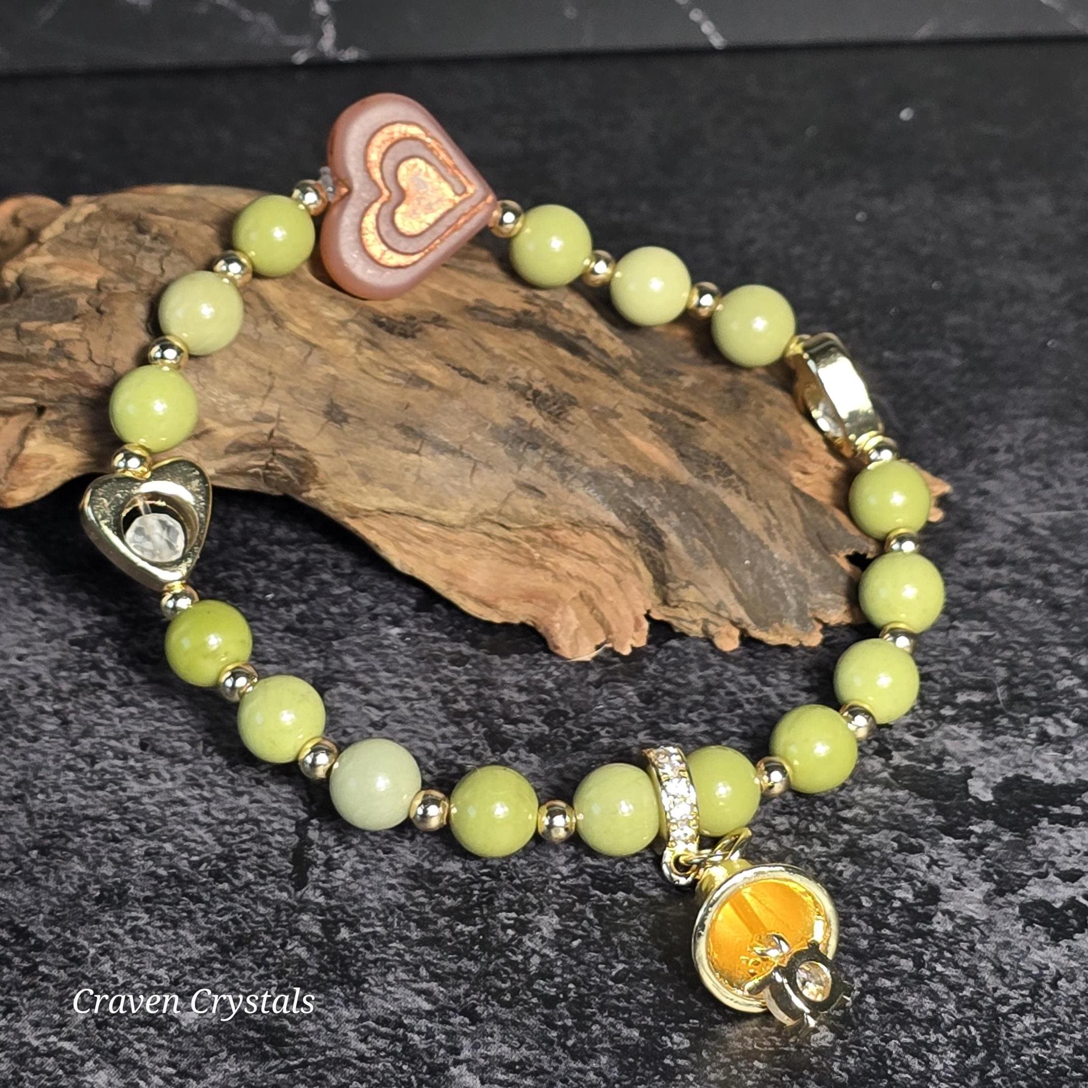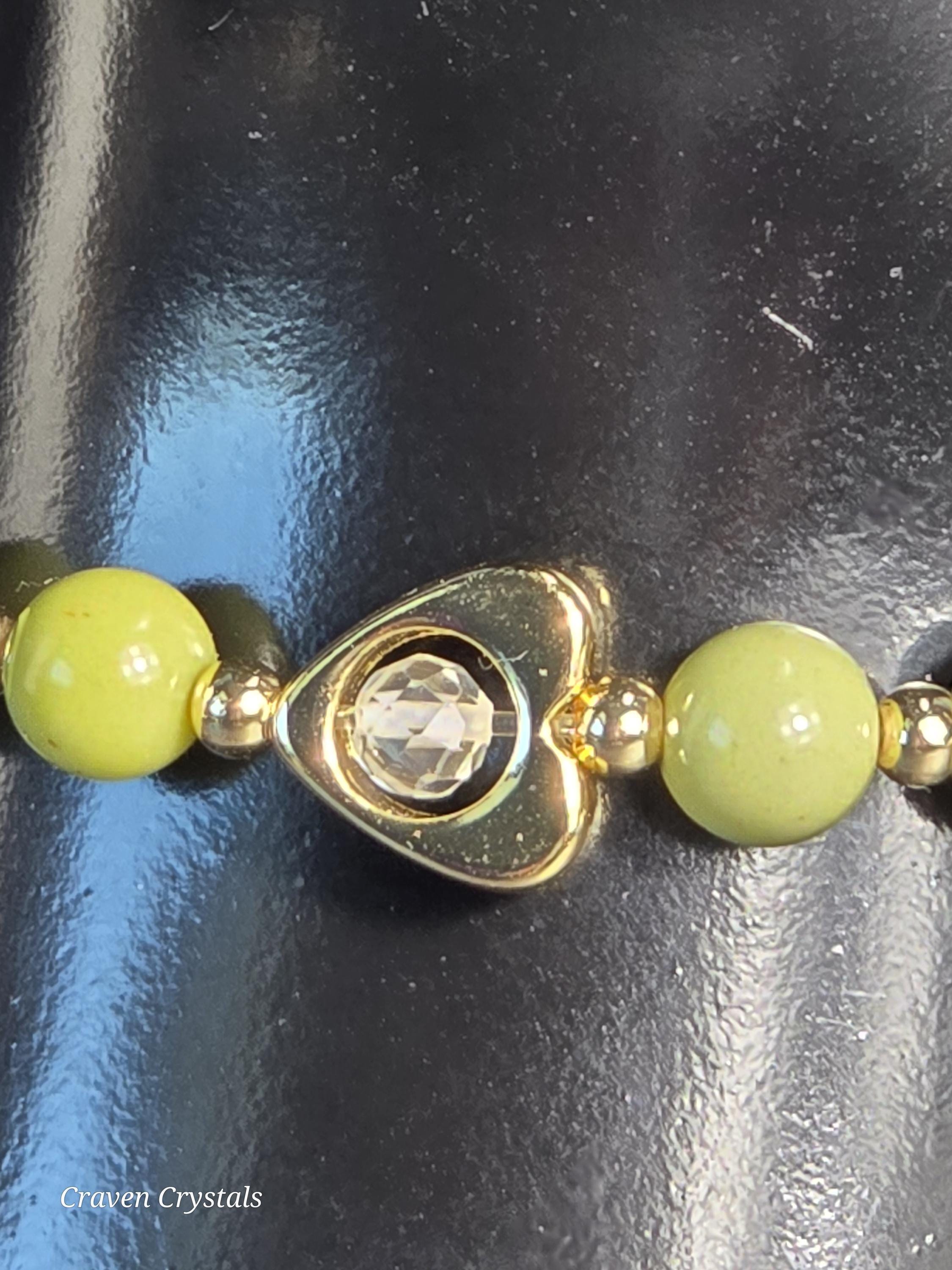 Each Craven Crystals bracelet is thoughtfully handcrafted using natural stones, elastic cord, and carefully selected metals. To preserve the beauty and integrity of your piece, handle it with care and avoid excessive stretching. Bracelets should be rolled on and off the wrist rather than pulled, especially those made with elastic. It is recommended to remove your bracelet before sleeping, bathing, swimming, exercising, or performing household tasks, as moisture, chemicals, and impact can weaken elastic, dull metals, and damage stones. Sterling silver and mixed metal components may naturally develop a soft patina or tarnish over time. This is a normal process and can be minimized by keeping your jewelry dry and storing it in a soft pouch or jewelry box when not in use. A gentle wipe with a soft, dry cloth after wearing helps remove natural oils and maintain shine. Avoid submerging bracelets in water or using chemical or ultrasonic cleaners. For sterling silver accents only, a silver polishing cloth may be used. Delicate beads, glass, shell, charms, and detailed focal pieces should be protected from hard knocks or pressure, as natural and specialty materials can chip or crack if dropped. Crystals, stones, and shells are natural materials and may display unique variations in color, texture, or pattern. These characteristics are part of what makes each Craven Crystals piece one of a kind. With mindful care, your bracelet will continue to bring beauty, meaning, and enjoyment for years to come.
