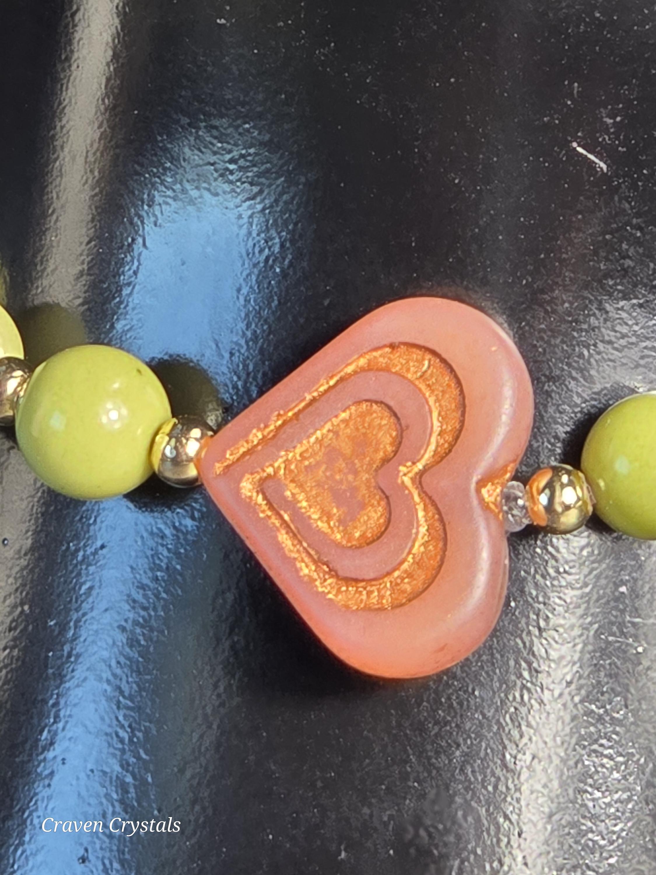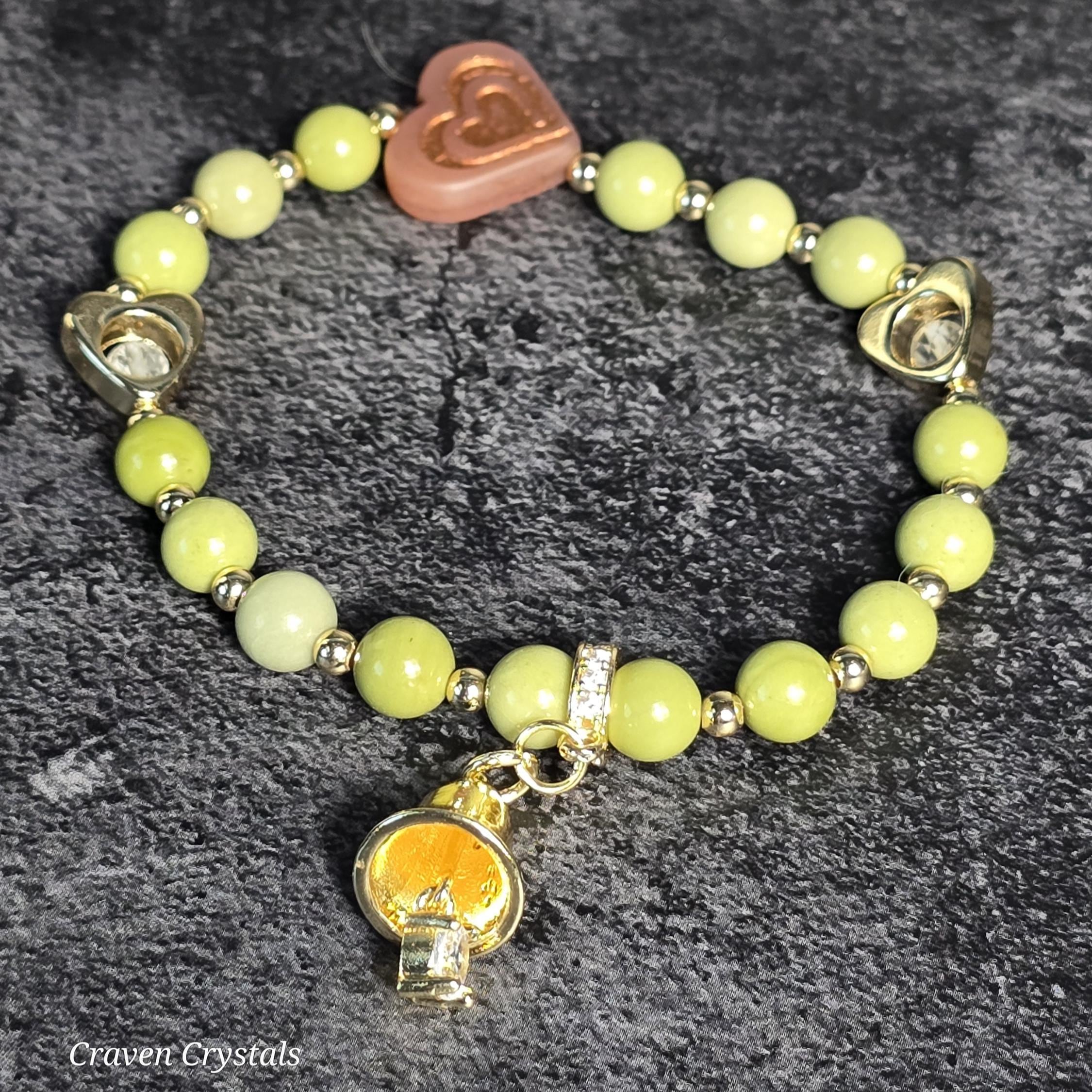 Even the grinchiest hearts can grow… “Grinchy Glow-Up” is a holiday-inspired bracelet celebrating transformation, warmth, and a little extra Christmas magic. Crafted with vibrant avocado Alashan beads, this piece brings earthy grounding with a playful pop of festive green. At the center shines a bold red Czech glass heart bead, symbolizing the moment when the heart grows three sizes. Flanked by two heart-shaped frames holding clear quartz, the design amplifies love, joy, and newfound cheer. A jingling golden bell charm adds the perfect finishing touch — because joy should always make a little noise.